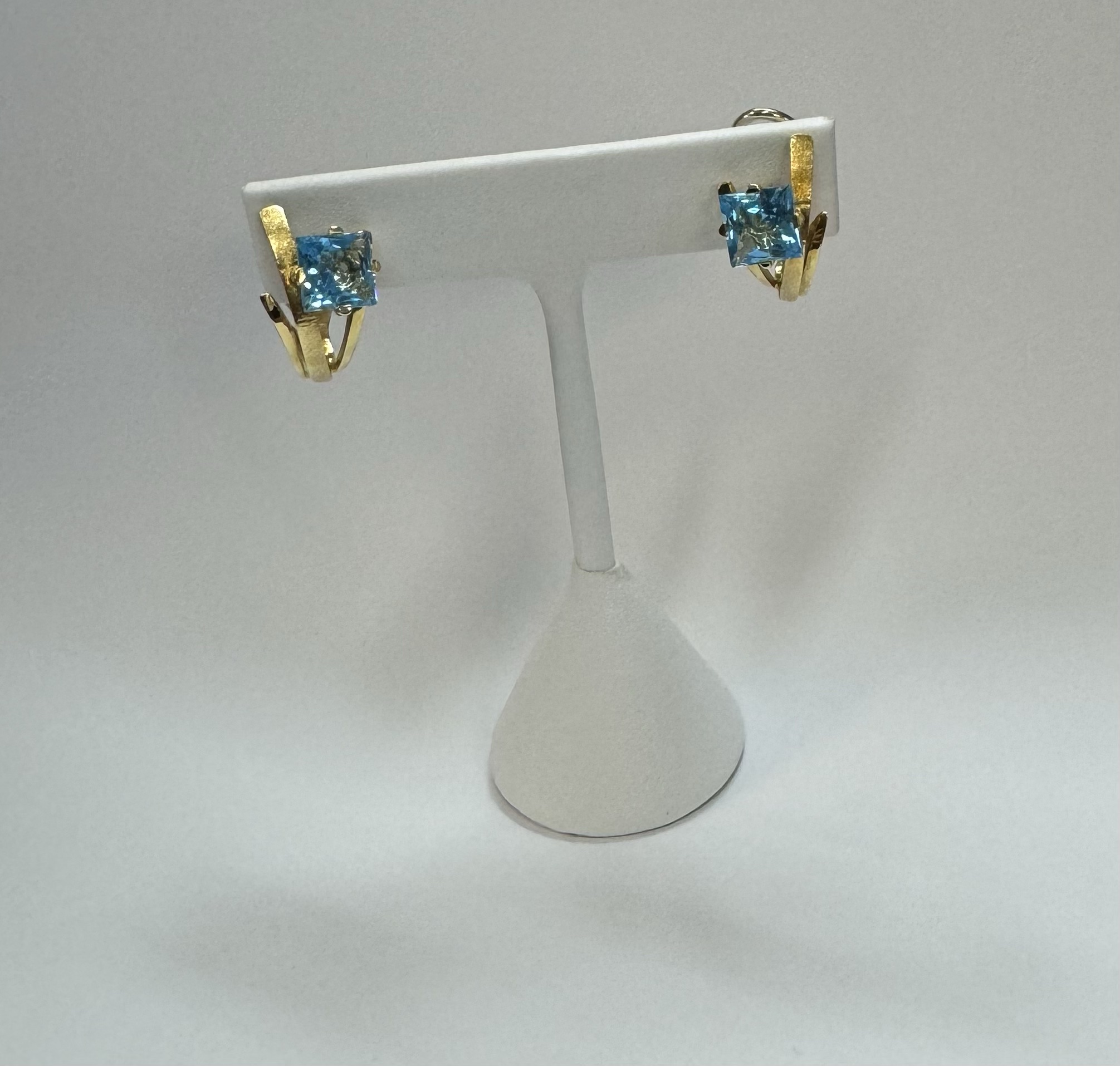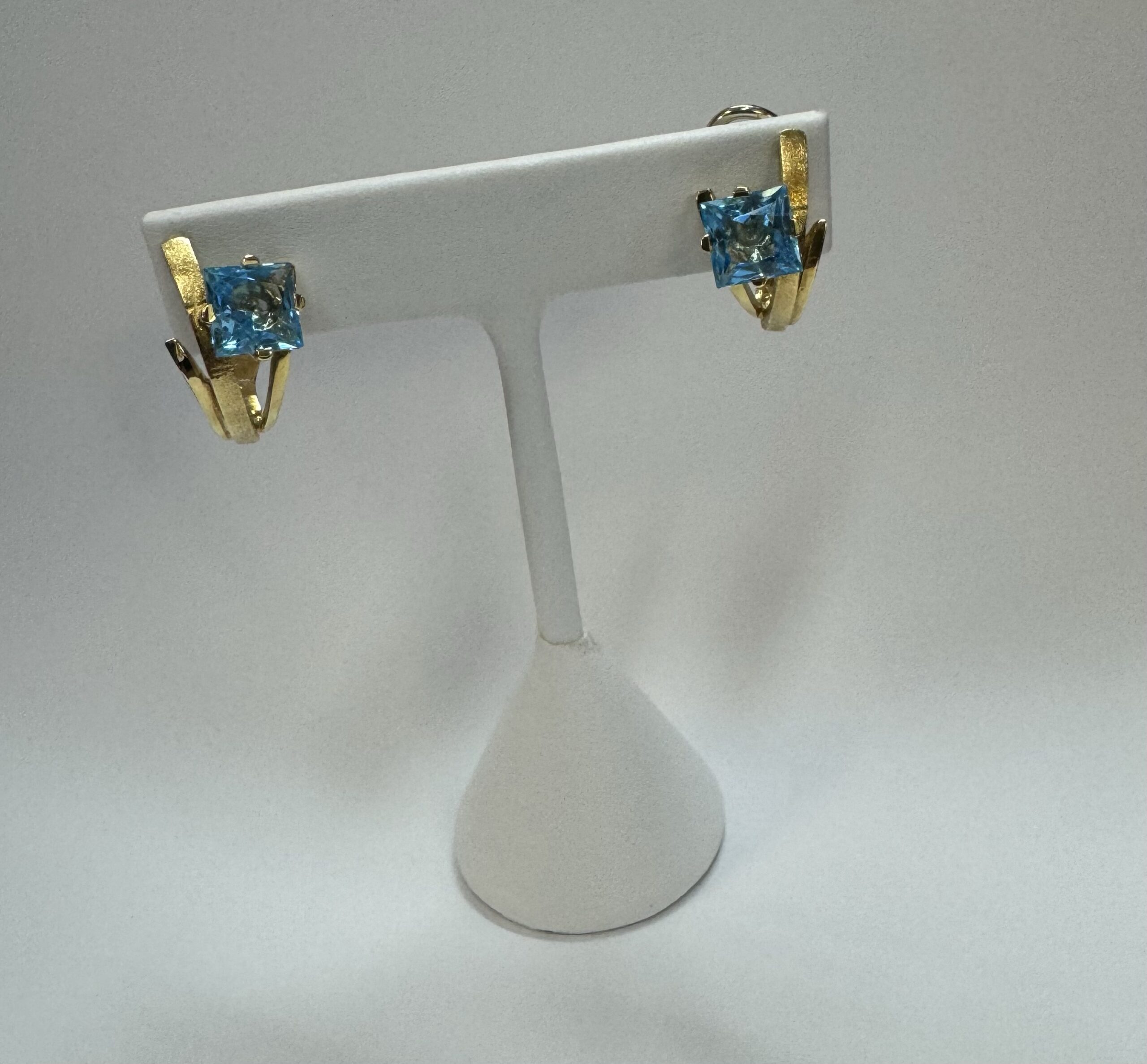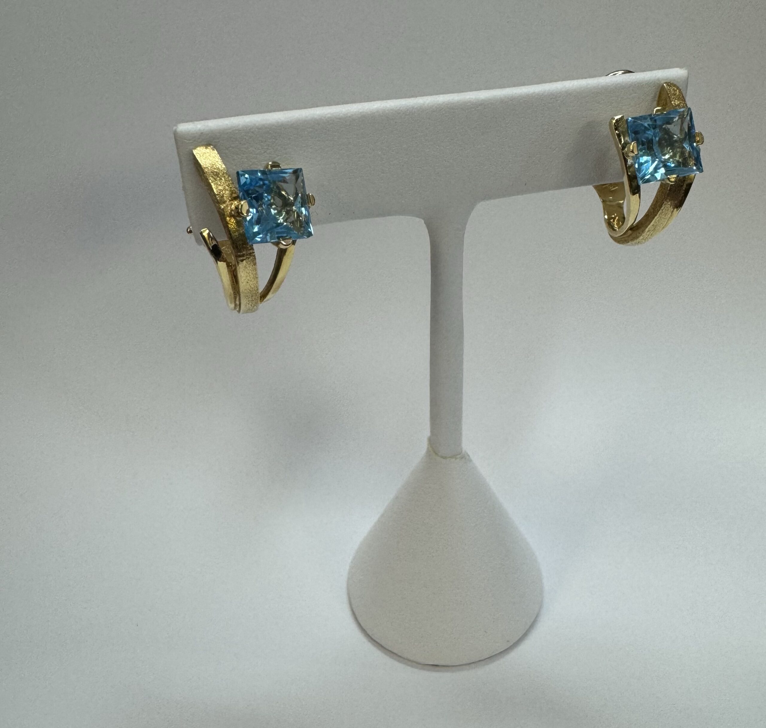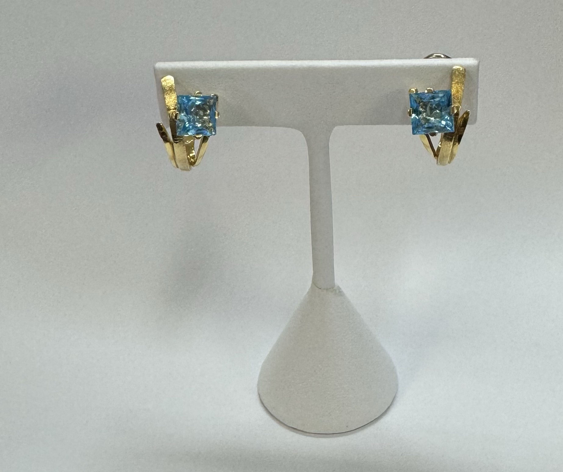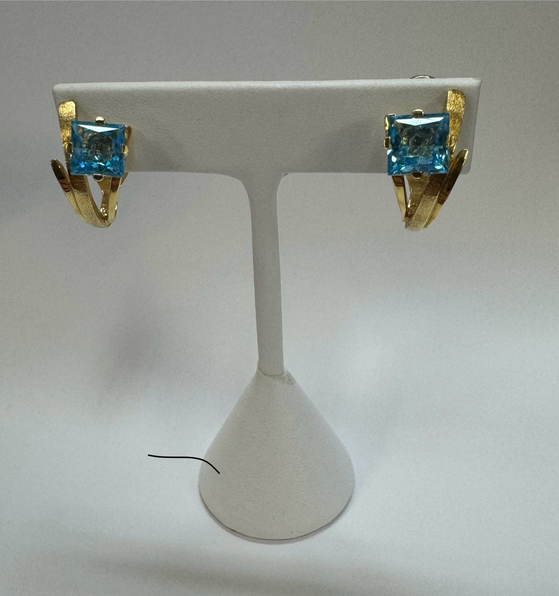 One-of-a-kind 18k yellow gold genuine 8 mm Princess Cut Blue Topaz post & clip earrings directly imported from Italy, 11.3 grams.