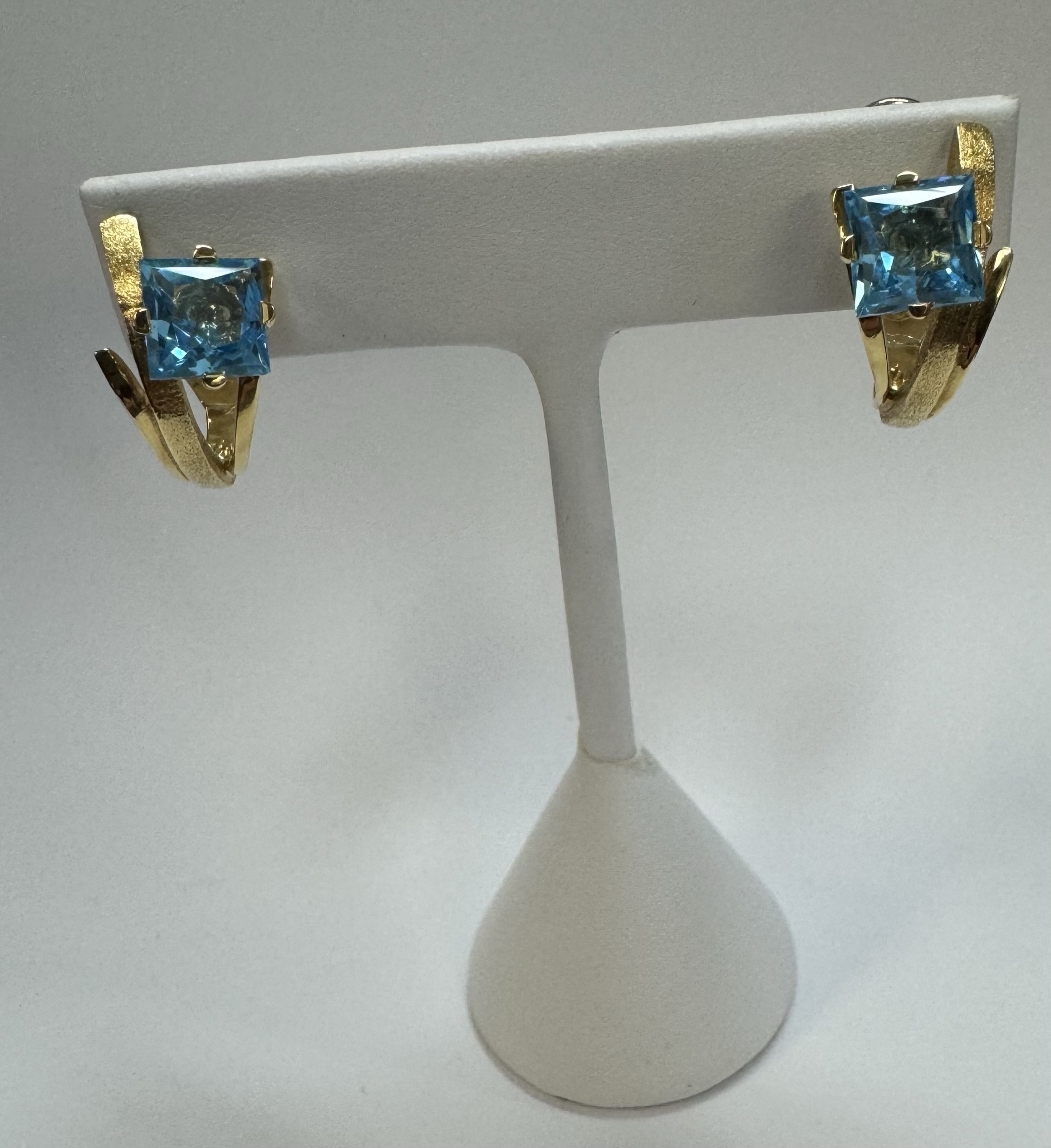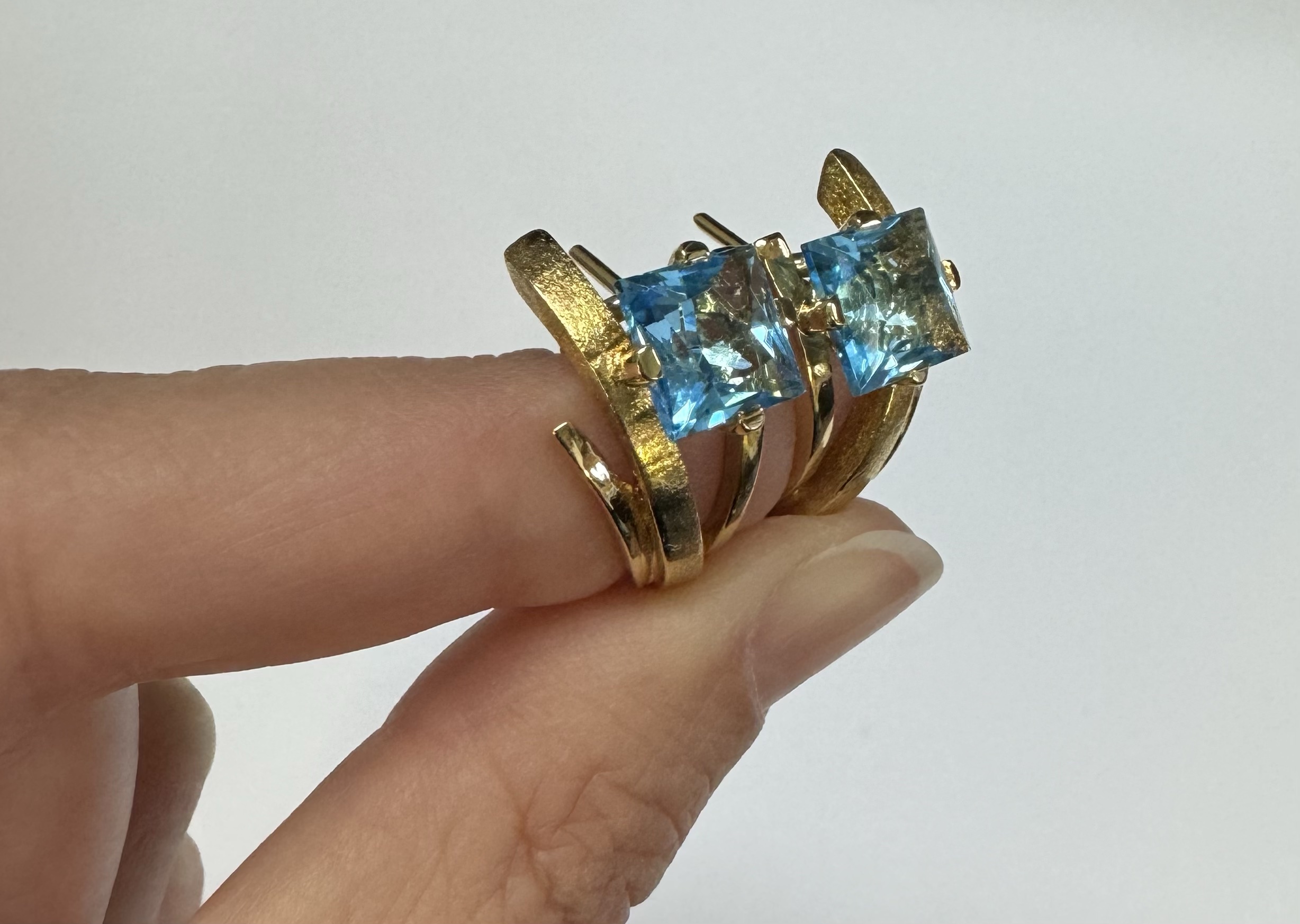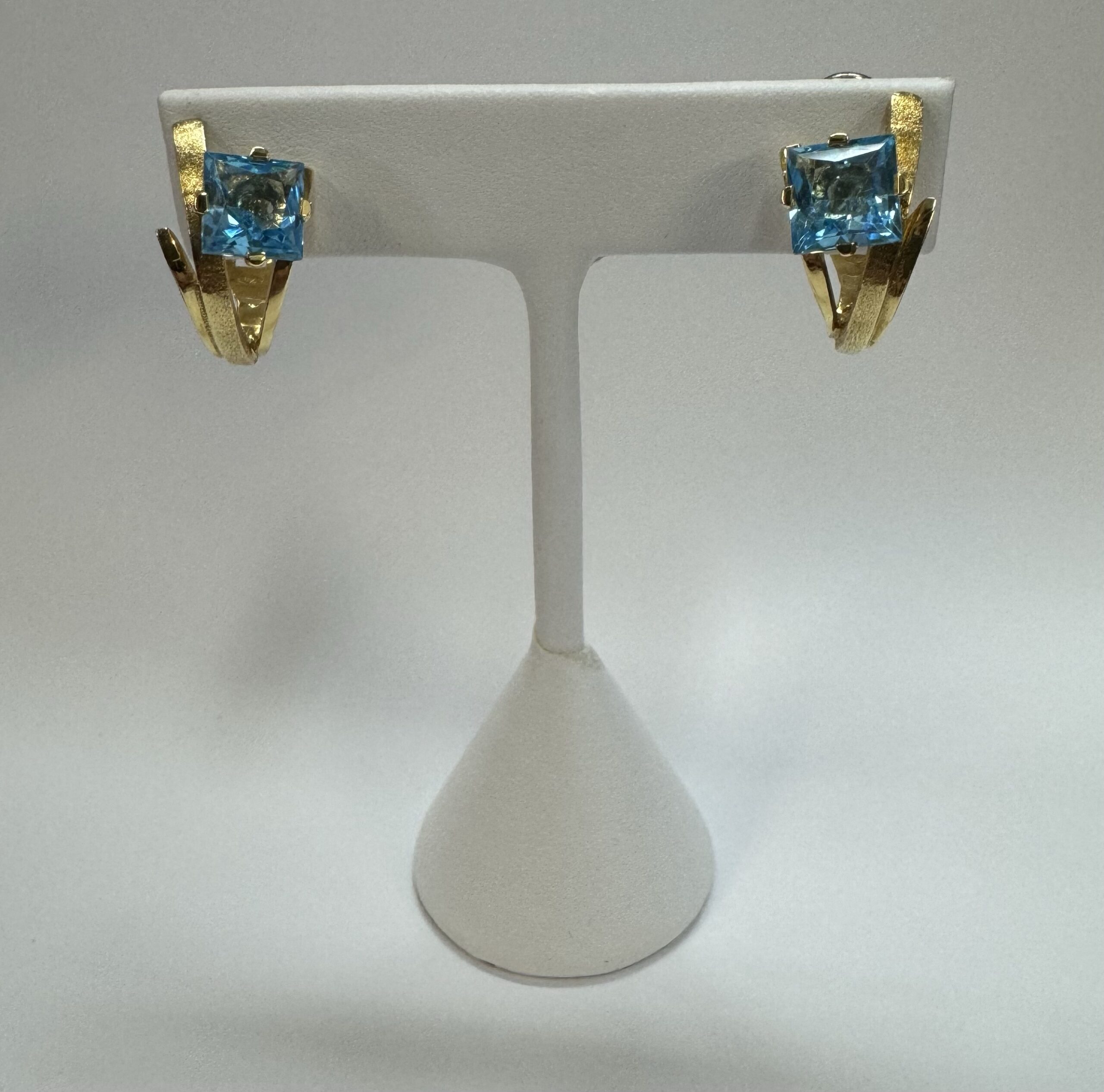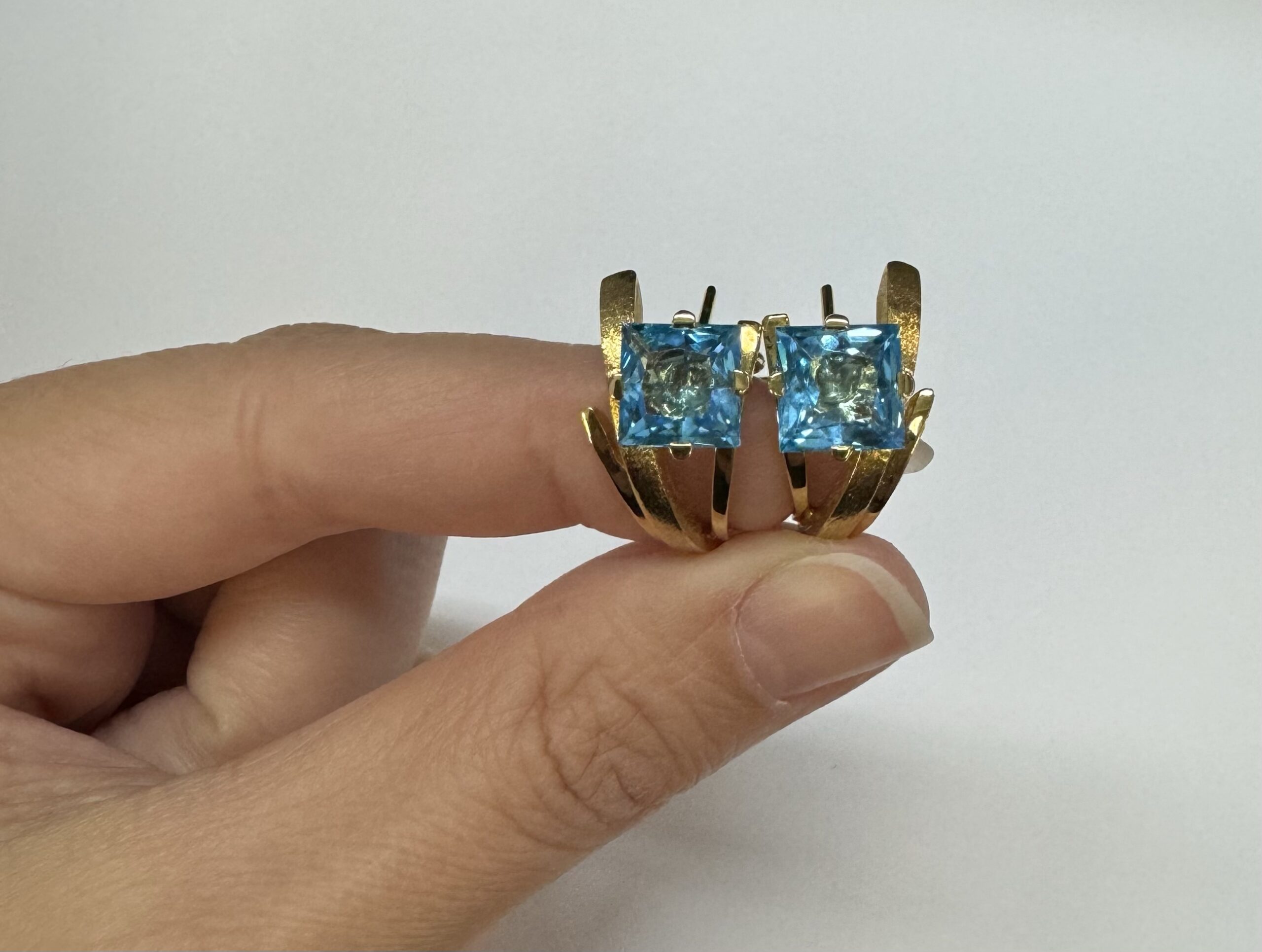 One-of-a-kind 18k yellow gold genuine 8 mm Princess Cut Blue Topaz post & clip earrings directly imported from Italy, 11.3 grams.