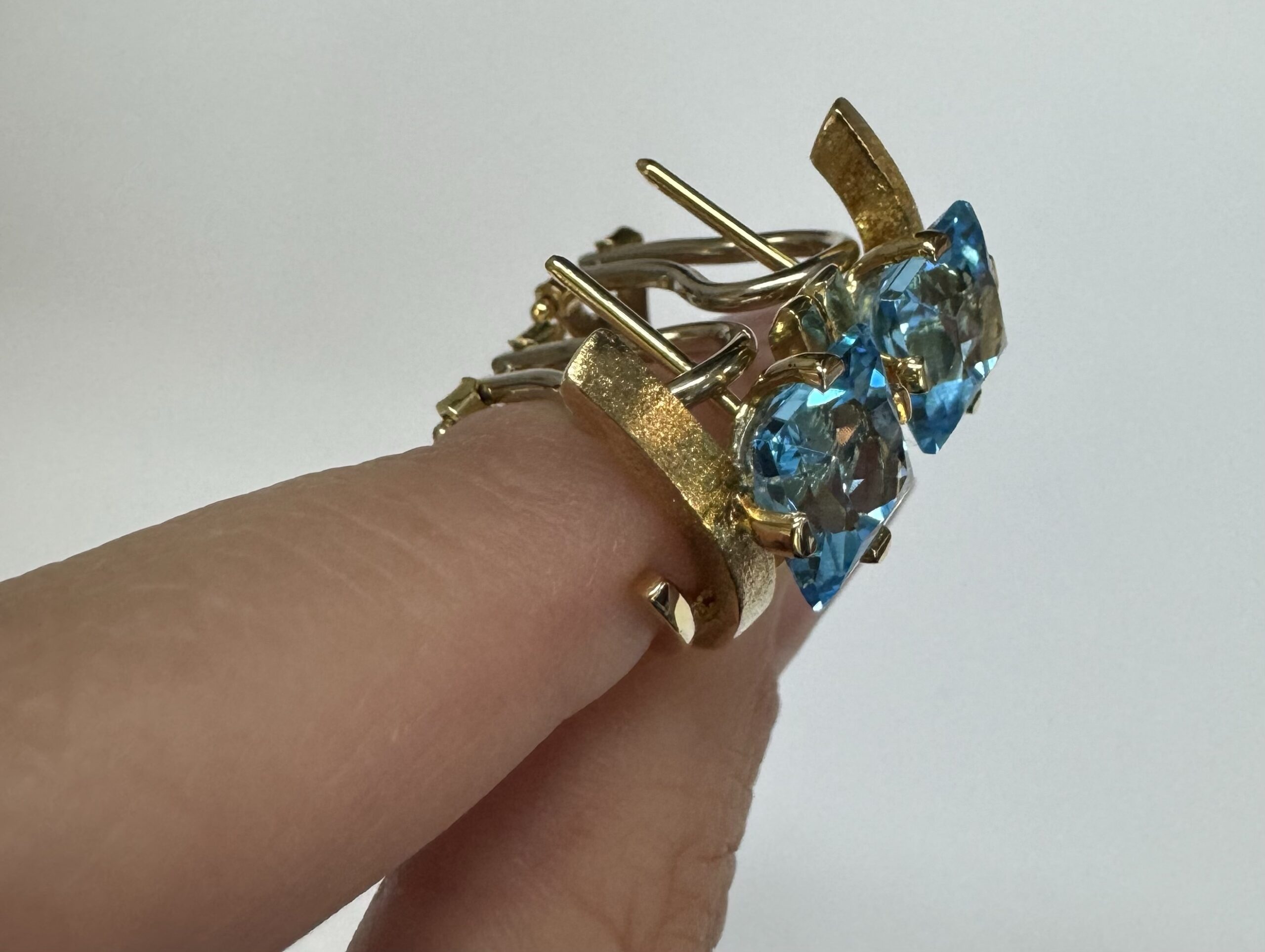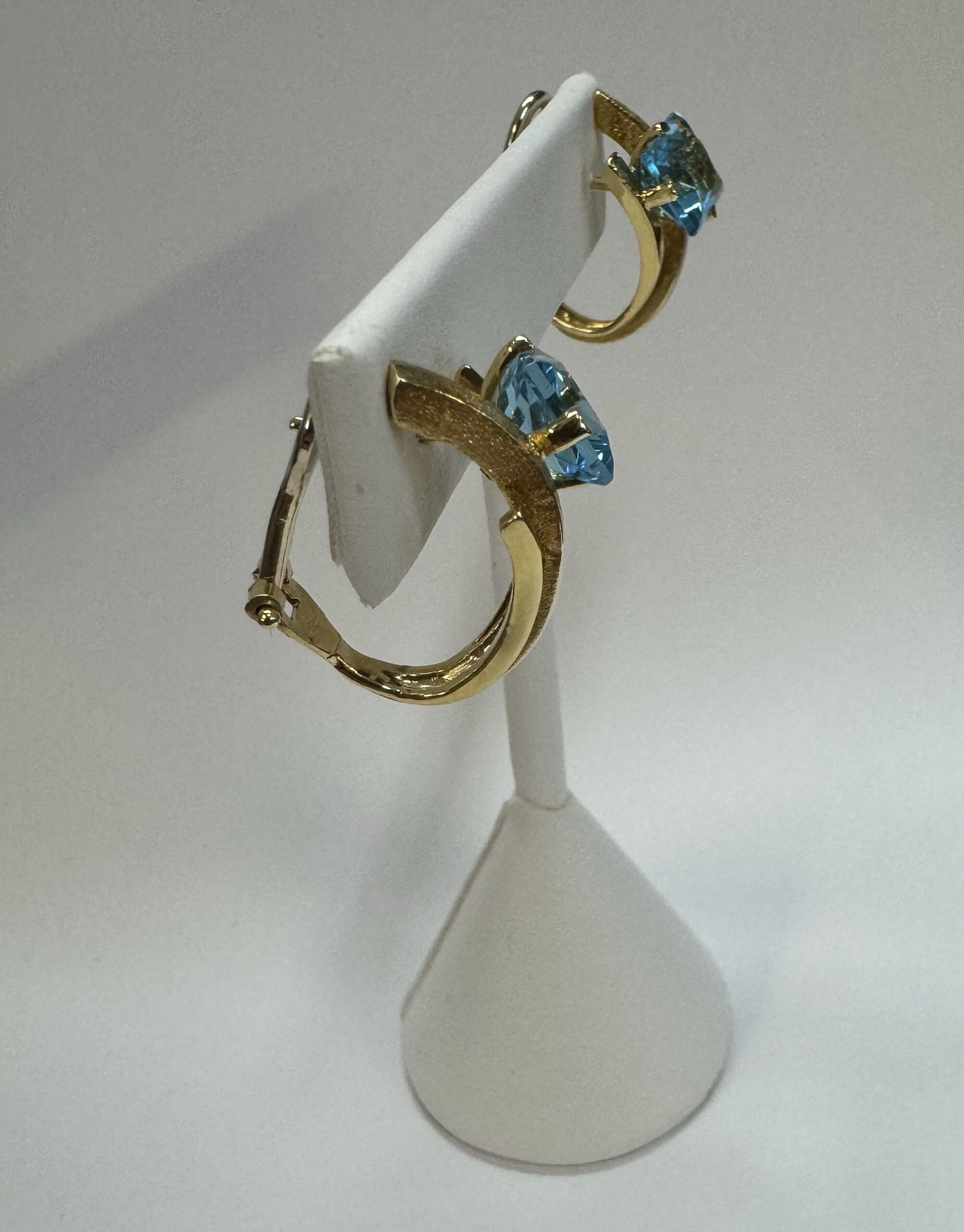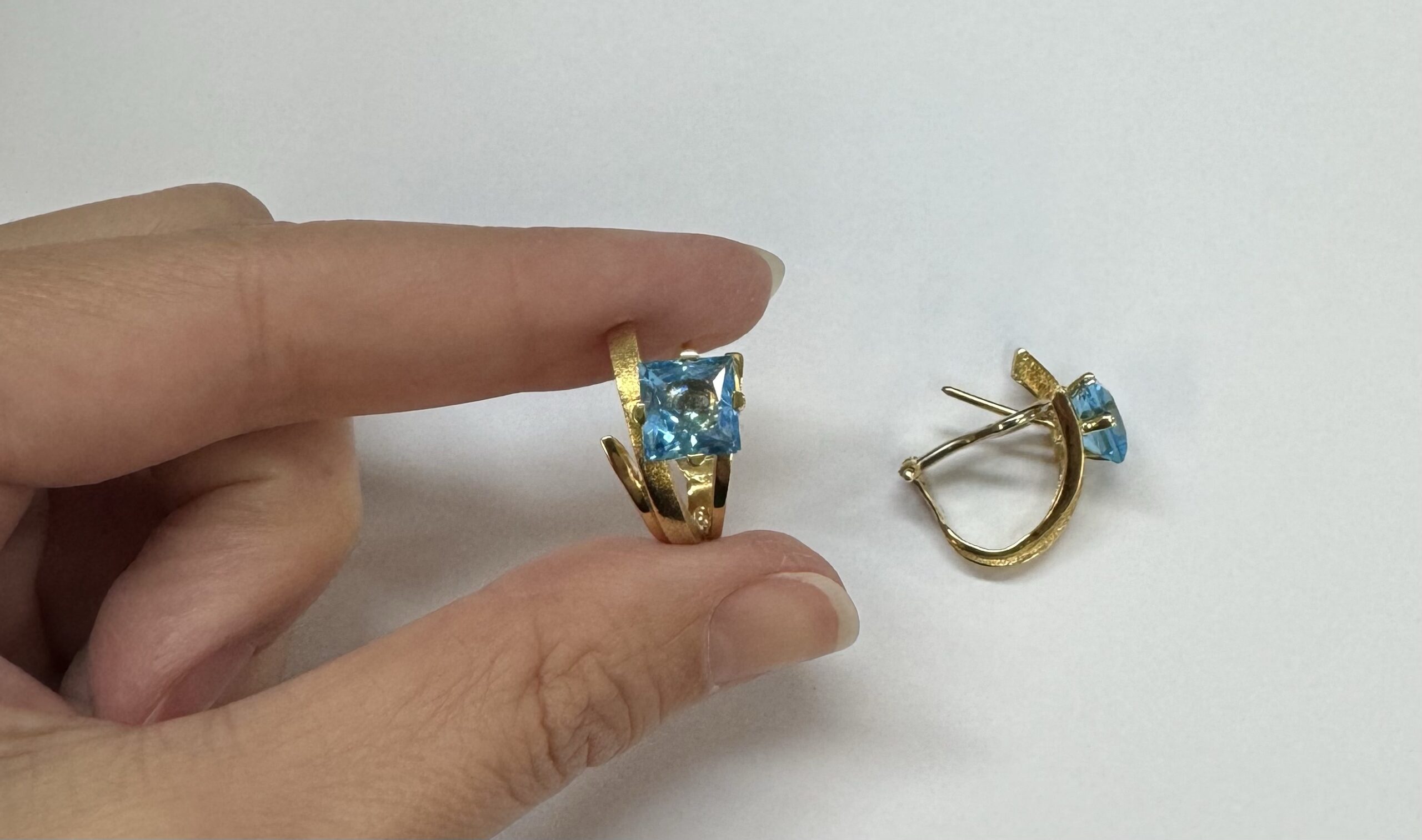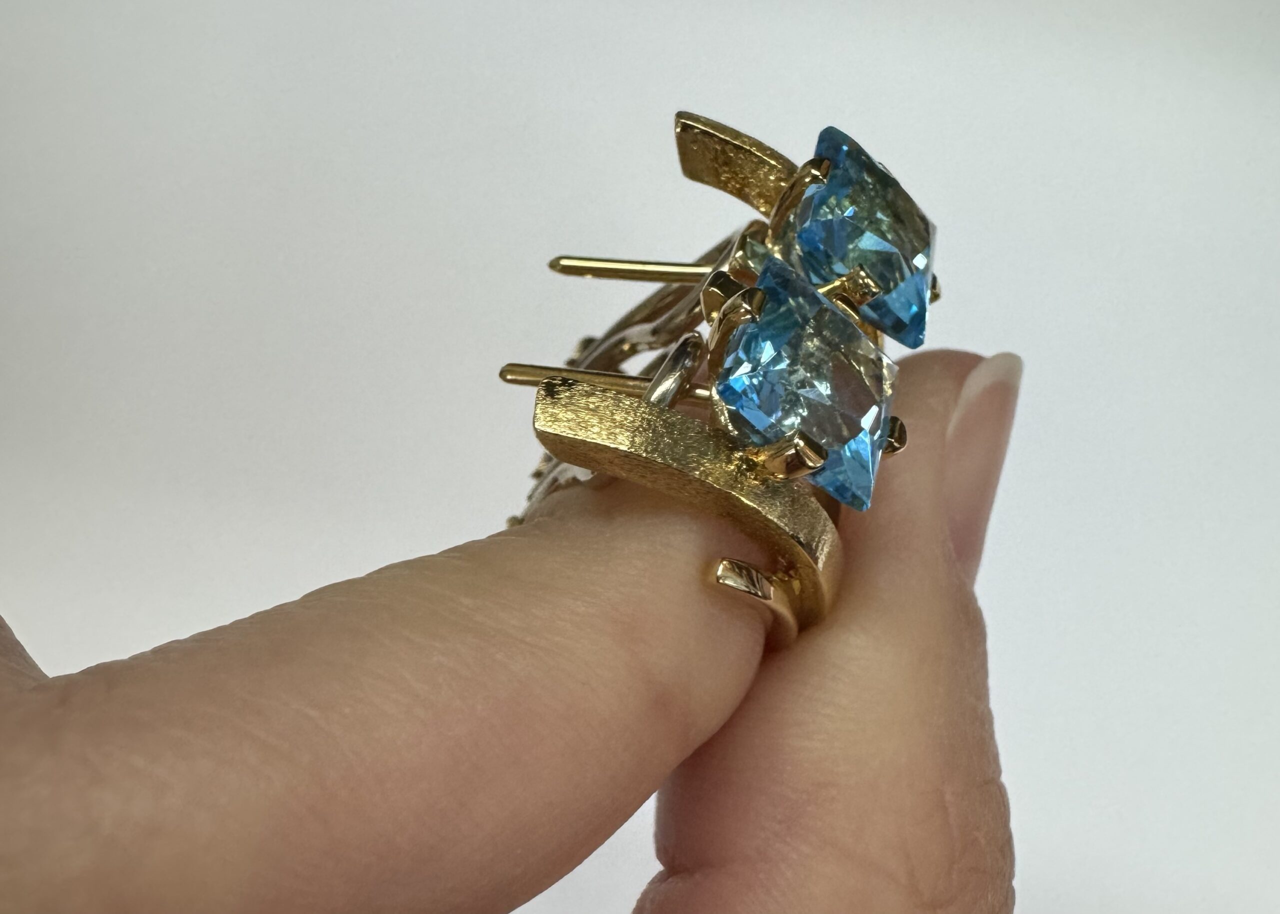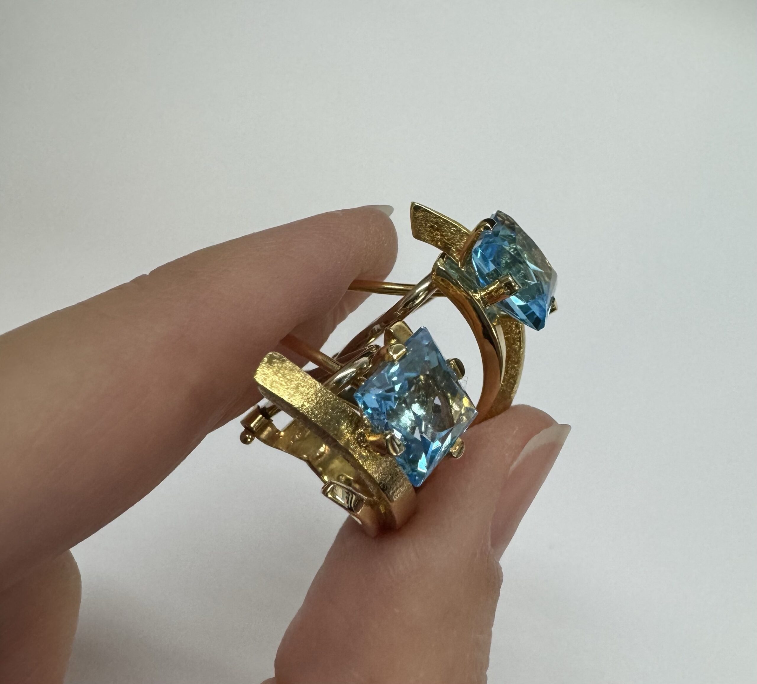 One-of-a-kind 18k yellow gold genuine 8 mm Princess Cut Blue Topaz post & clip earrings directly imported from Italy, 11.3 grams.