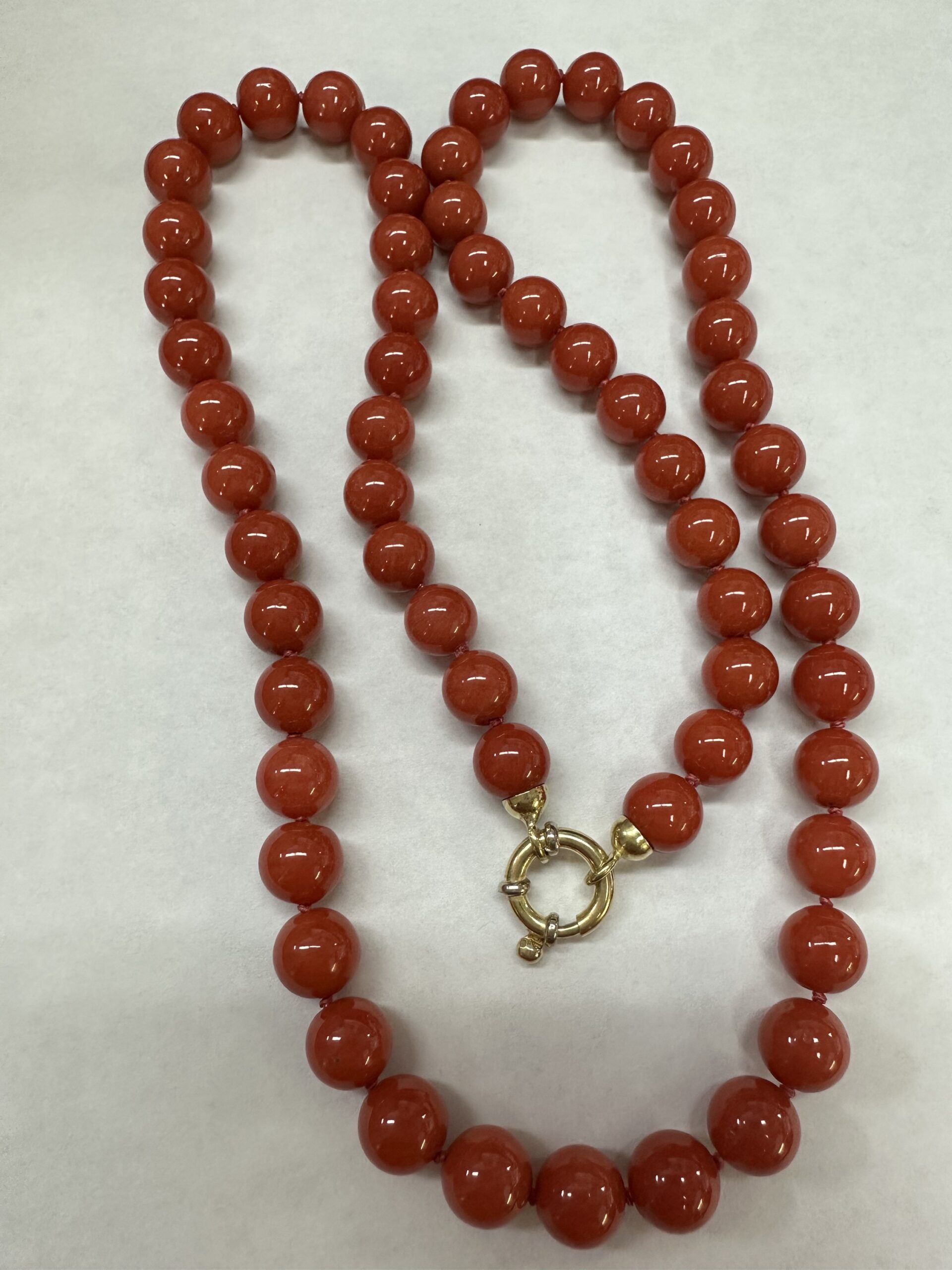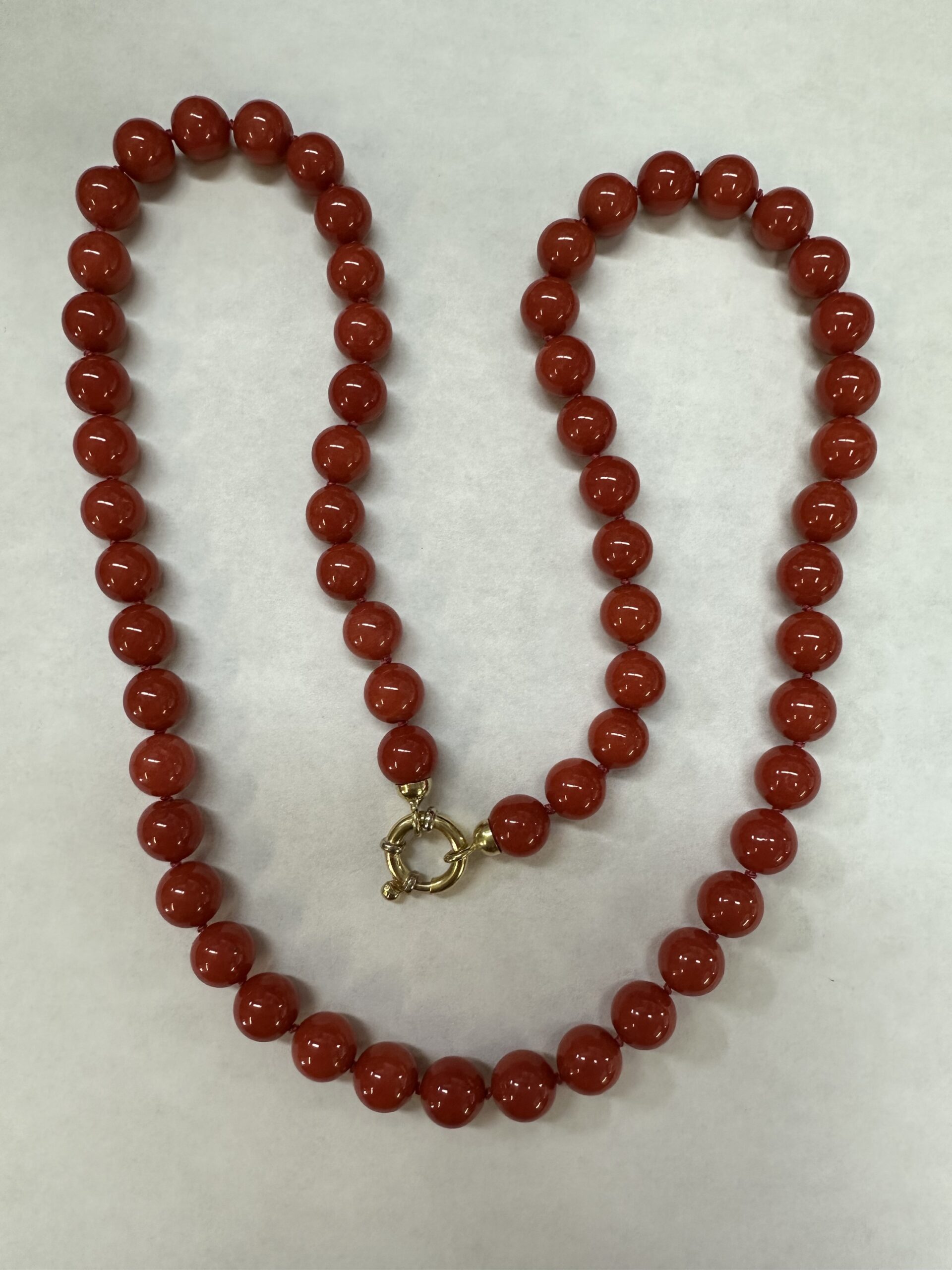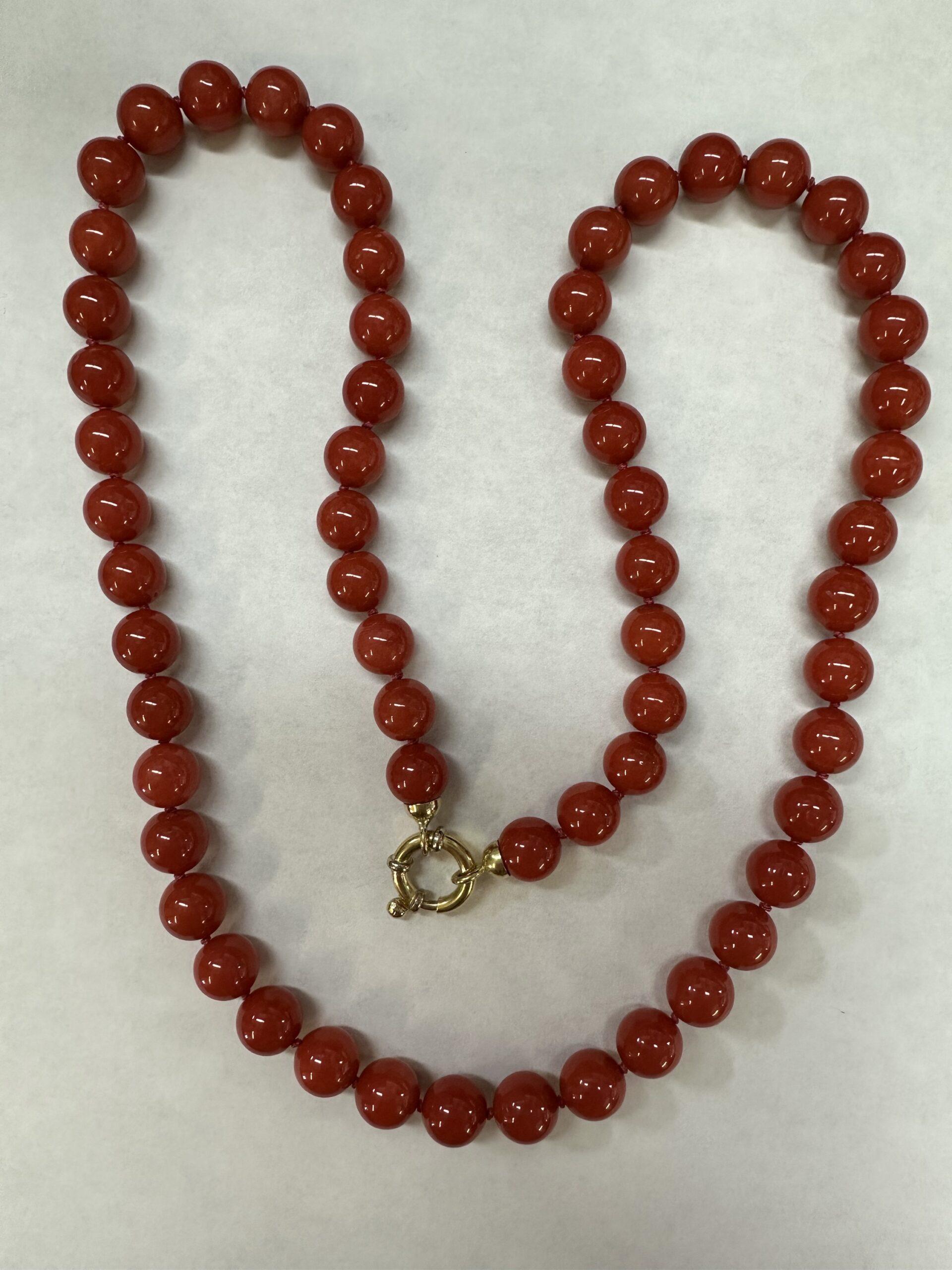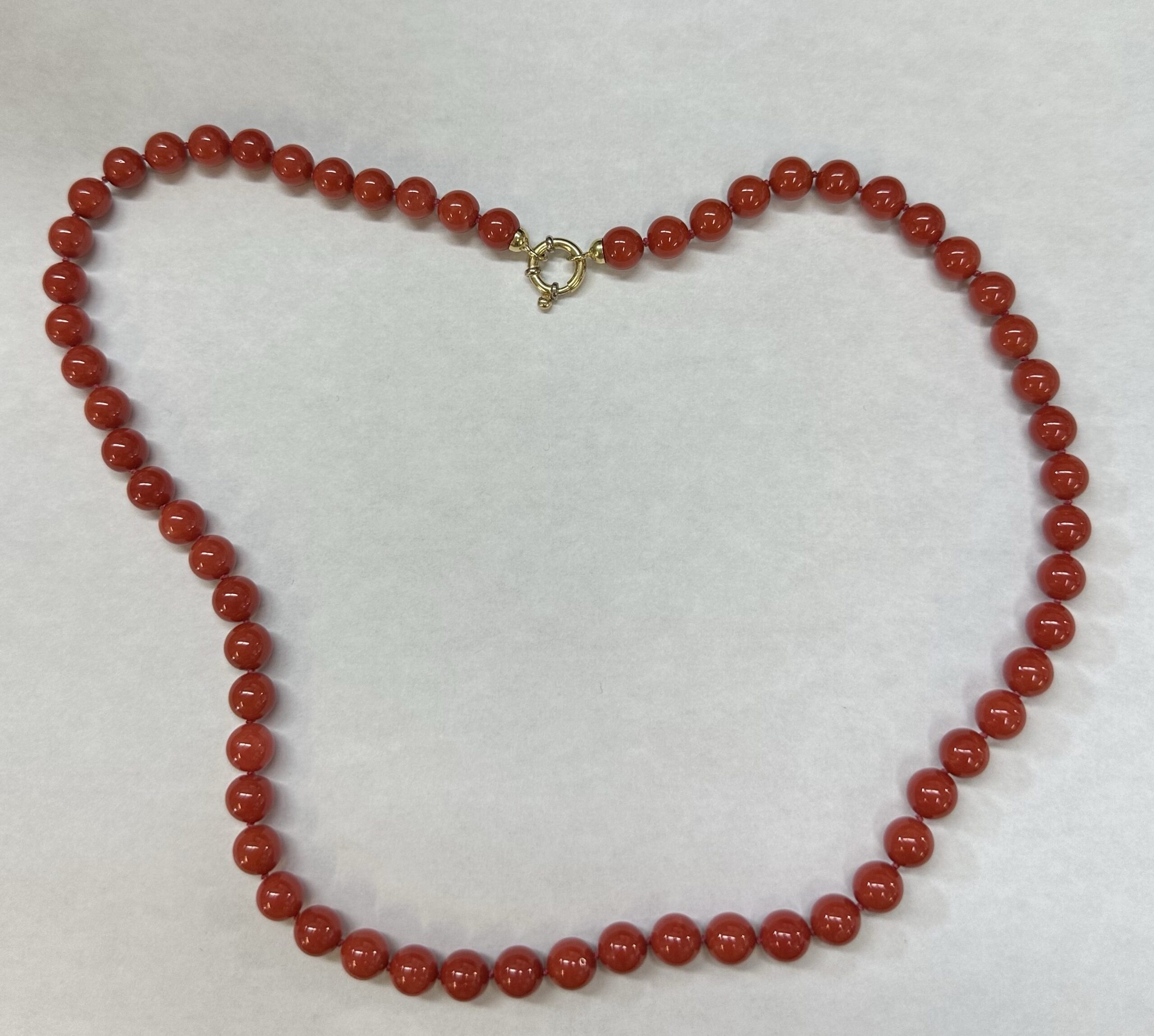 One-of-a-kind 61 genuine Red Coral 20.5” knotted bead strand with 8 MM beads, directly imported from Italy. This necklace is terminated by an 18k yellow gold clasp, and it has an entire weight of 41.0 grams.