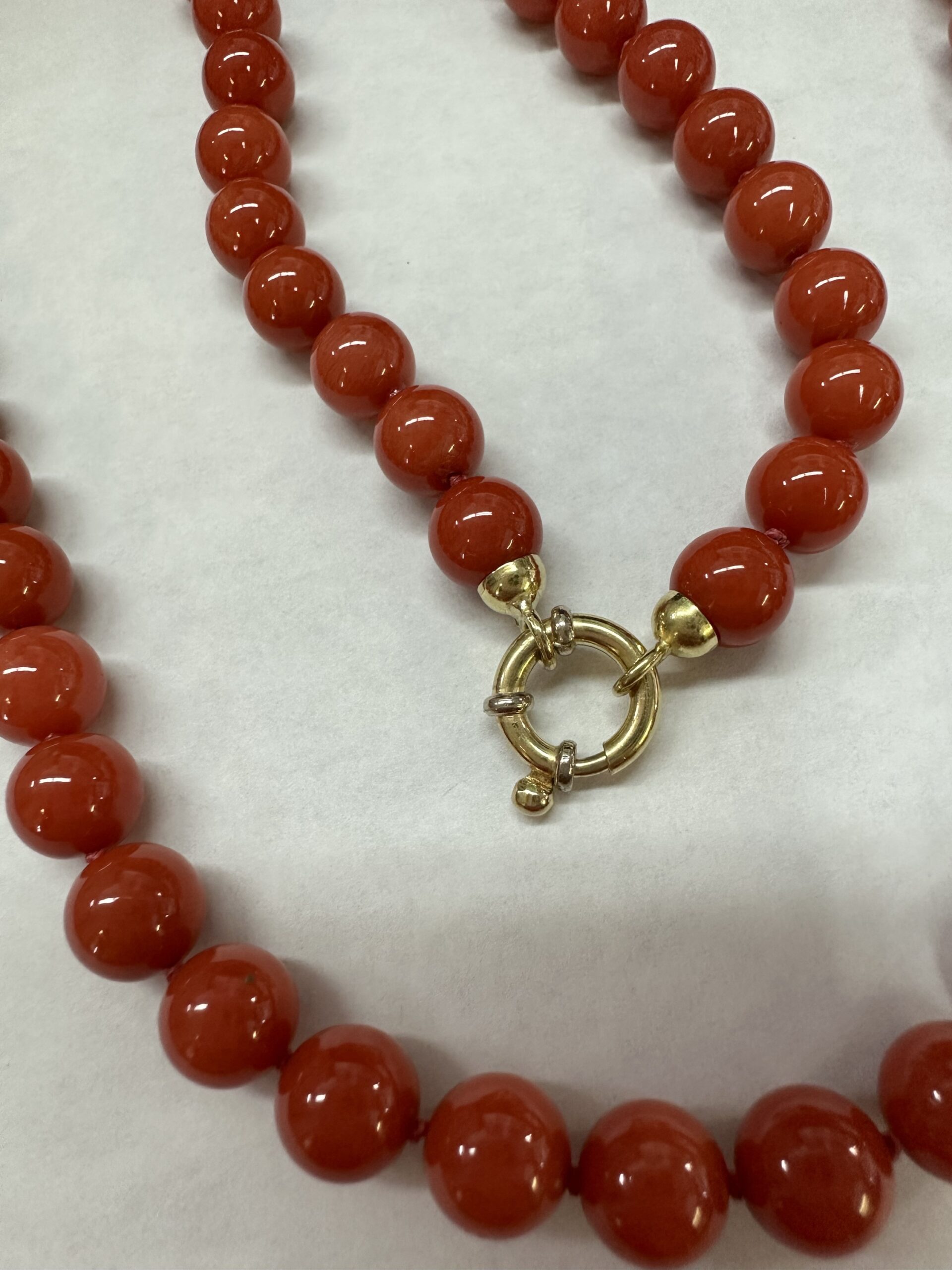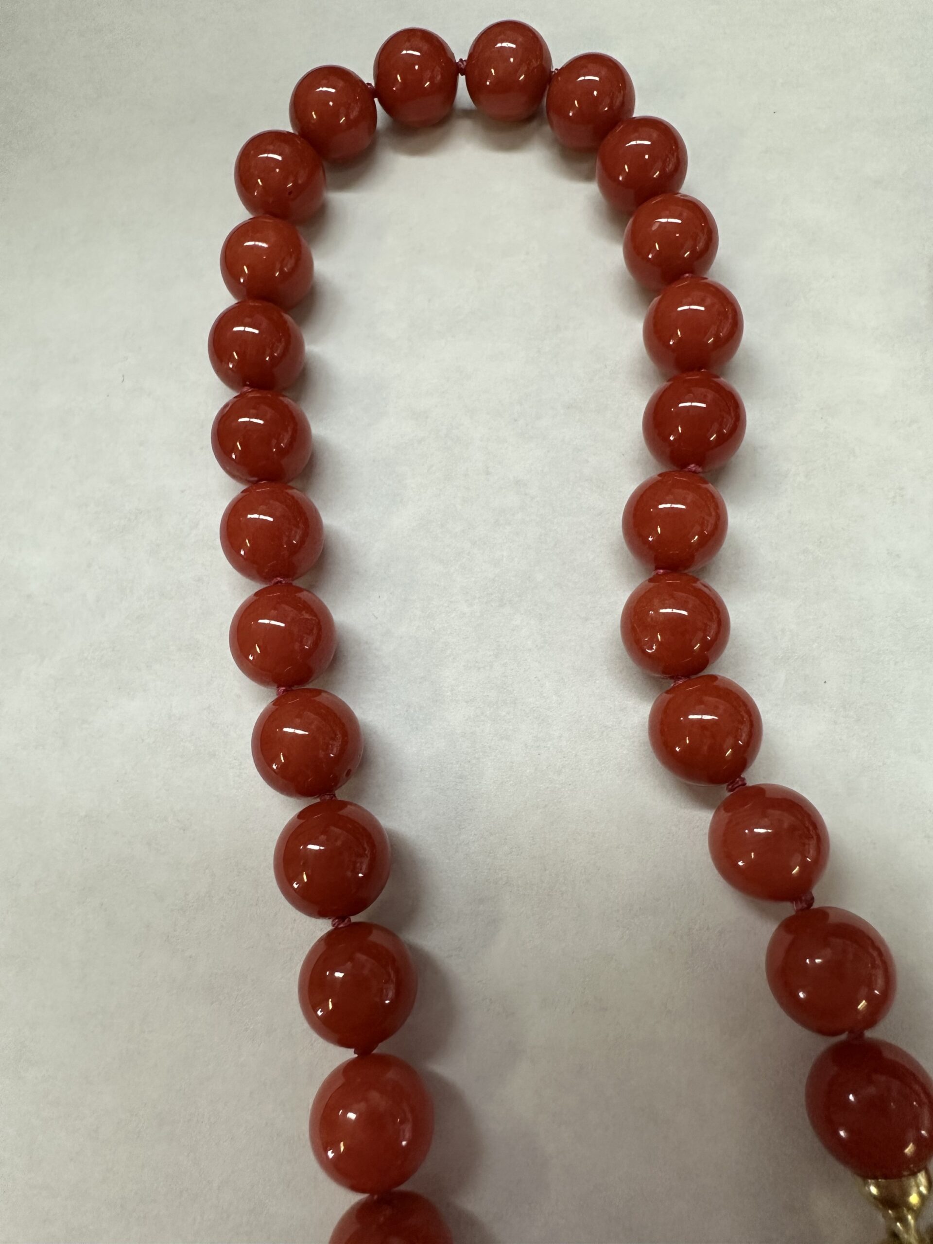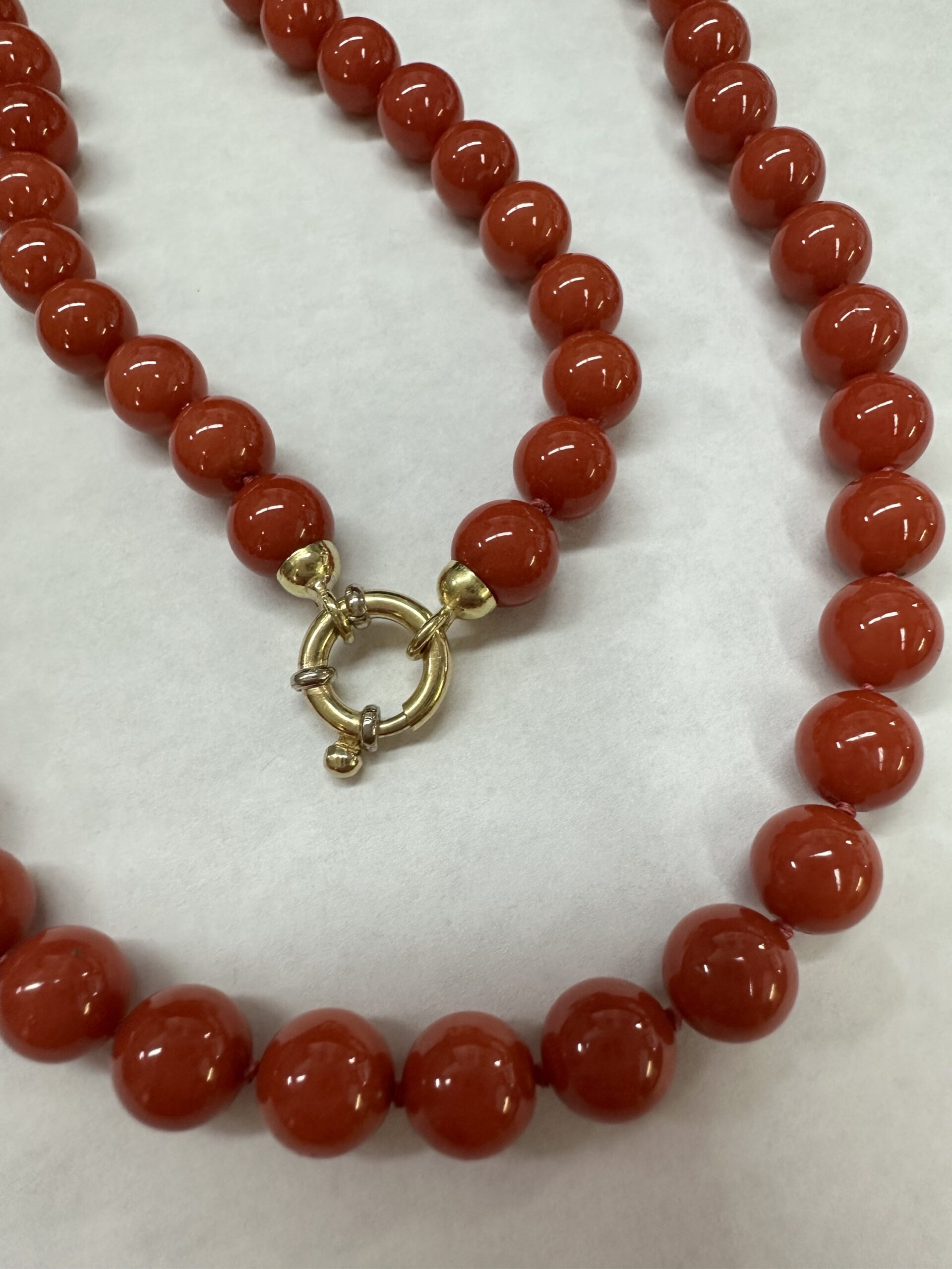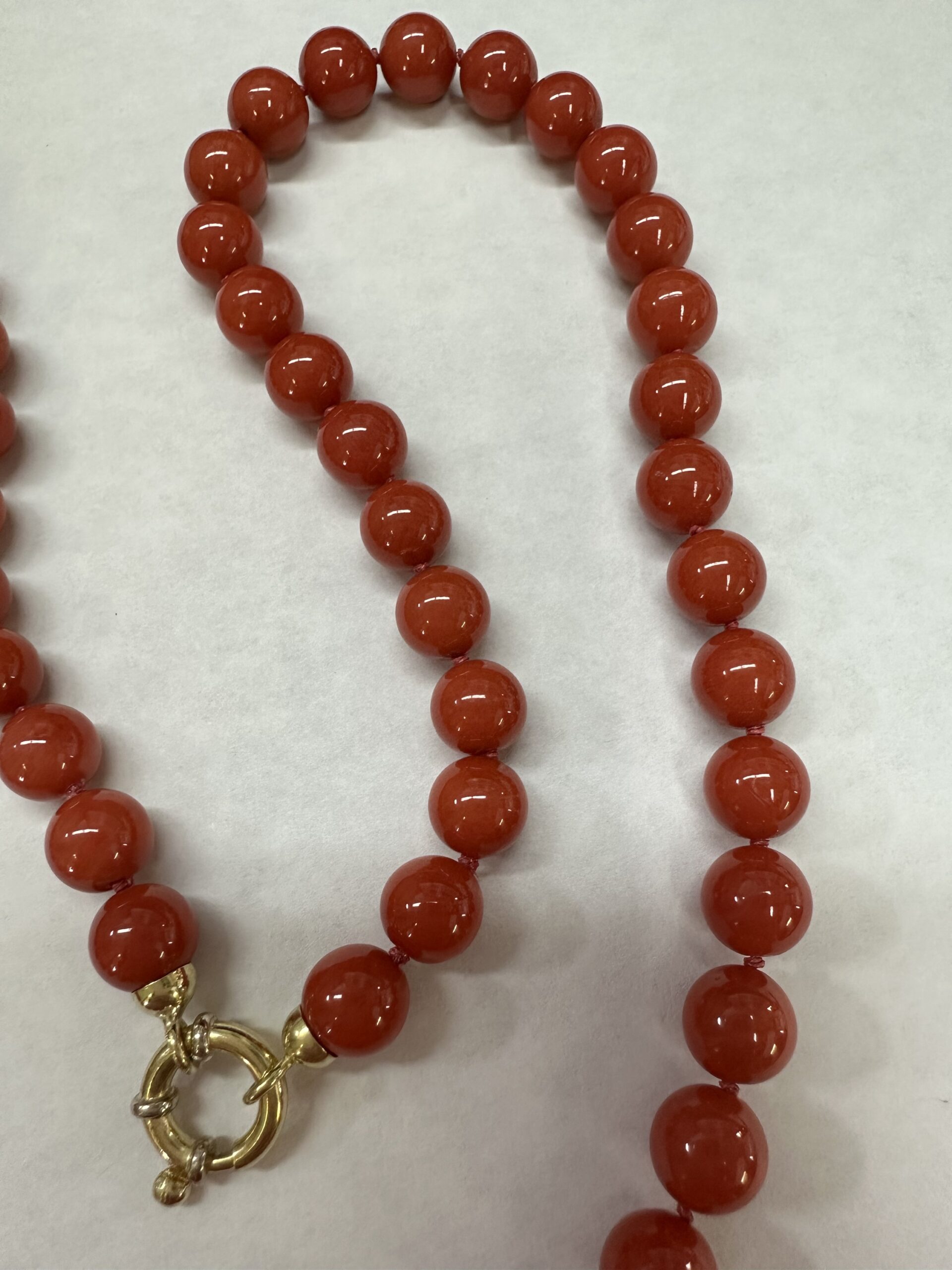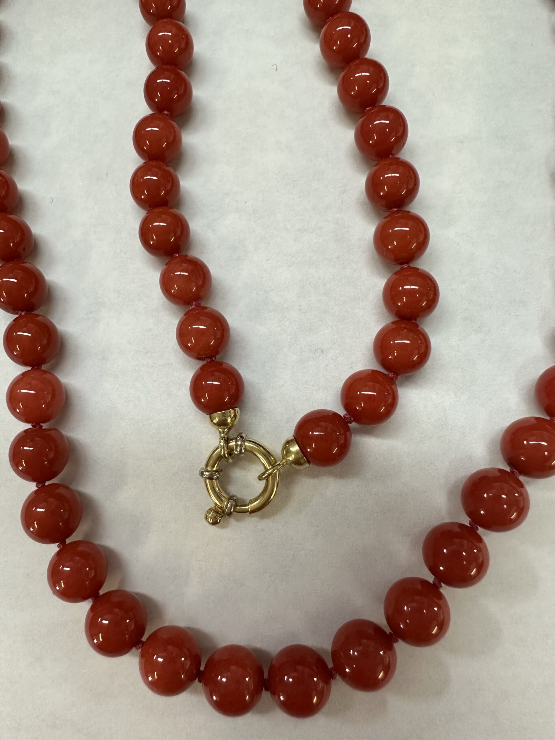 One-of-a-kind 61 genuine Red Coral 20.5” knotted bead strand with 8 MM beads, directly imported from Italy. This necklace is terminated by an 18k yellow gold clasp, and it has an entire weight of 41.0 grams.