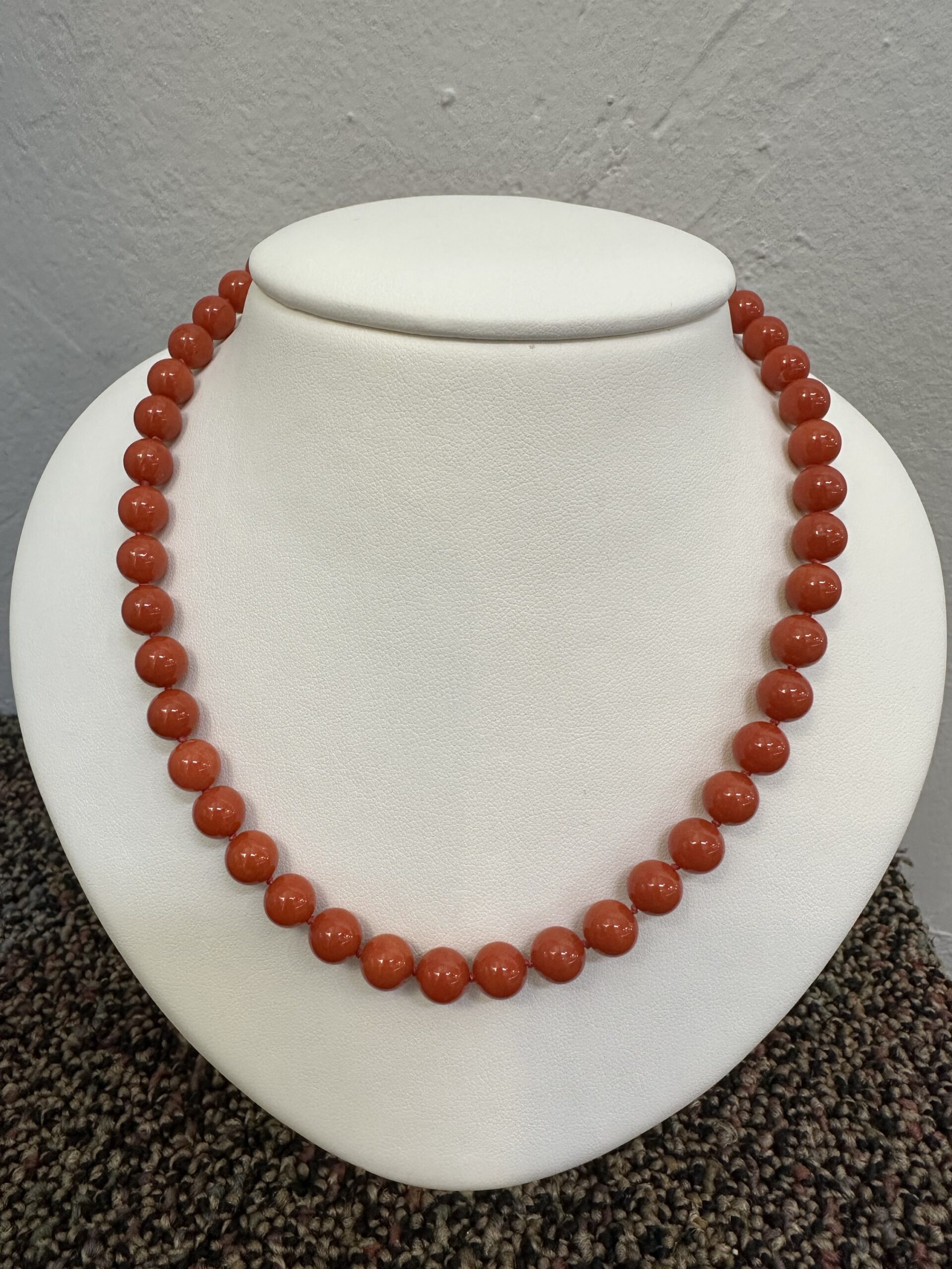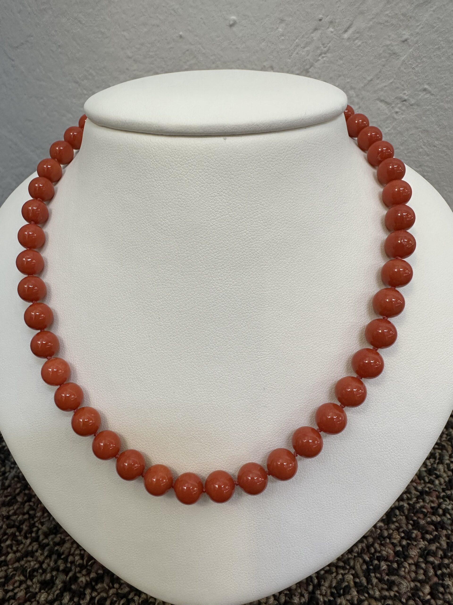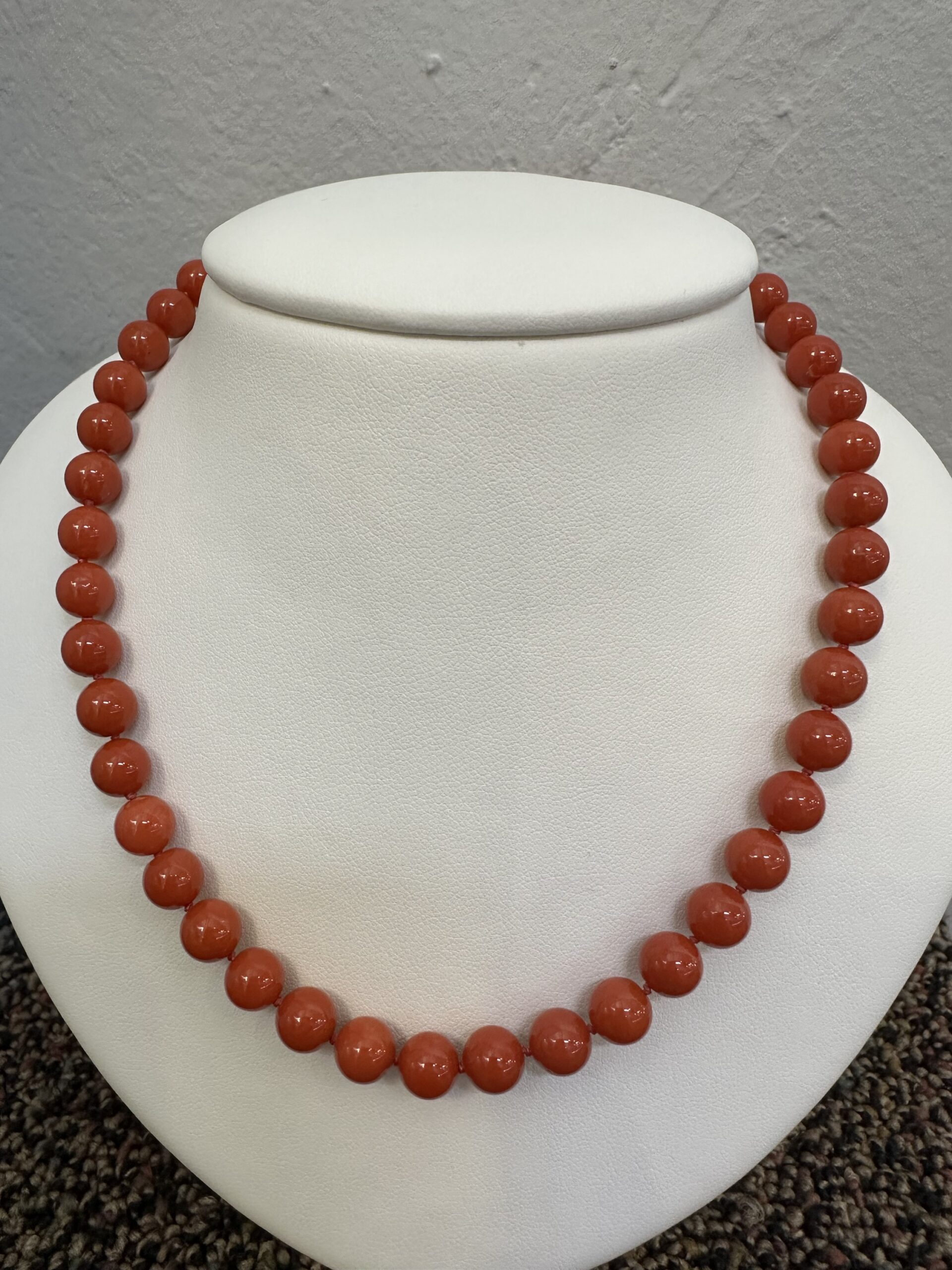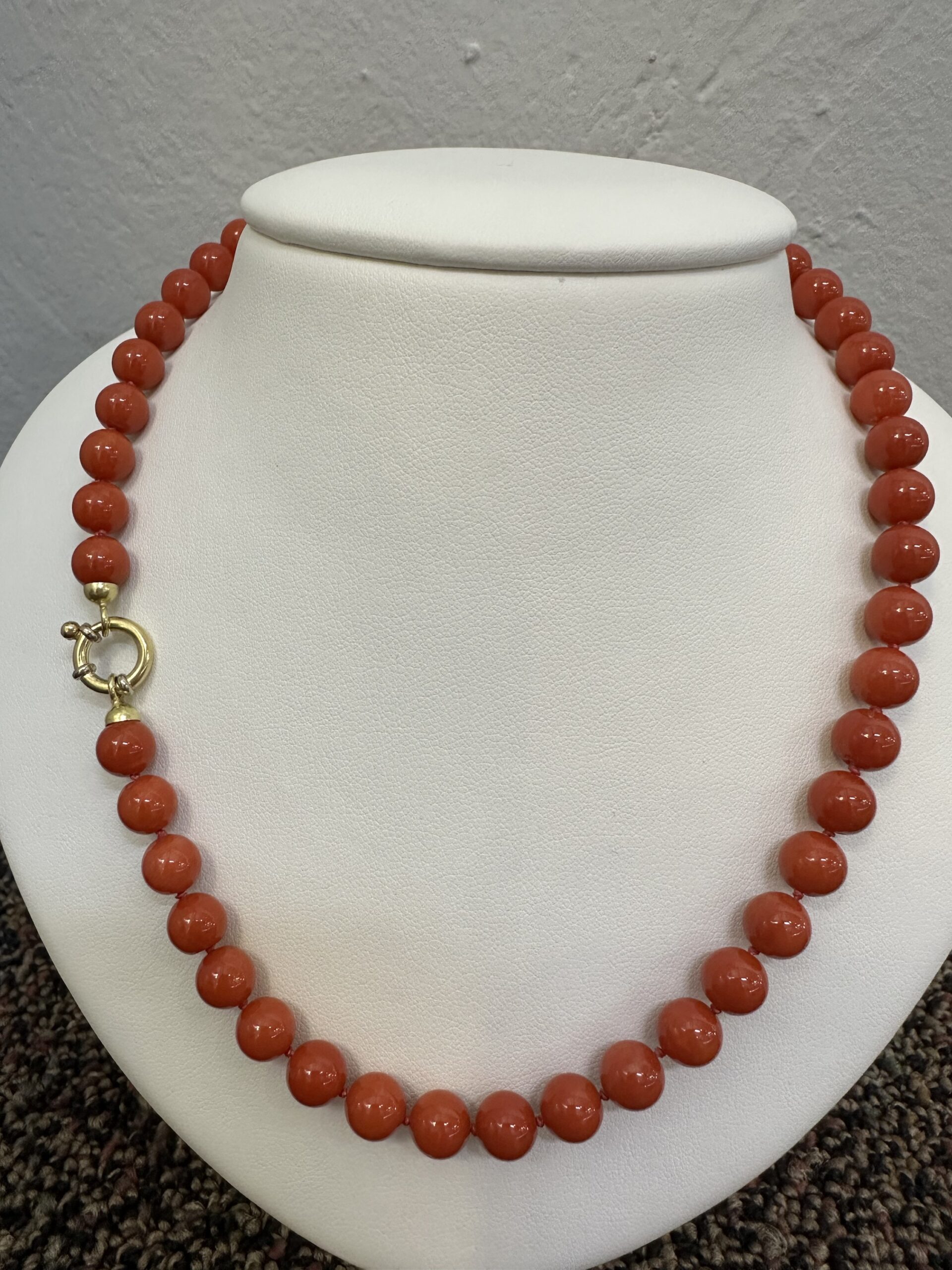 One-of-a-kind 61 genuine Red Coral 20.5” knotted bead strand with 8 MM beads, directly imported from Italy. This necklace is terminated by an 18k yellow gold clasp, and it has an entire weight of 41.0 grams.