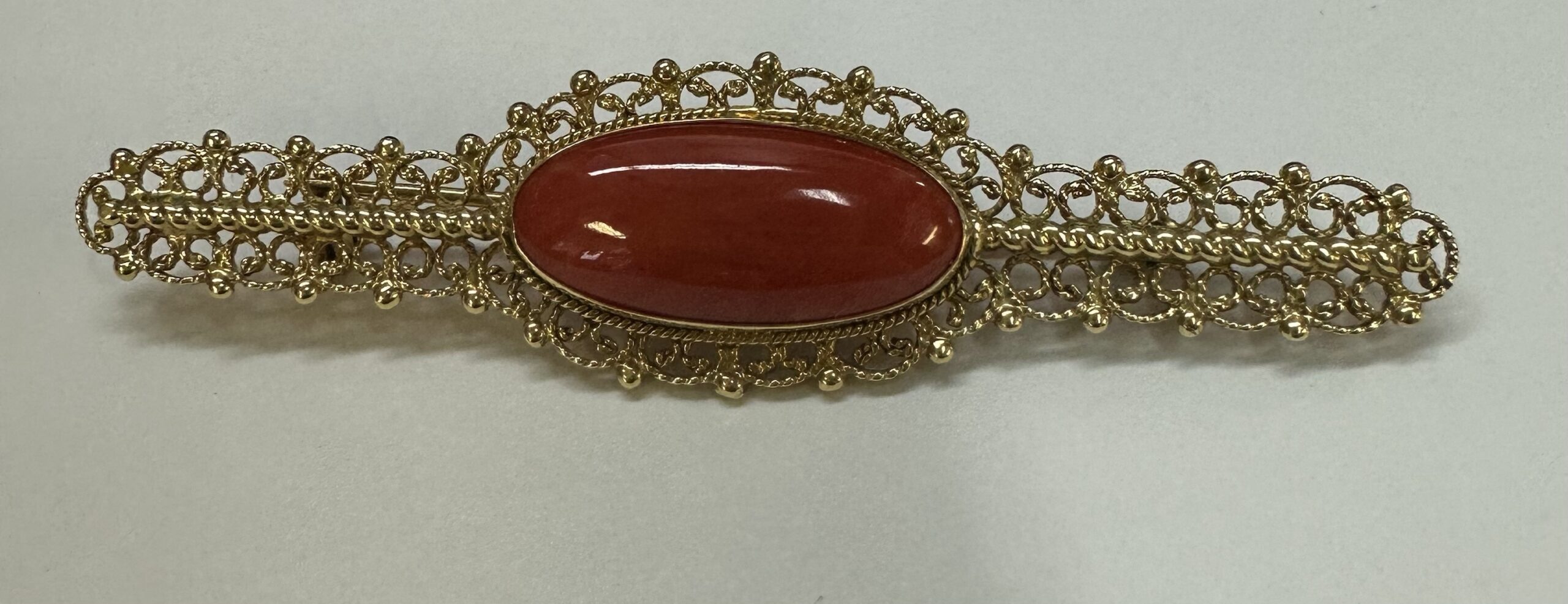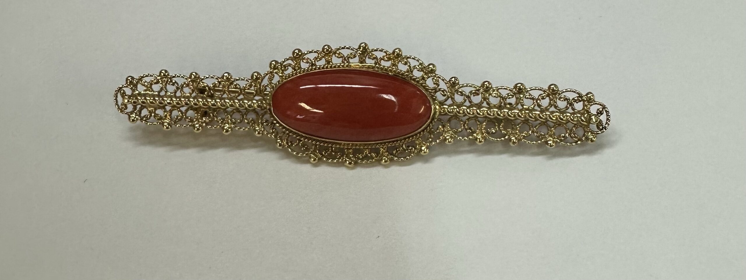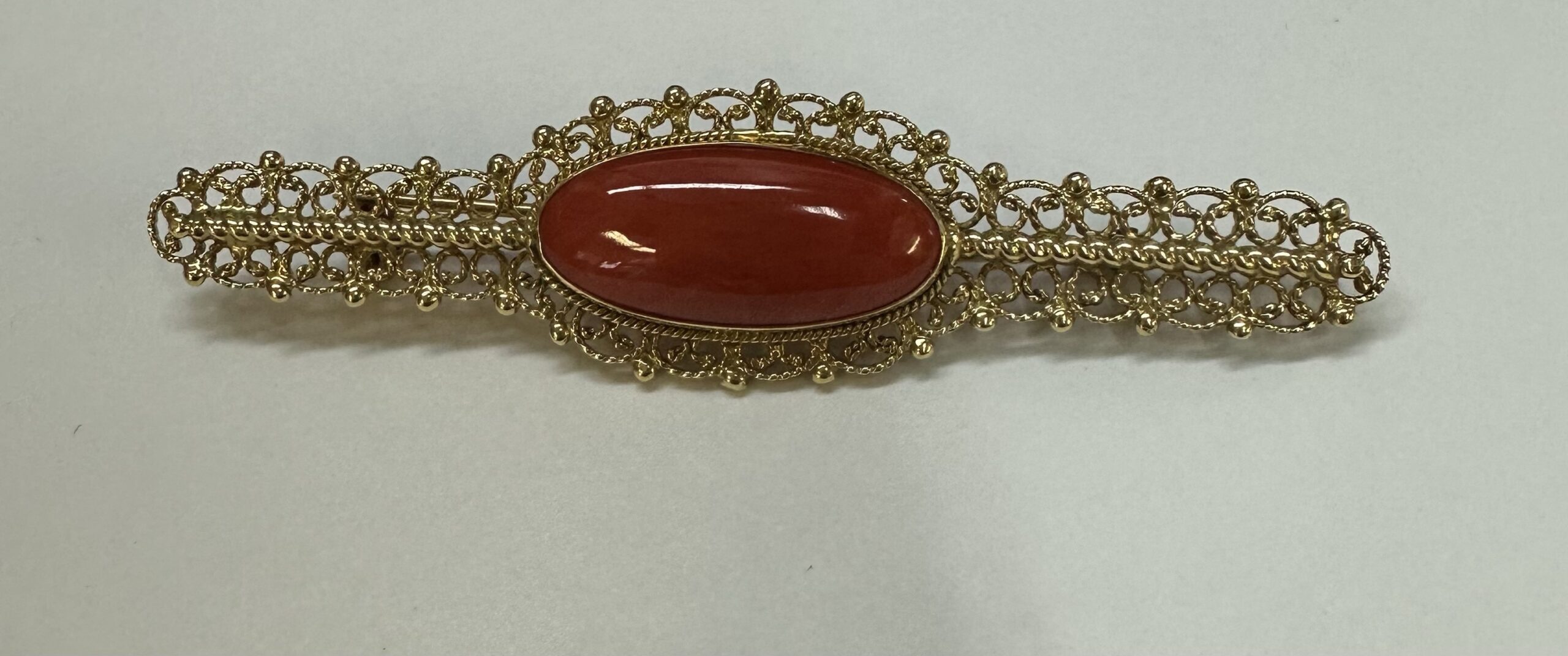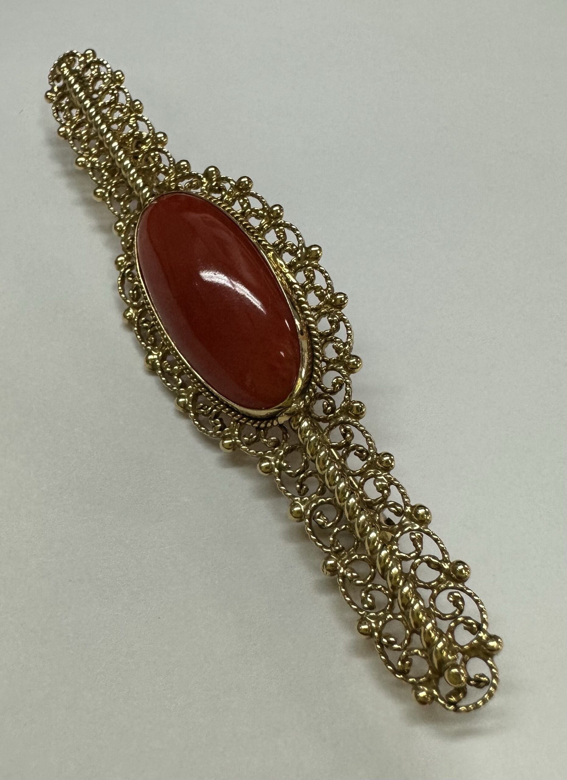 One-of-a-kind 18k yellow gold genuine Fine (high quality) Coral filigree brooch, directly imported from Italy. This brooch has an entire weight of 7.7 grams. This brooch measures 2 3/4” in length, and just under 3/4” in width.