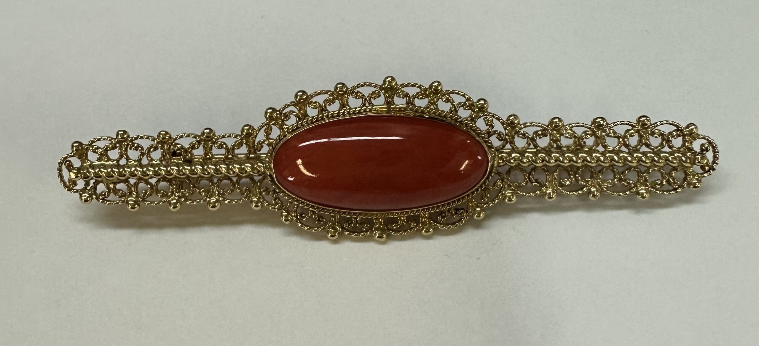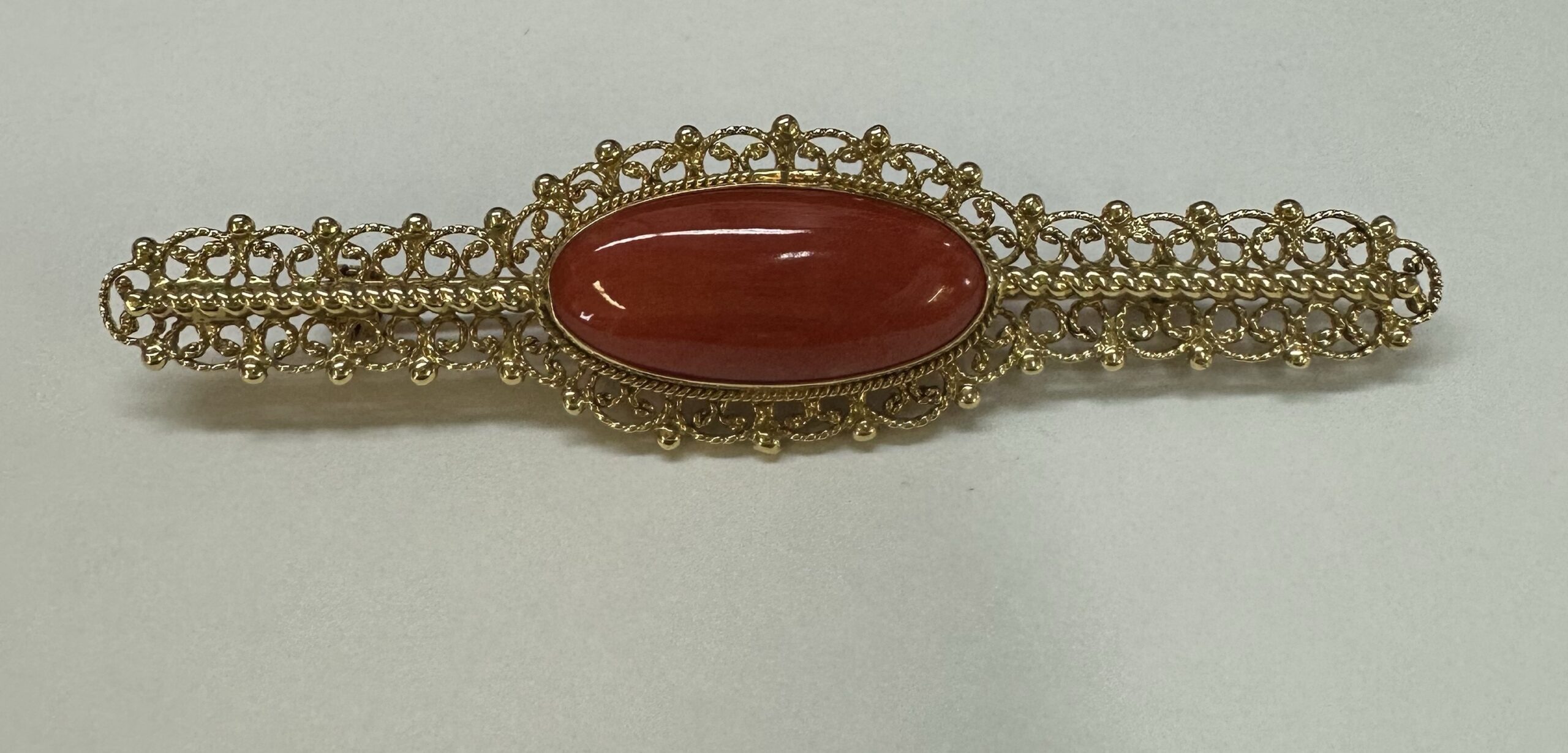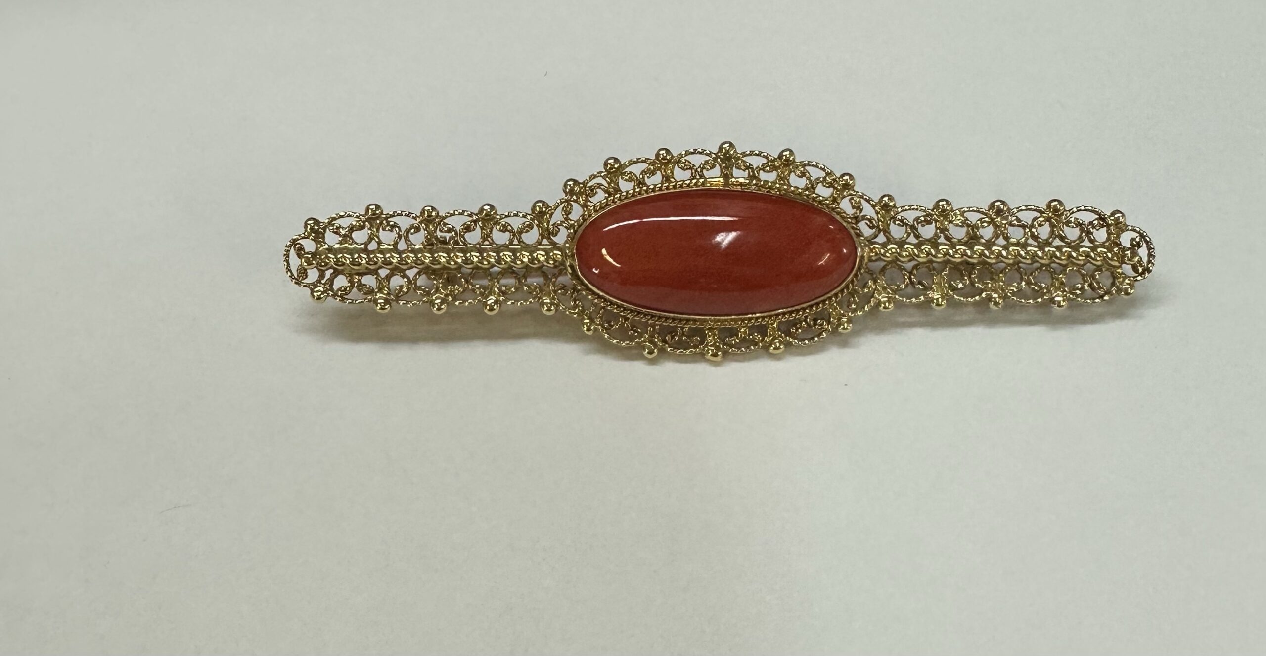 One-of-a-kind 18k yellow gold genuine Fine (high quality) Coral filigree brooch, directly imported from Italy. This brooch has an entire weight of 7.7 grams. This brooch measures 2 3/4” in length, and just under 3/4” in width.