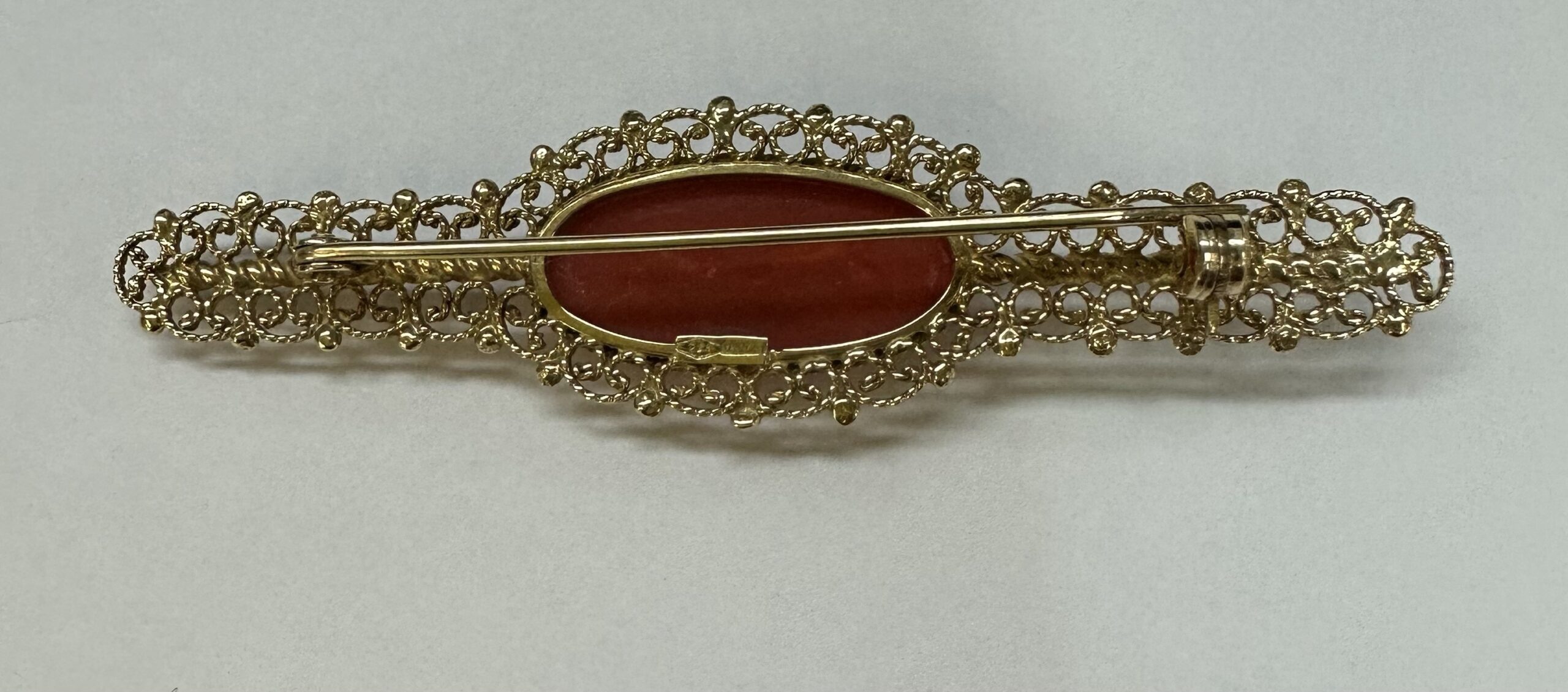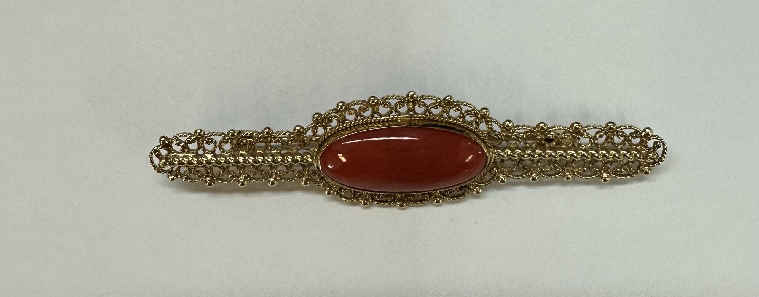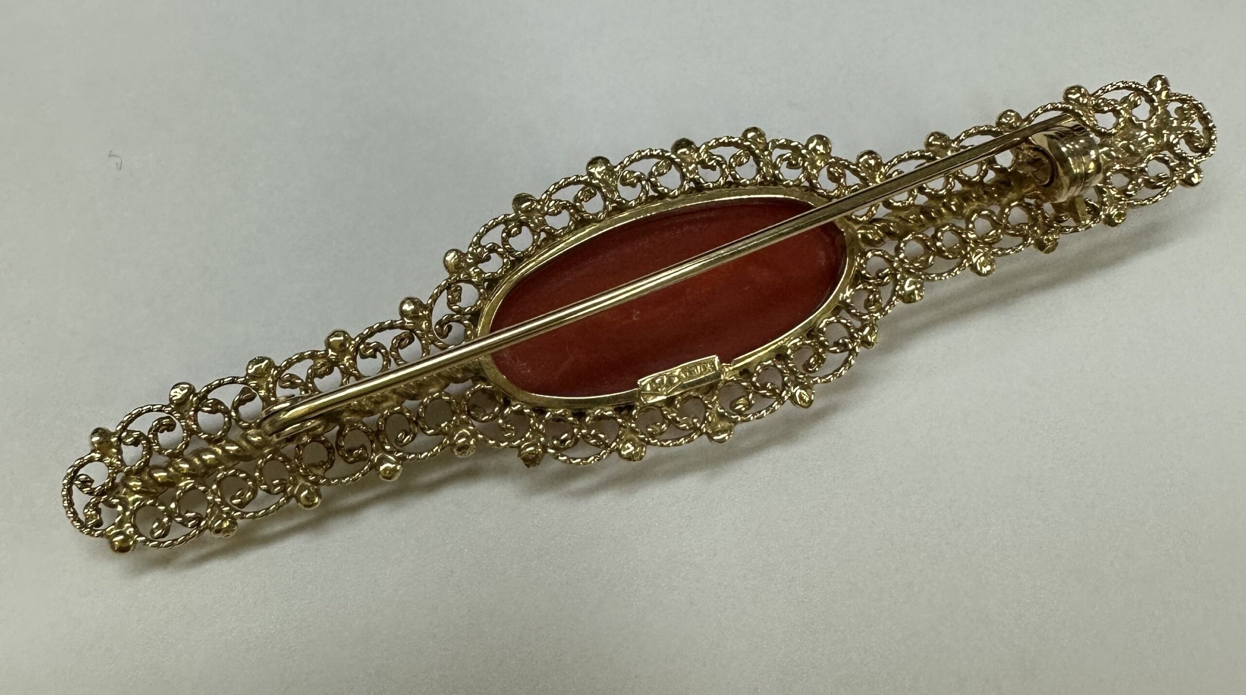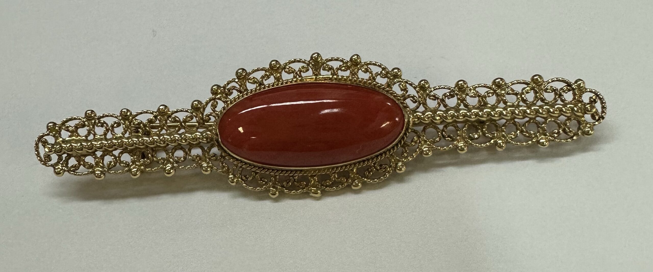 One-of-a-kind 18k yellow gold genuine Fine (high quality) Coral filigree brooch, directly imported from Italy. This brooch has an entire weight of 7.7 grams. This brooch measures 2 3/4” in length, and just under 3/4” in width.