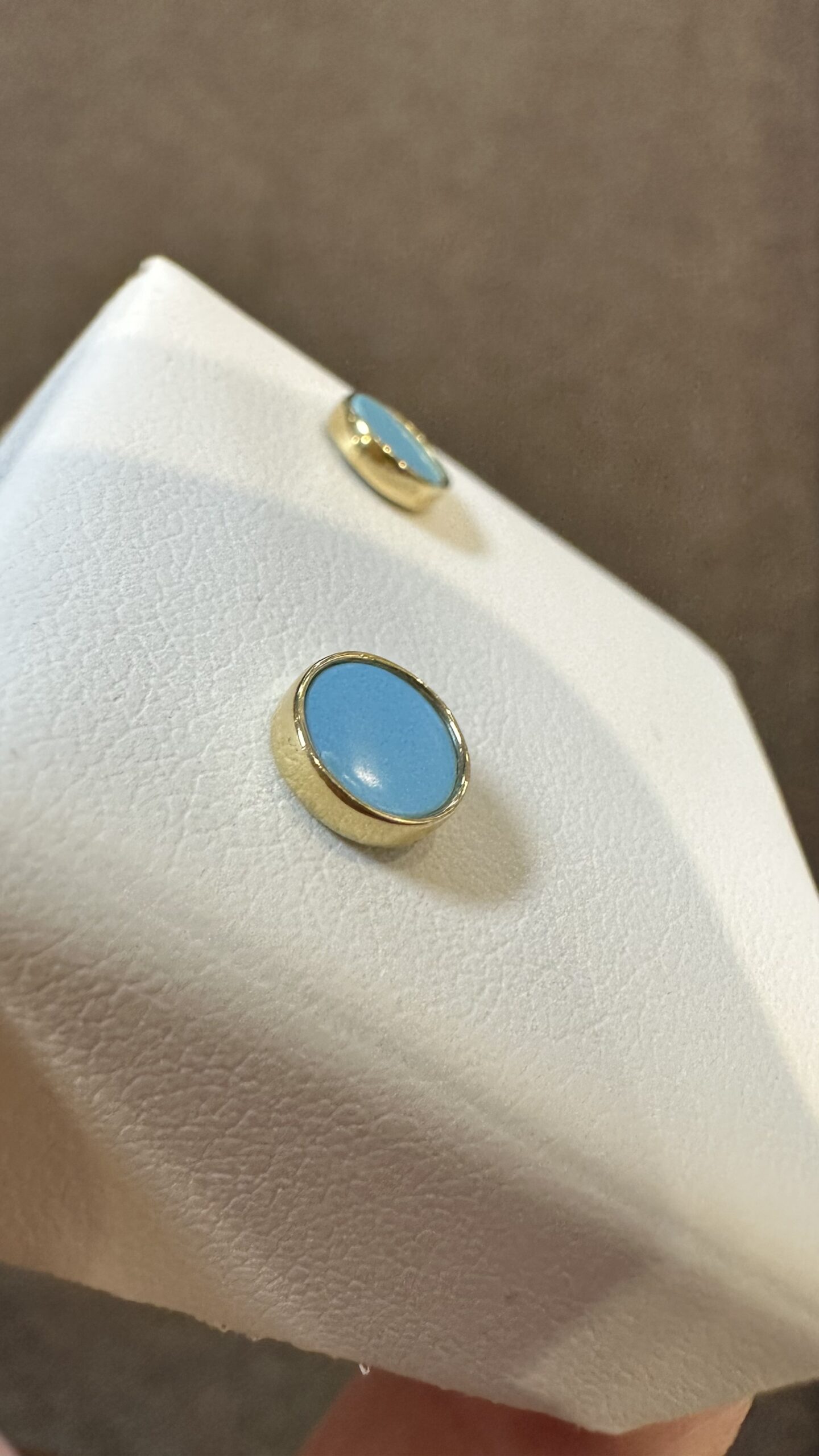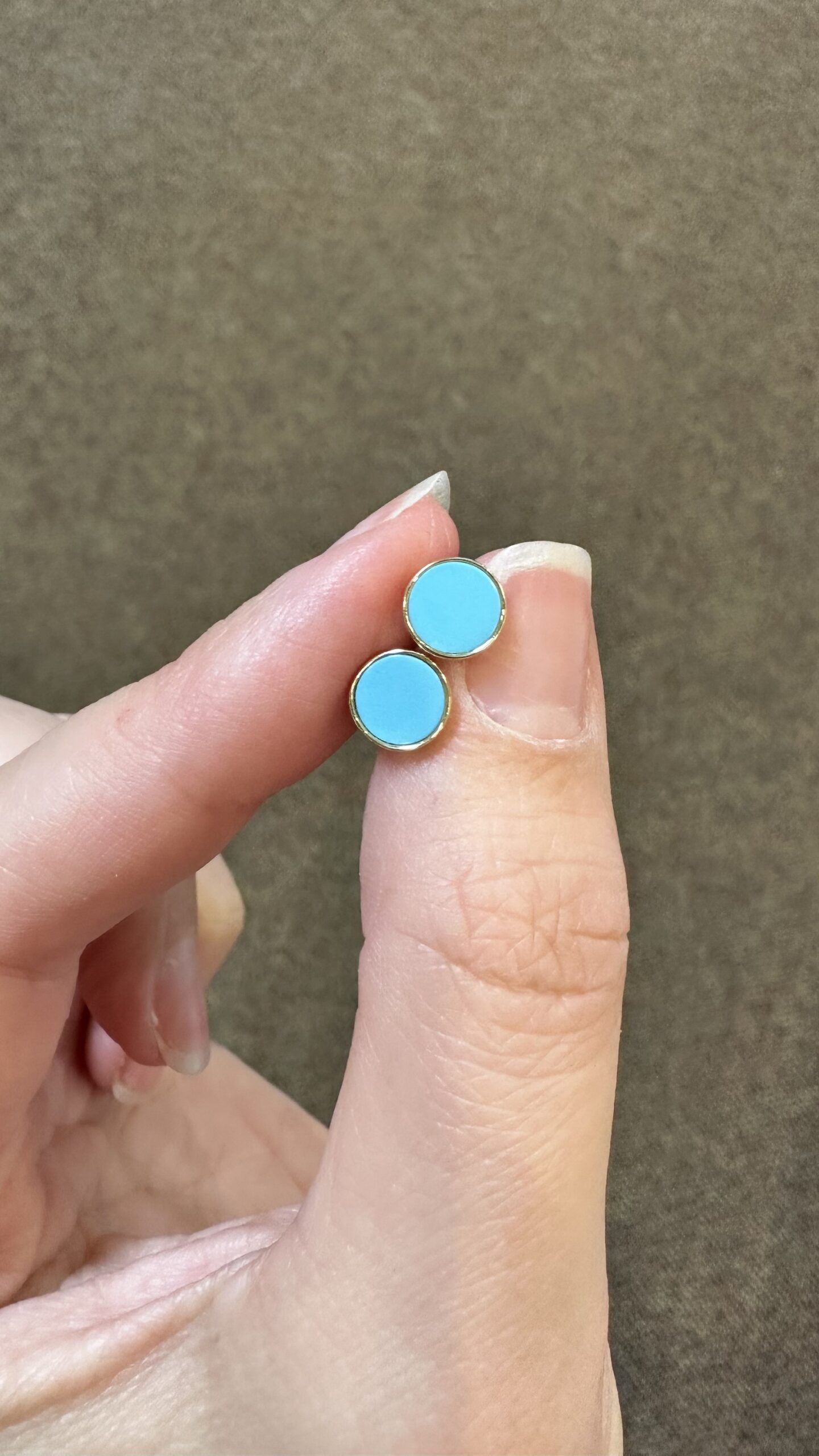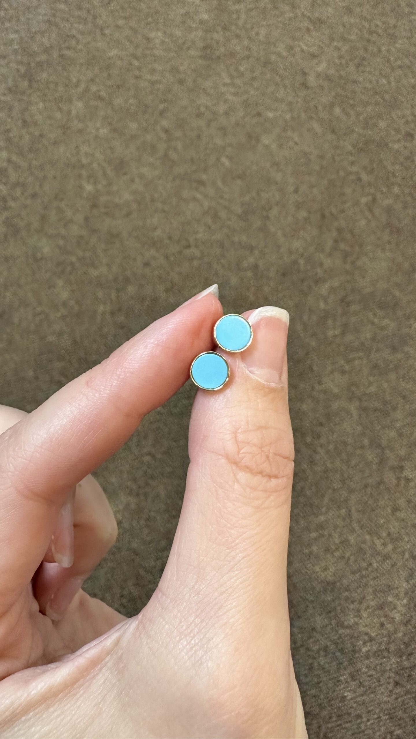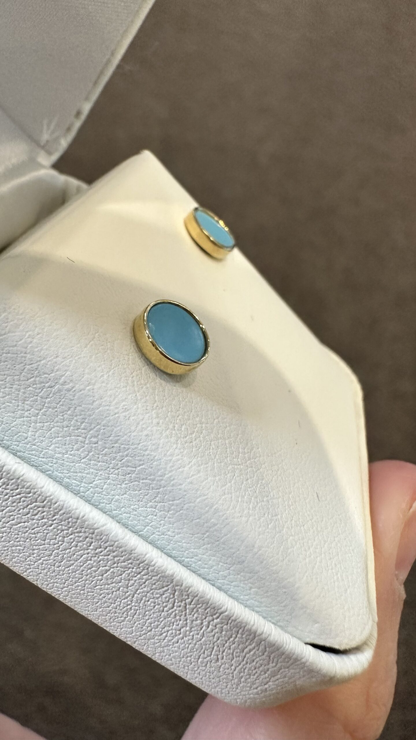 18k yellow gold genuine Turquoise inlay 7 mm stud earrings directly imported from Italy, @$235 (only one pair available!). These earrings have an entire weight of 1.17 grams.