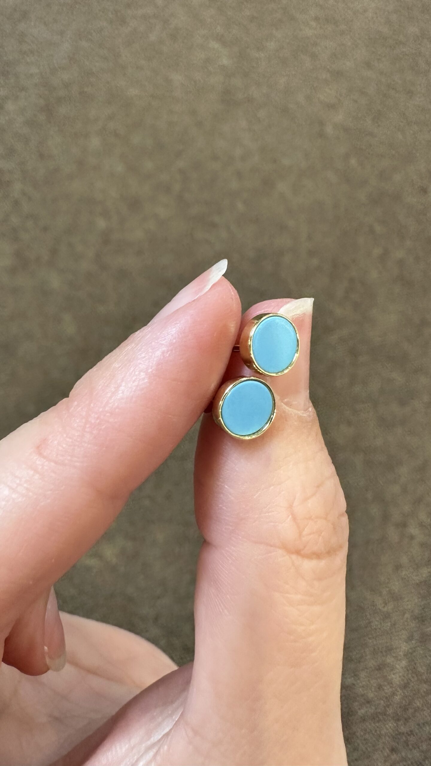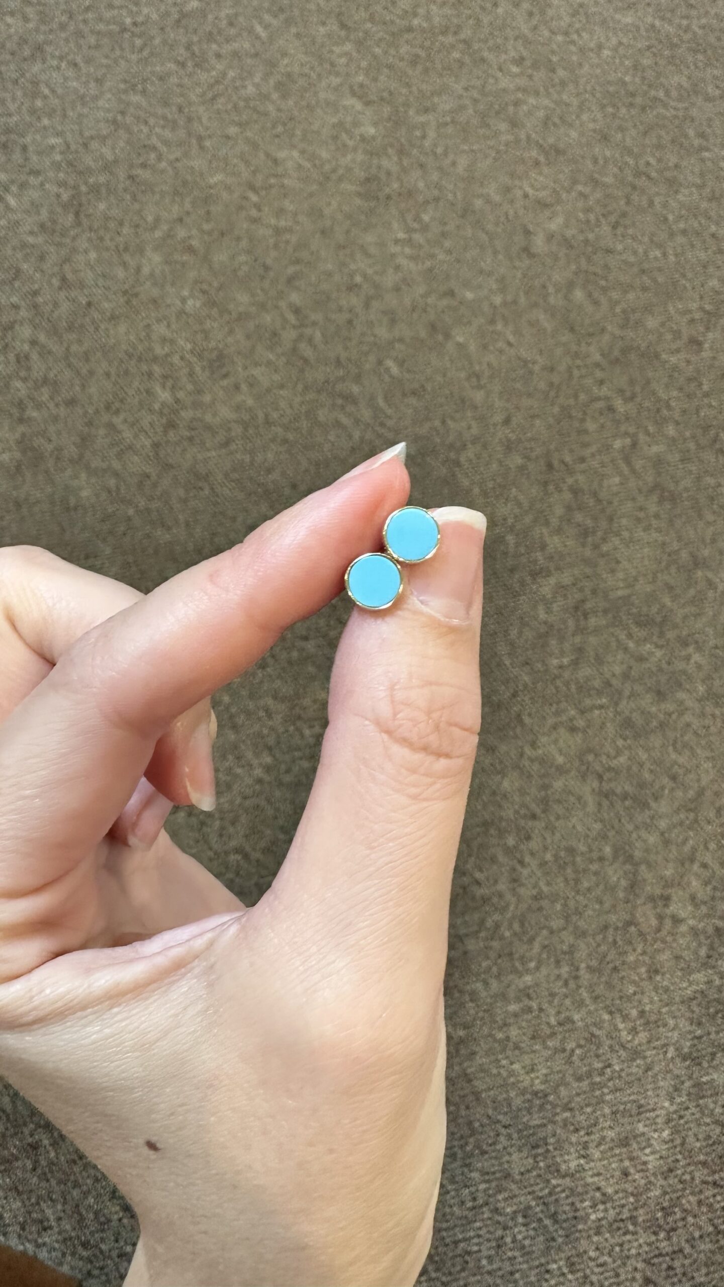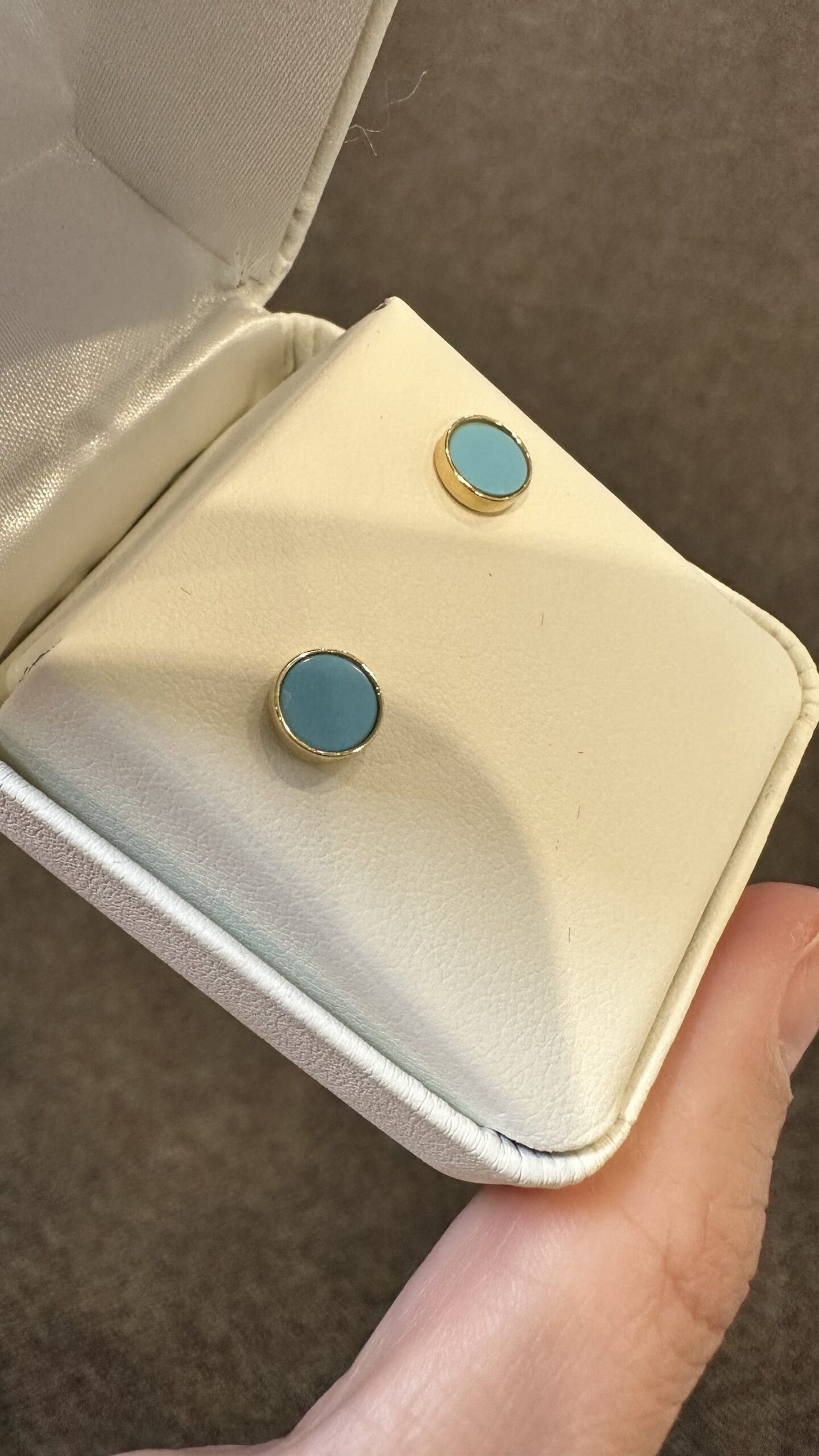 18k yellow gold genuine Turquoise inlay 7 mm stud earrings directly imported from Italy, @$235 (only one pair available!). These earrings have an entire weight of 1.17 grams.