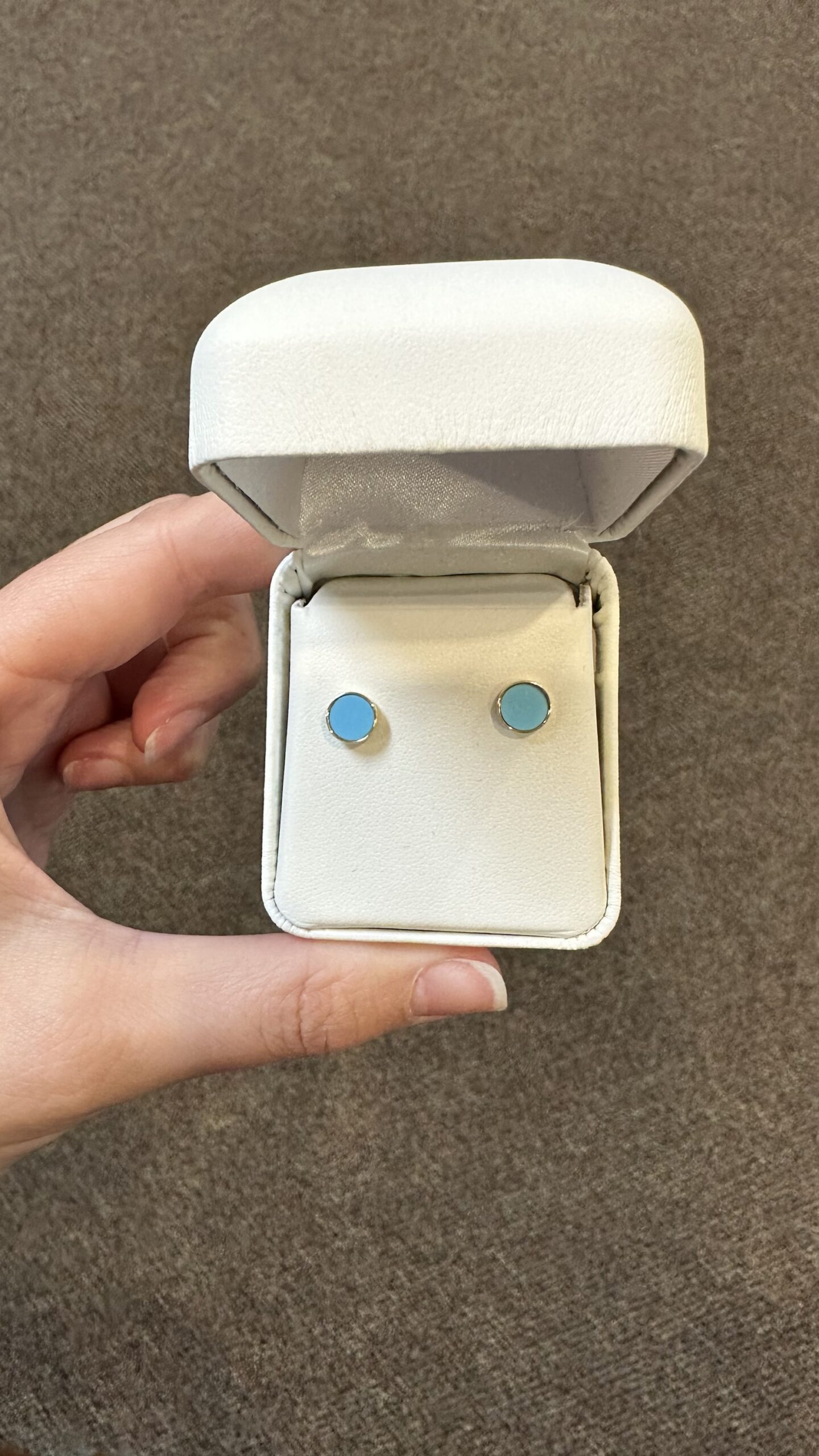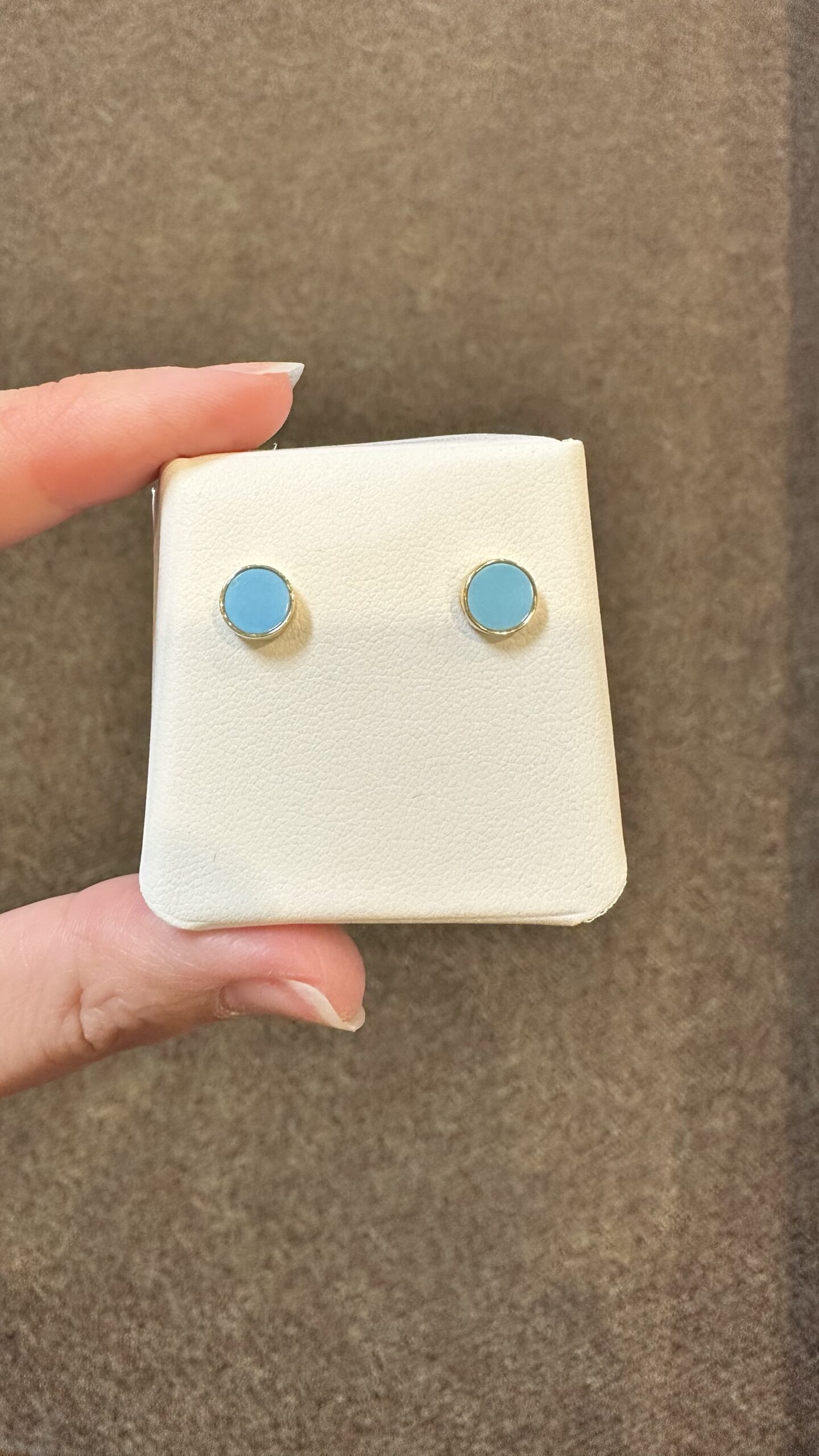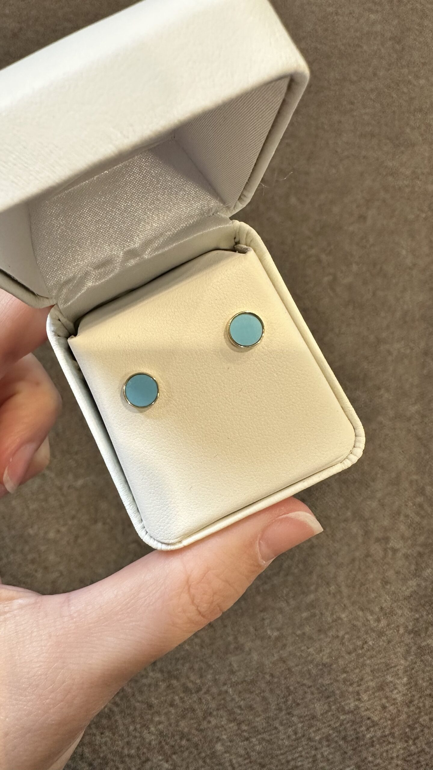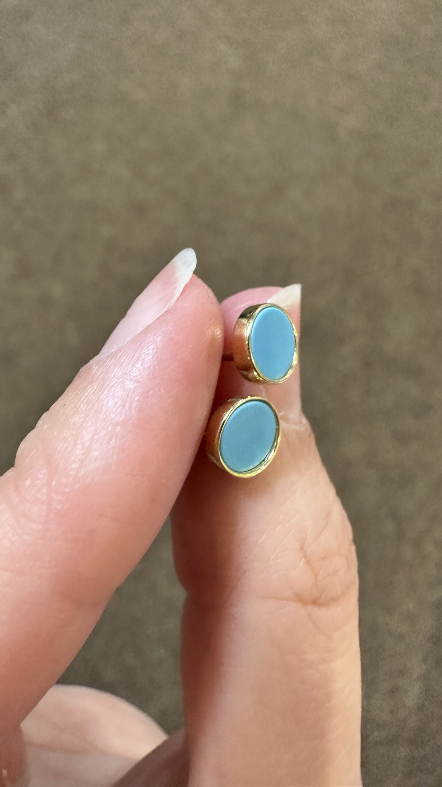 18k yellow gold genuine Turquoise inlay 7 mm stud earrings directly imported from Italy, @$235 (only one pair available!). These earrings have an entire weight of 1.17 grams.