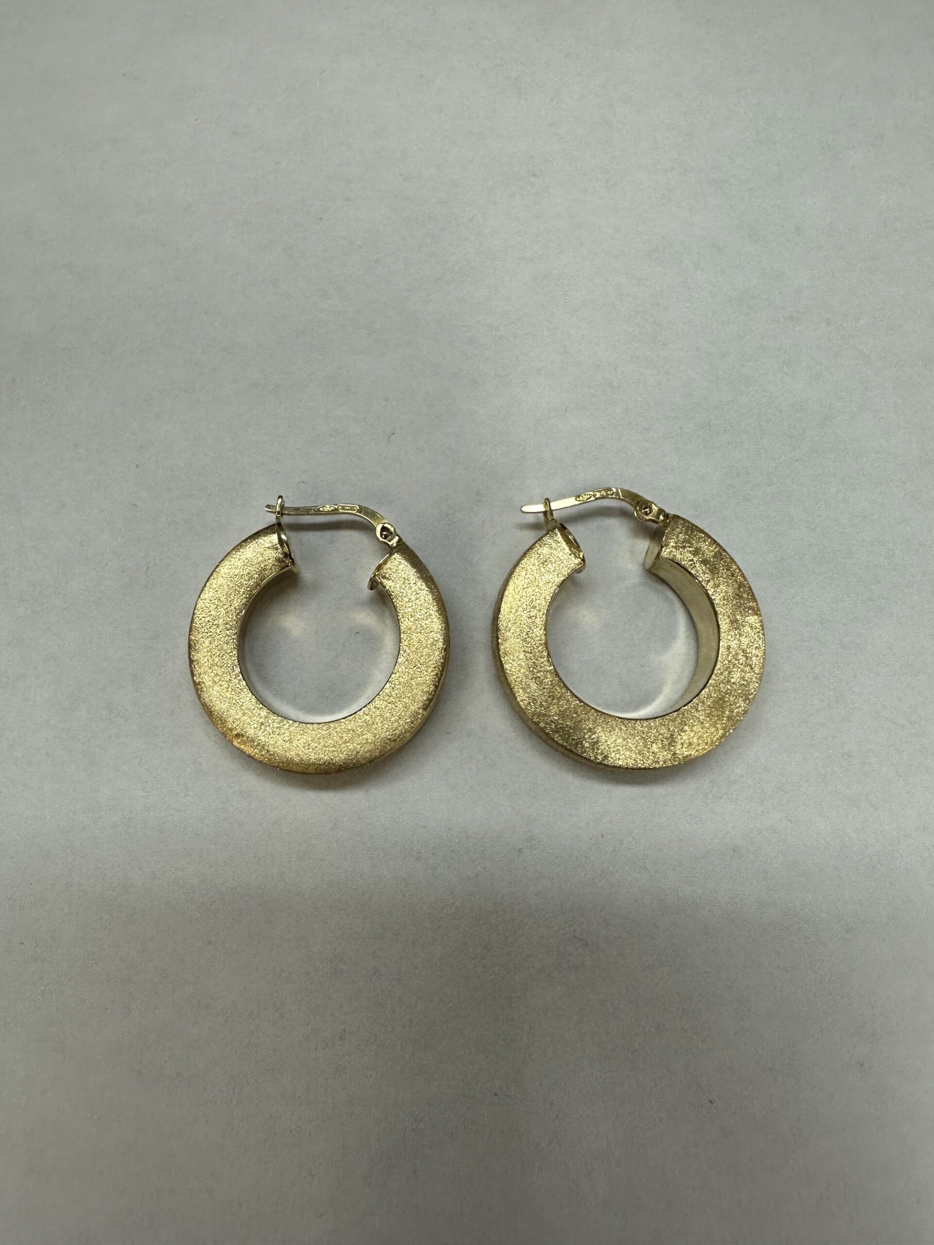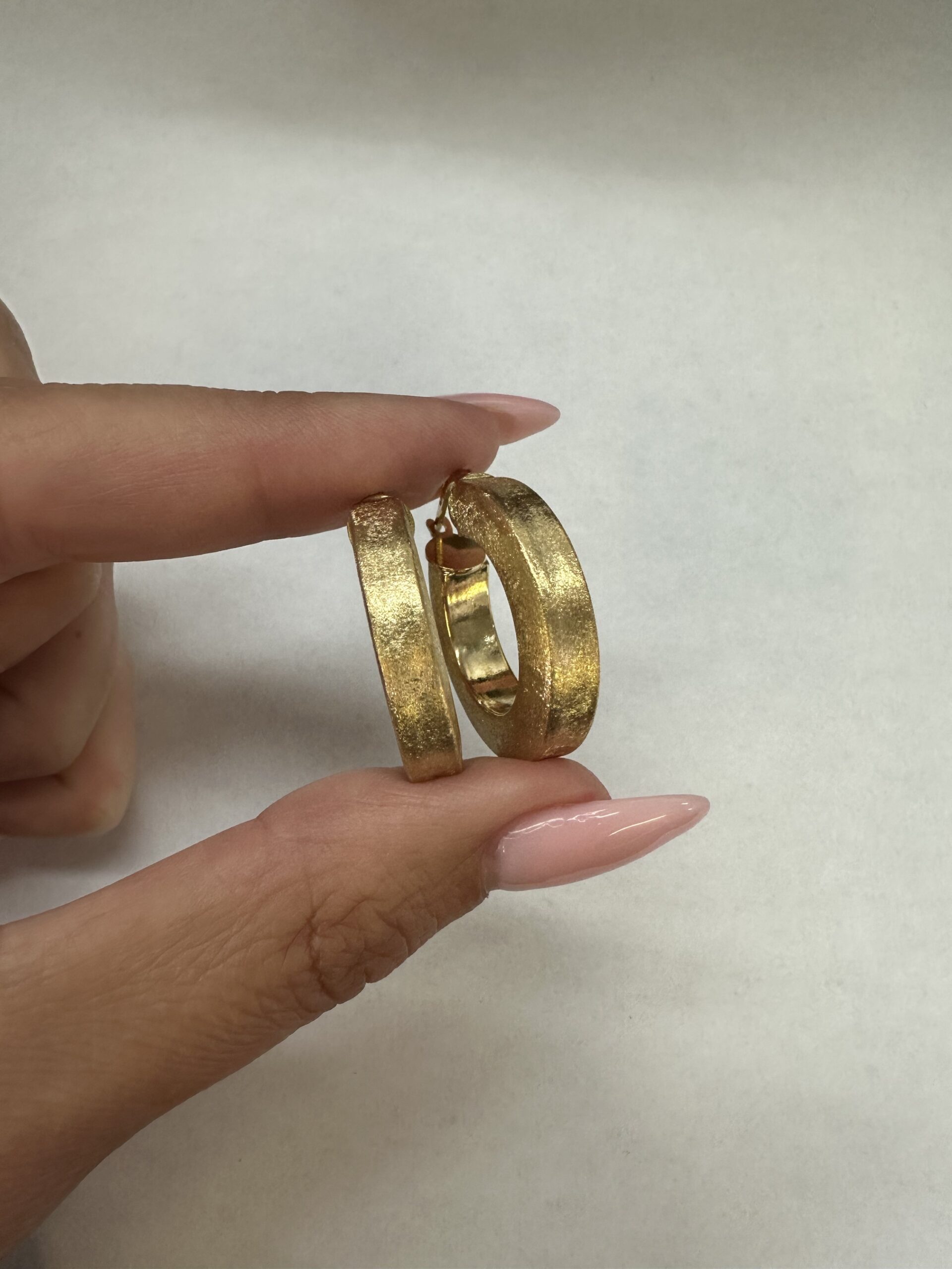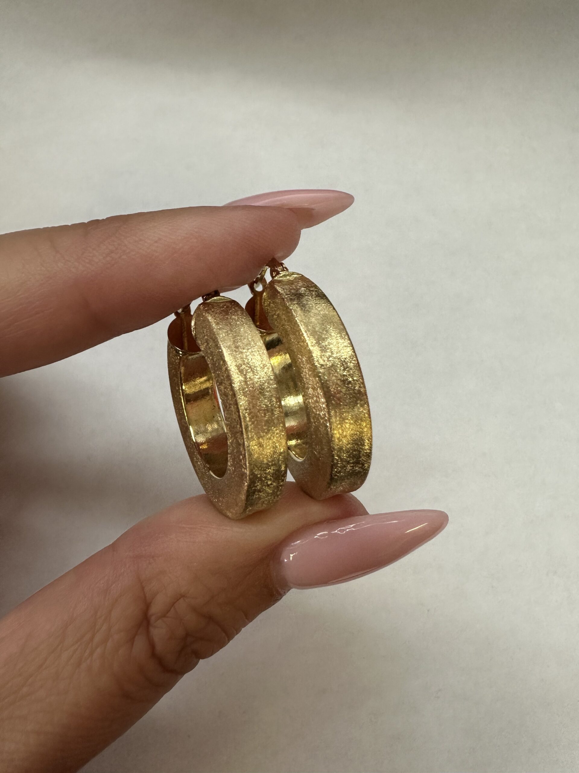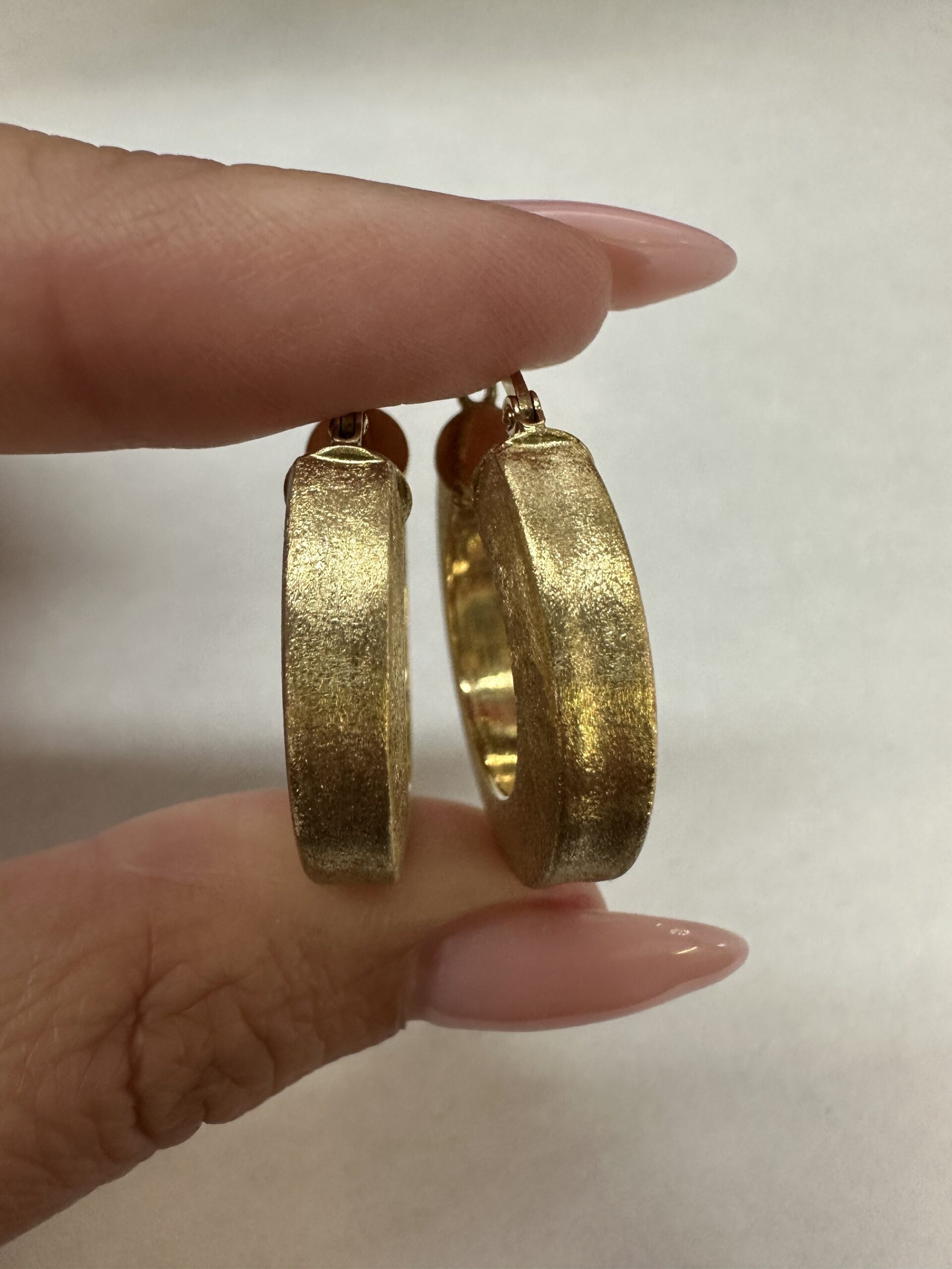 One-of-a-kind 18k yellow gold round hoop earrings with satin finish, directly imported from Italy. These earrings measure 5 x 25.5 mm in size, and they have an entire weight of 8.1 grams.