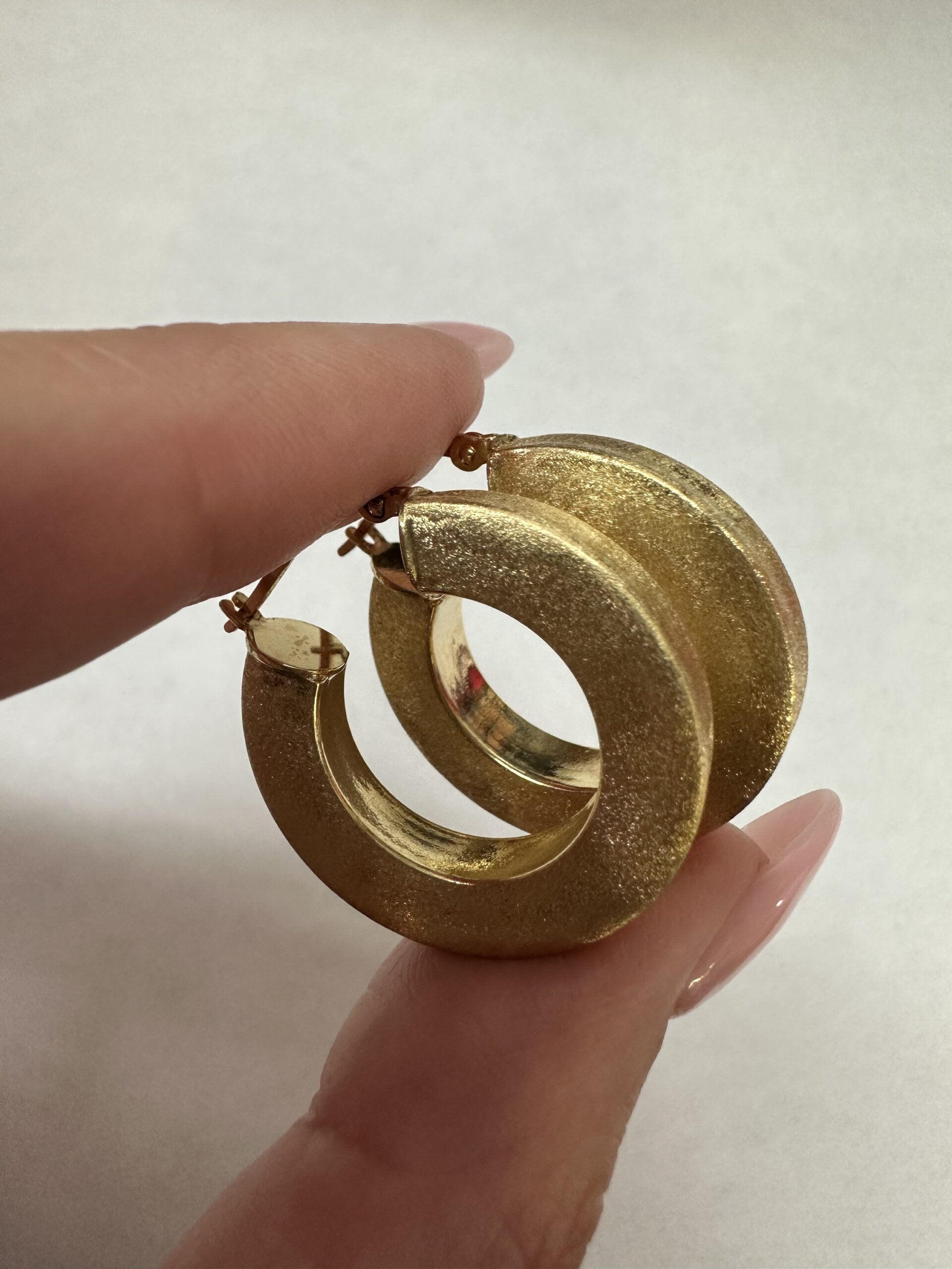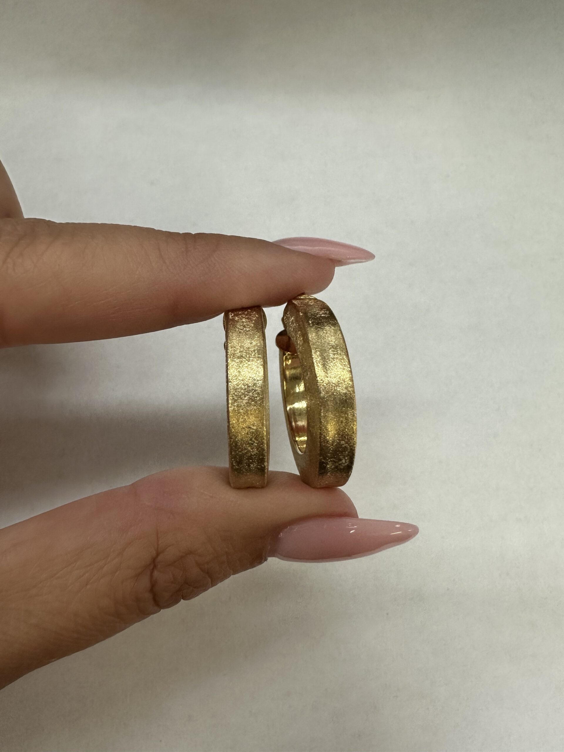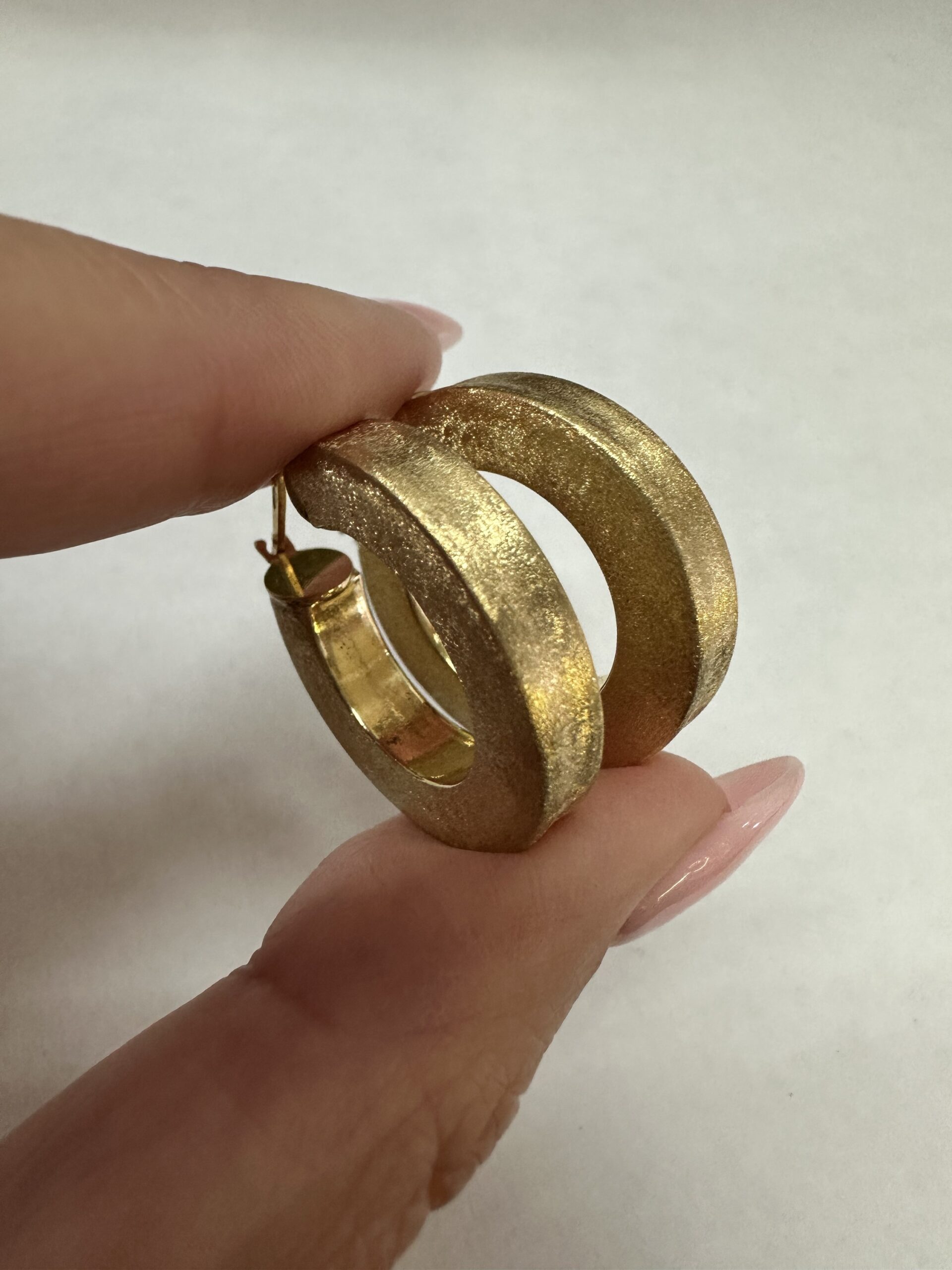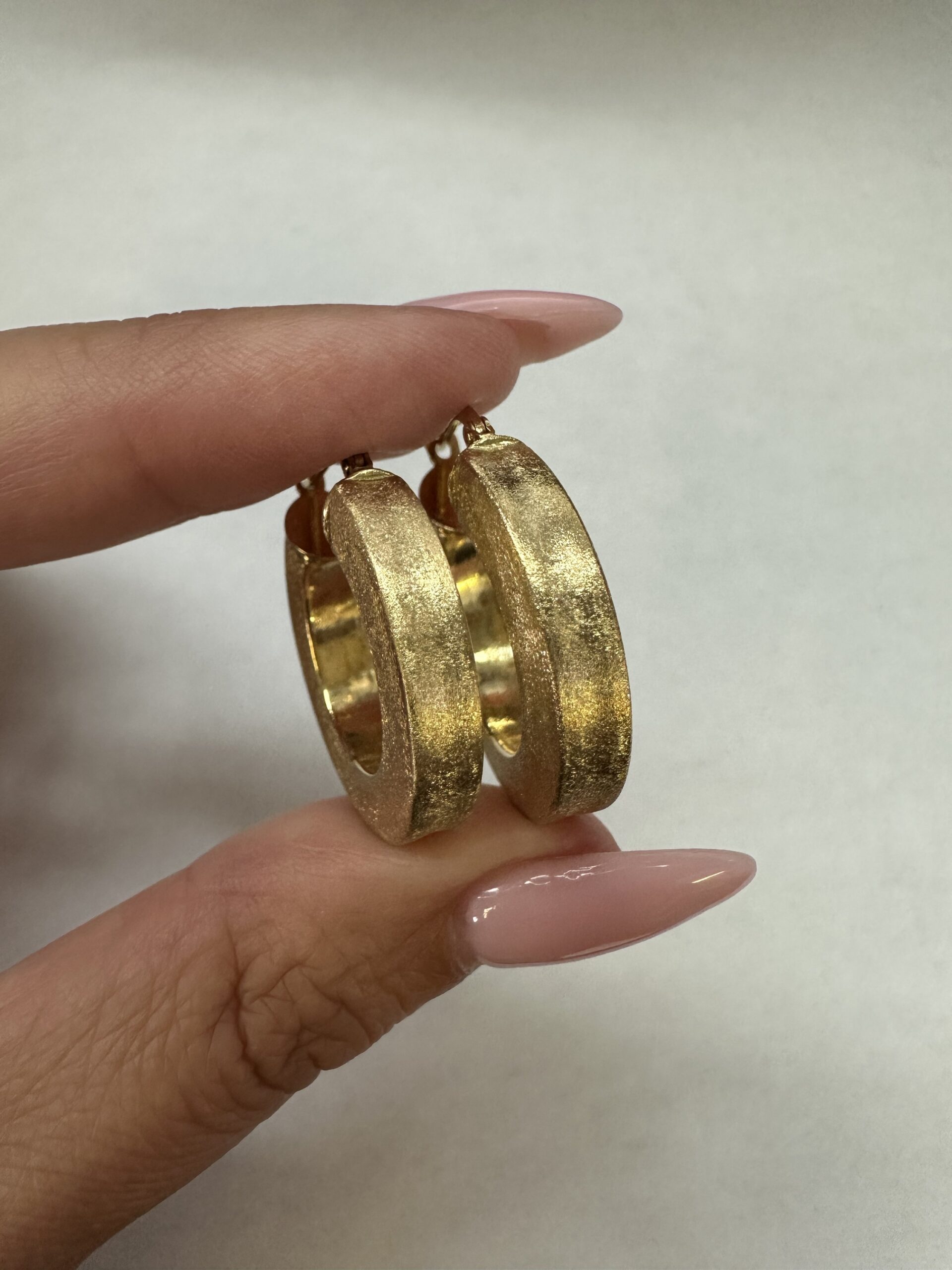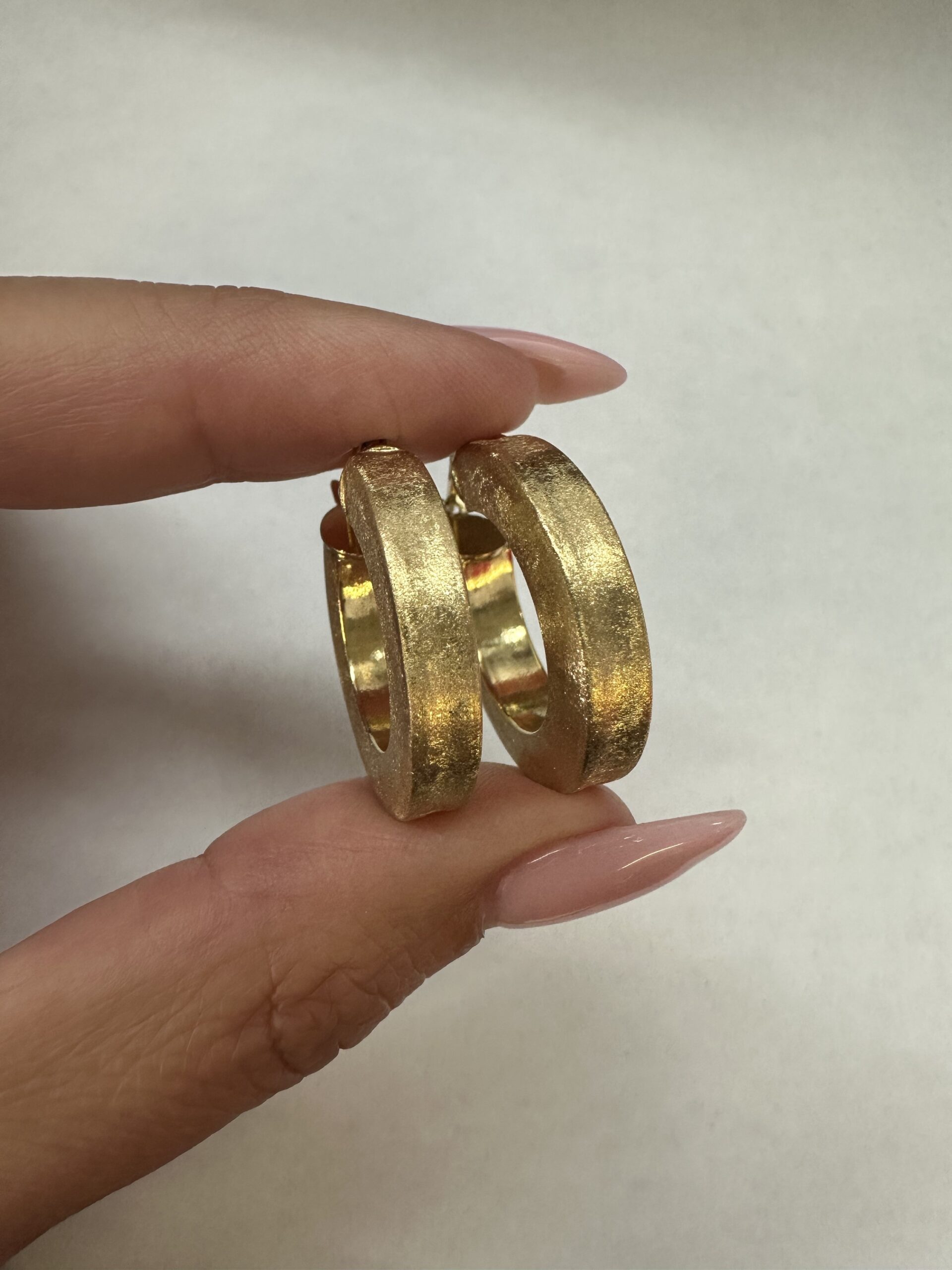 One-of-a-kind 18k yellow gold round hoop earrings with satin finish, directly imported from Italy. These earrings measure 5 x 25.5 mm in size, and they have an entire weight of 8.1 grams.