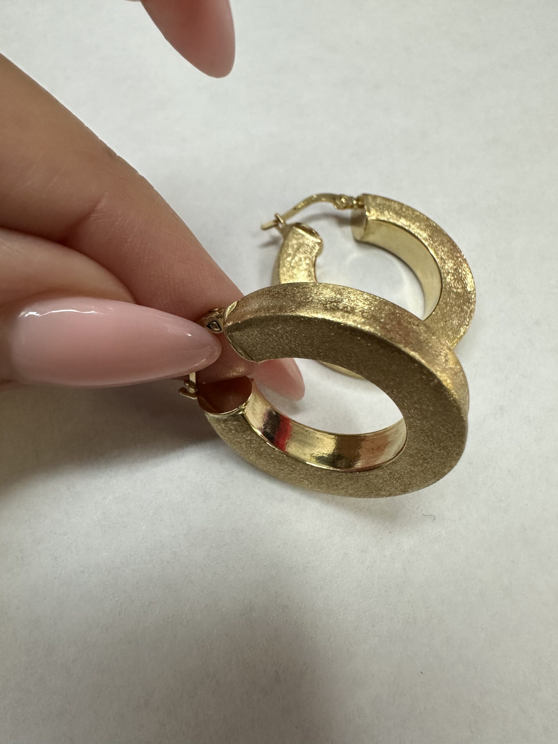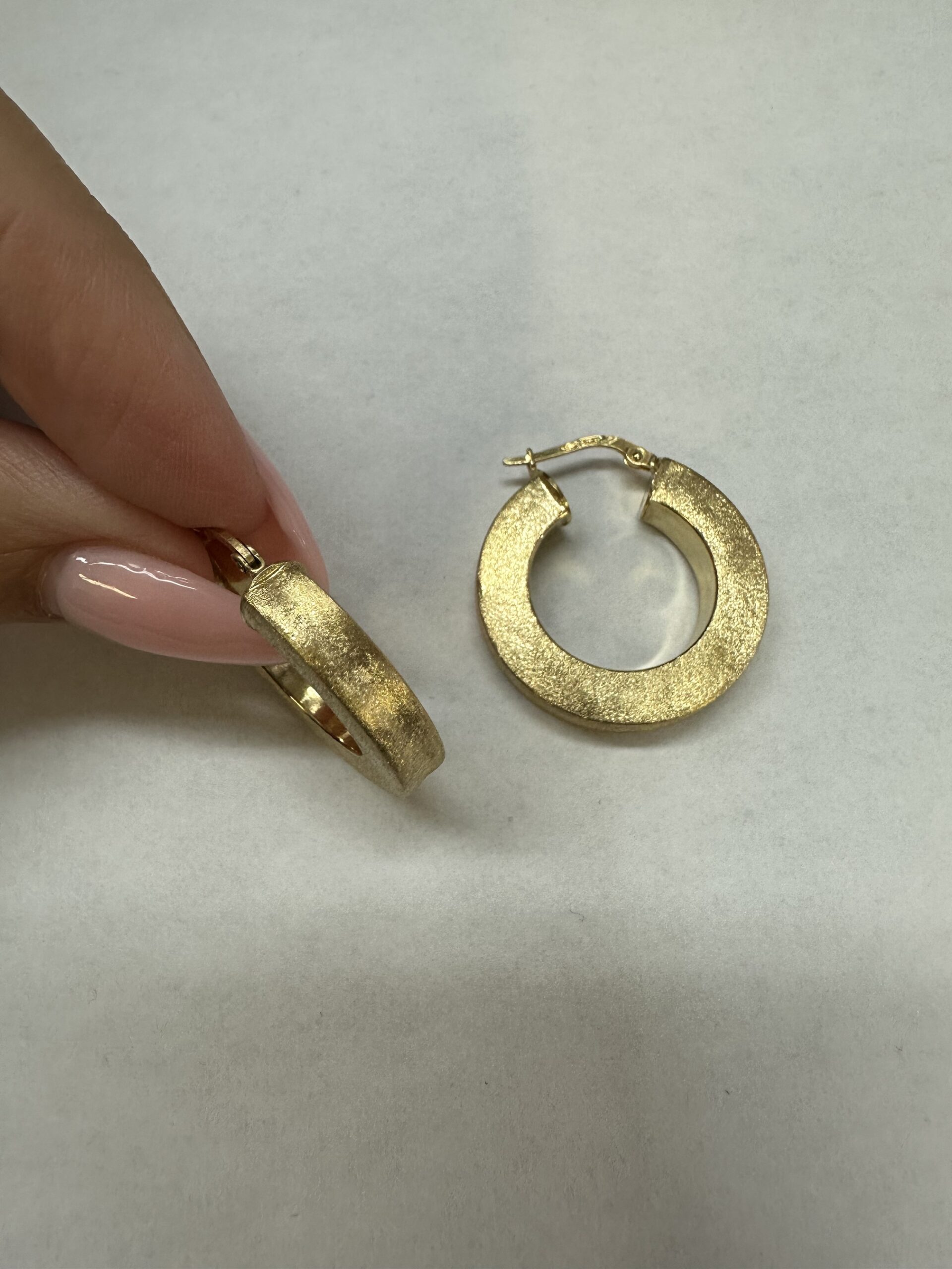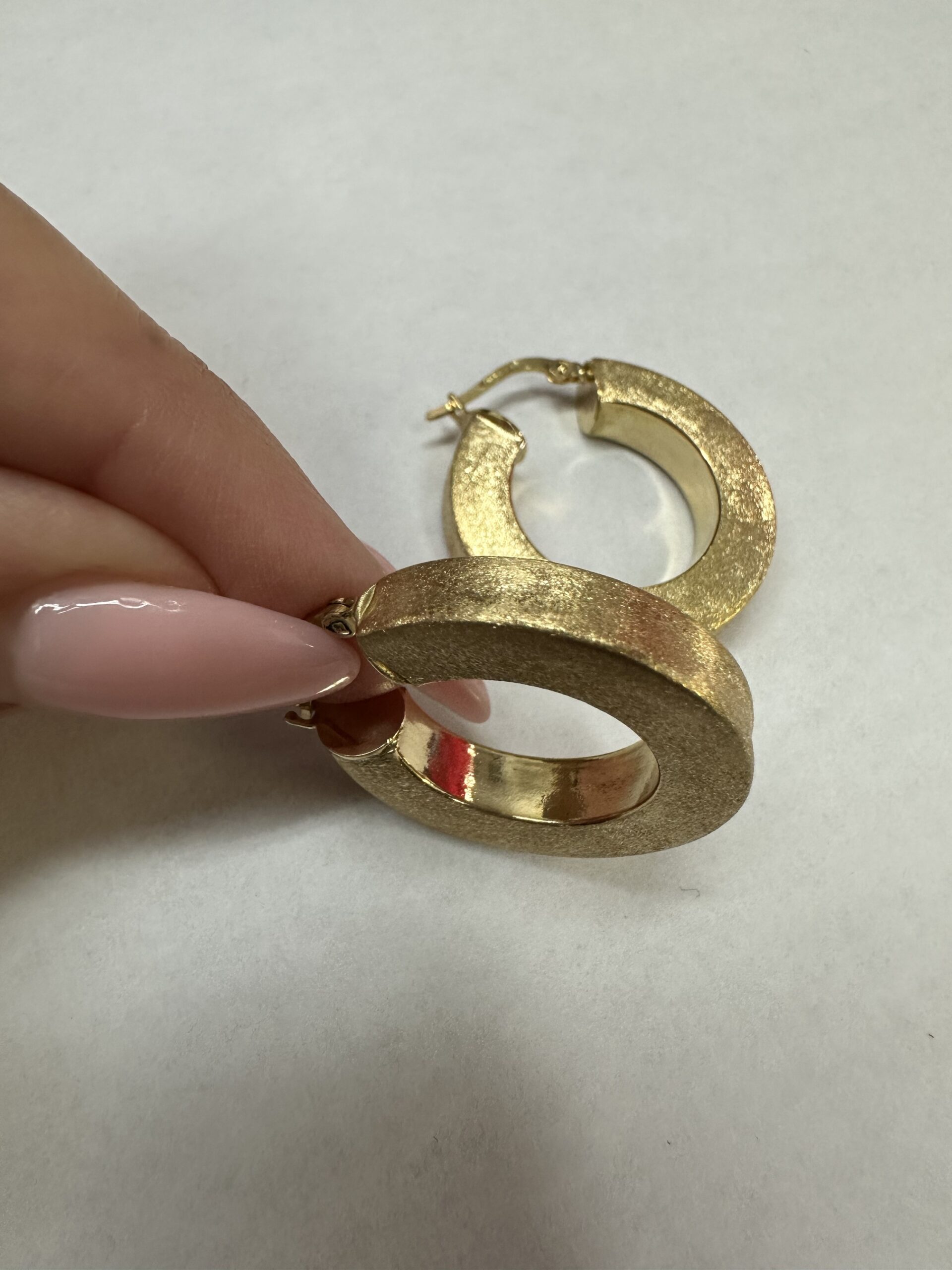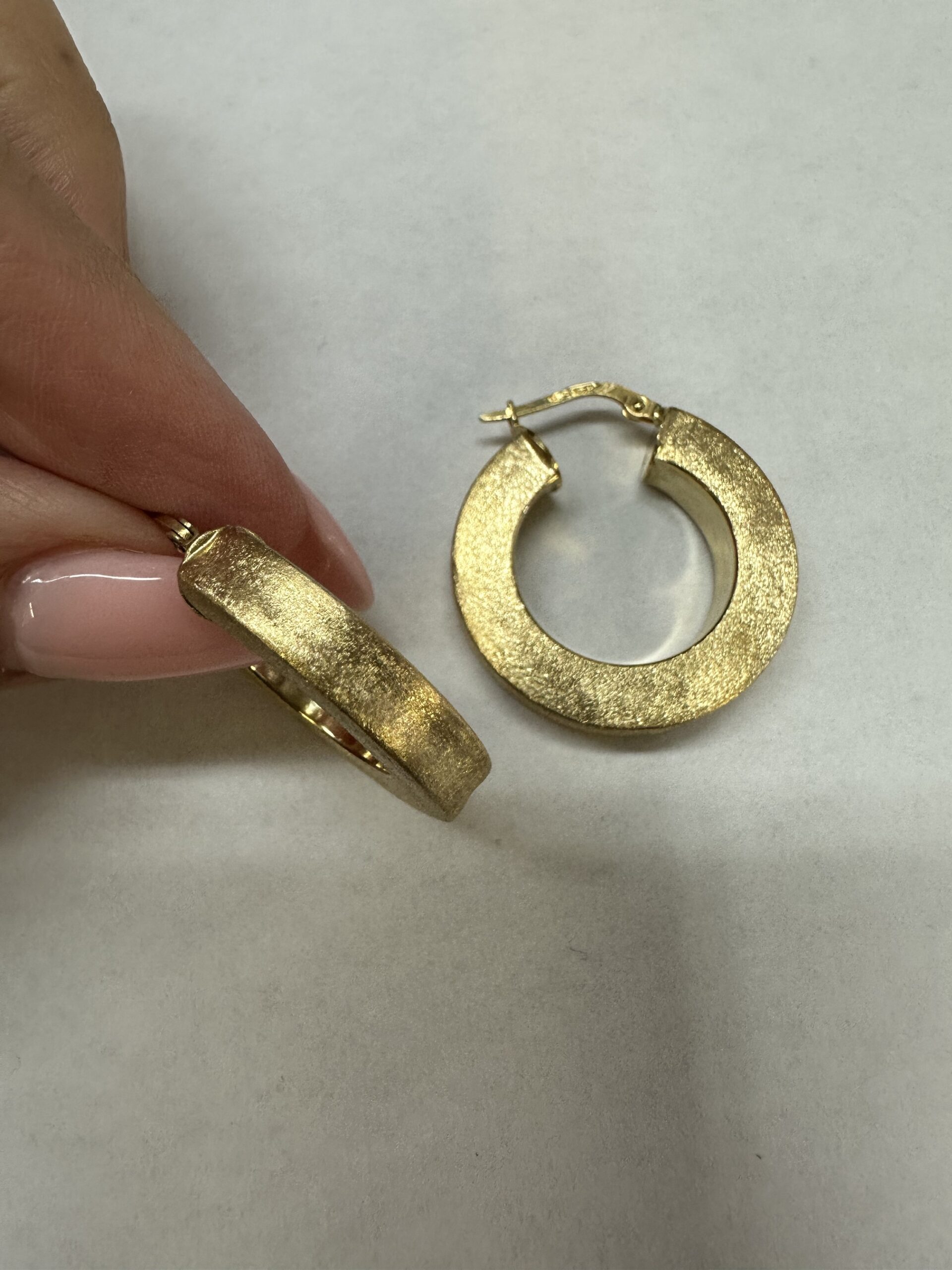 One-of-a-kind 18k yellow gold round hoop earrings with satin finish, directly imported from Italy. These earrings measure 5 x 25.5 mm in size, and they have an entire weight of 8.1 grams.
