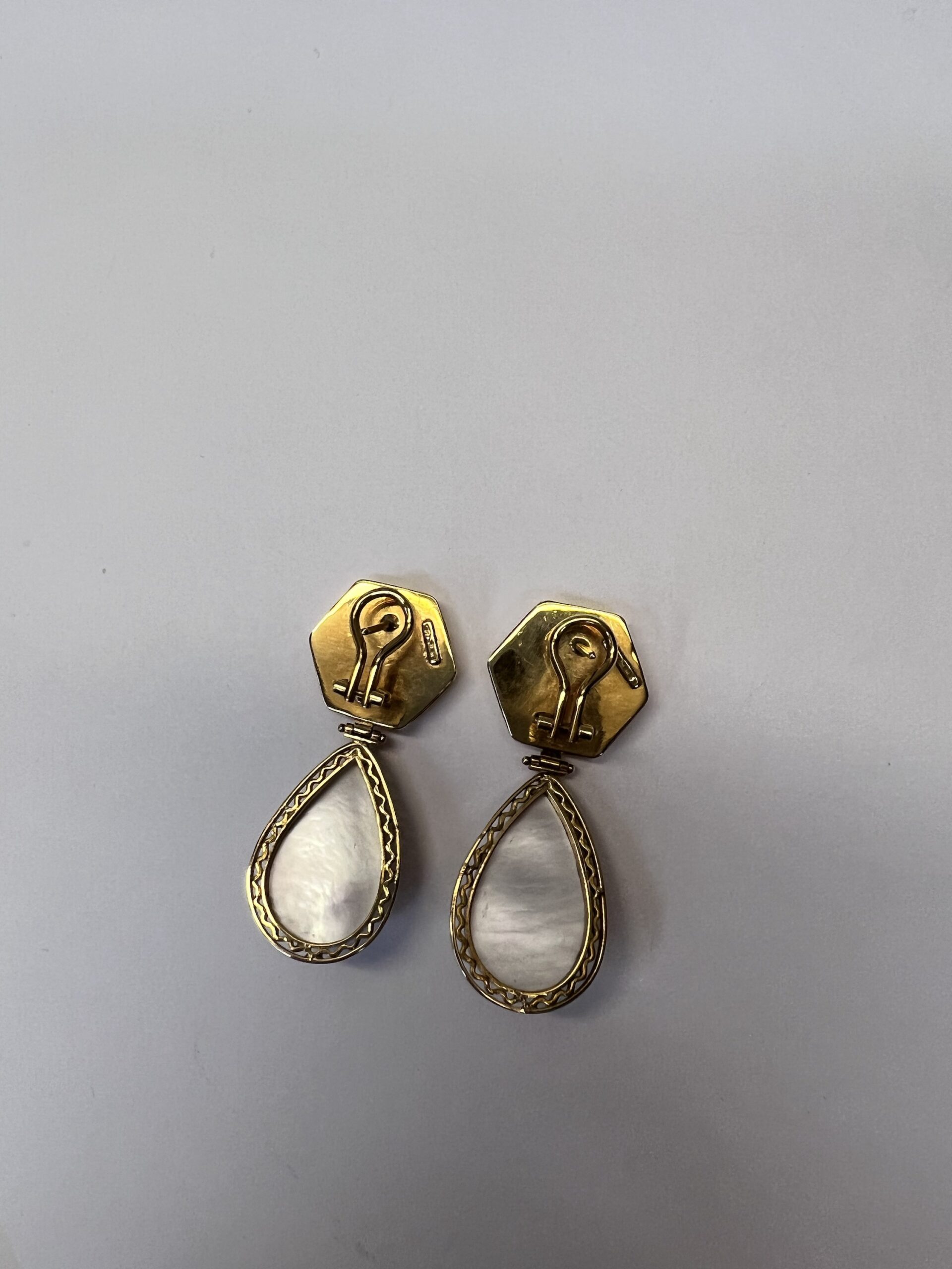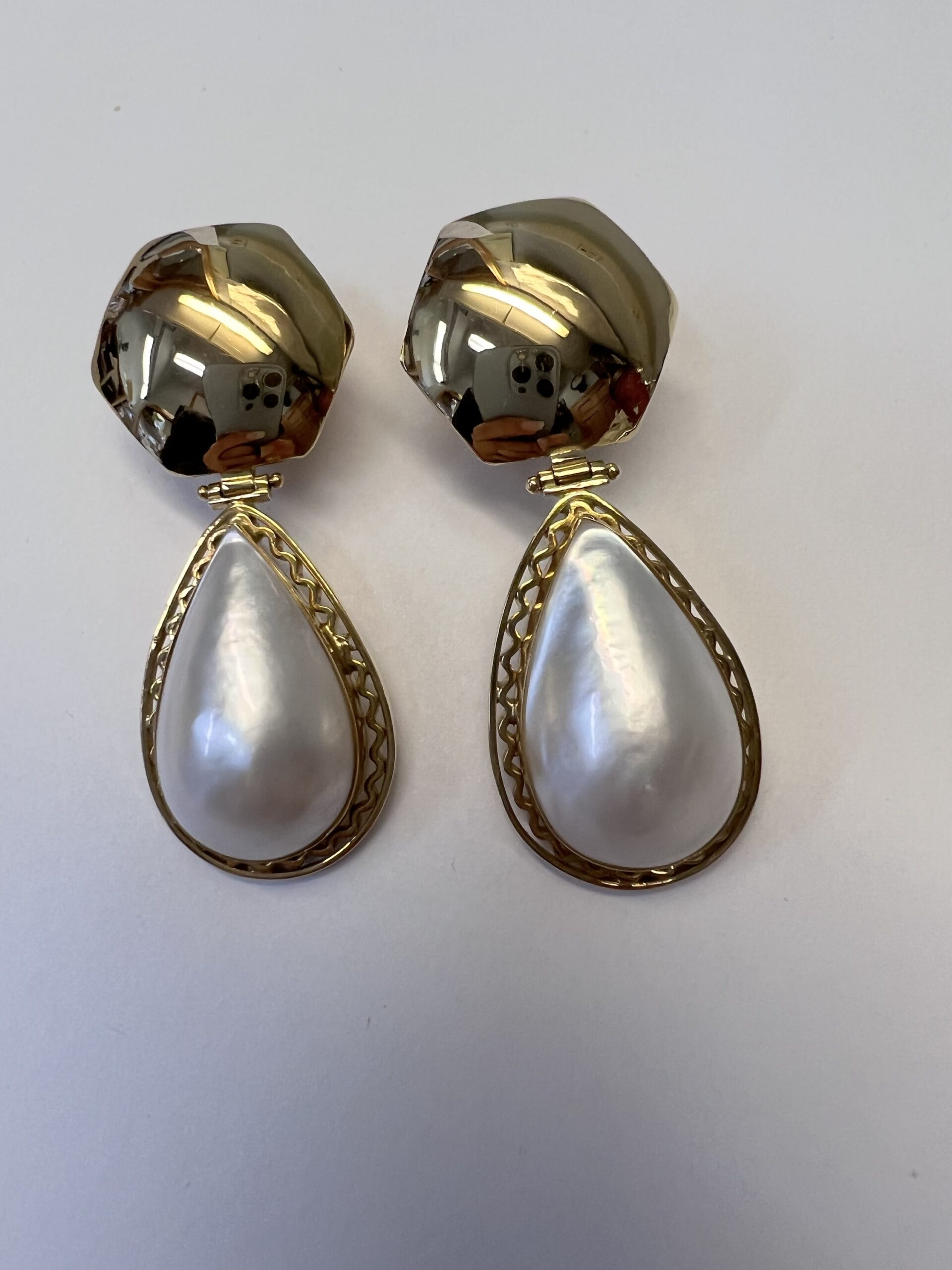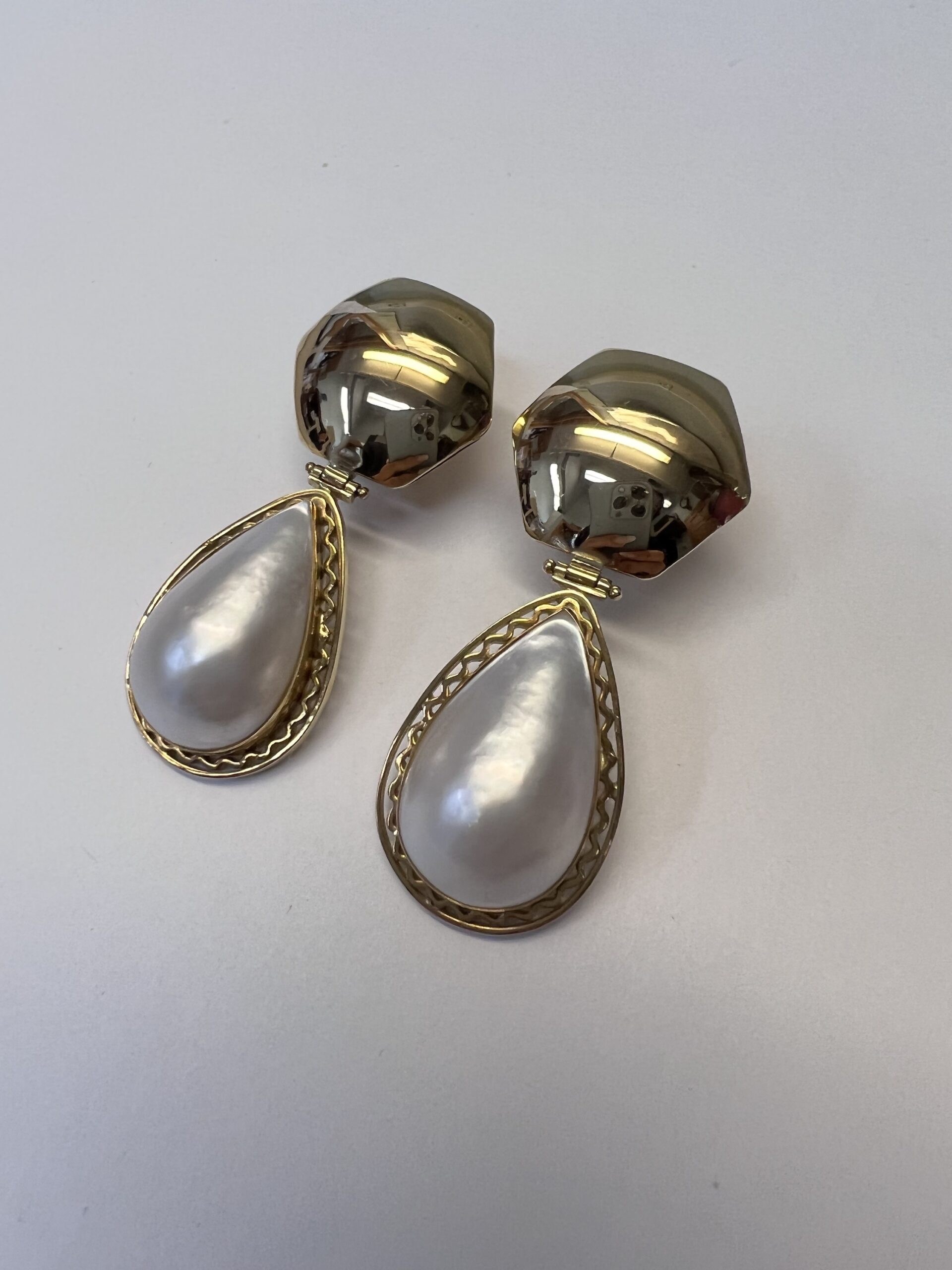 18k yellow gold Mabe pearl dangle post & clip earrings directly imported from Italy, having a total weight of 22.3 grams, These earrings measure 2” in total length.