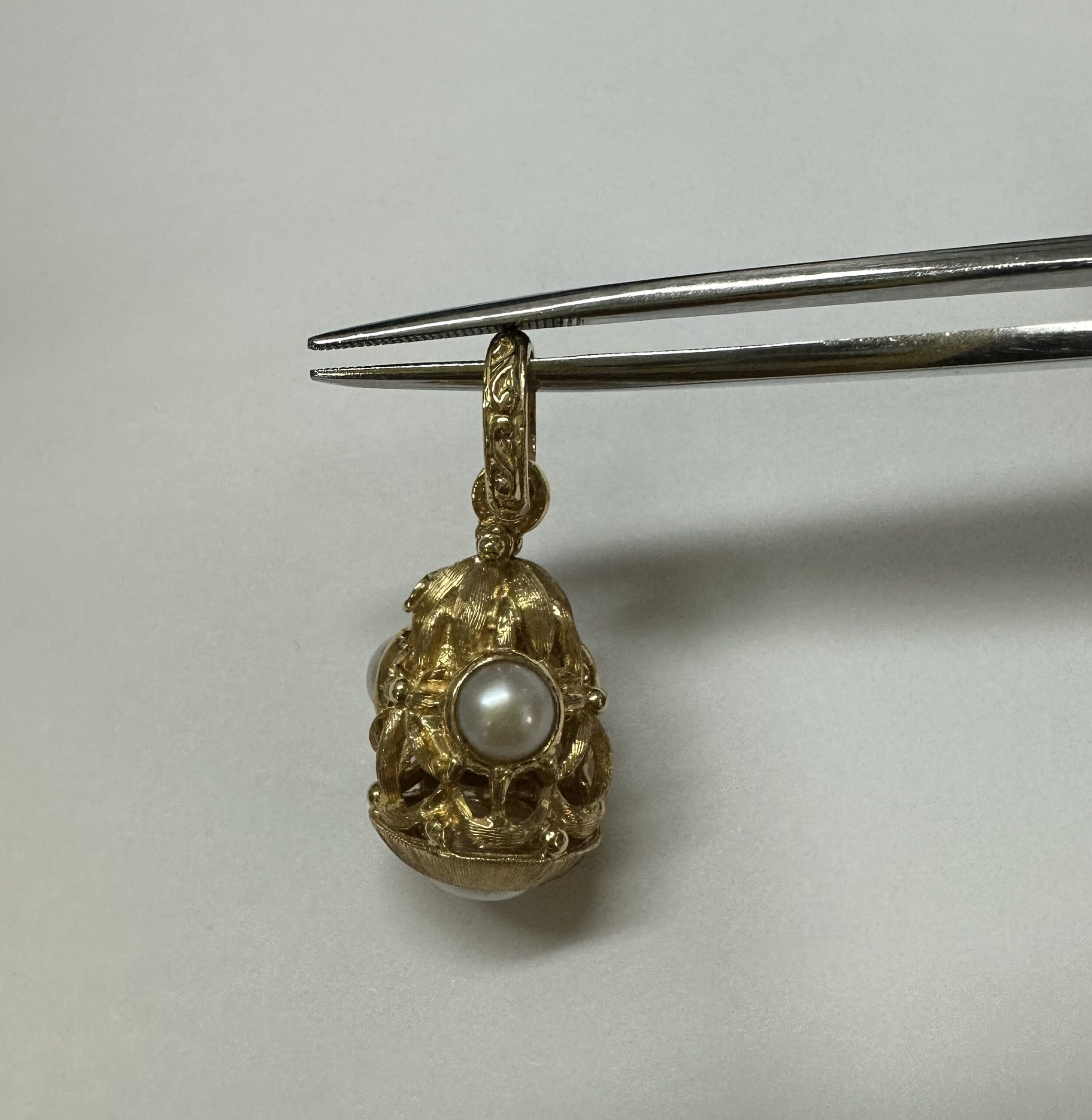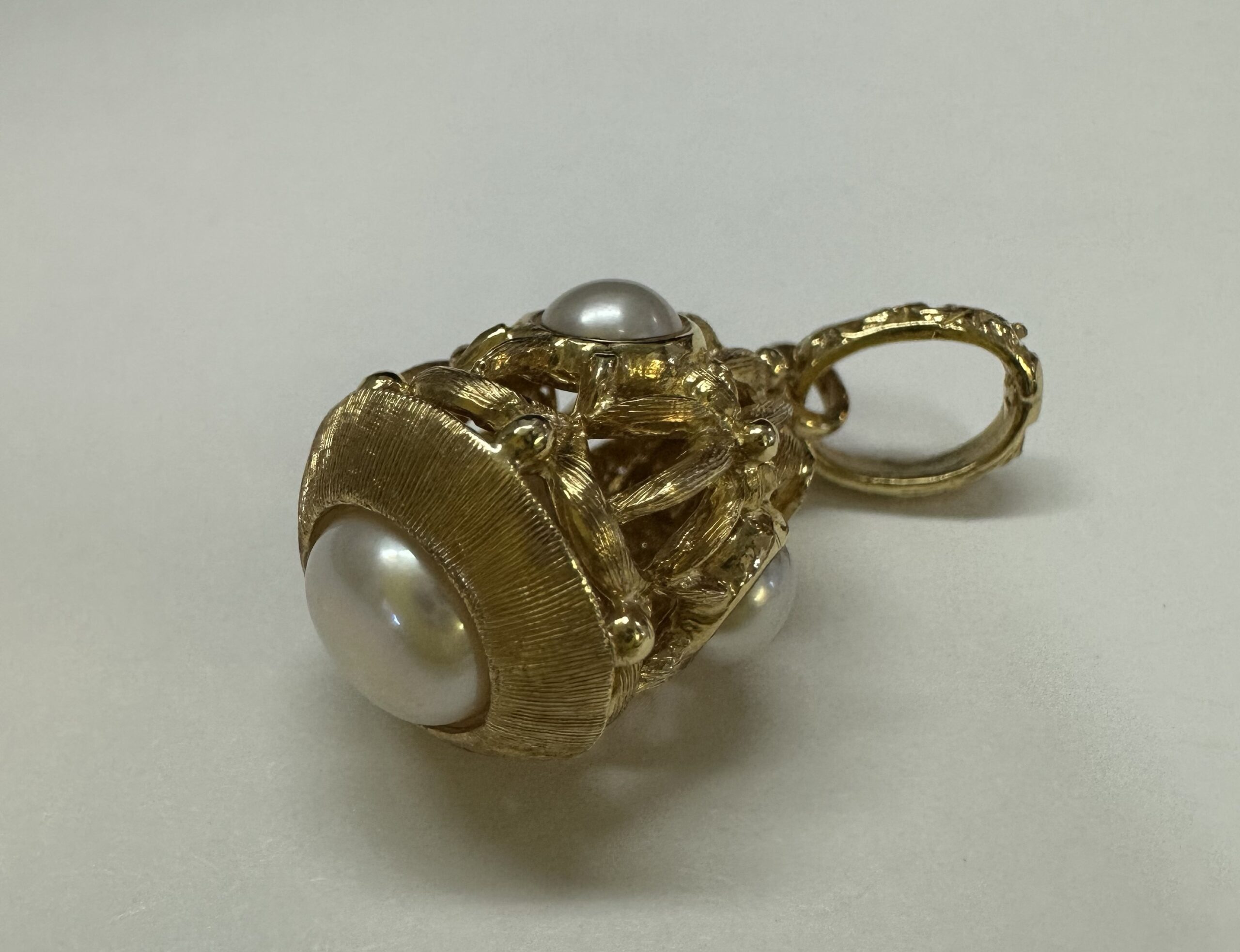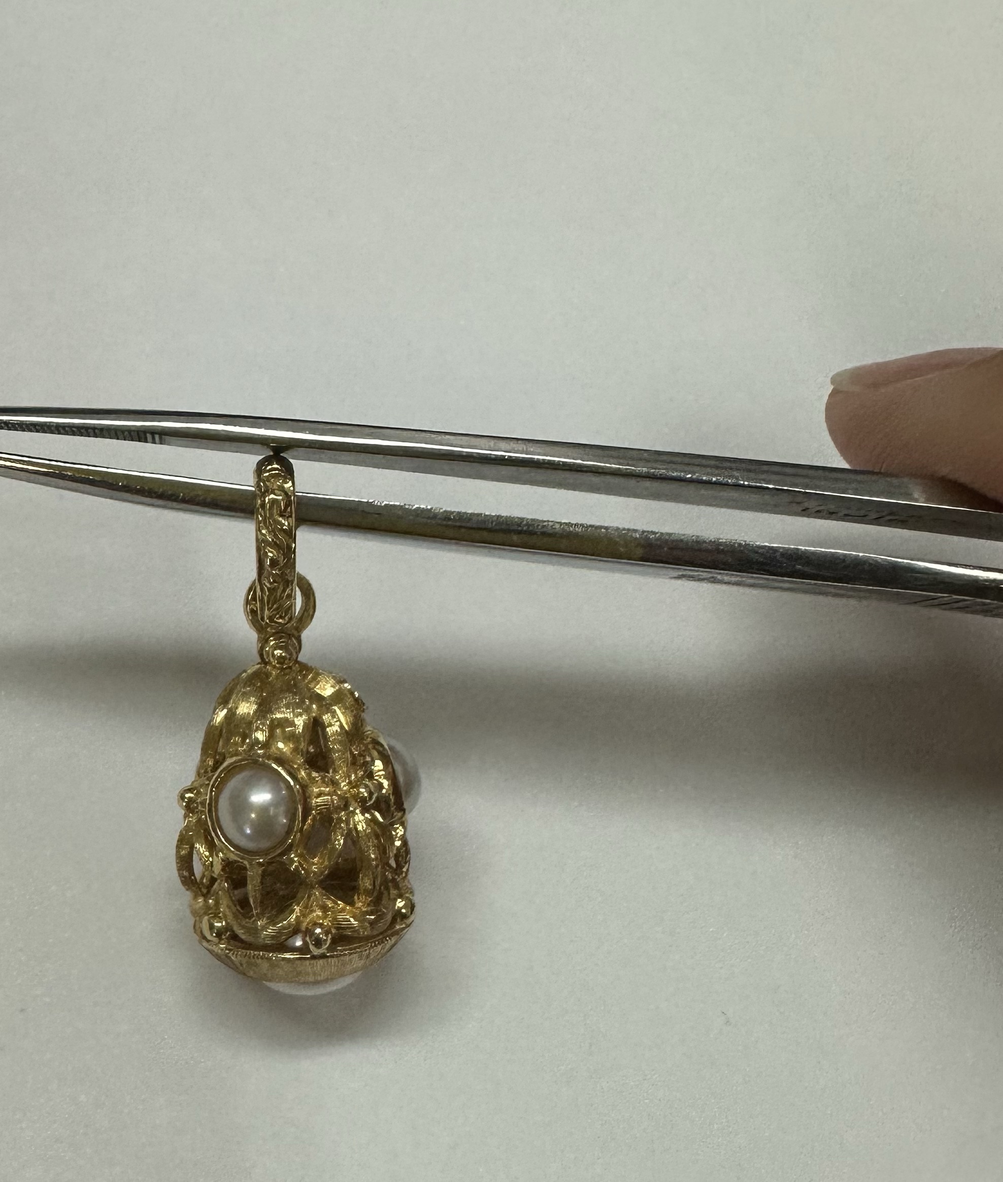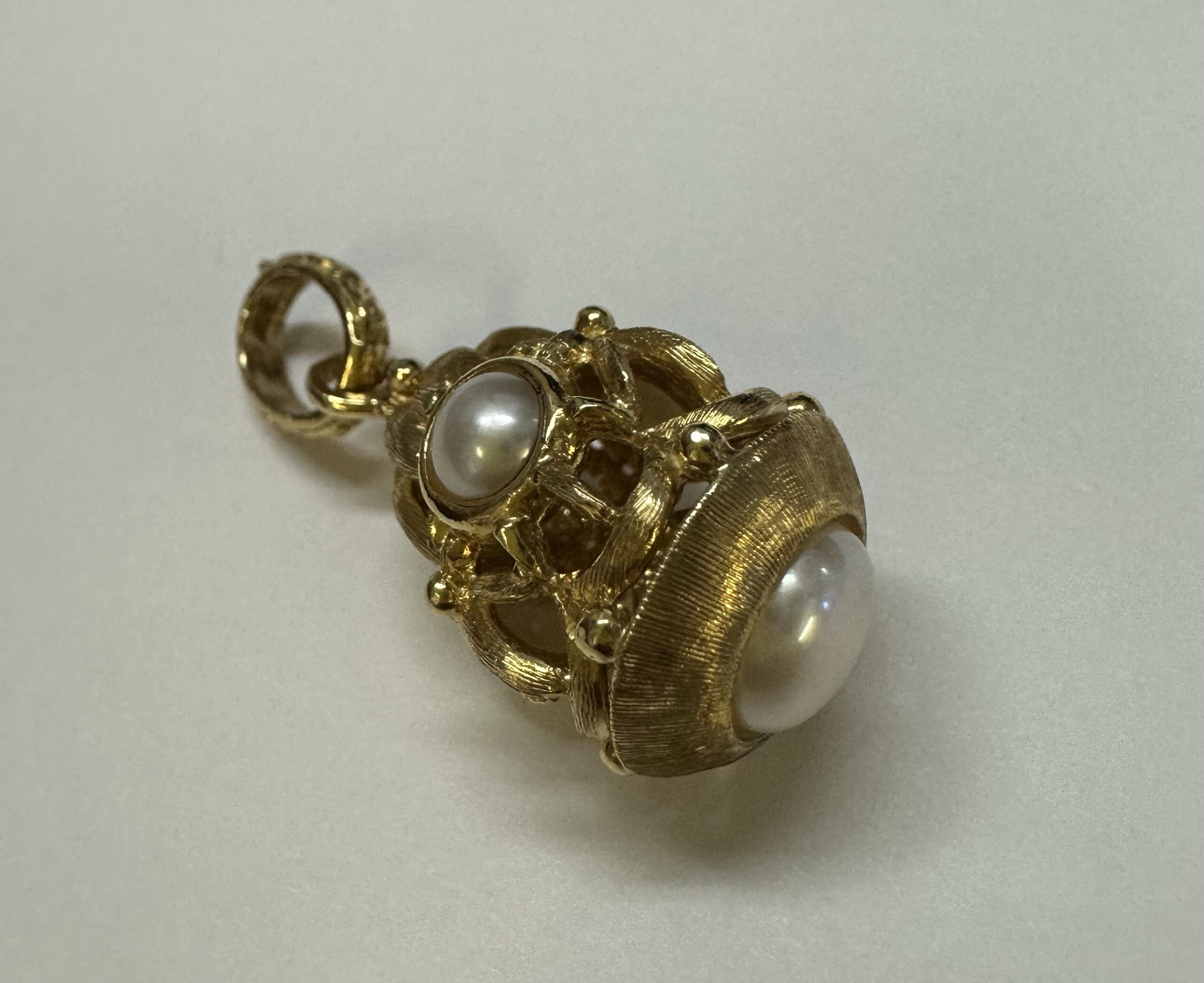 One-of-a-kind Etruscan motif 18k yellow gold pearl dangle pendant directly imported from Italy. This pendant has an entire weight of 8.8 grams. This piece dangles 1 1/4” in length and measures approximately 1/2” in width.