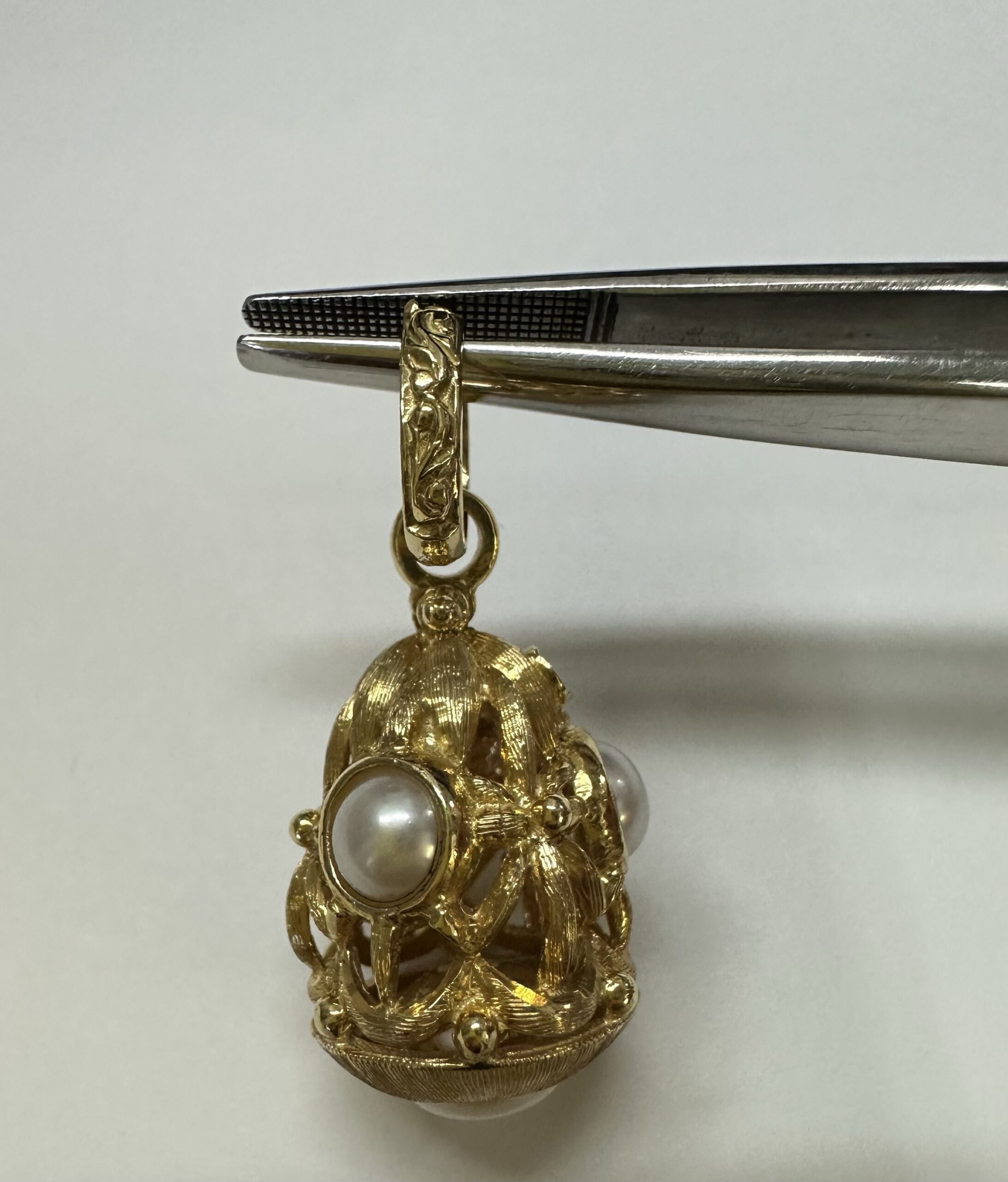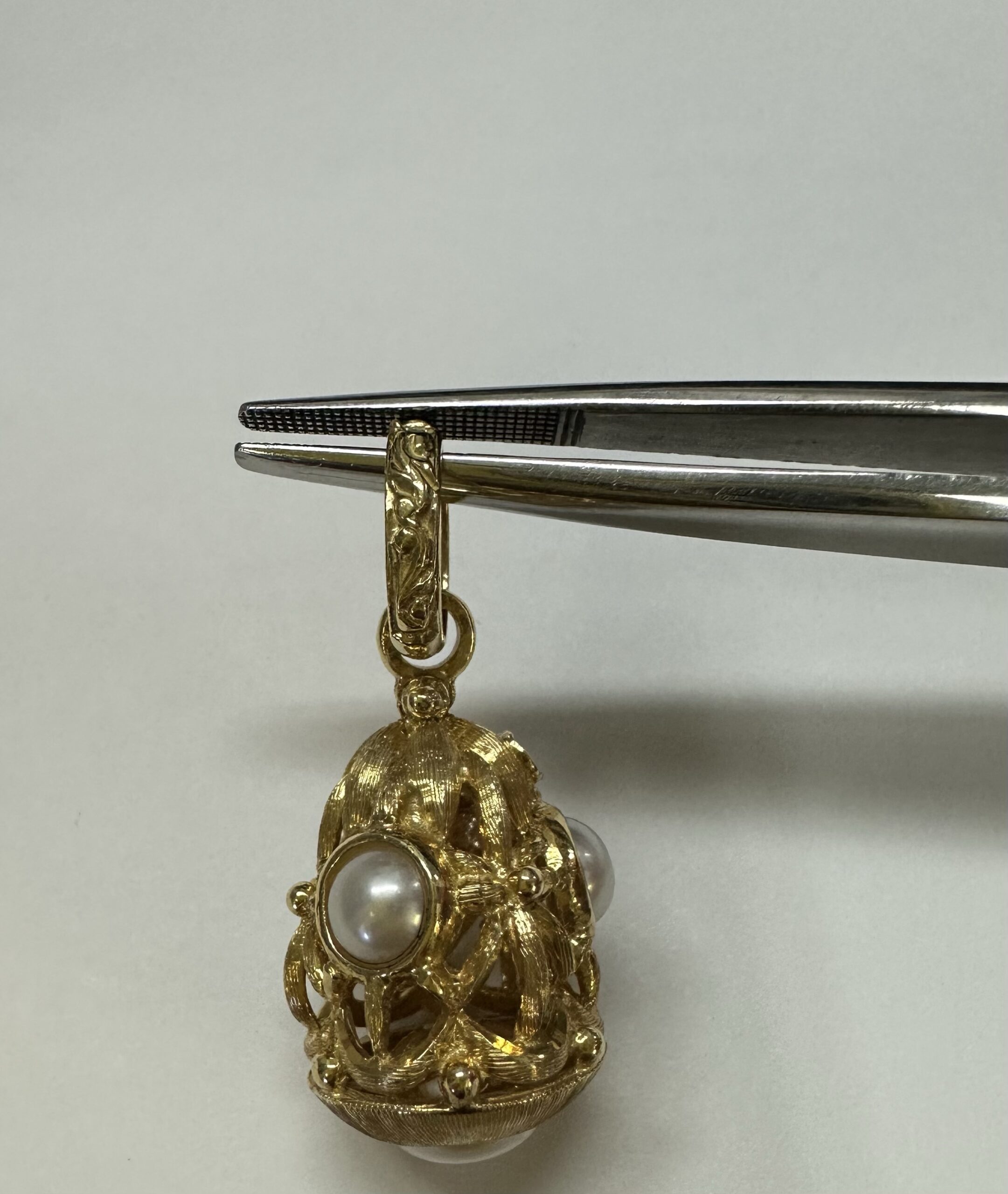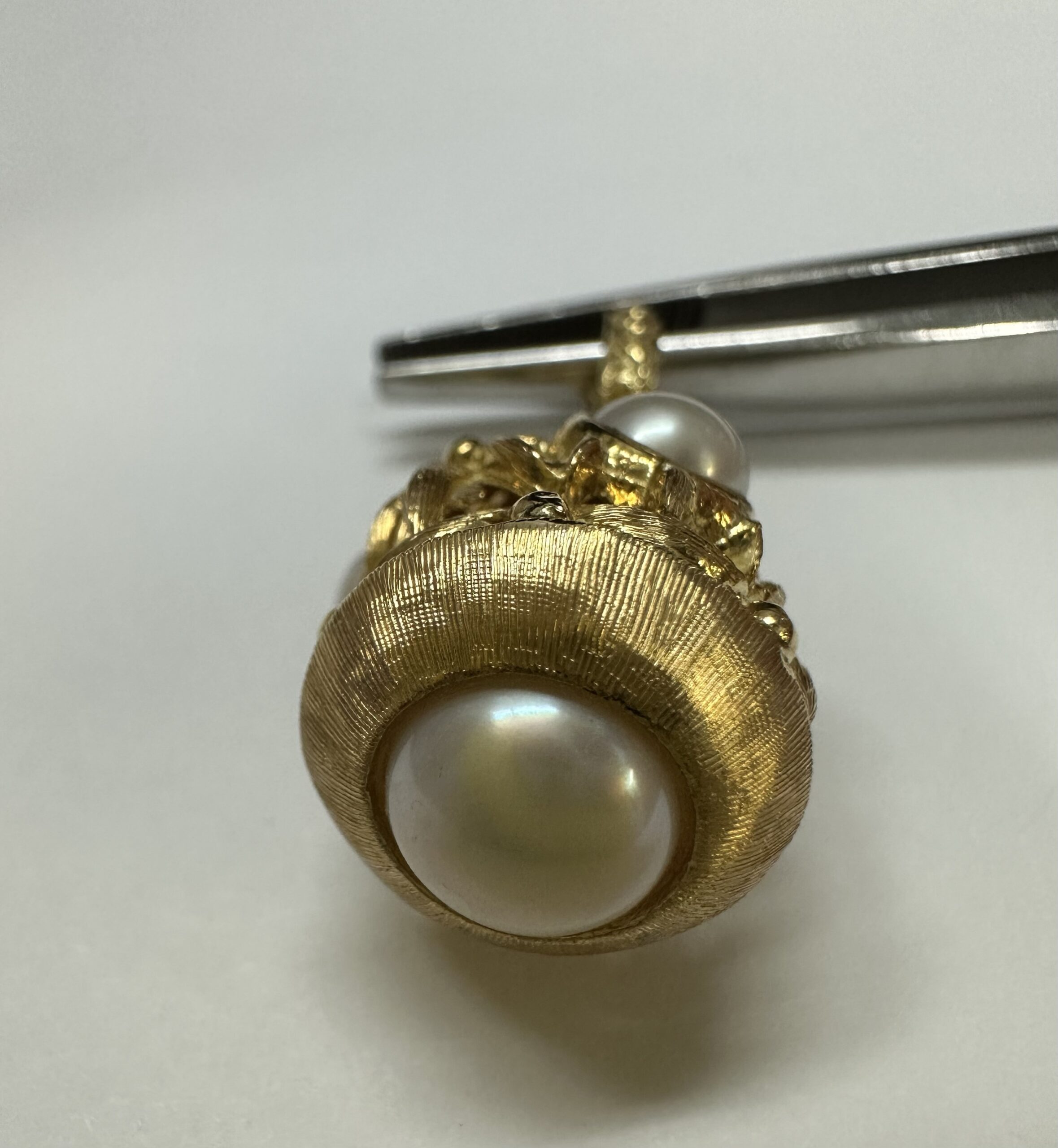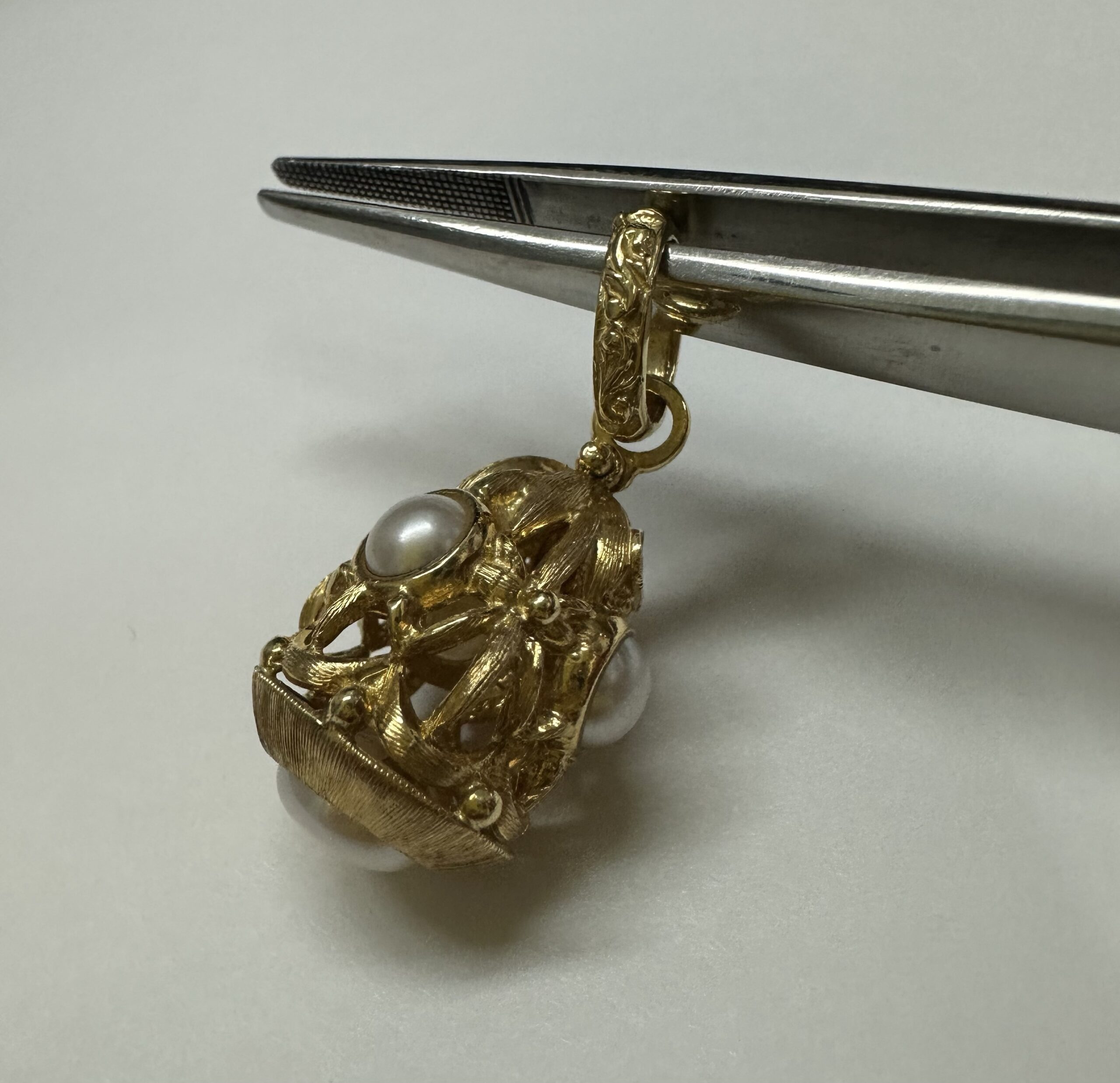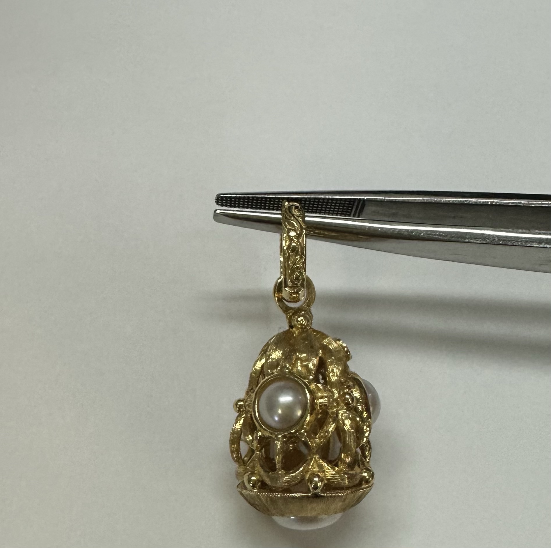 One-of-a-kind Etruscan motif 18k yellow gold pearl dangle pendant directly imported from Italy. This pendant has an entire weight of 8.8 grams. This piece dangles 1 1/4” in length and measures approximately 1/2” in width.
