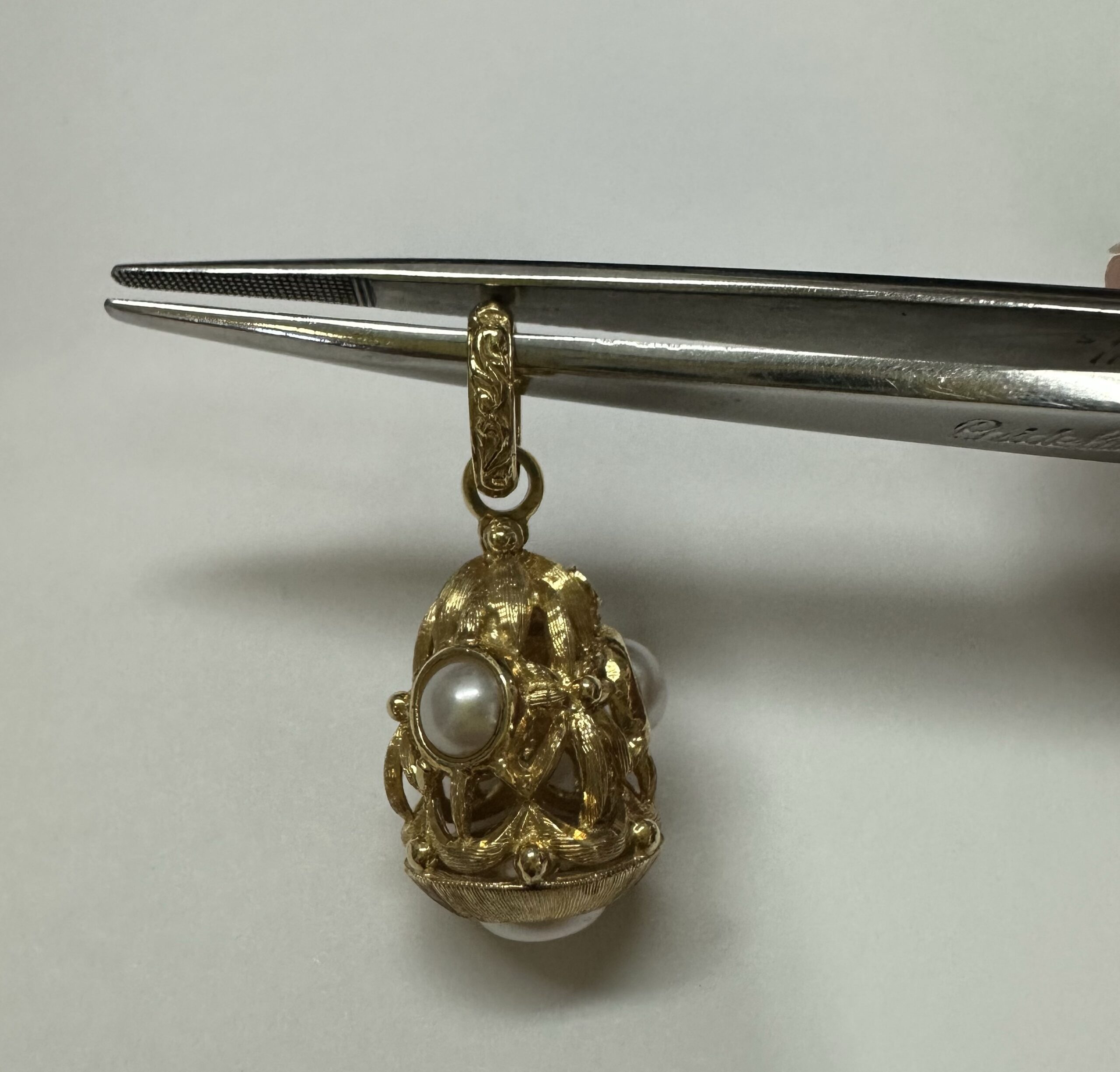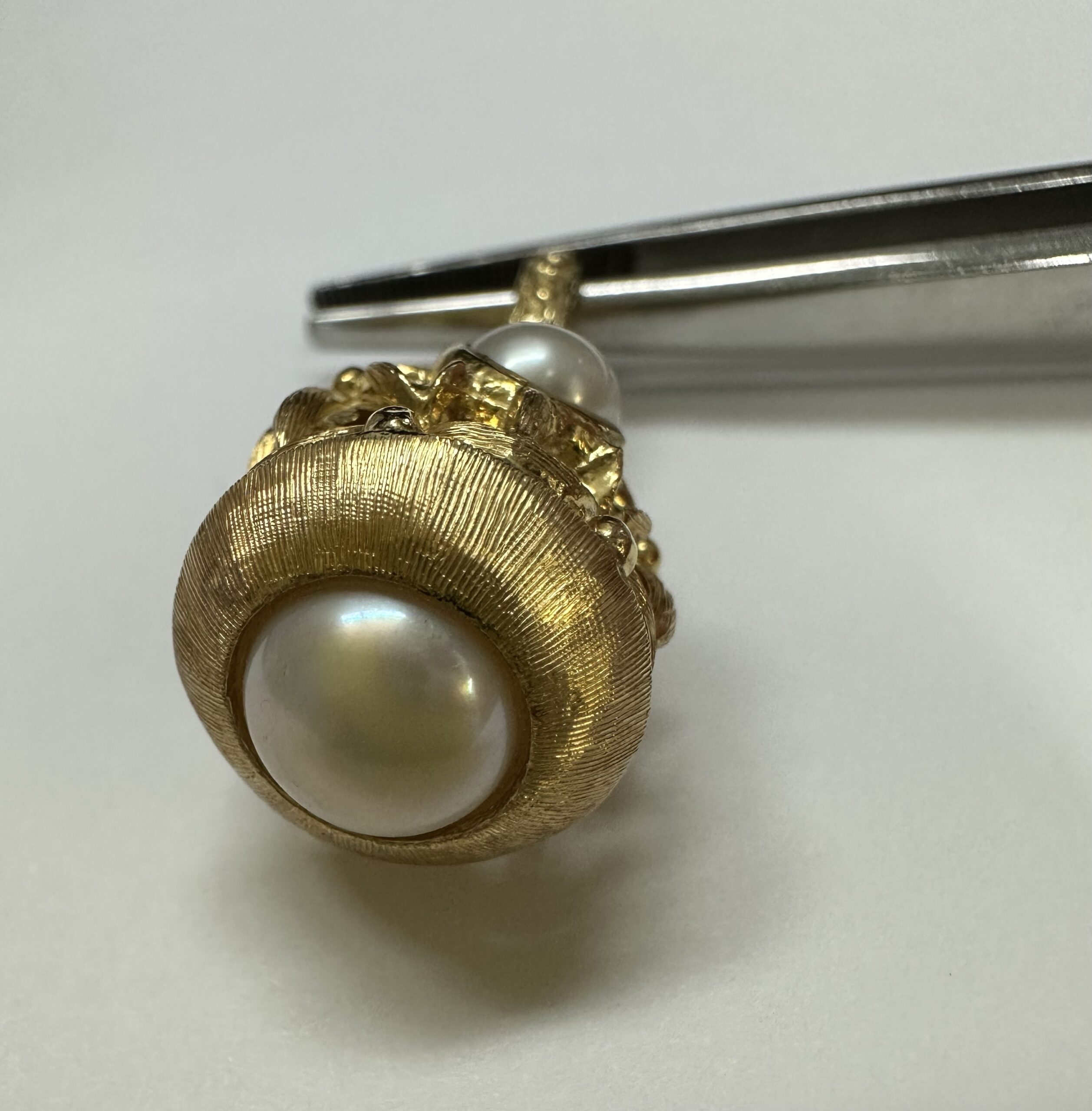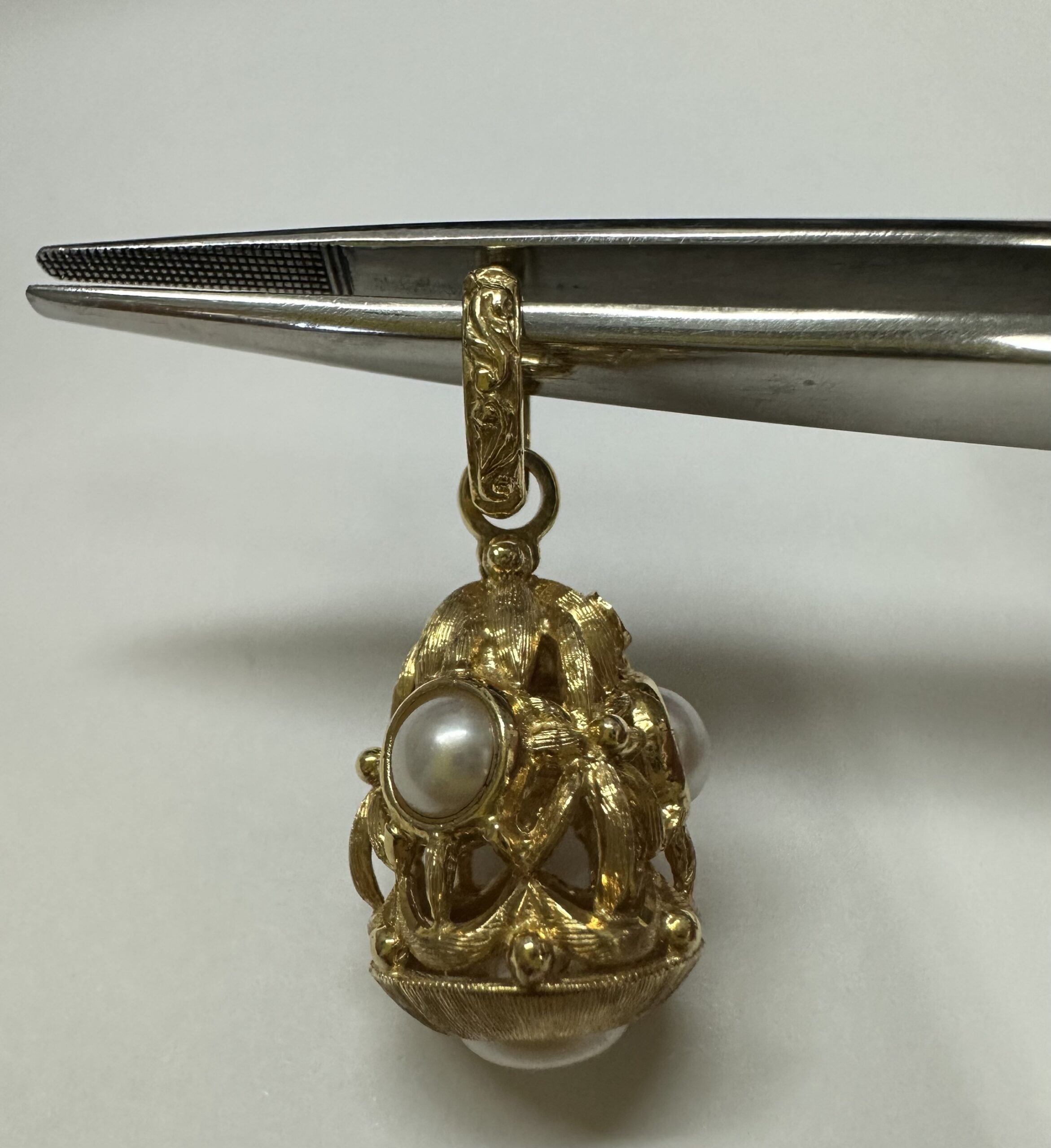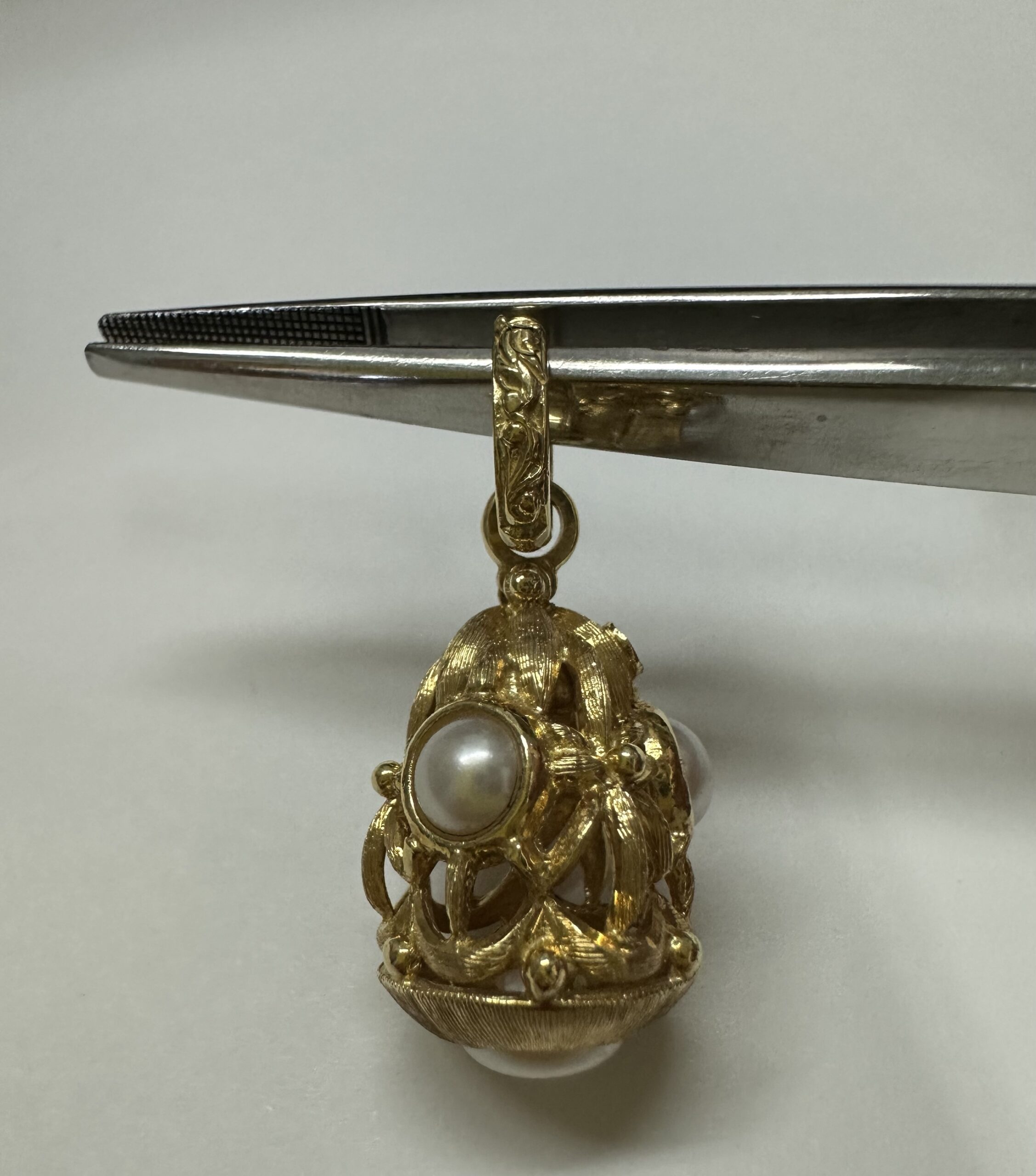 One-of-a-kind Etruscan motif 18k yellow gold pearl dangle pendant directly imported from Italy. This pendant has an entire weight of 8.8 grams. This piece dangles 1 1/4” in length and measures approximately 1/2” in width.