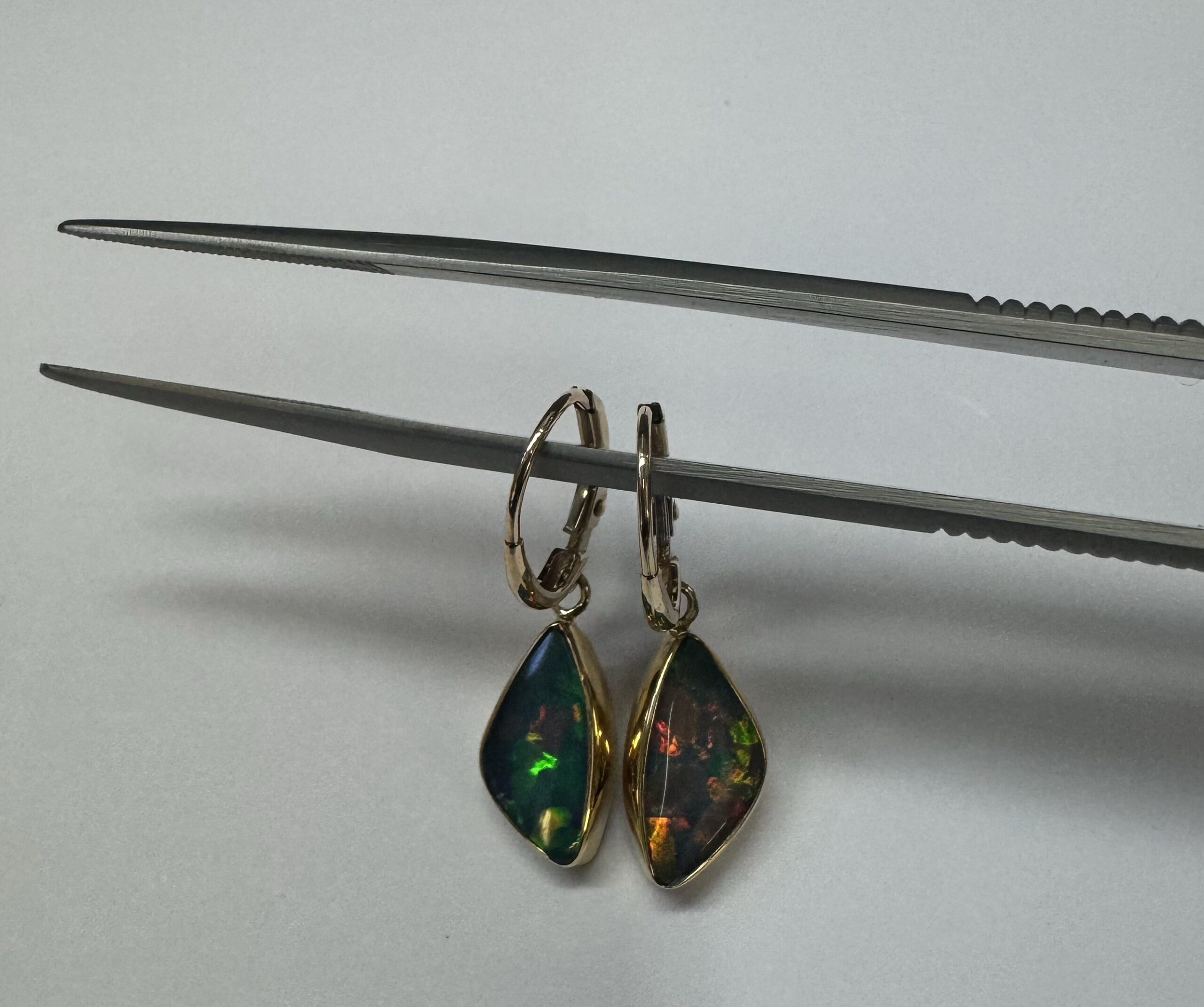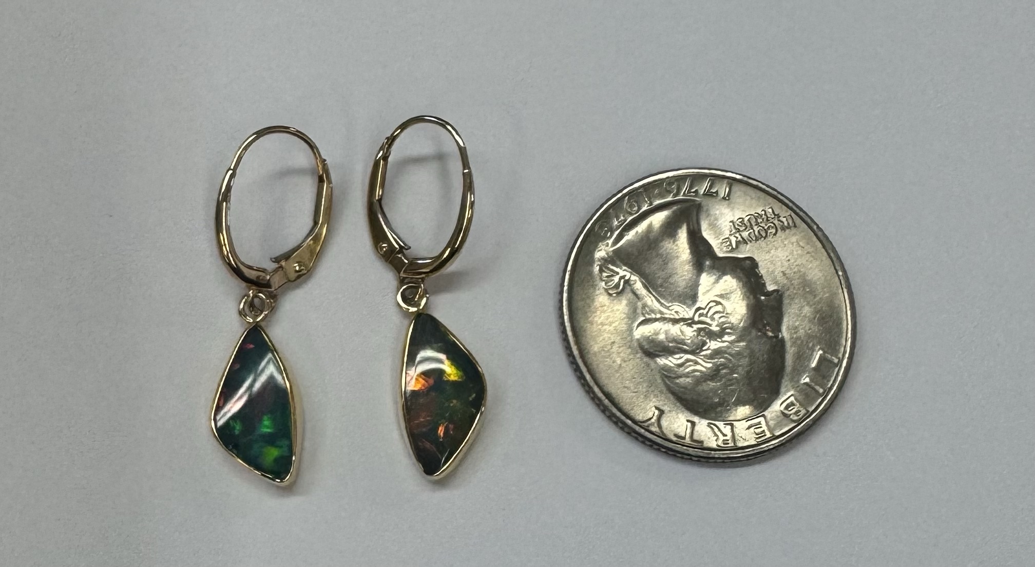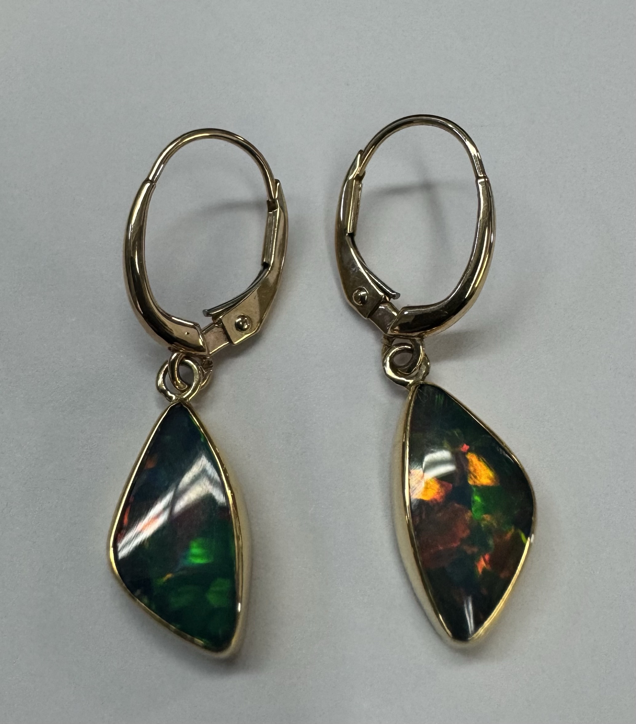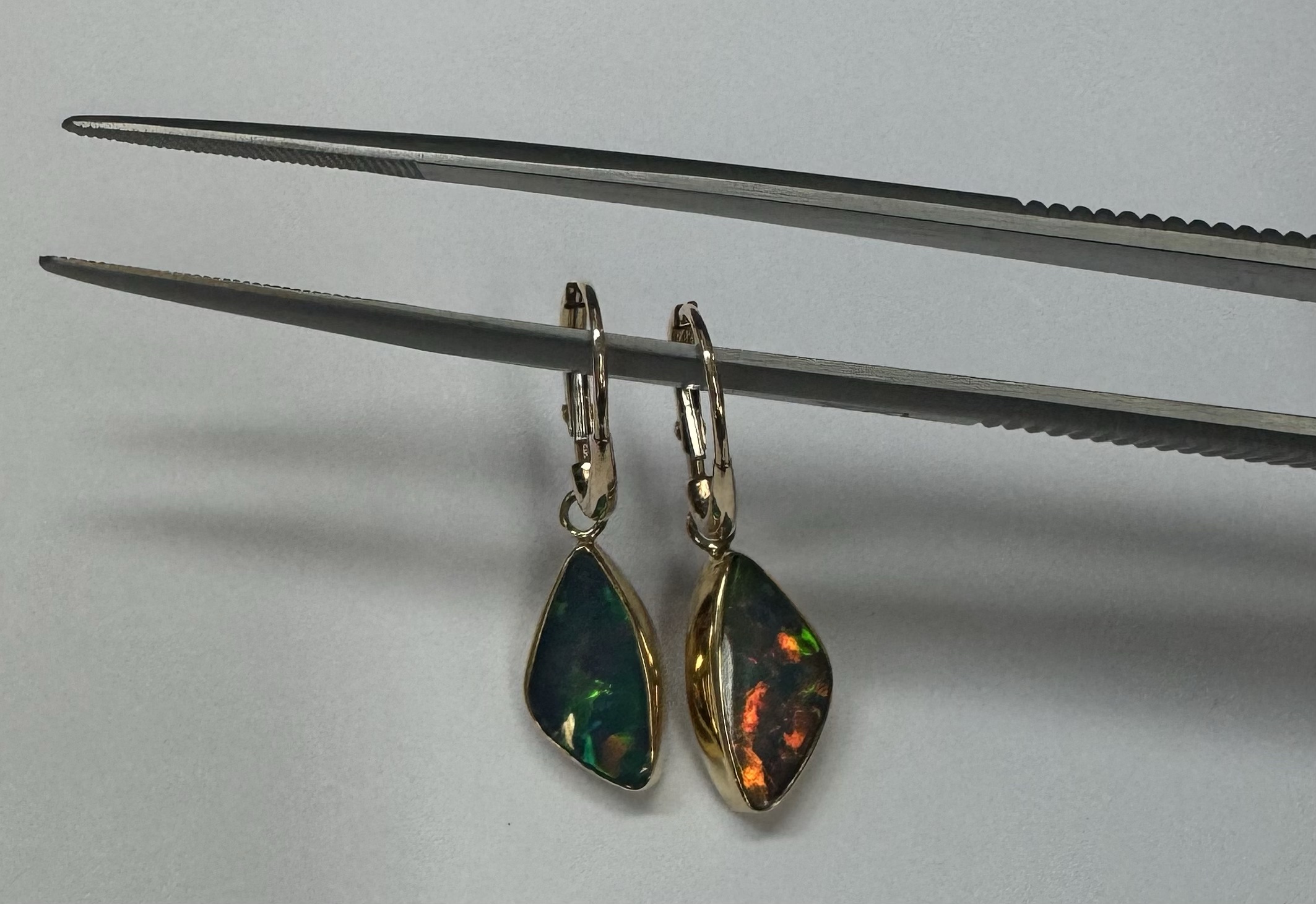 22k bezels & 14k yellow gold lever back gold ear wires with bezel set genuine Ethiopian Opals. These earrings have an entire weight of 3.1 grams. Only one pair like this available.