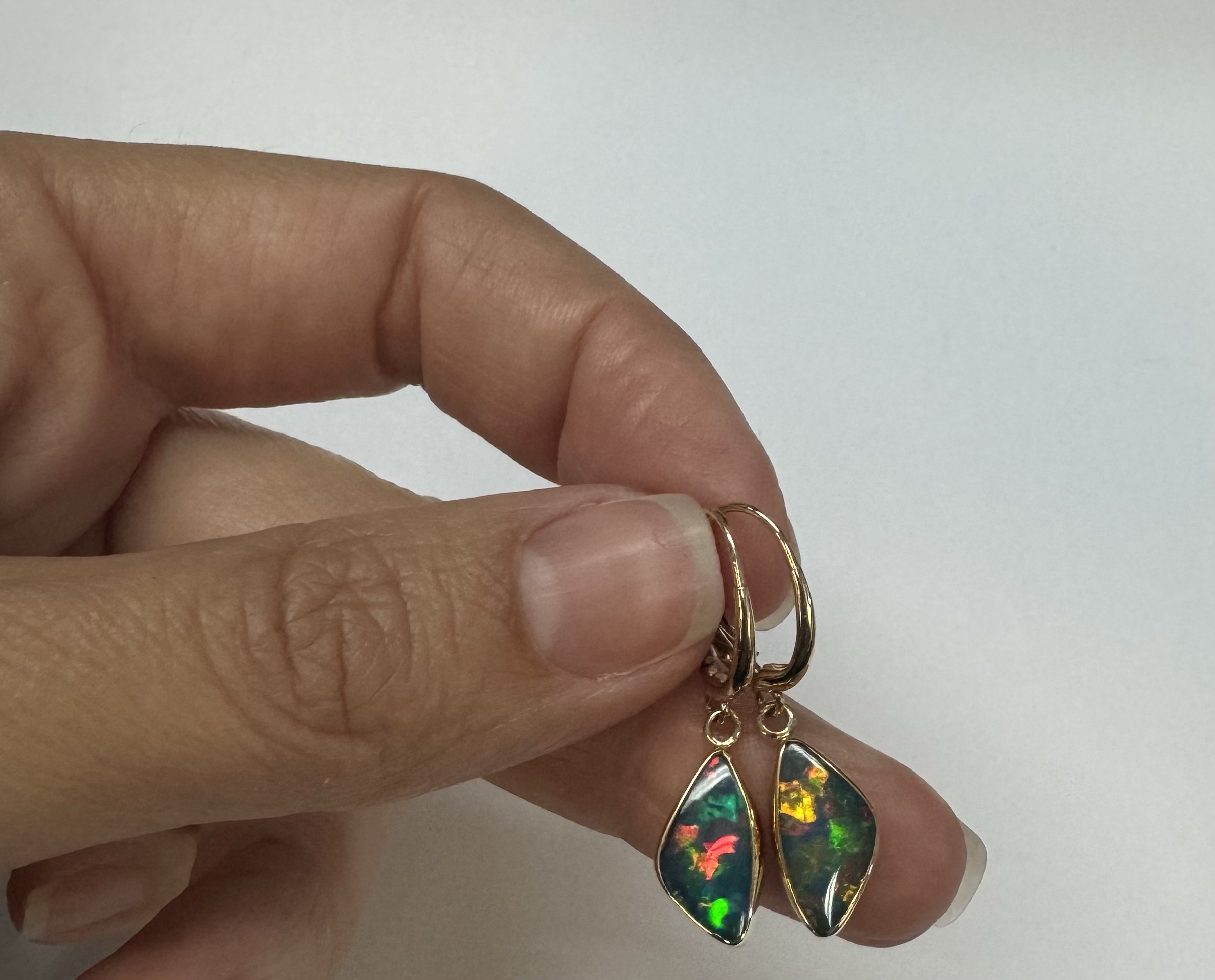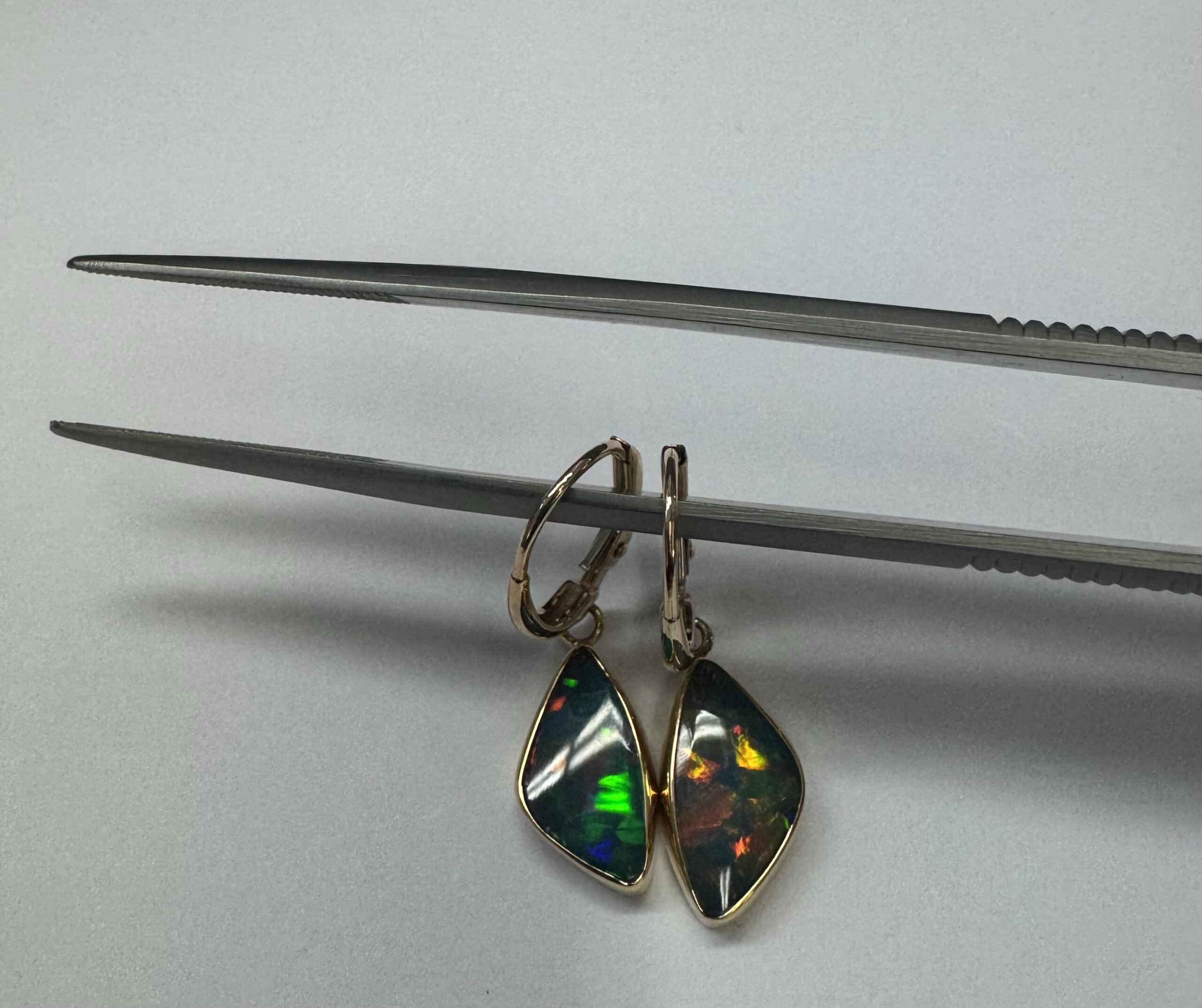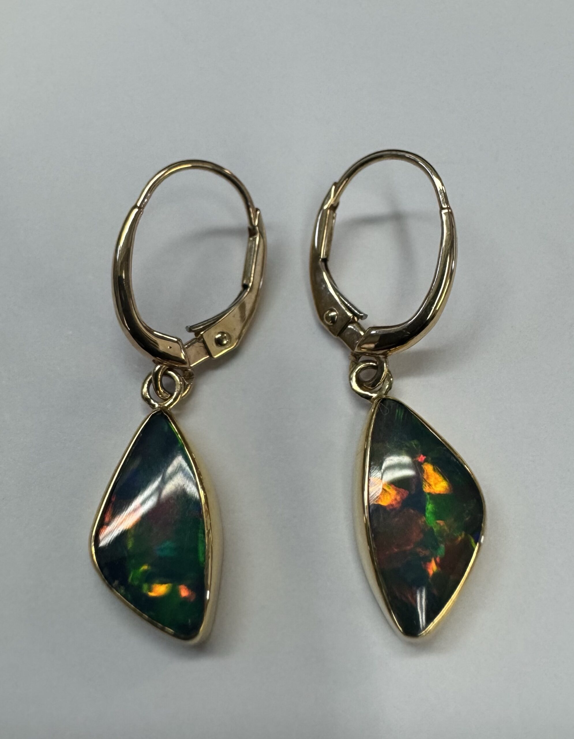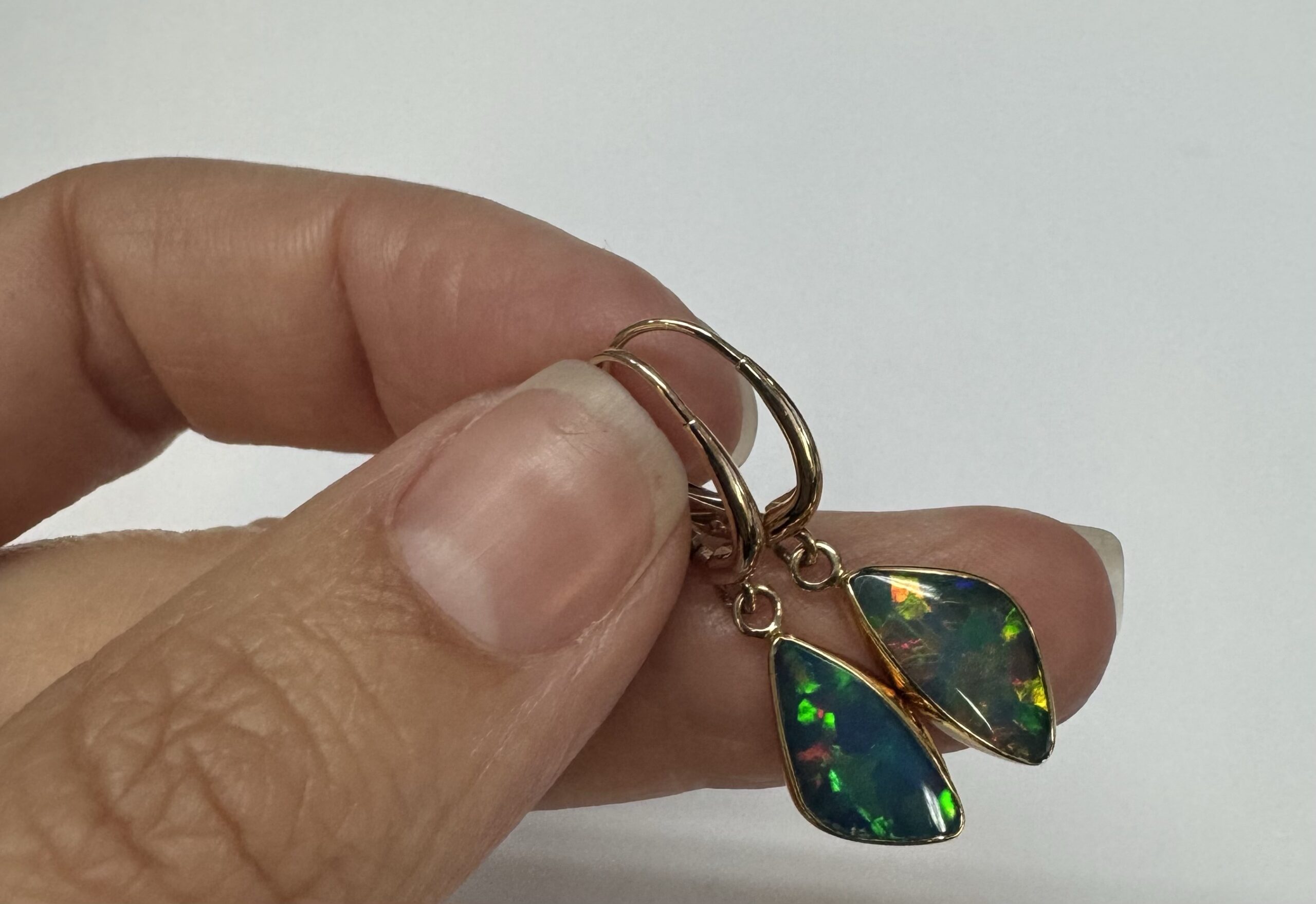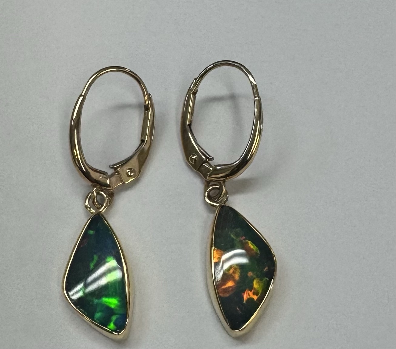 22k bezels & 14k yellow gold lever back gold ear wires with bezel set genuine Ethiopian Opals. These earrings have an entire weight of 3.1 grams. Only one pair like this available.