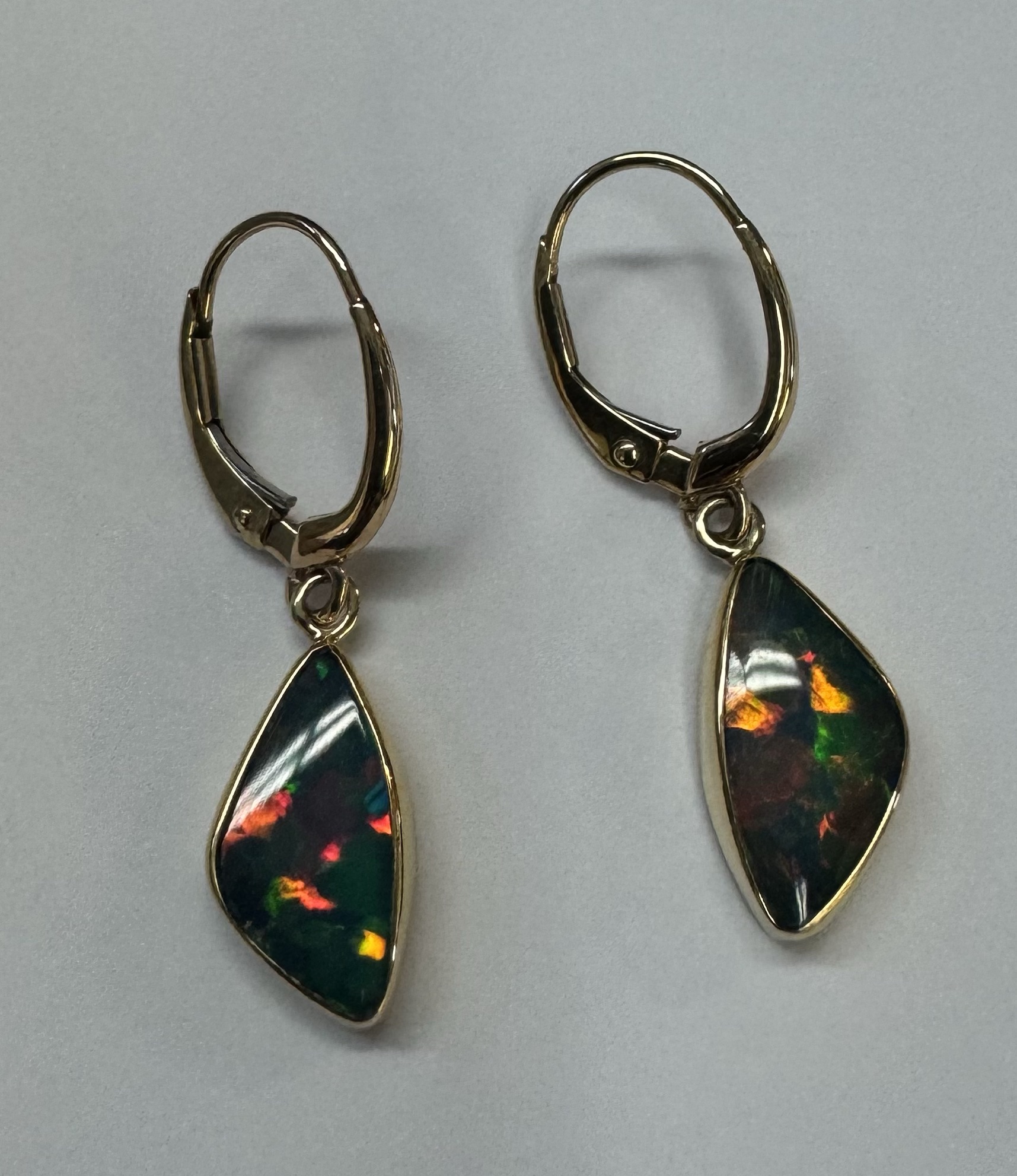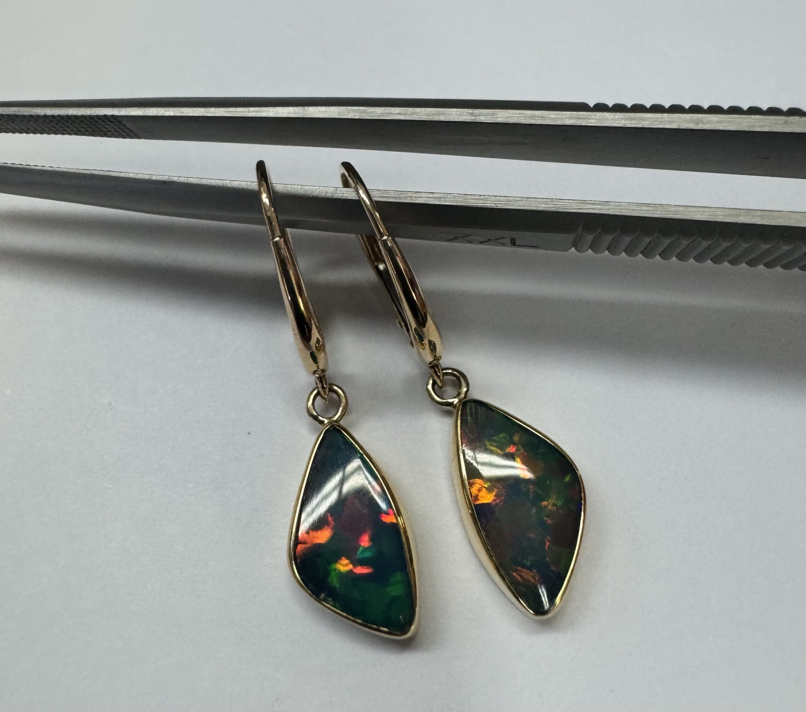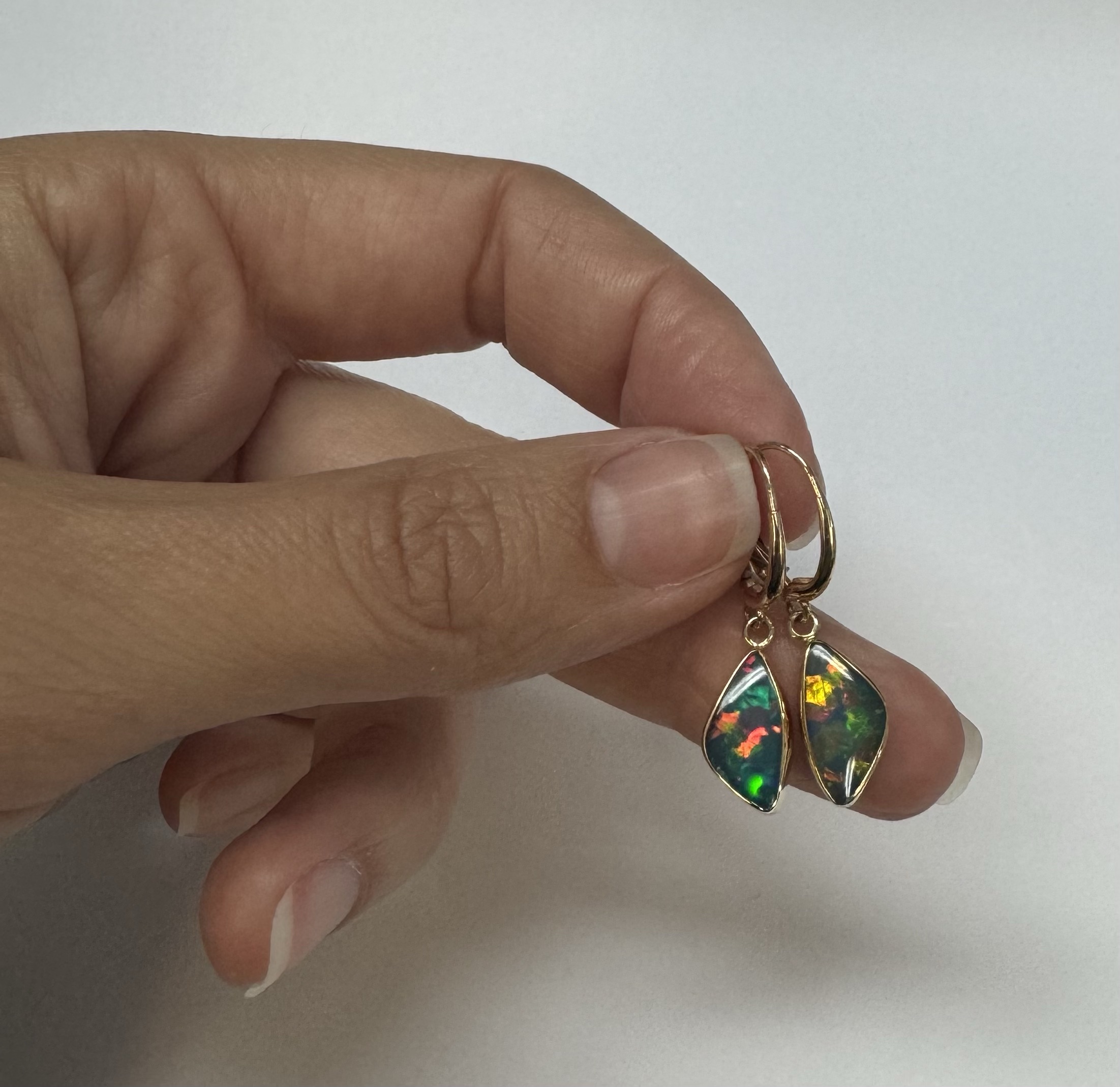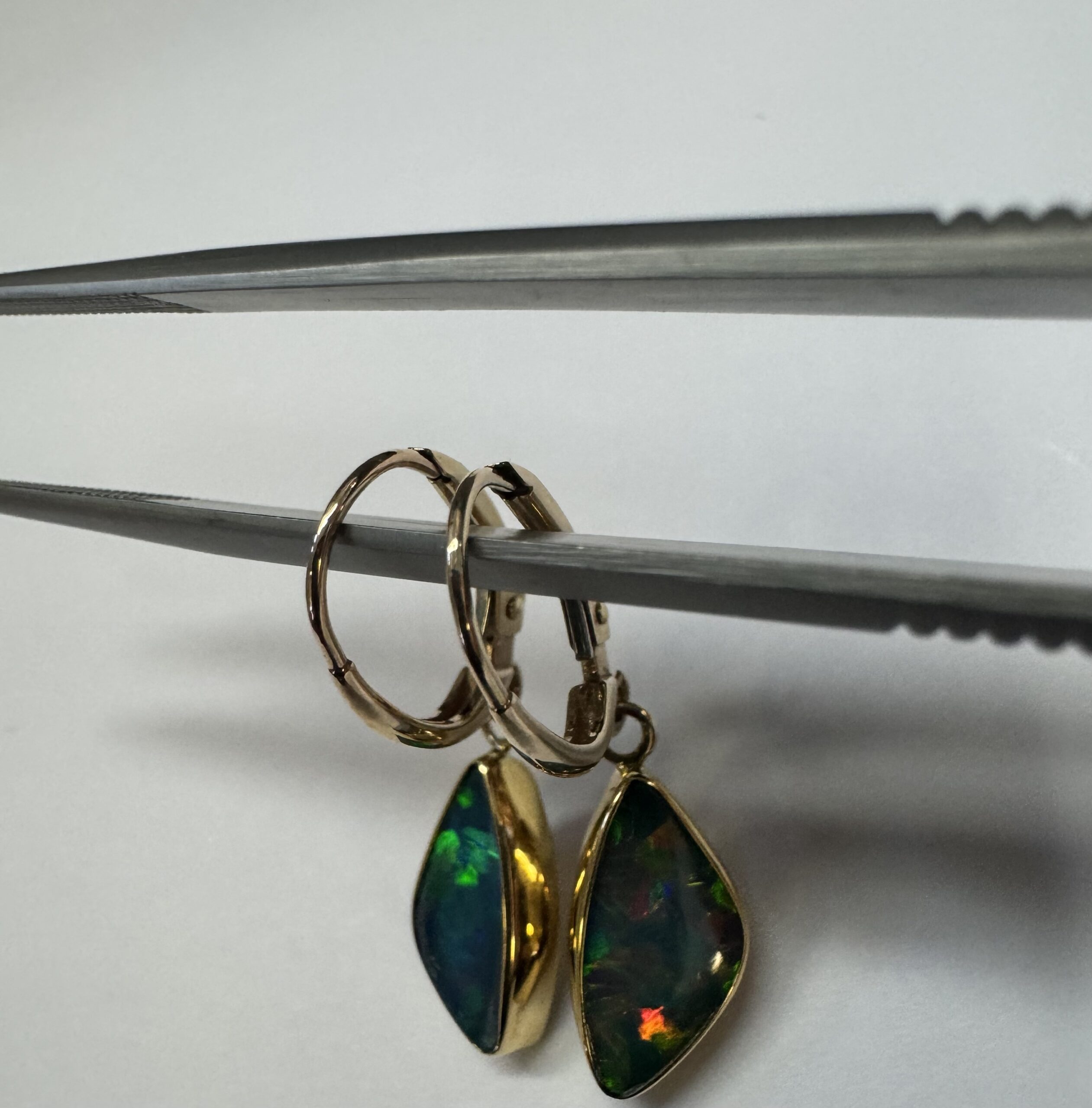 22k bezels & 14k yellow gold lever back gold ear wires with bezel set genuine Ethiopian Opals. These earrings have an entire weight of 3.1 grams. Only one pair like this available.