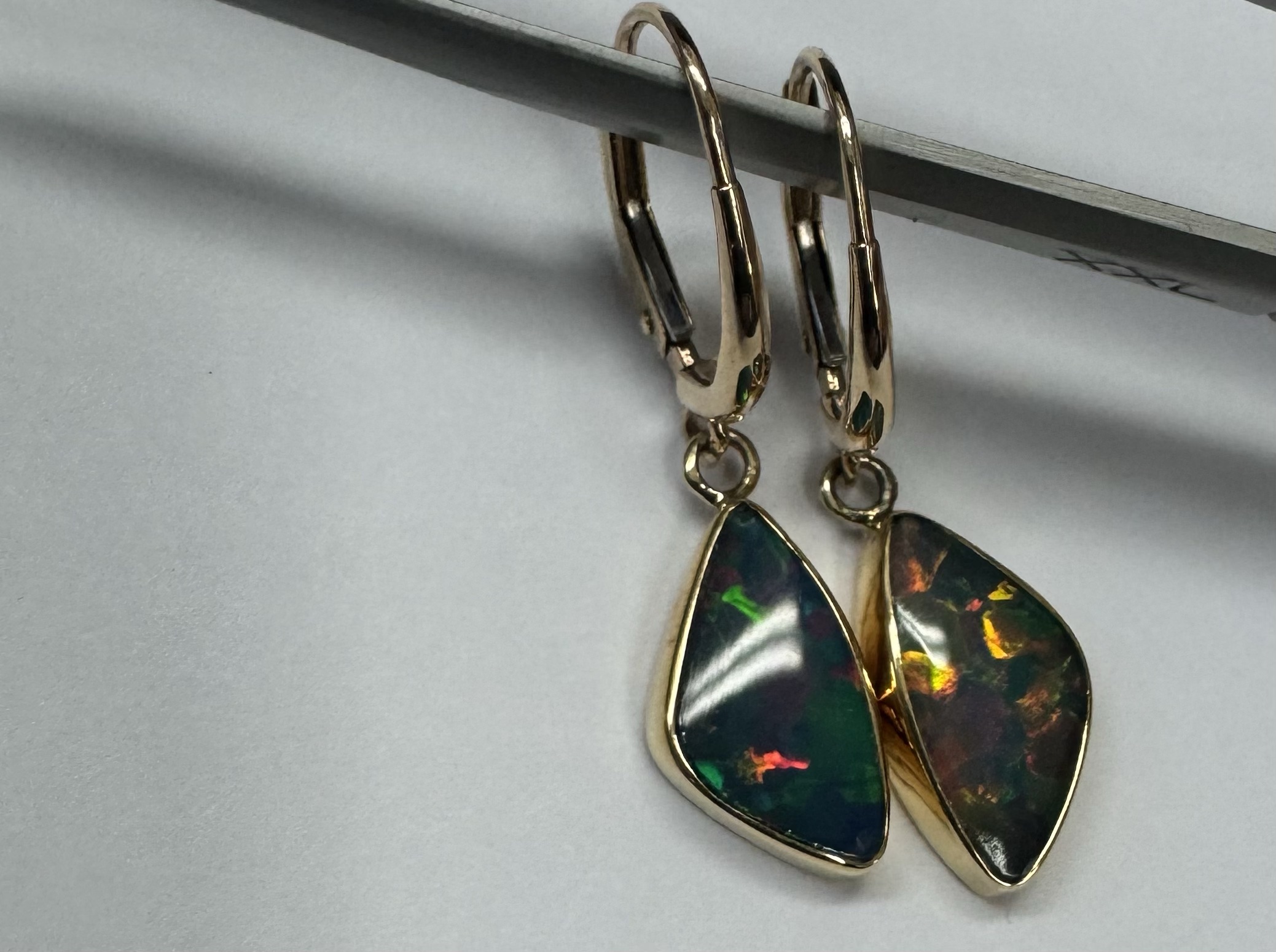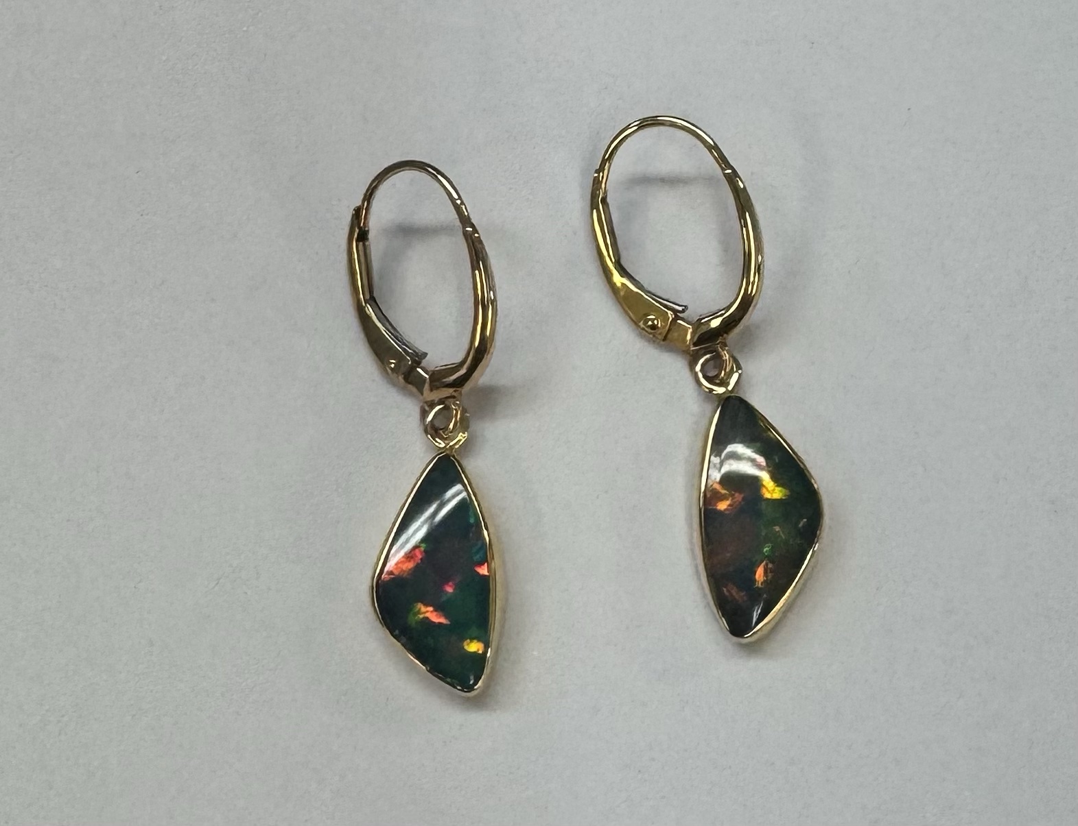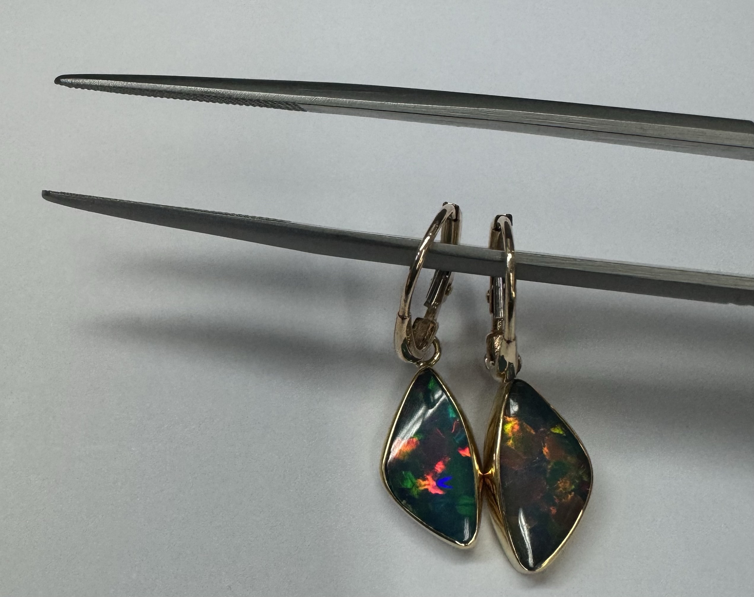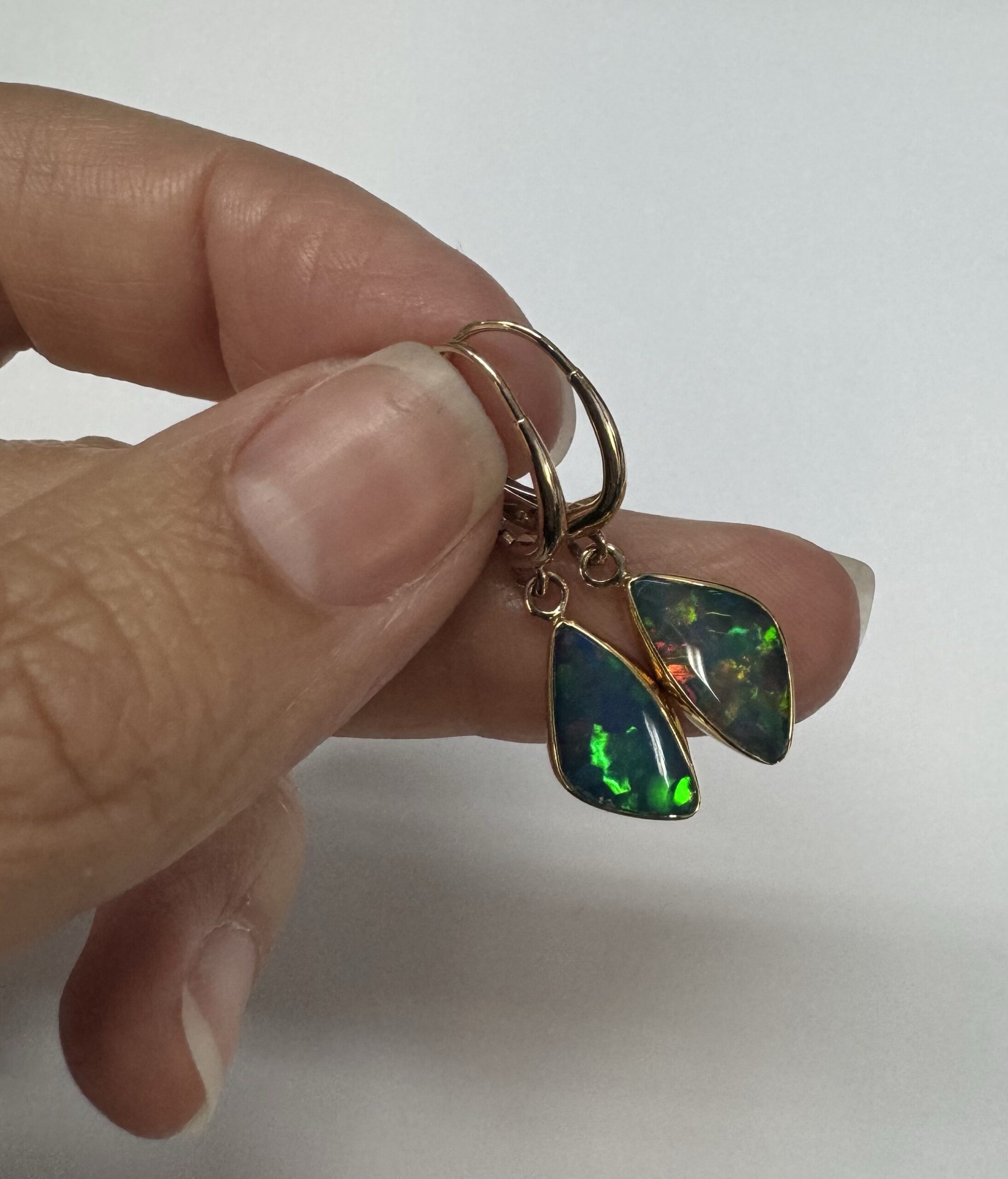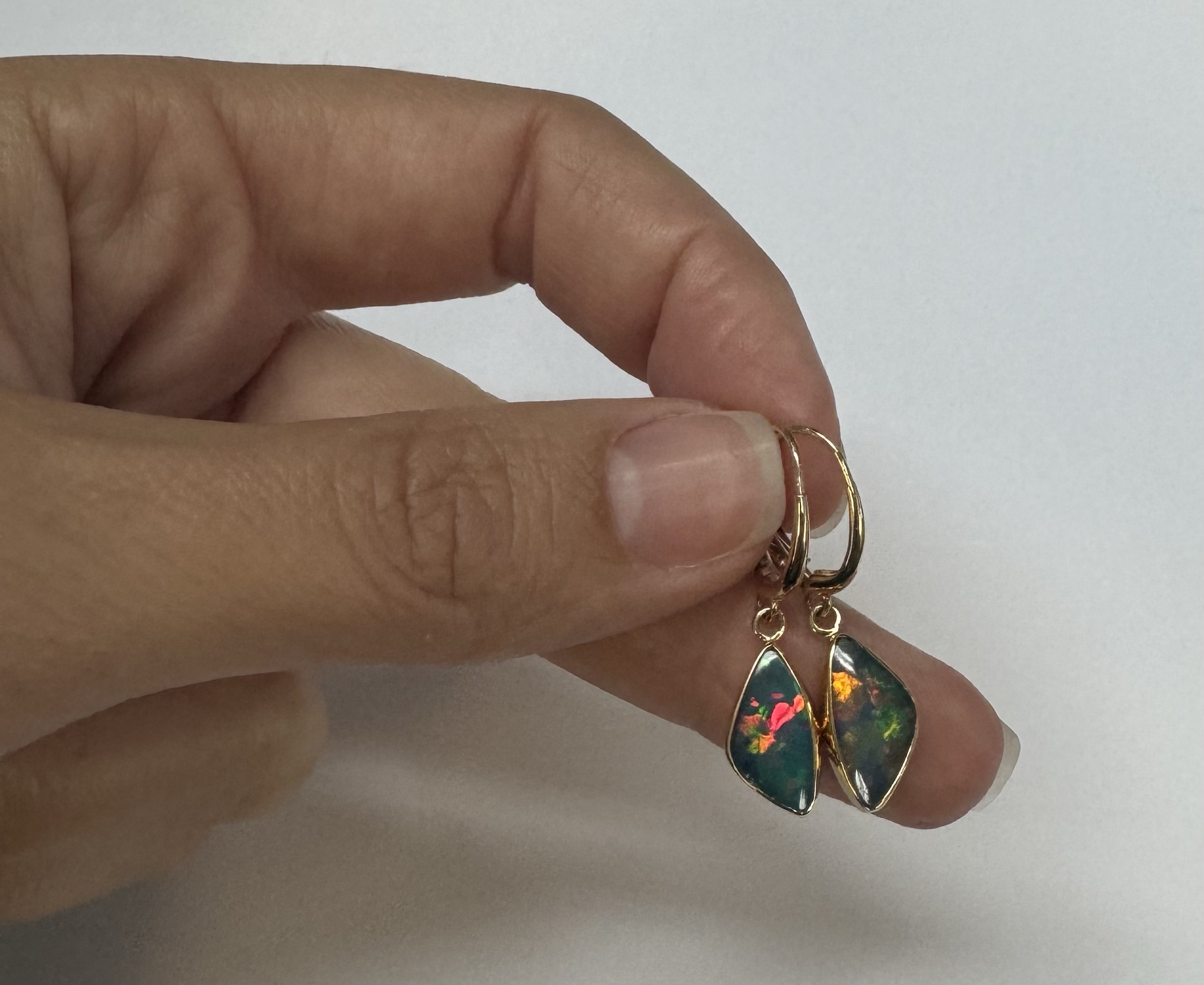 22k bezels & 14k yellow gold lever back gold ear wires with bezel set genuine Ethiopian Opals. These earrings have an entire weight of 3.1 grams. Only one pair like this available.