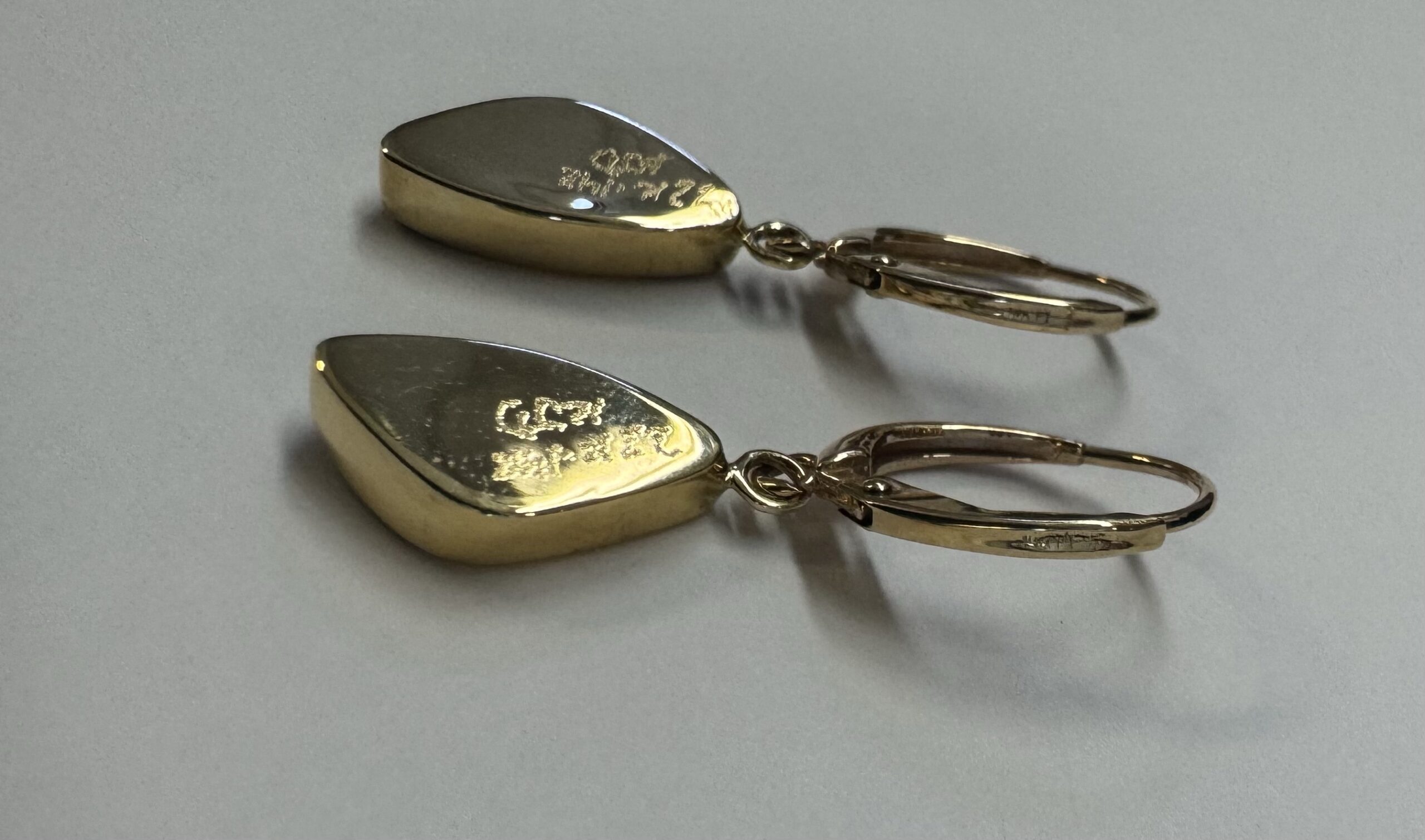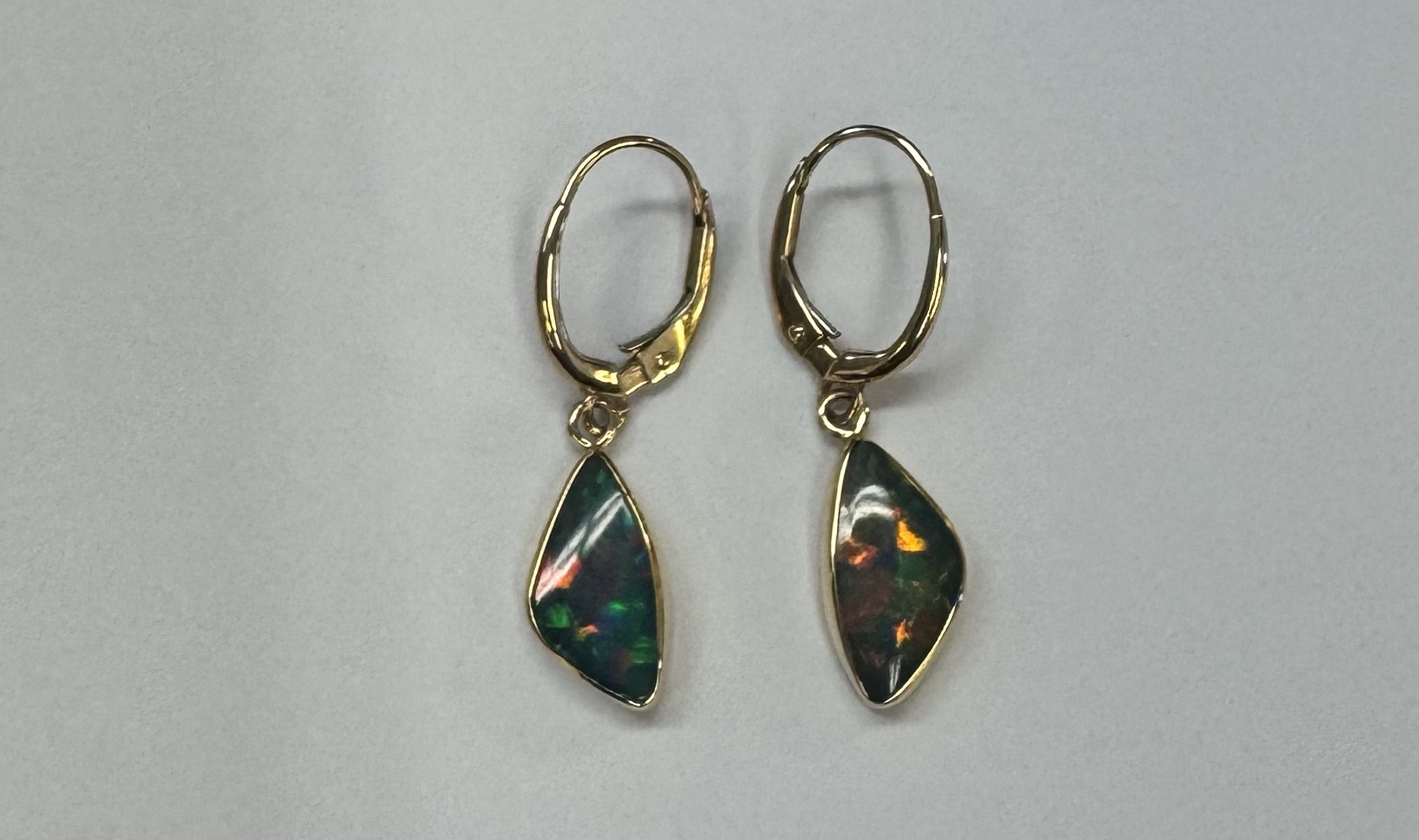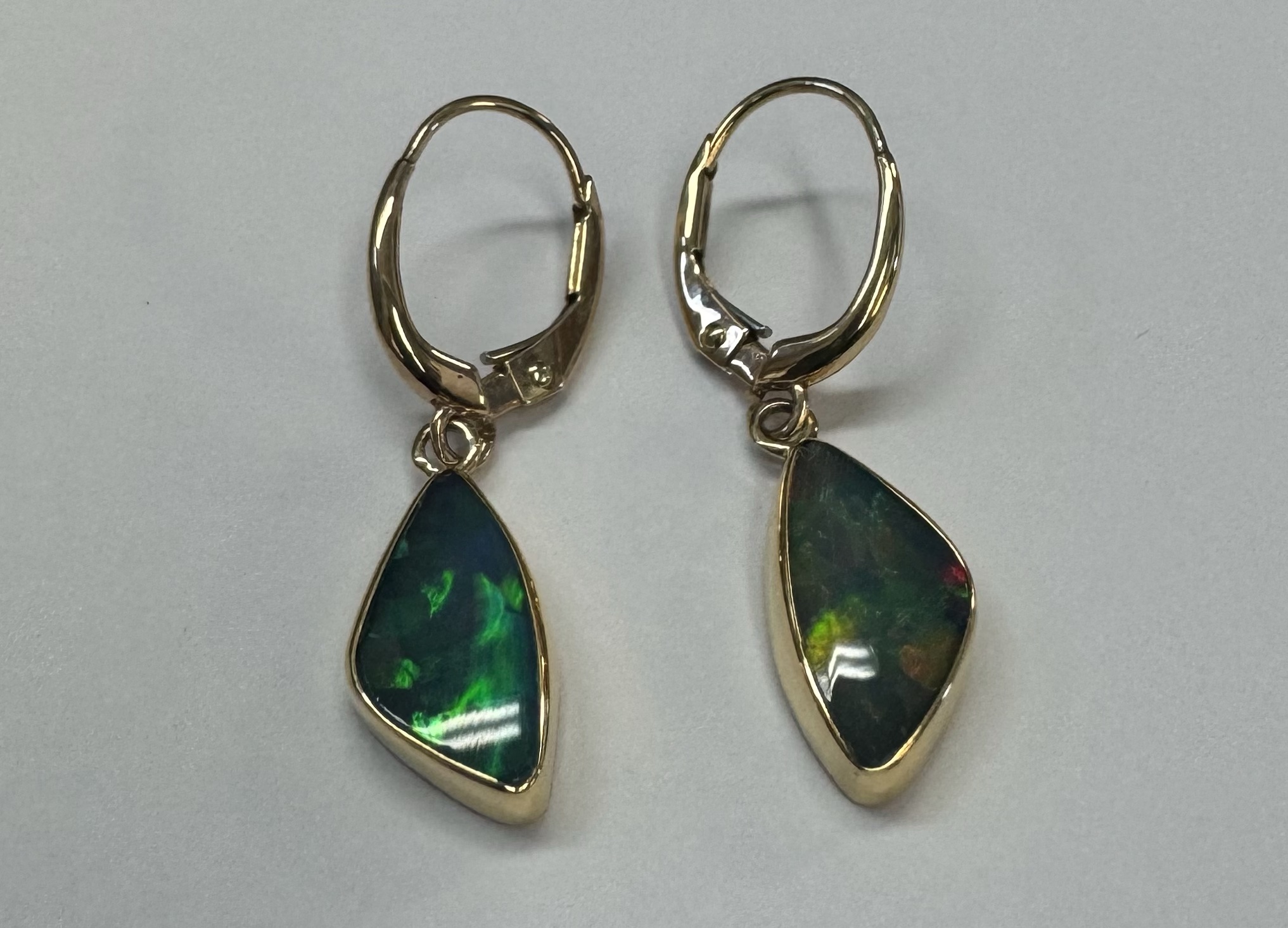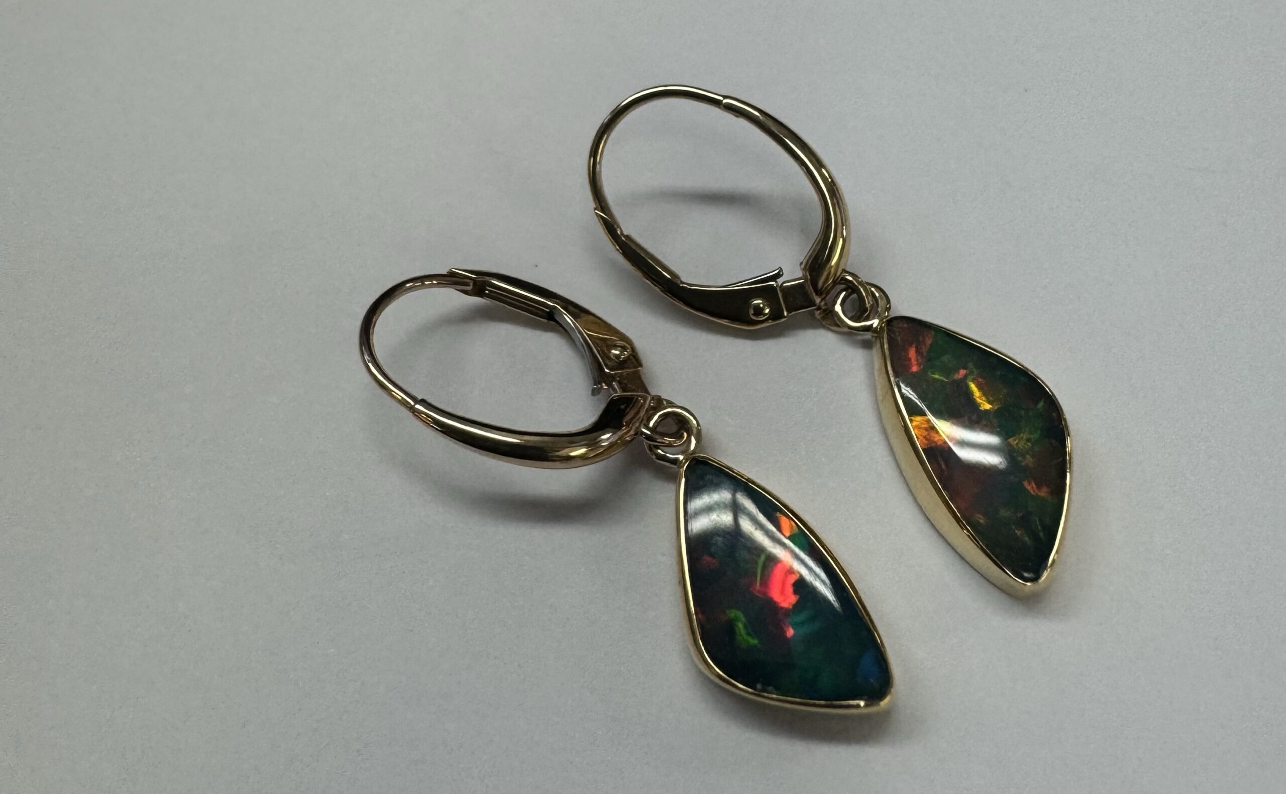 22k bezels & 14k yellow gold lever back gold ear wires with bezel set genuine Ethiopian Opals. These earrings have an entire weight of 3.1 grams. Only one pair like this available.