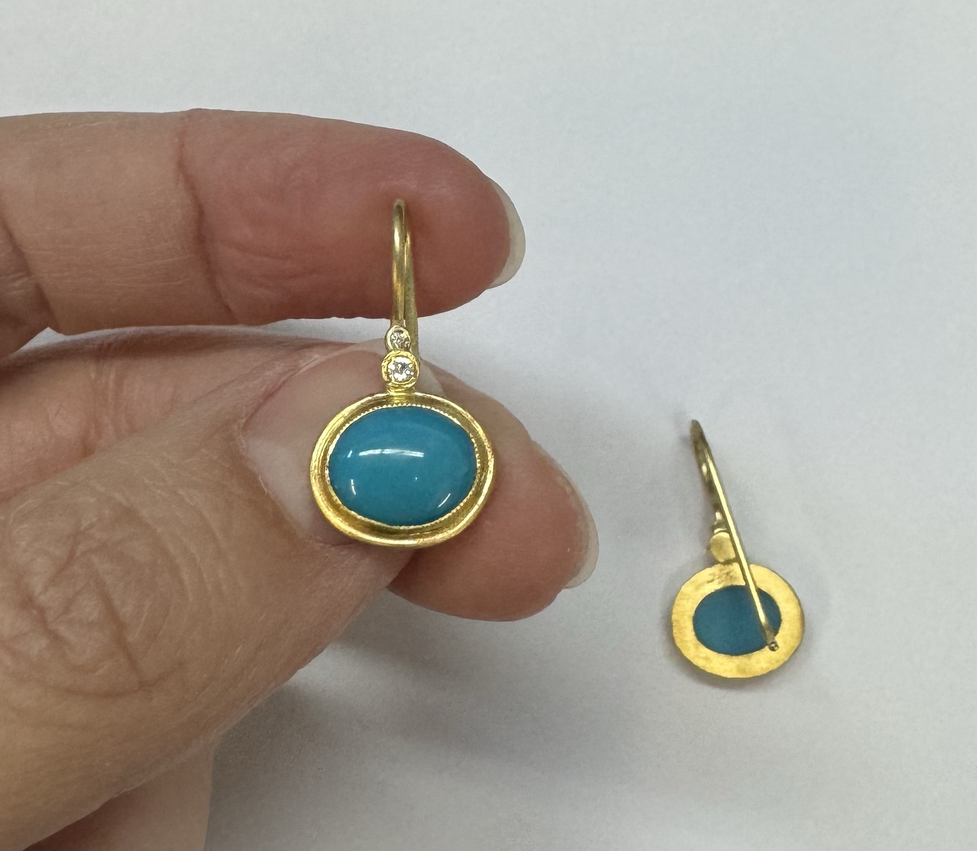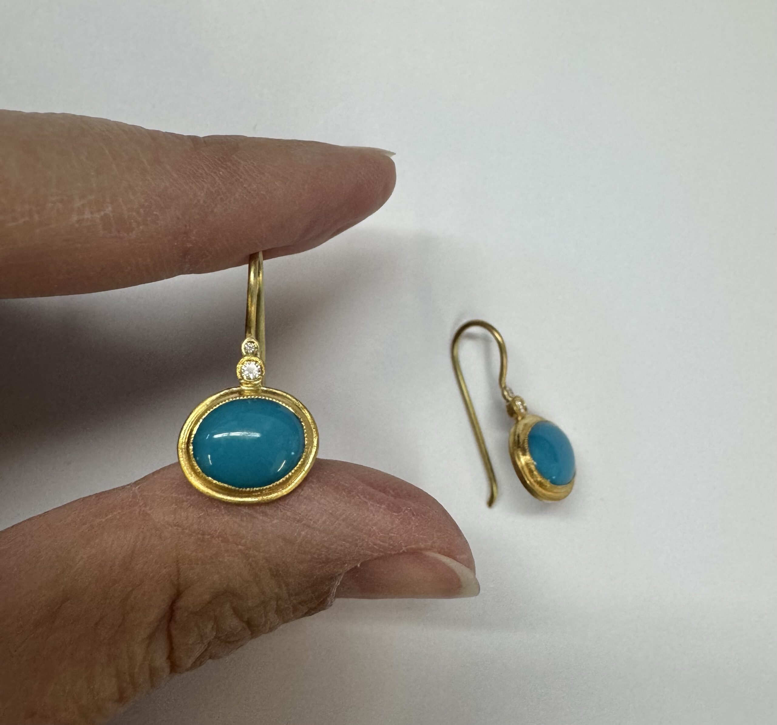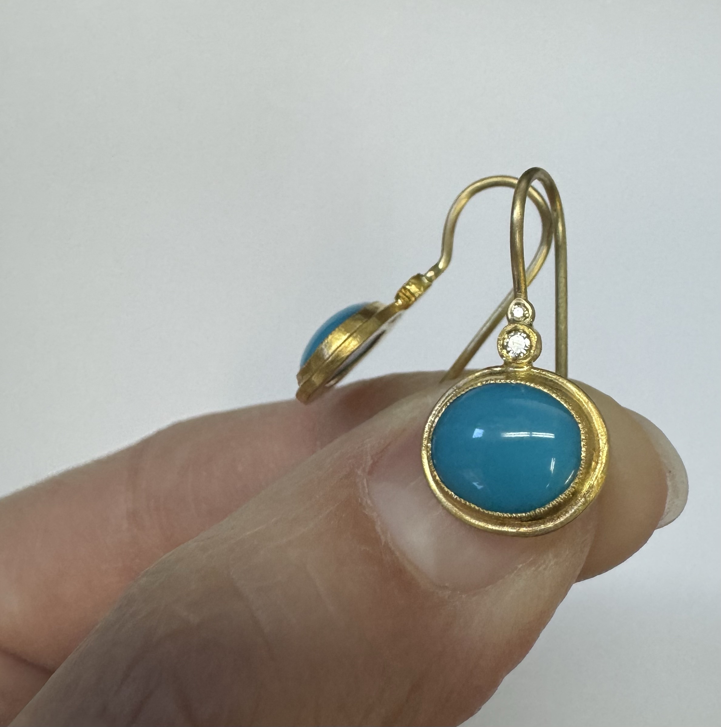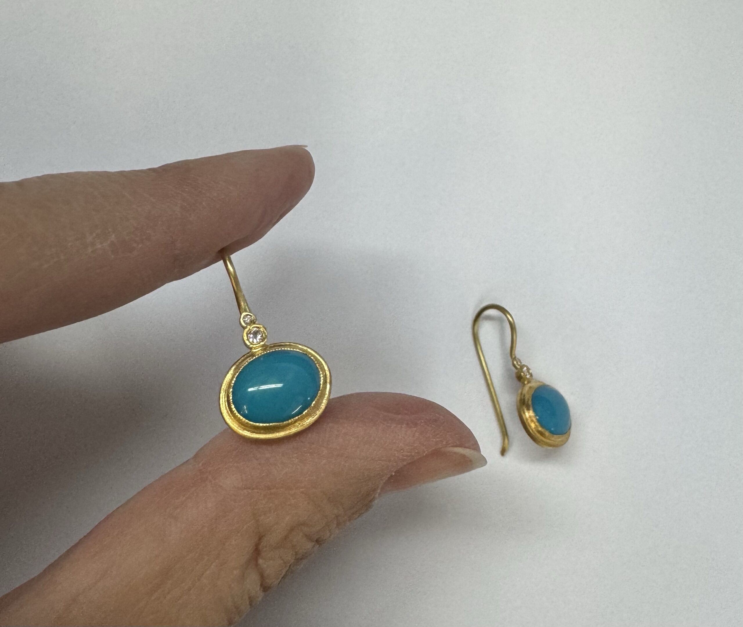 One-of-a-kind genuine 4.05 Cttw Turquoise & .05 cttw genuine Round Brilliant Cut diamond dangle earrings with 24k yellow gold (yes, 24k) bezels & 18k yellow gold wires. These earrings have a total weight of 3.1 grams.