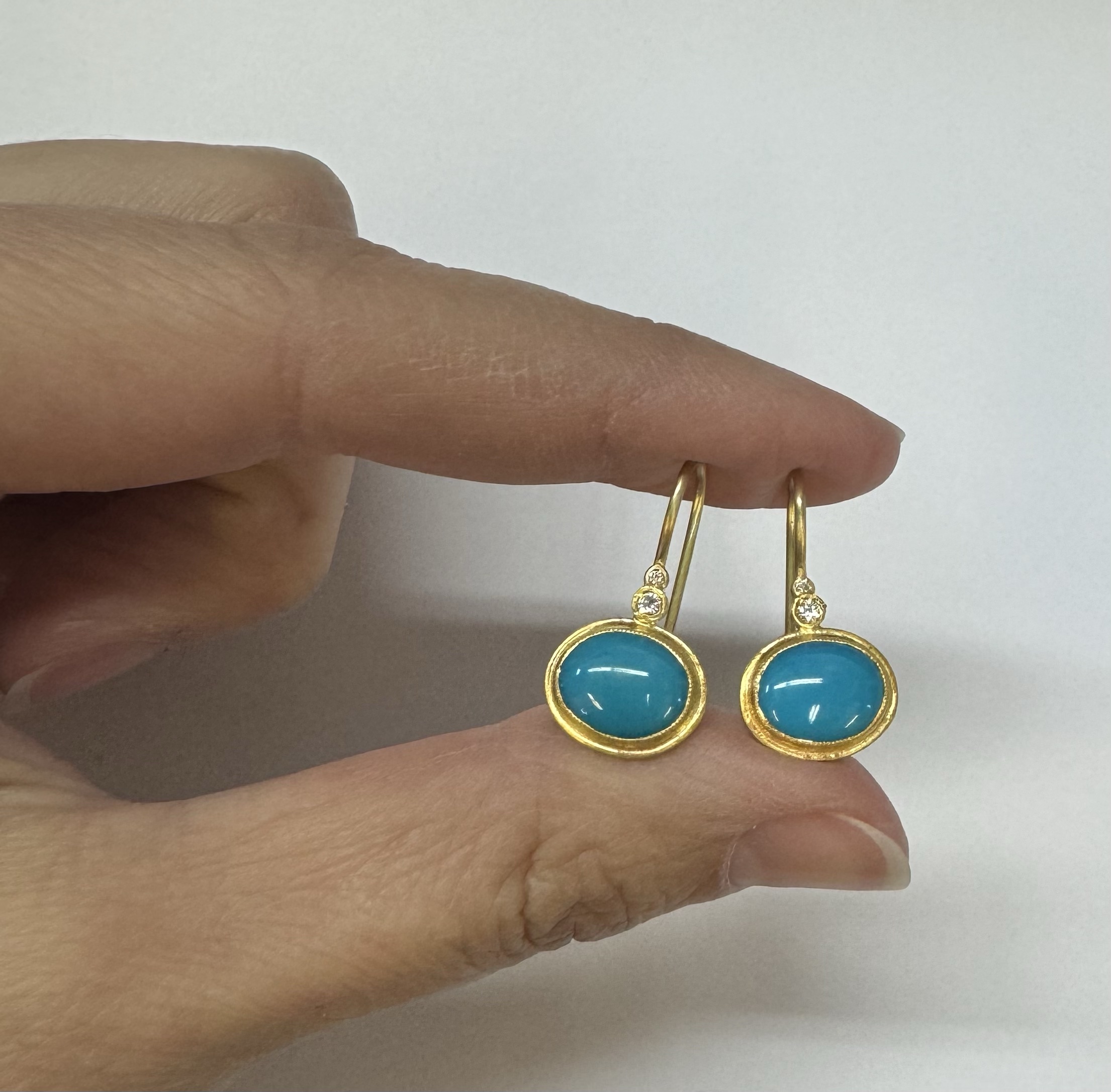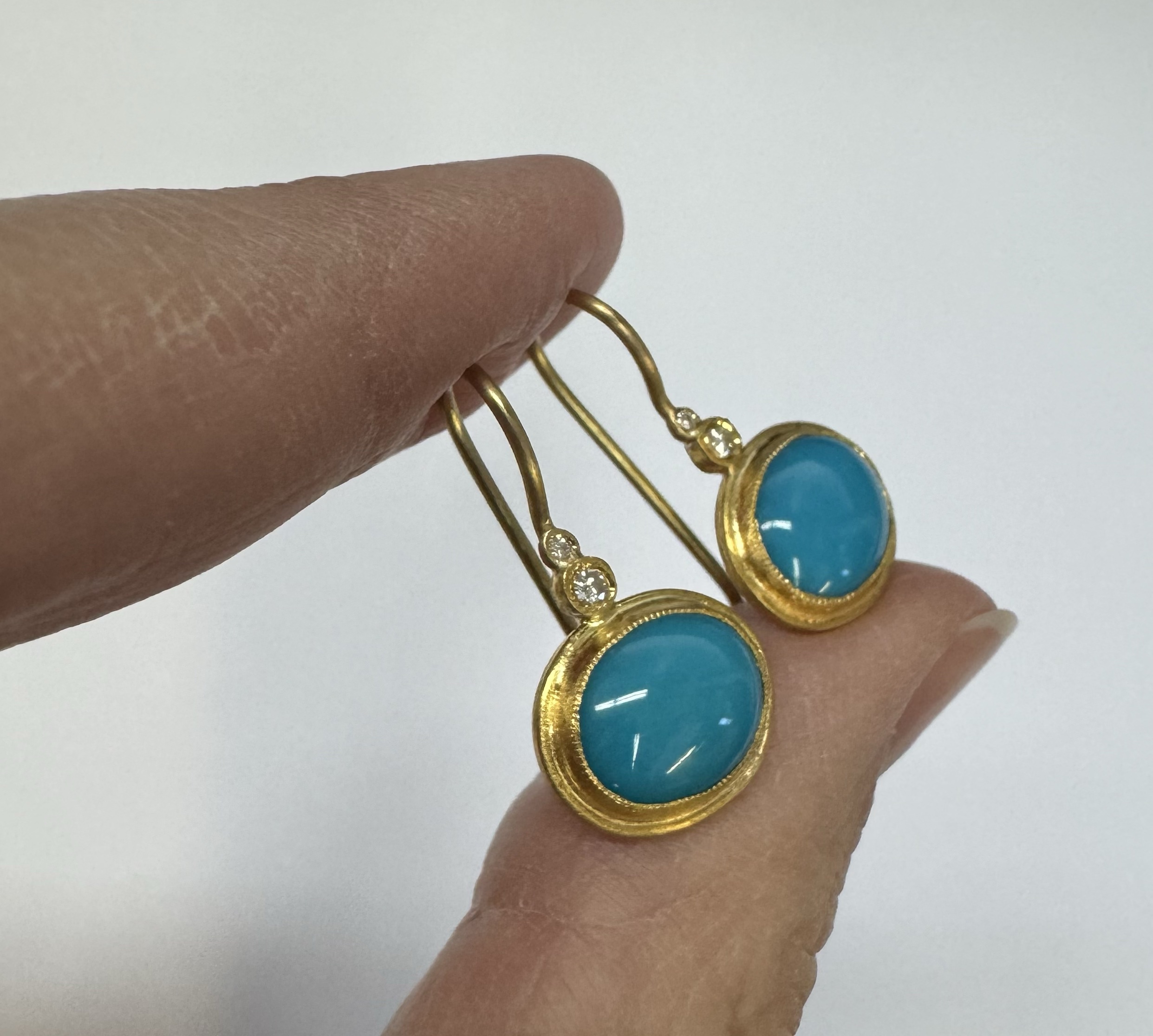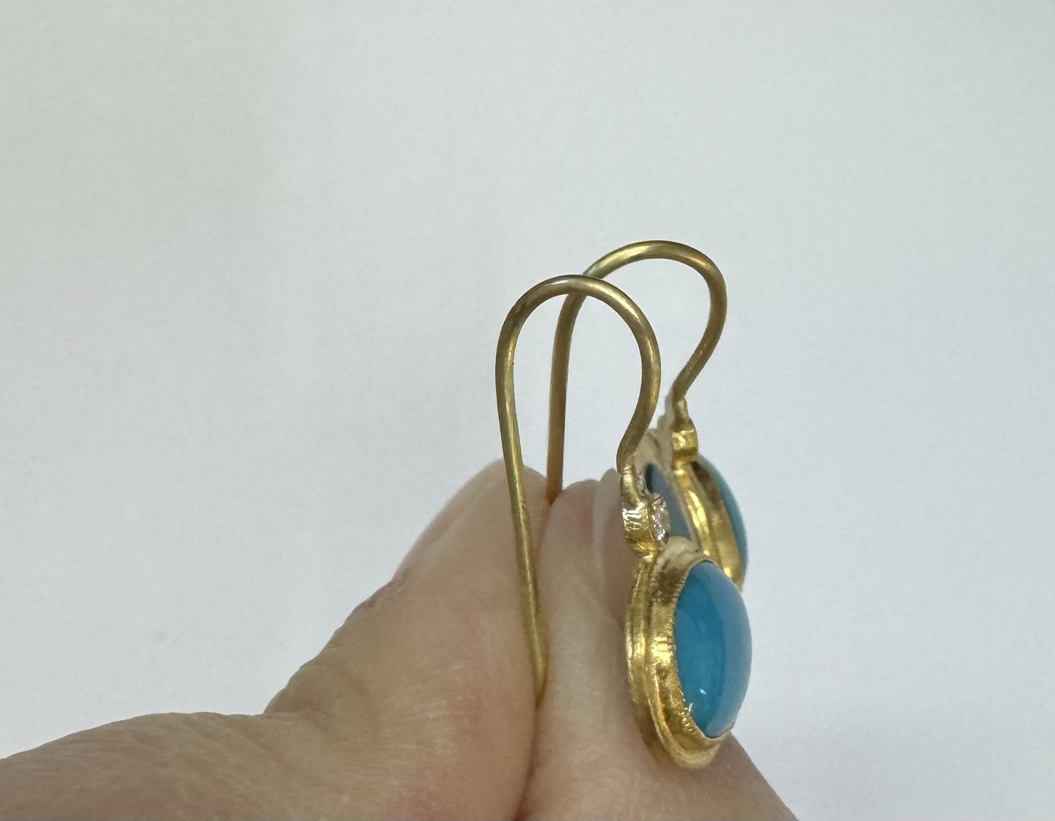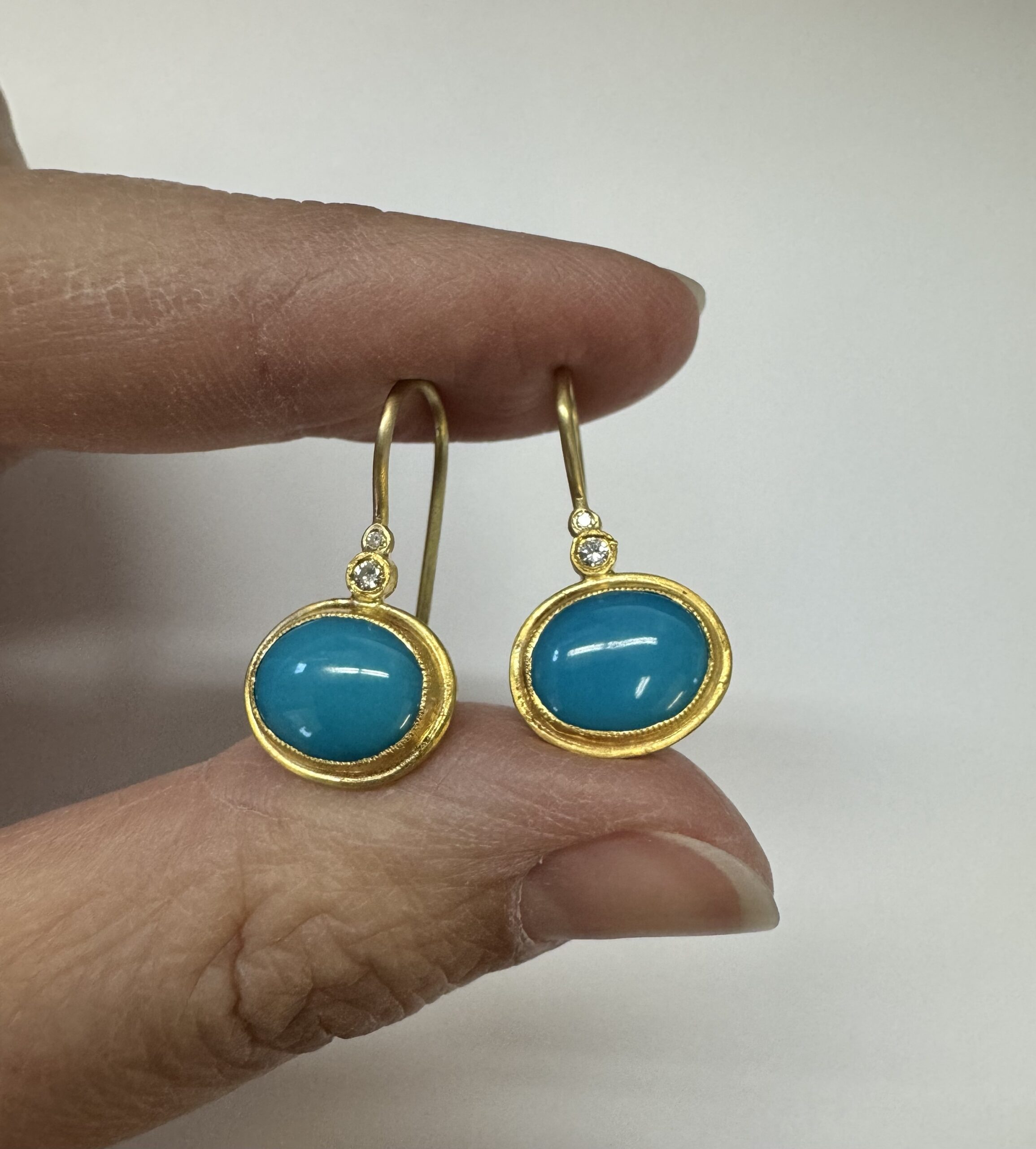 One-of-a-kind genuine 4.05 Cttw Turquoise & .05 cttw genuine Round Brilliant Cut diamond dangle earrings with 24k yellow gold (yes, 24k) bezels & 18k yellow gold wires. These earrings have a total weight of 3.1 grams.