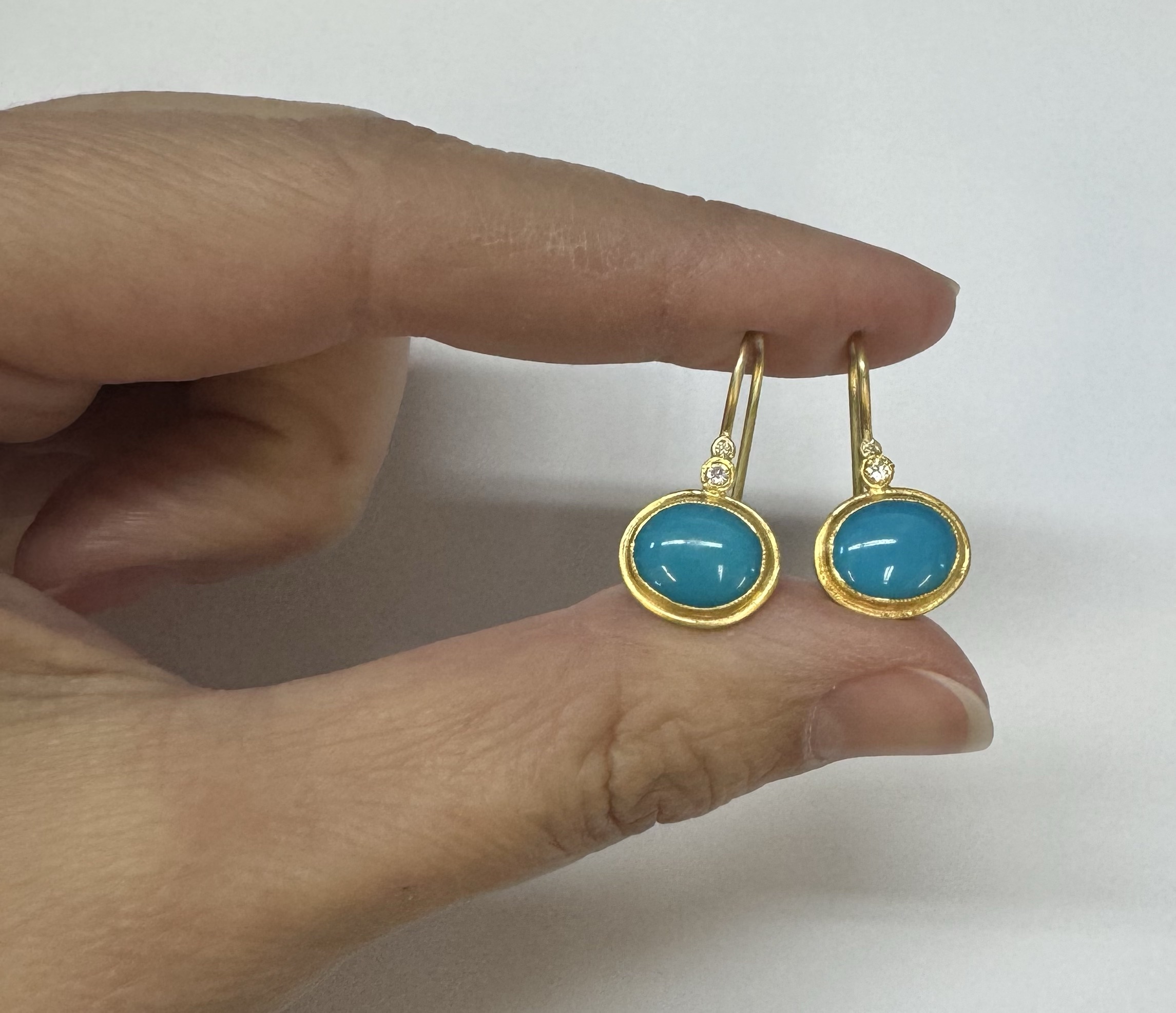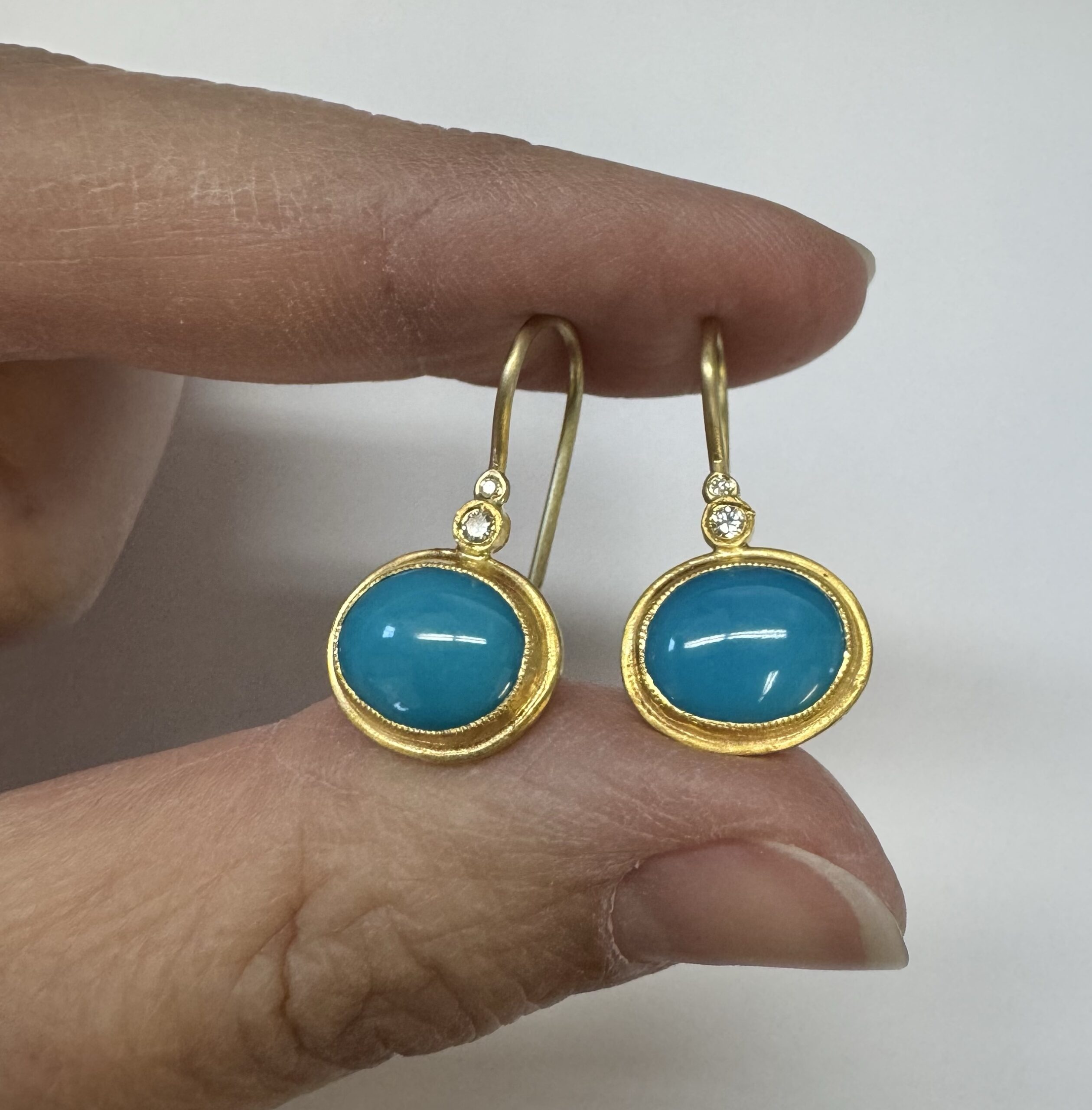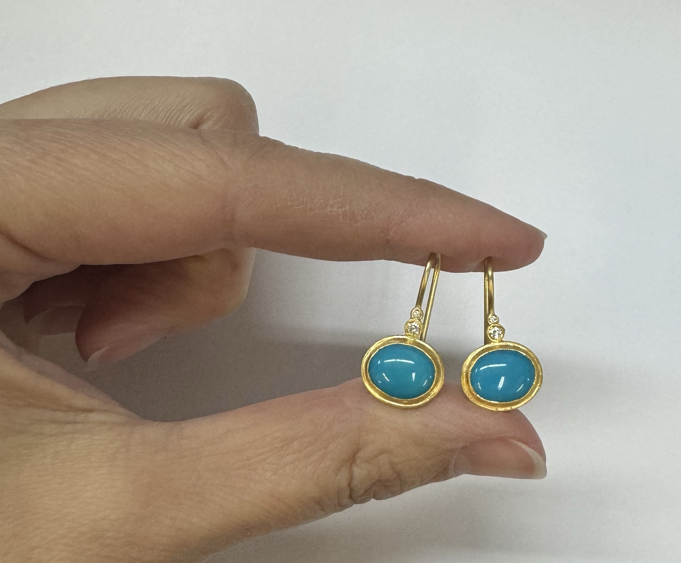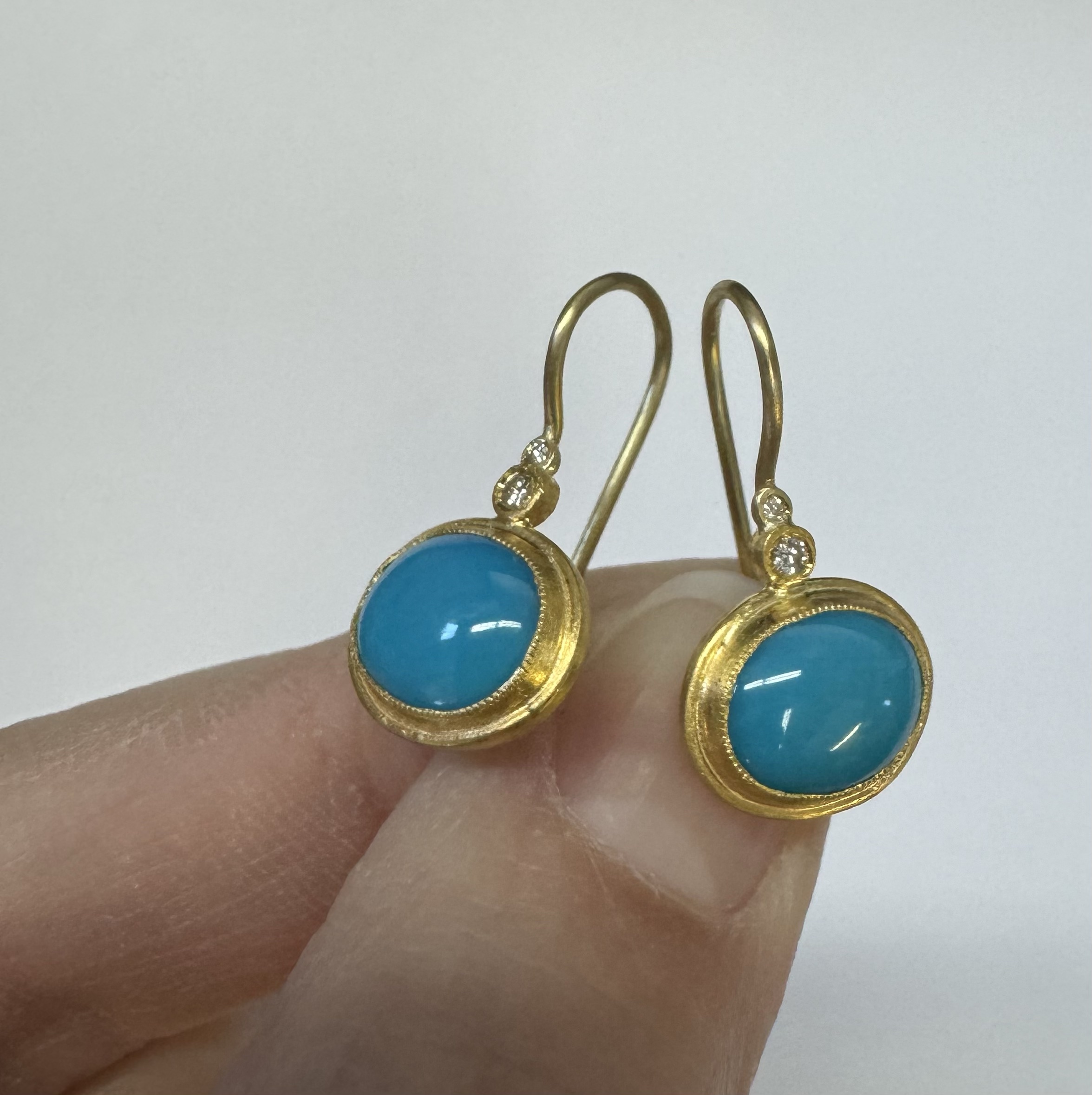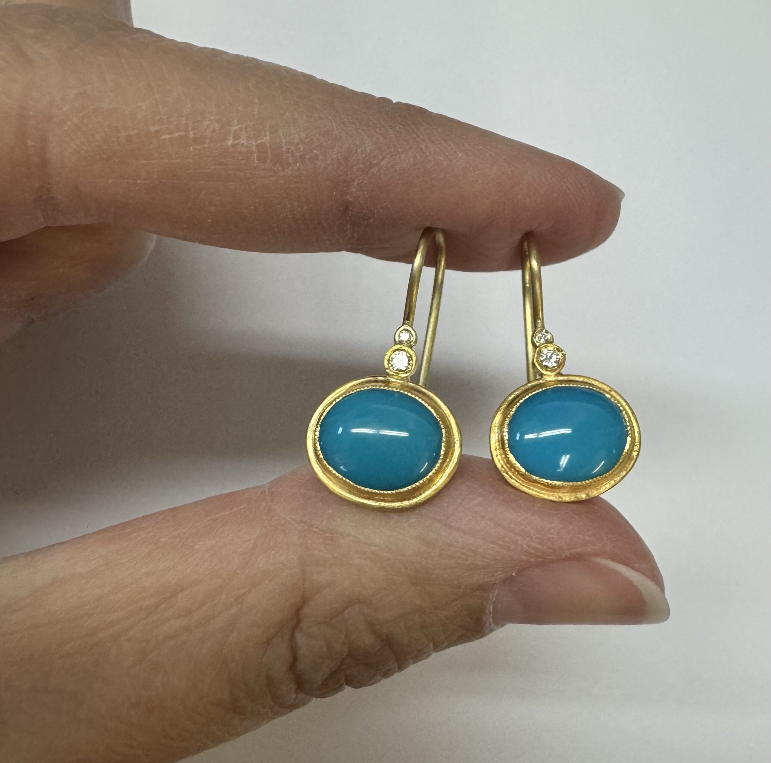One-of-a-kind genuine 4.05 Cttw Turquoise & .05 cttw genuine Round Brilliant Cut diamond dangle earrings with 24k yellow gold (yes, 24k) bezels & 18k yellow gold wires. These earrings have a total weight of 3.1 grams.