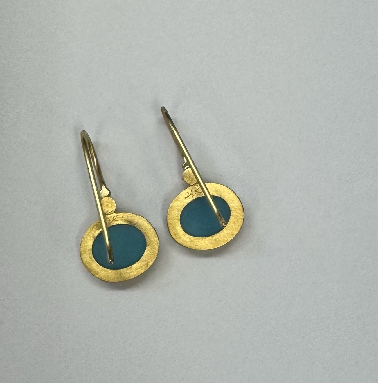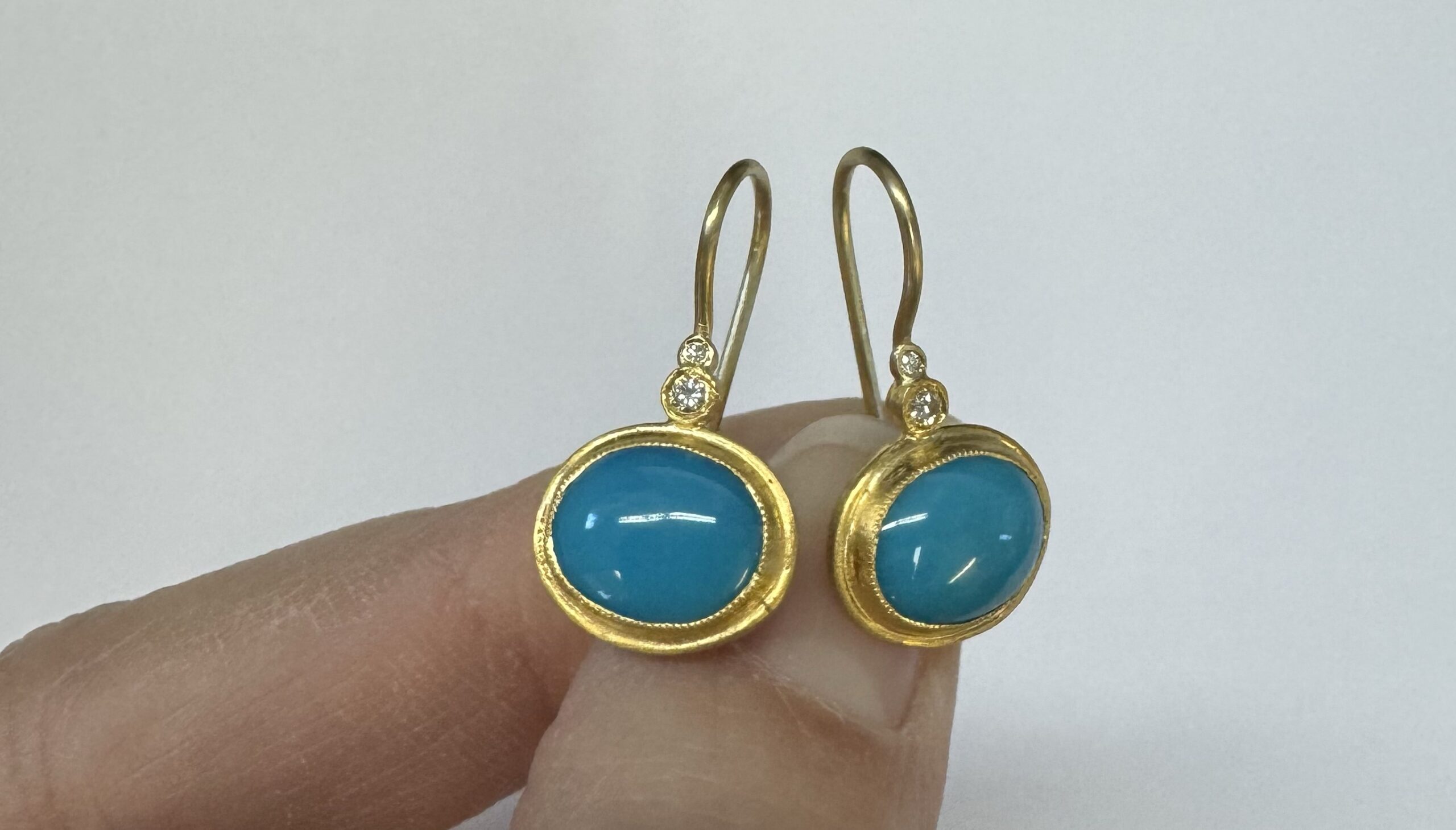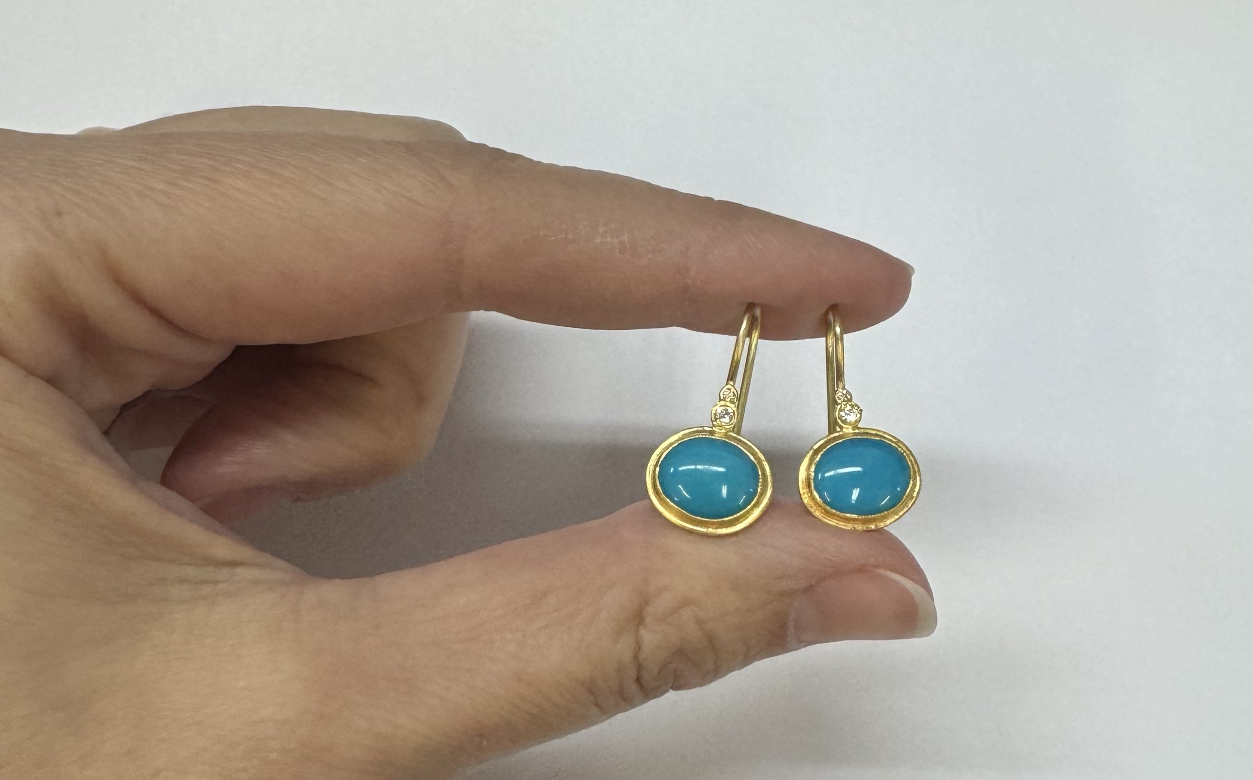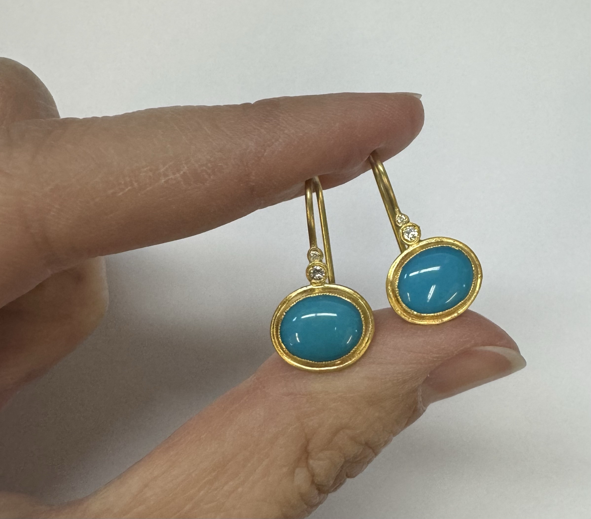 One-of-a-kind genuine 4.05 Cttw Turquoise & .05 cttw genuine Round Brilliant Cut diamond dangle earrings with 24k yellow gold (yes, 24k) bezels & 18k yellow gold wires. These earrings have a total weight of 3.1 grams.