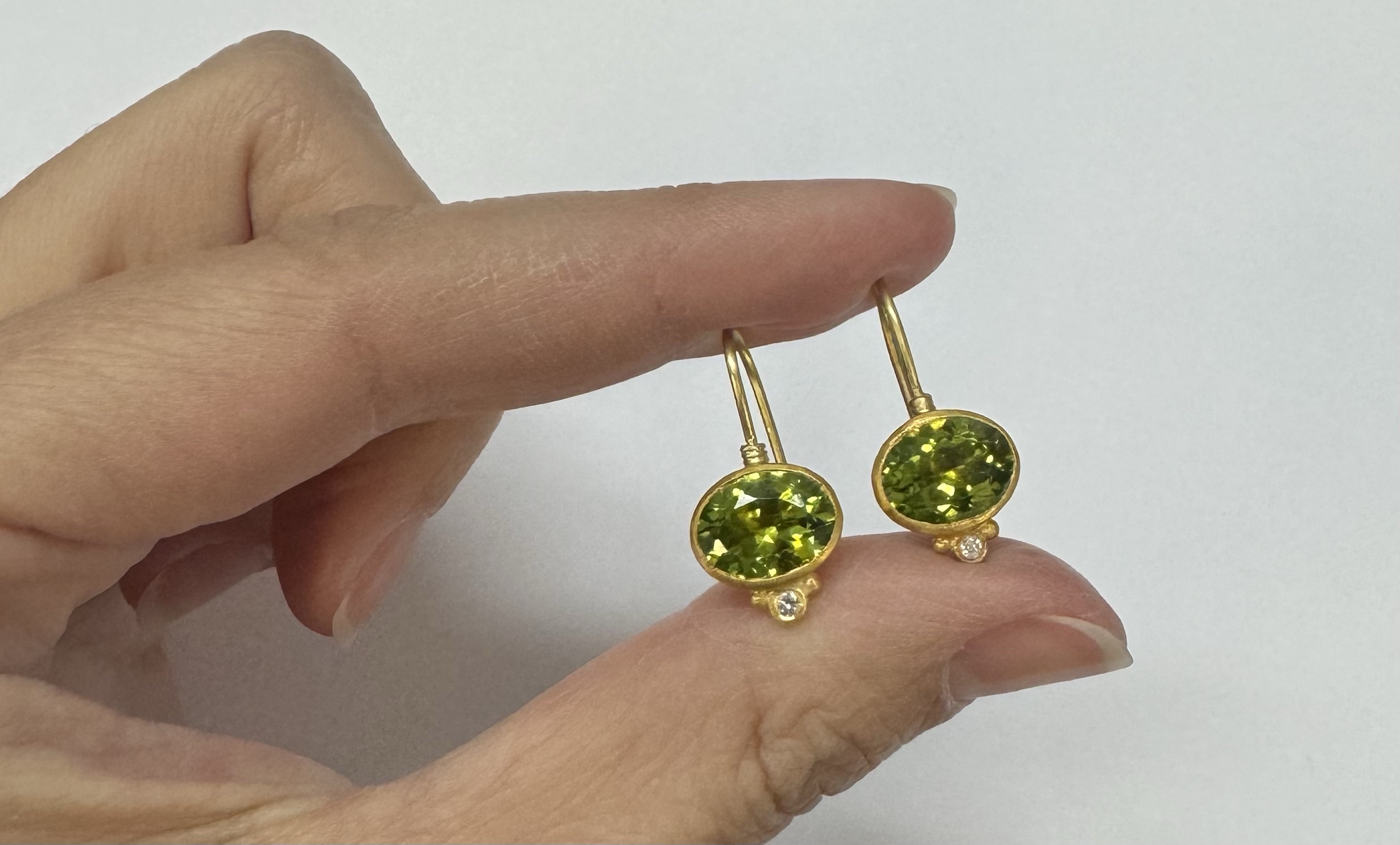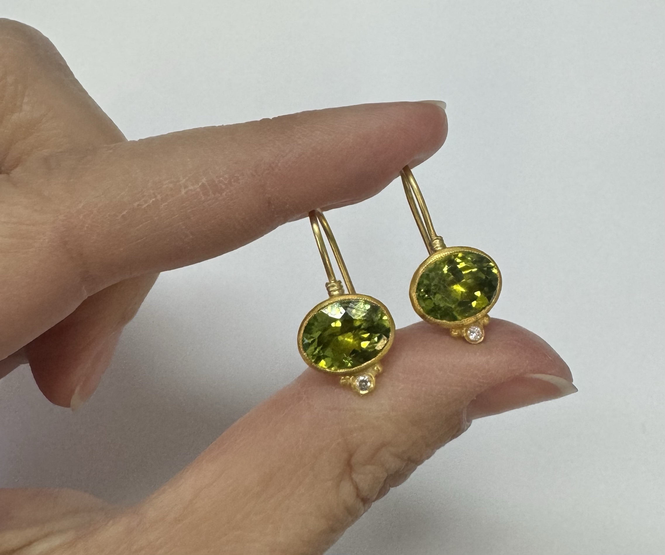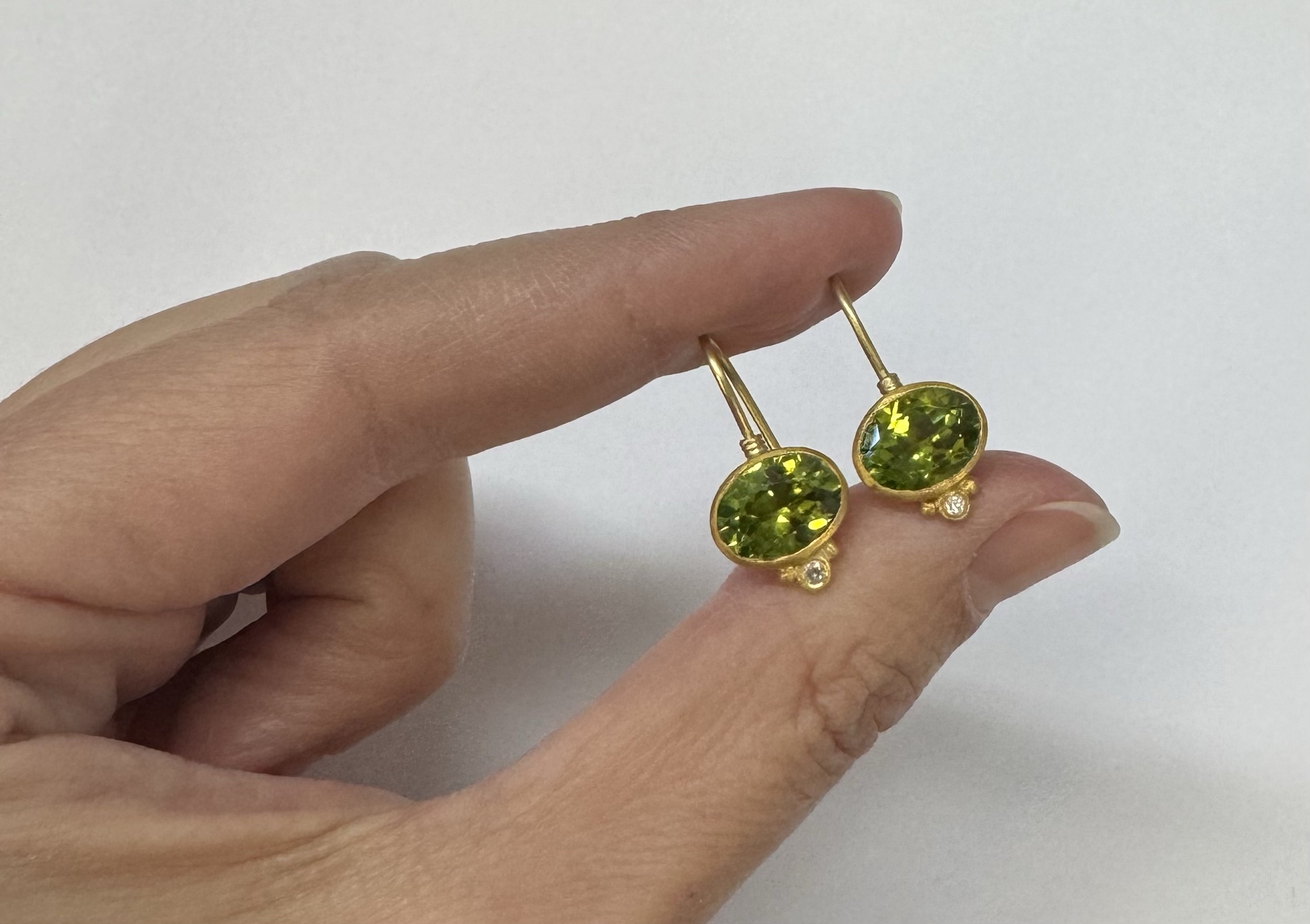 One-of-a-kind genuine 5.65 cttw oval shaped, faceted Peridot & .04 cttw genuine Round Brilliant Cut diamond dangle earrings with 24k yellow gold bezels and 18k yellow gold ear wires. The diamonds average G-H in color and SI1-SI2 in clarity. These earrings have an entire weight of 3.8 grams.
