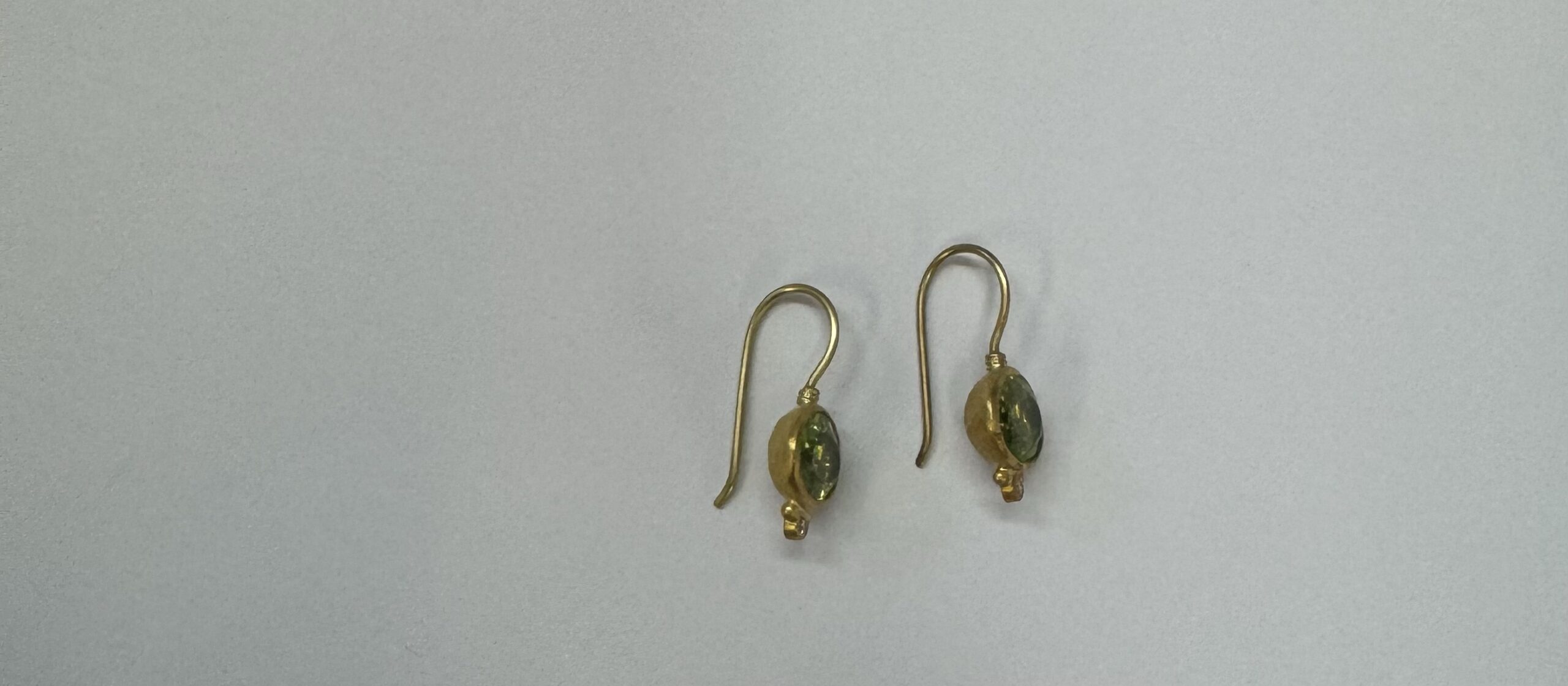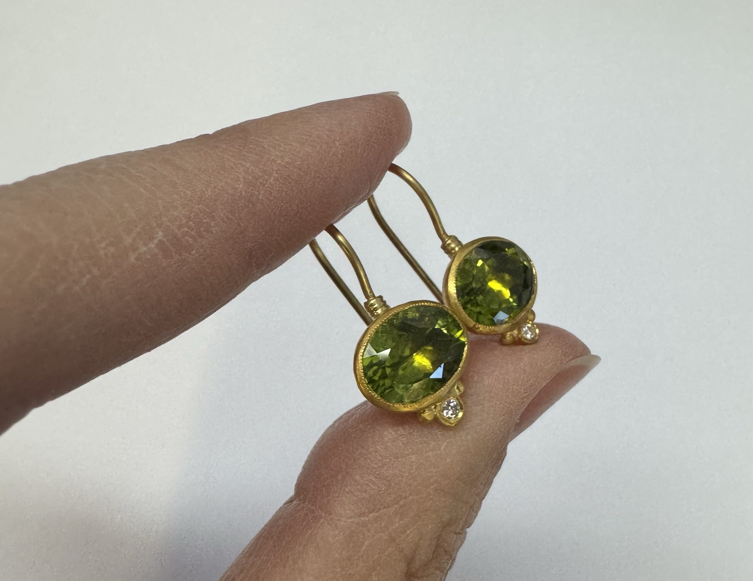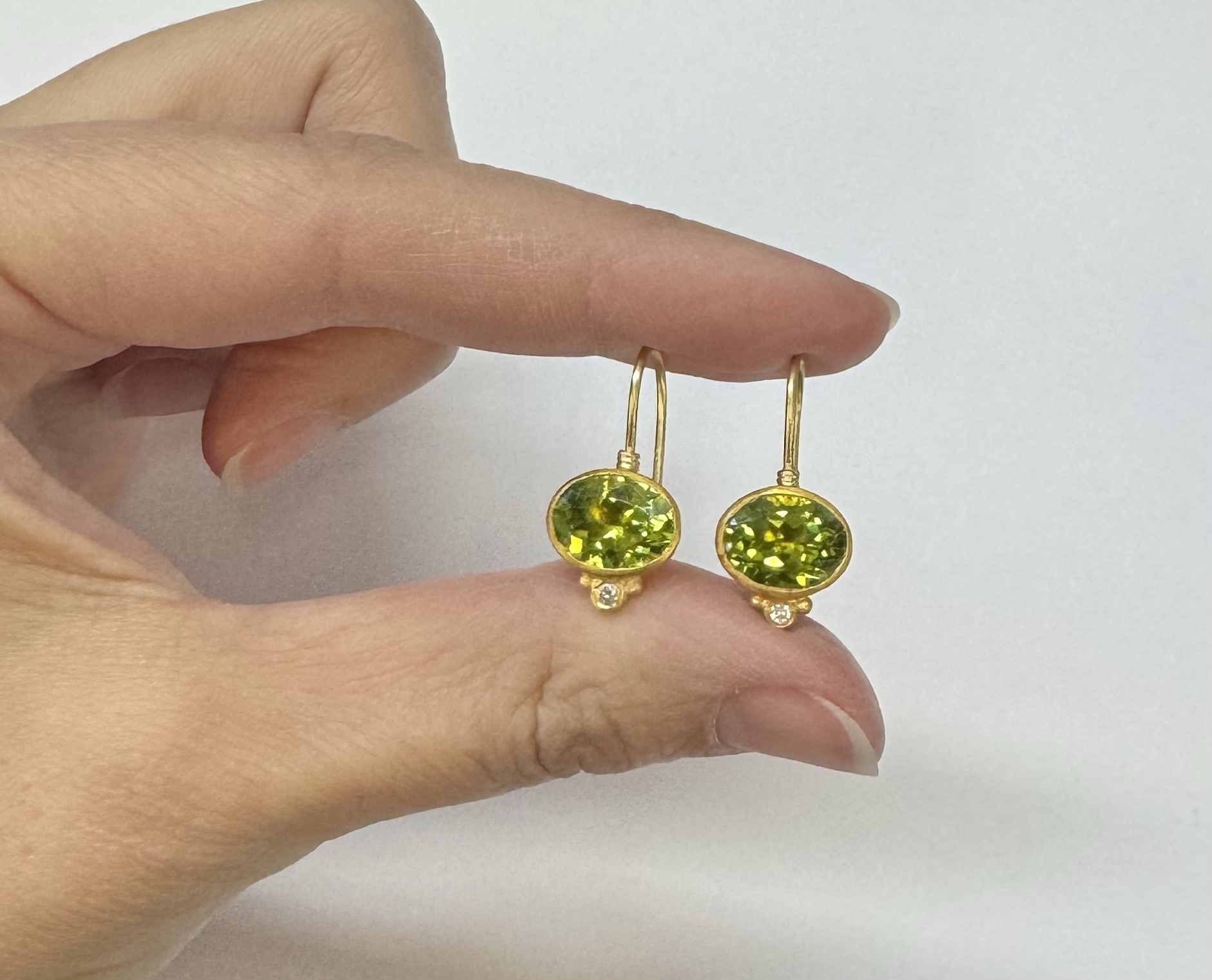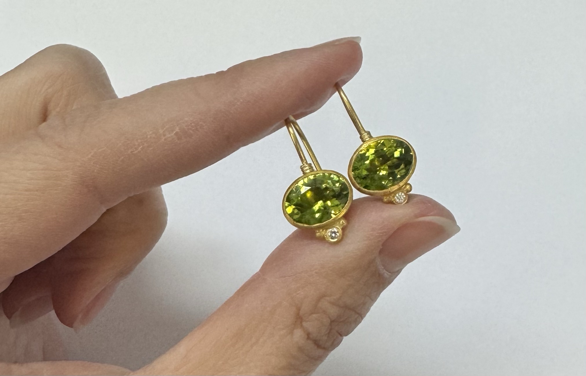 One-of-a-kind genuine 5.65 cttw oval shaped, faceted Peridot & .04 cttw genuine Round Brilliant Cut diamond dangle earrings with 24k yellow gold bezels and 18k yellow gold ear wires. The diamonds average G-H in color and SI1-SI2 in clarity. These earrings have an entire weight of 3.8 grams.