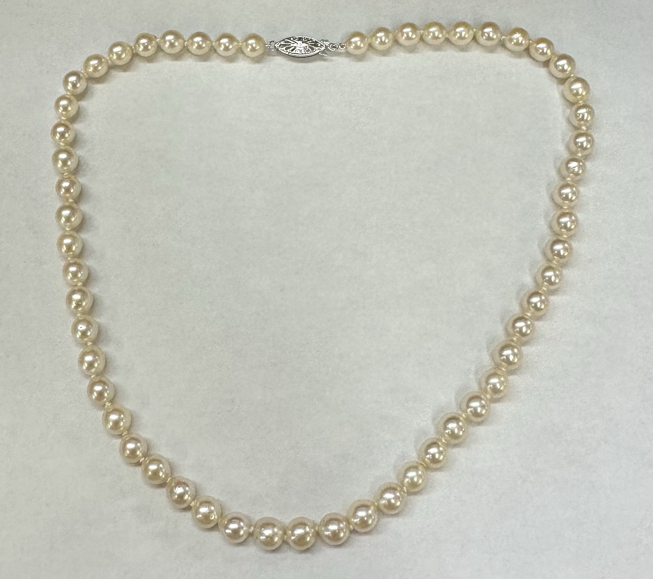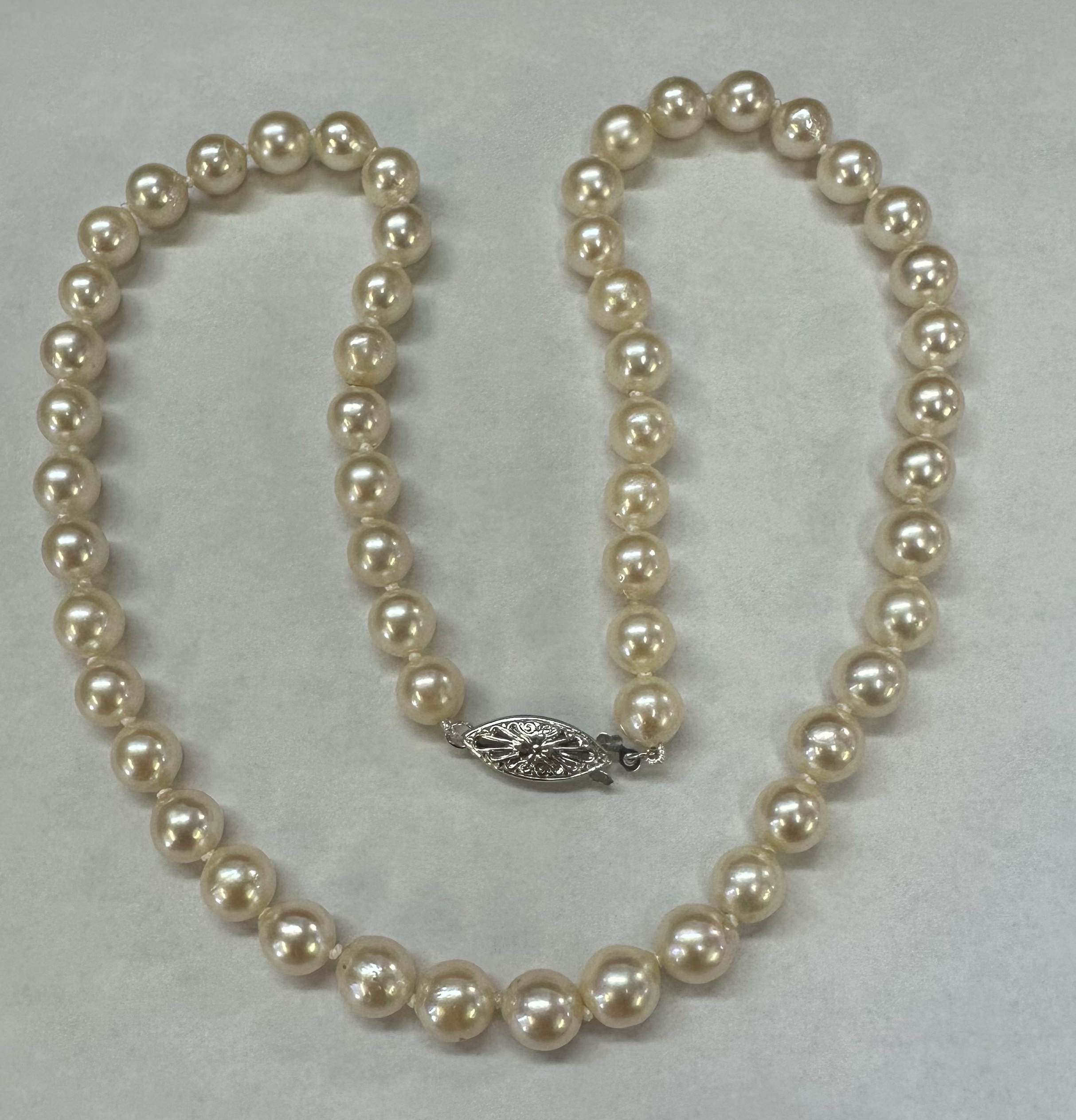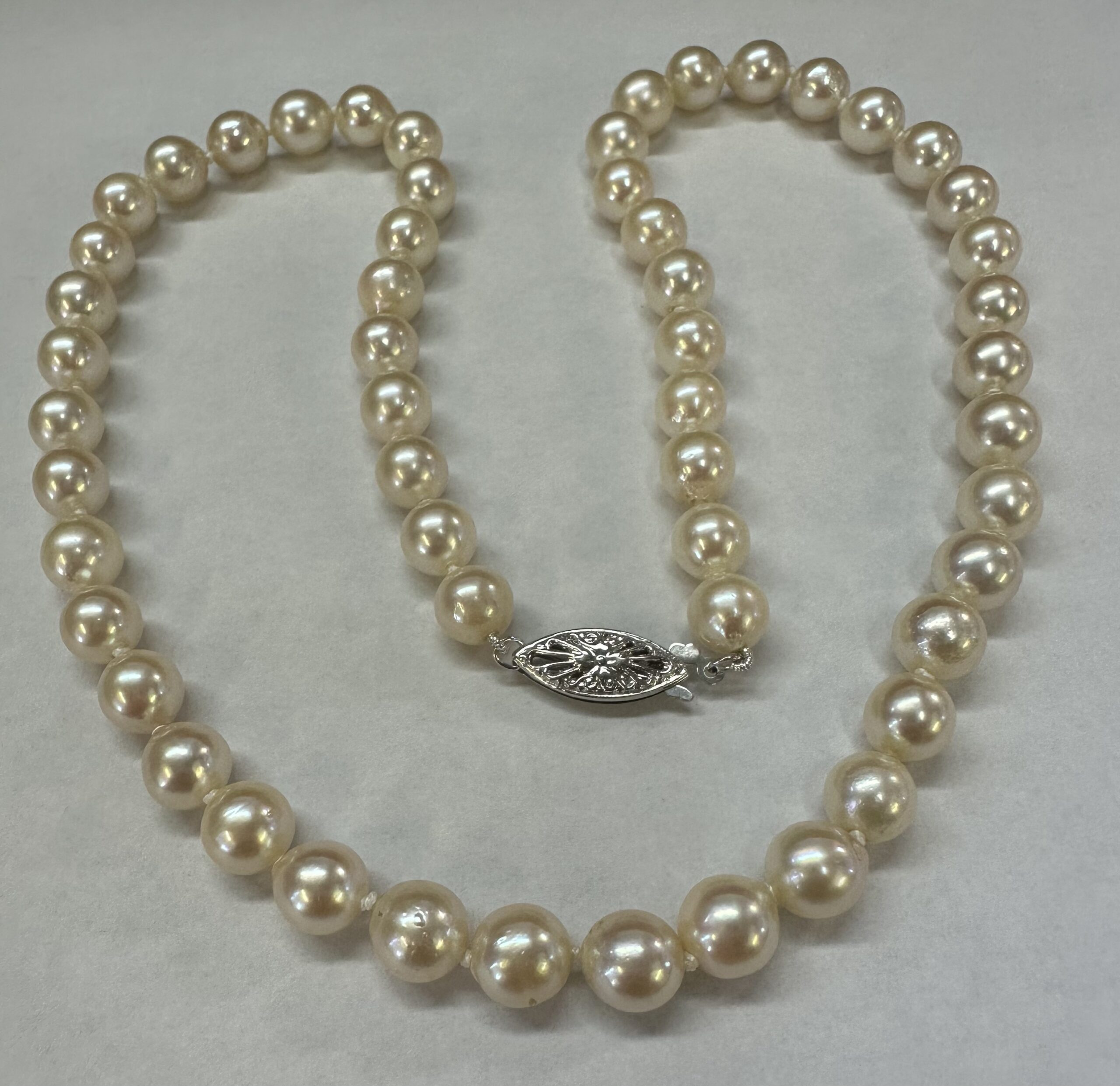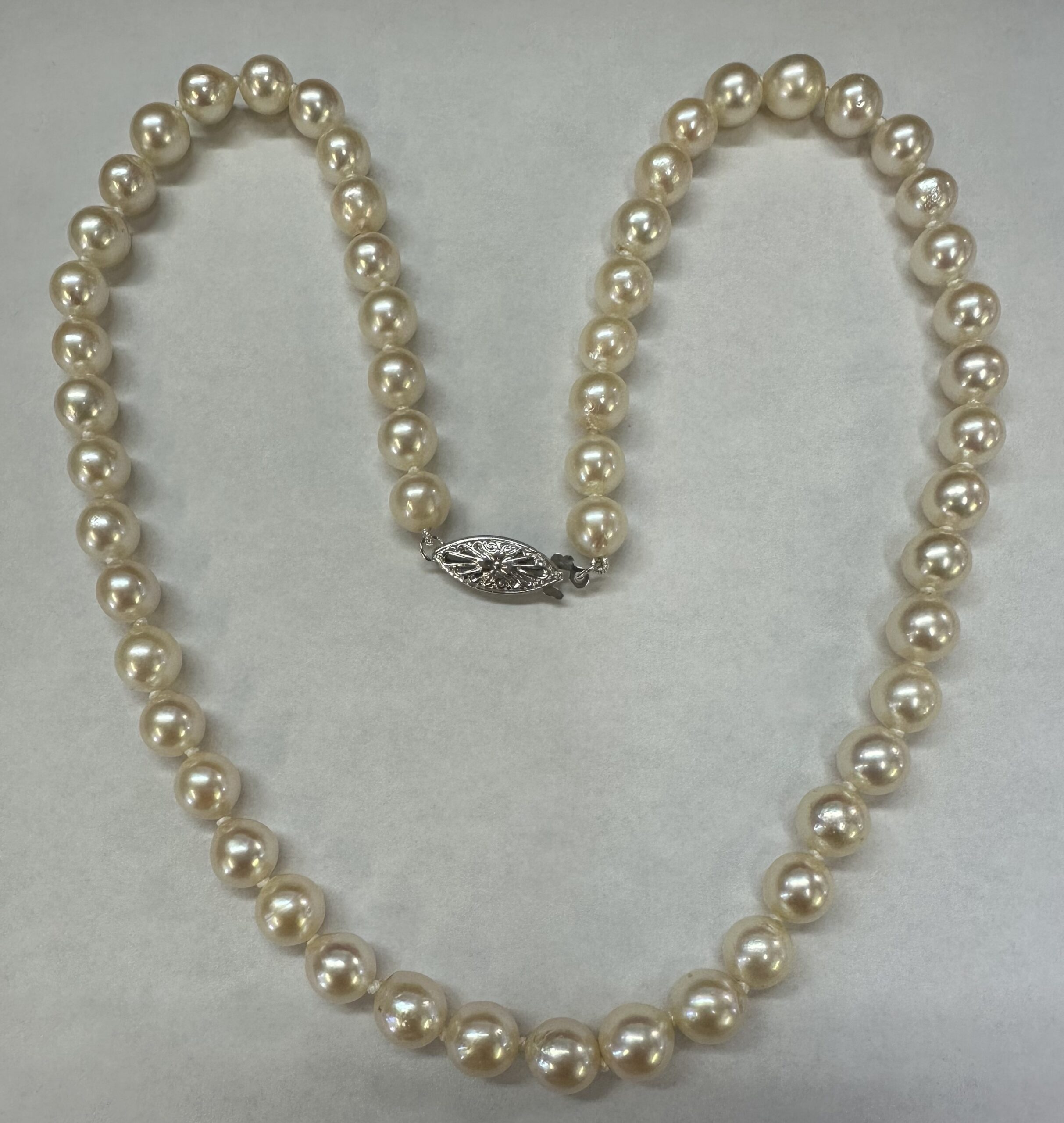 A vintage 55 pearl 18” knotted strand of cultured 7-7.4 mm Baroque pearls with a 14k white gold filigree pearl clasp (only one strand like this available!)
