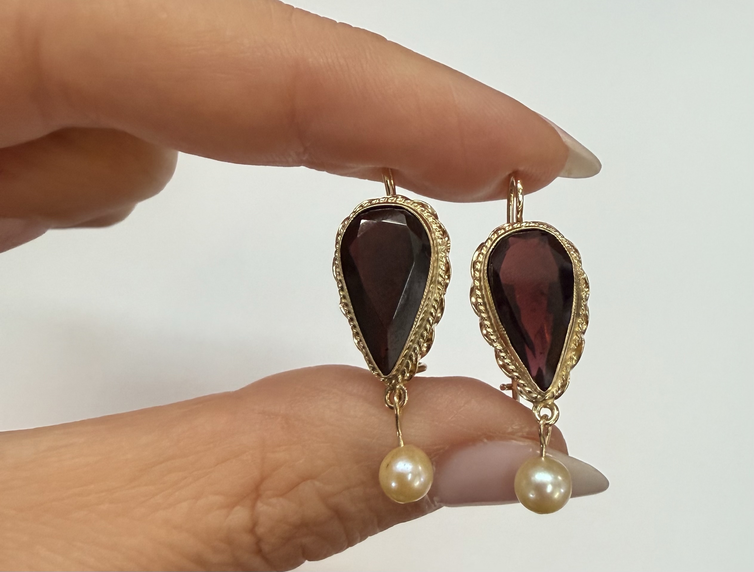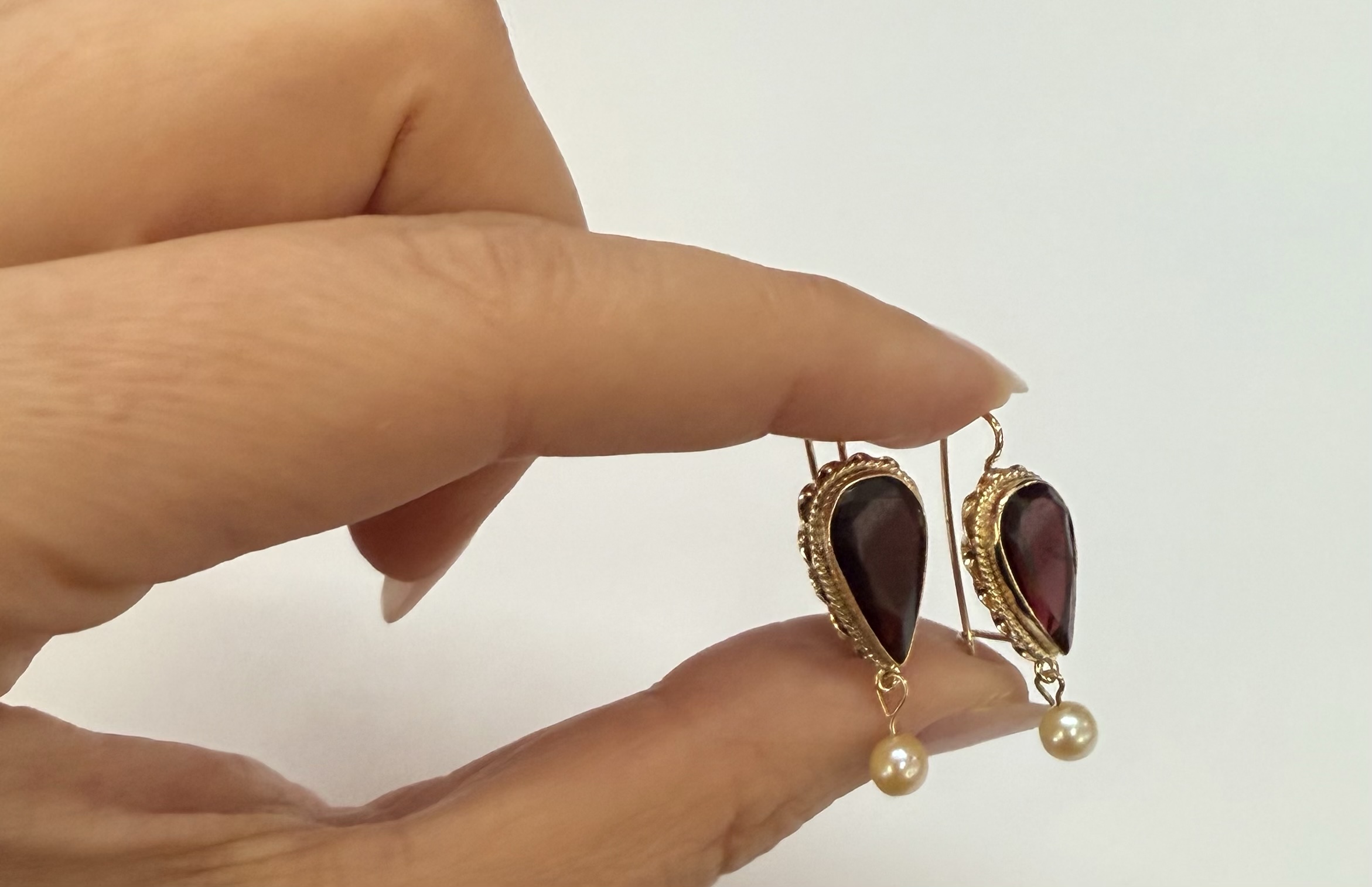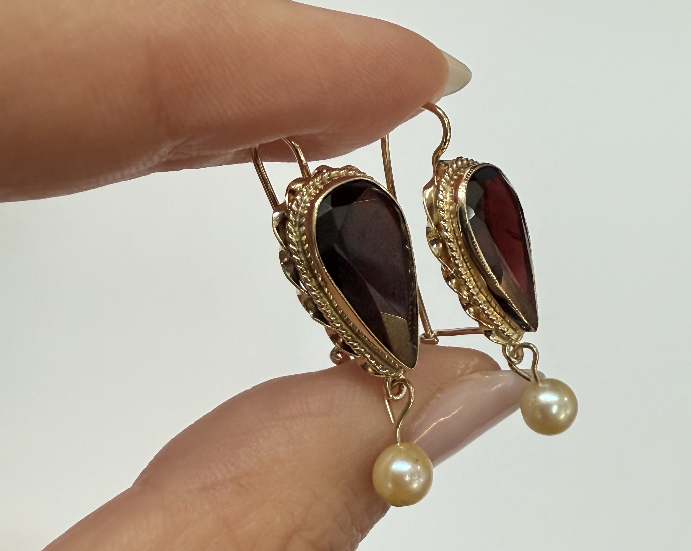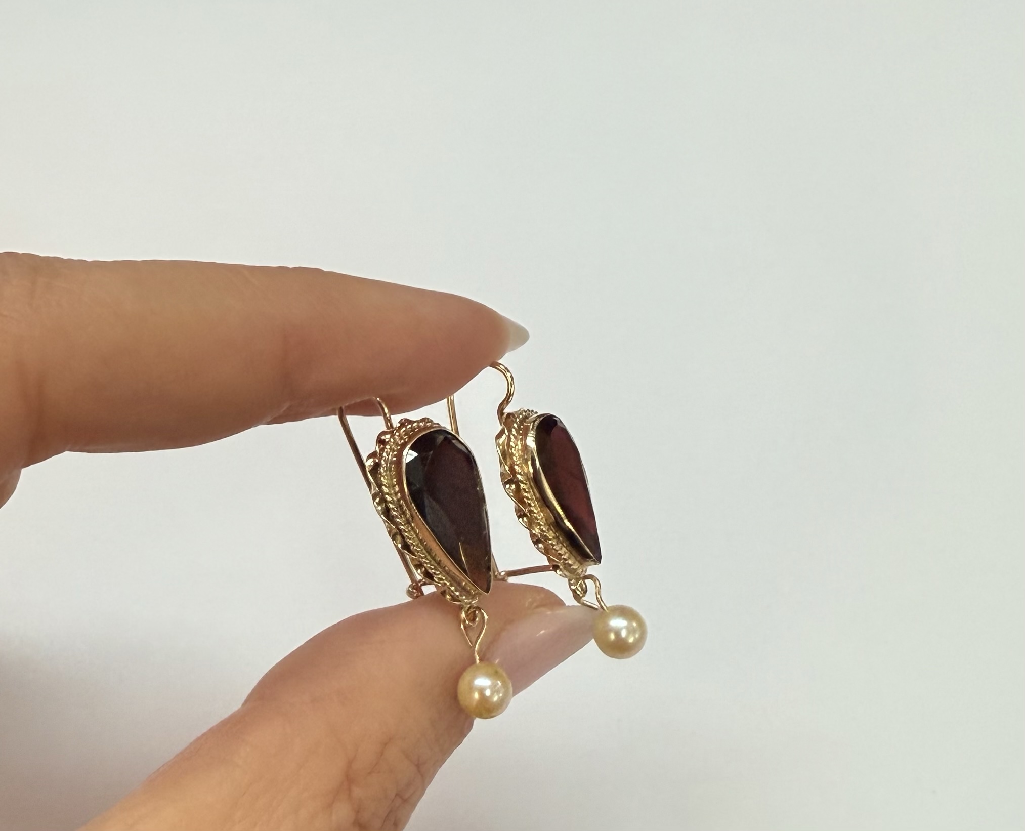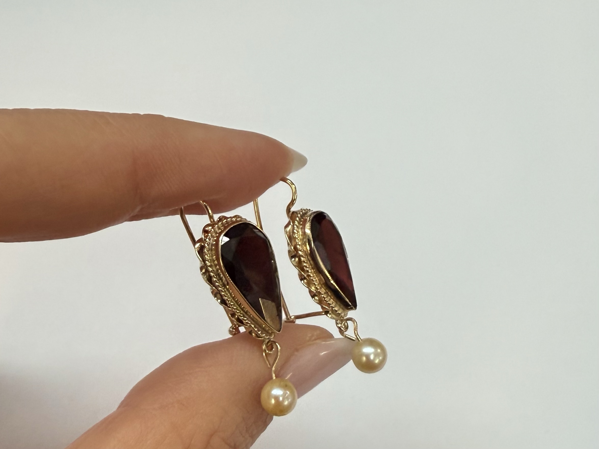 One-of-a-kind antique 14k yellow gold genuine pear shaped Garnet & 4.5 mm cultured pearl dangle earrings with engraved details and fish hook backs. These earrings have an entire weight of grams.