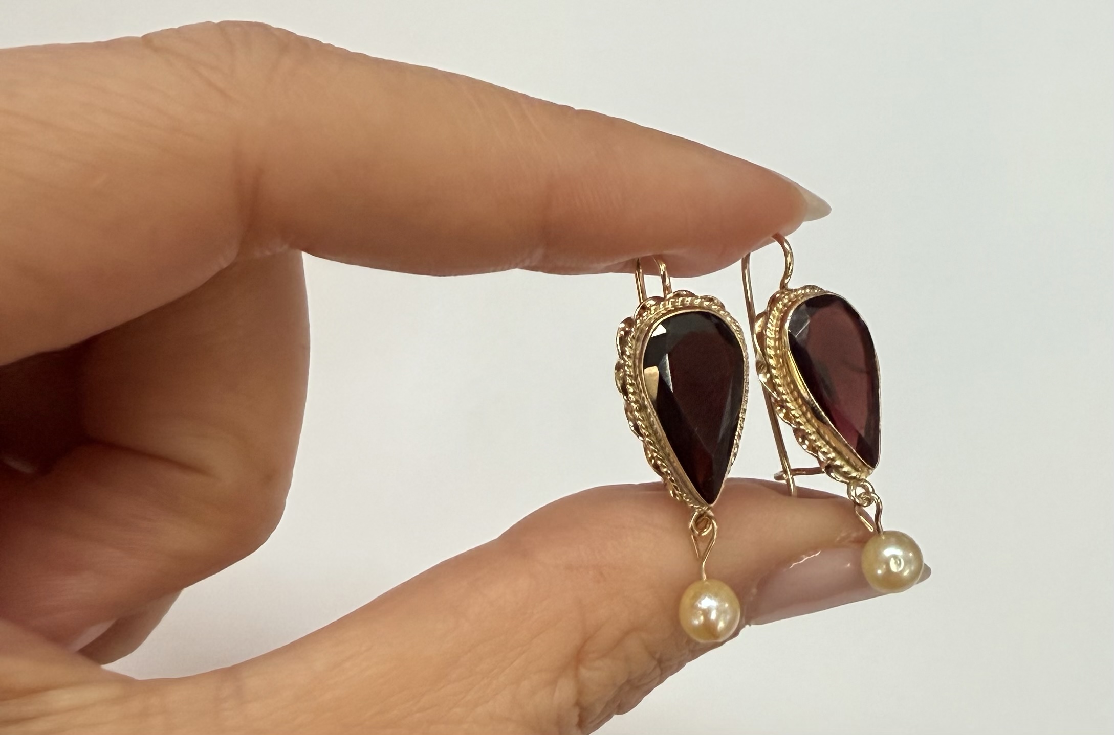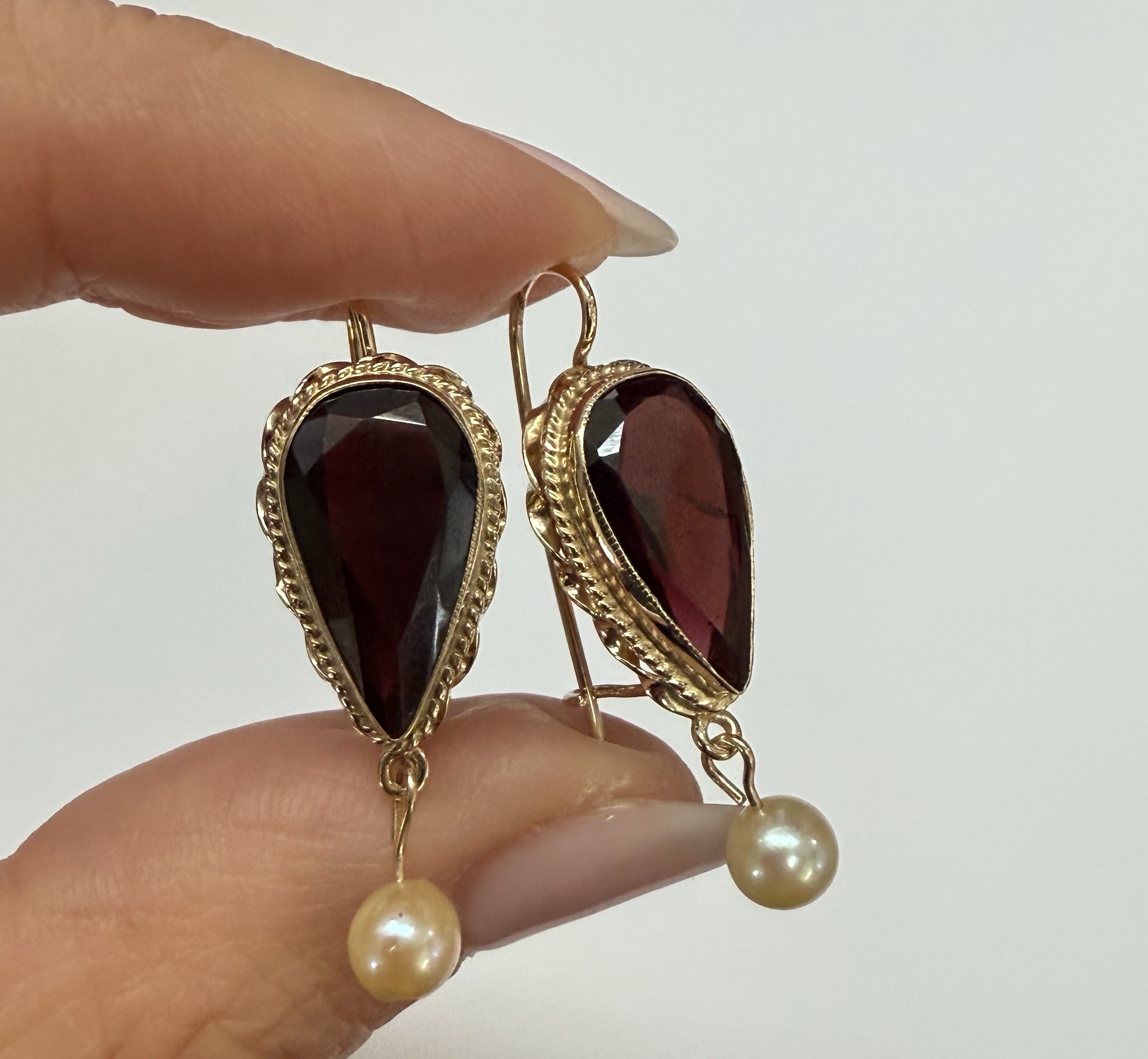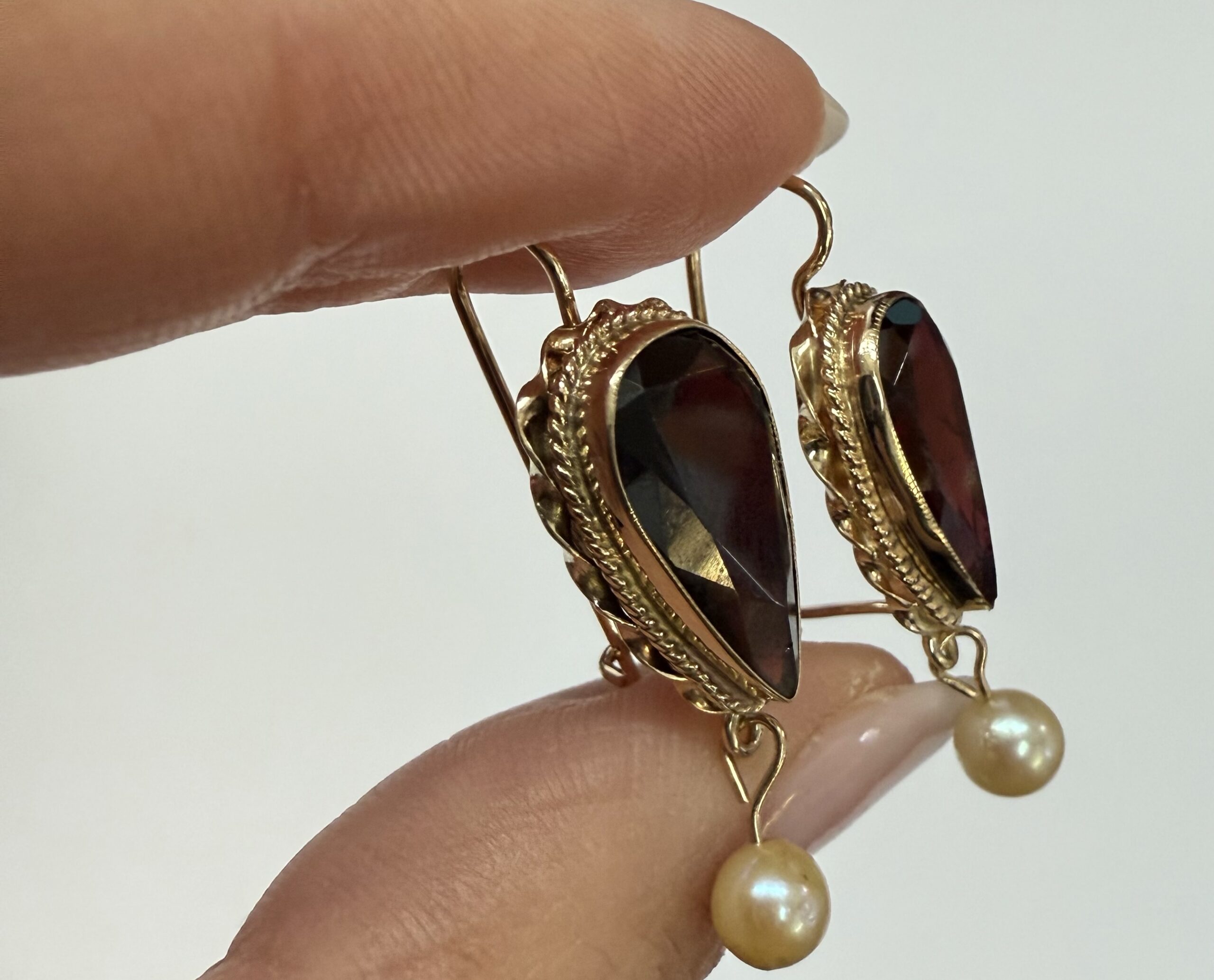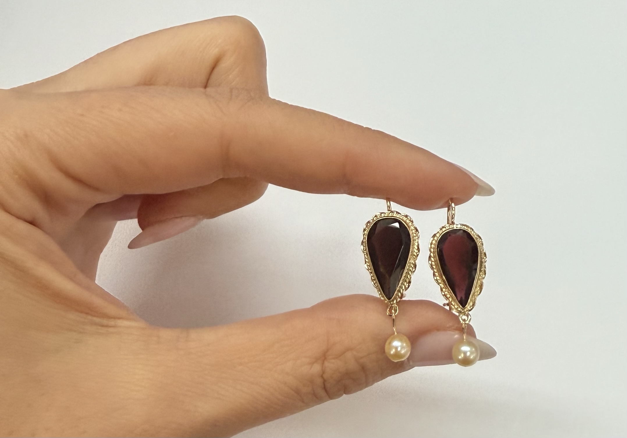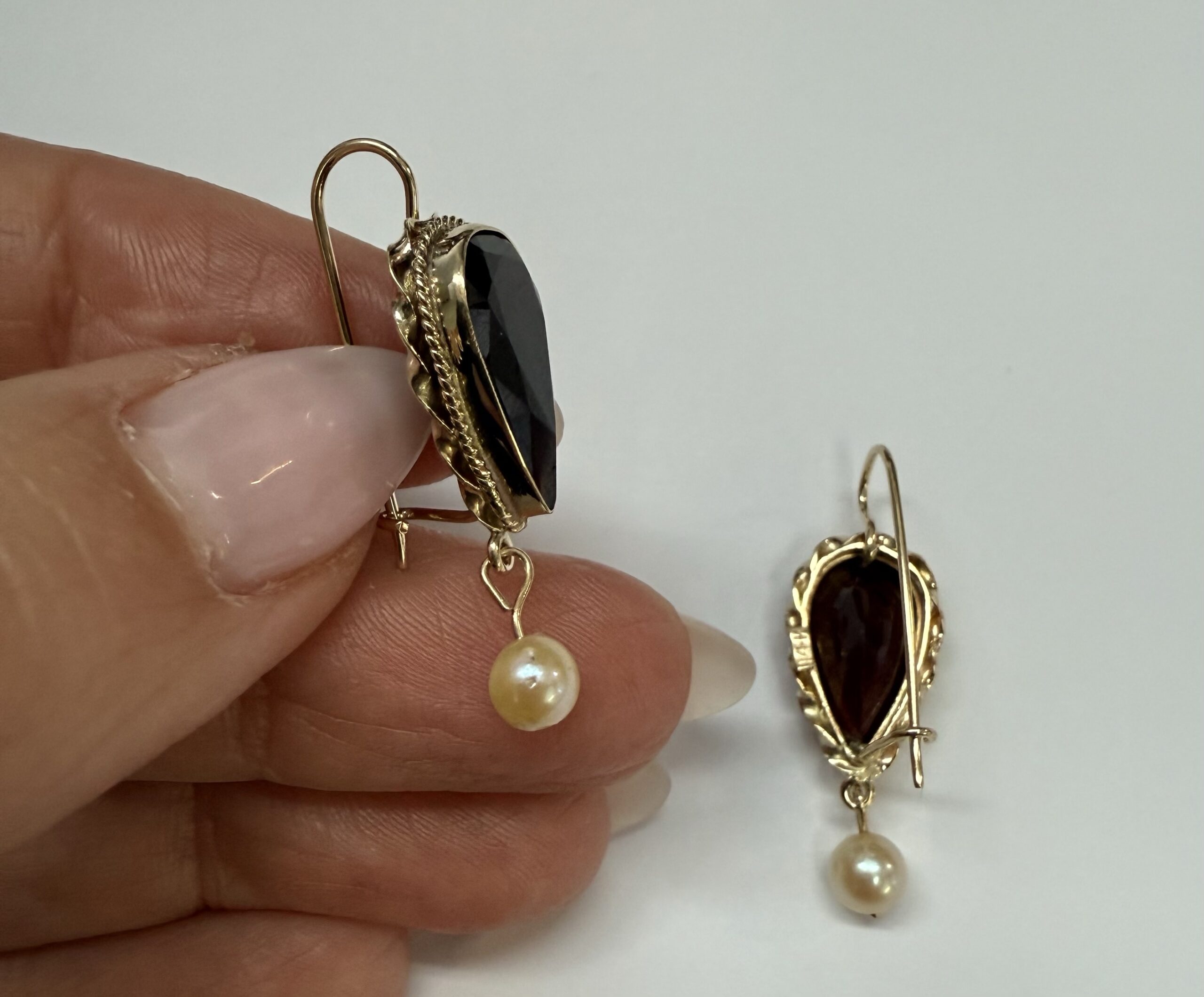 One-of-a-kind antique 14k yellow gold genuine pear shaped Garnet & 4.5 mm cultured pearl dangle earrings with engraved details and fish hook backs. These earrings have an entire weight of grams.