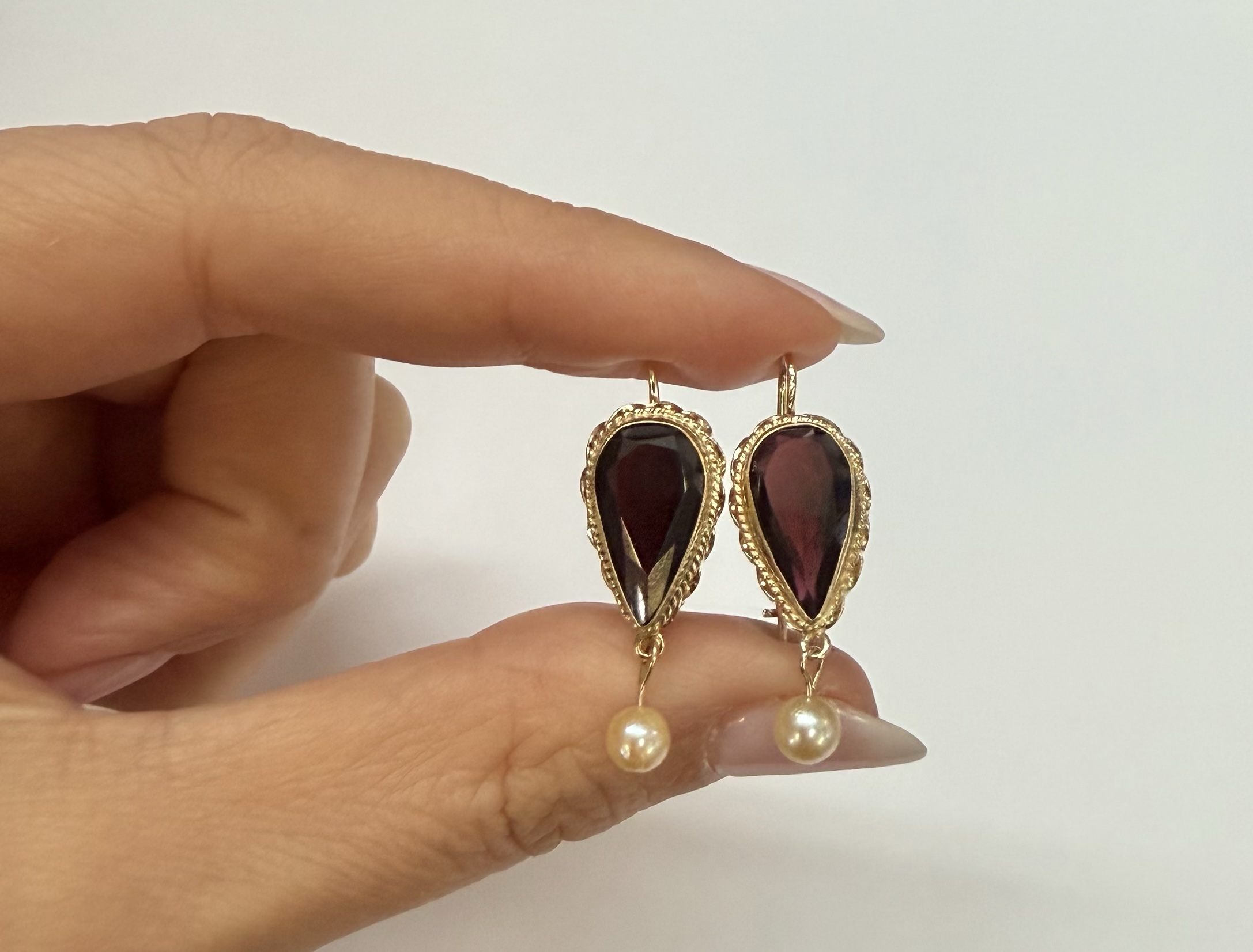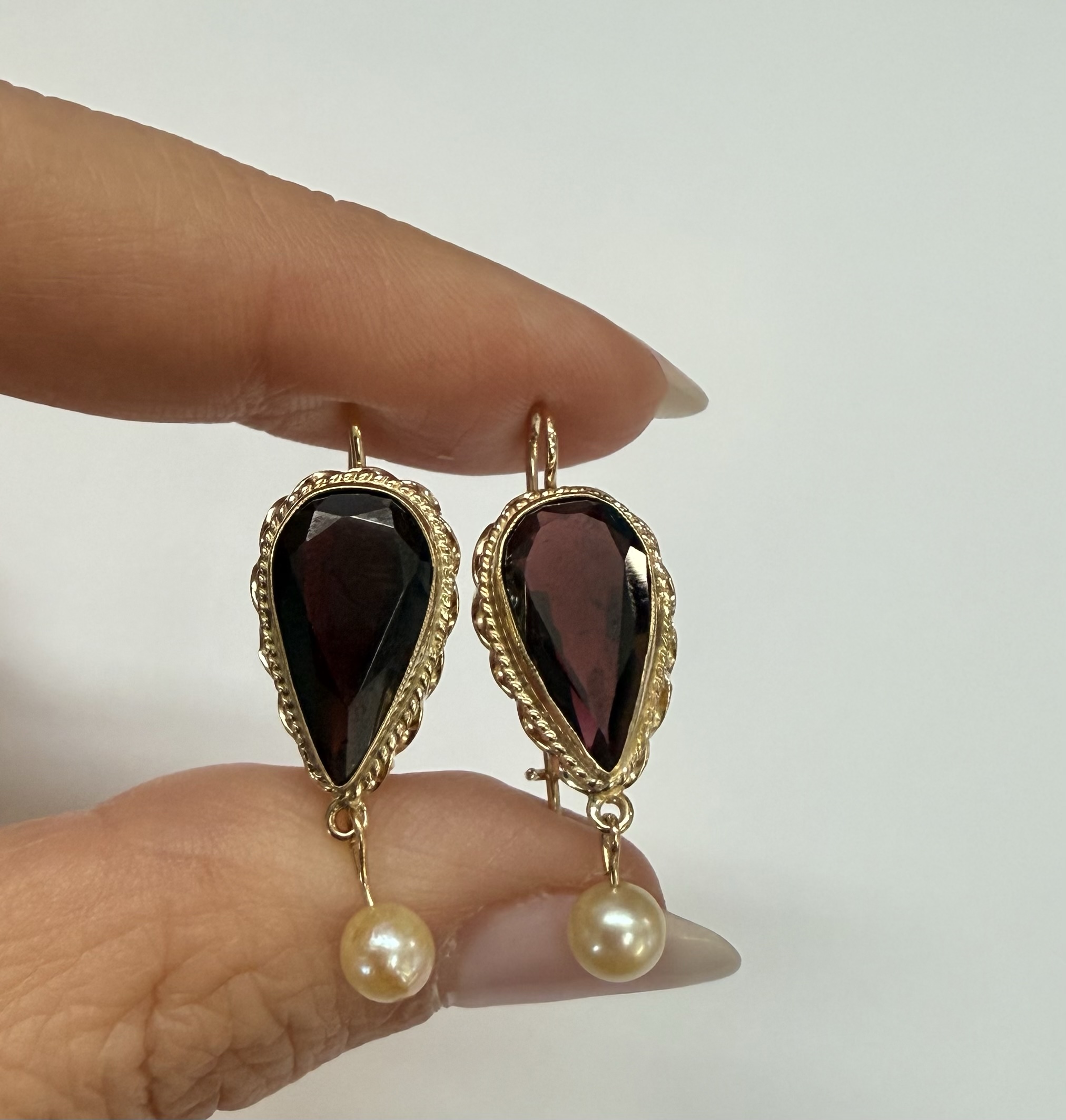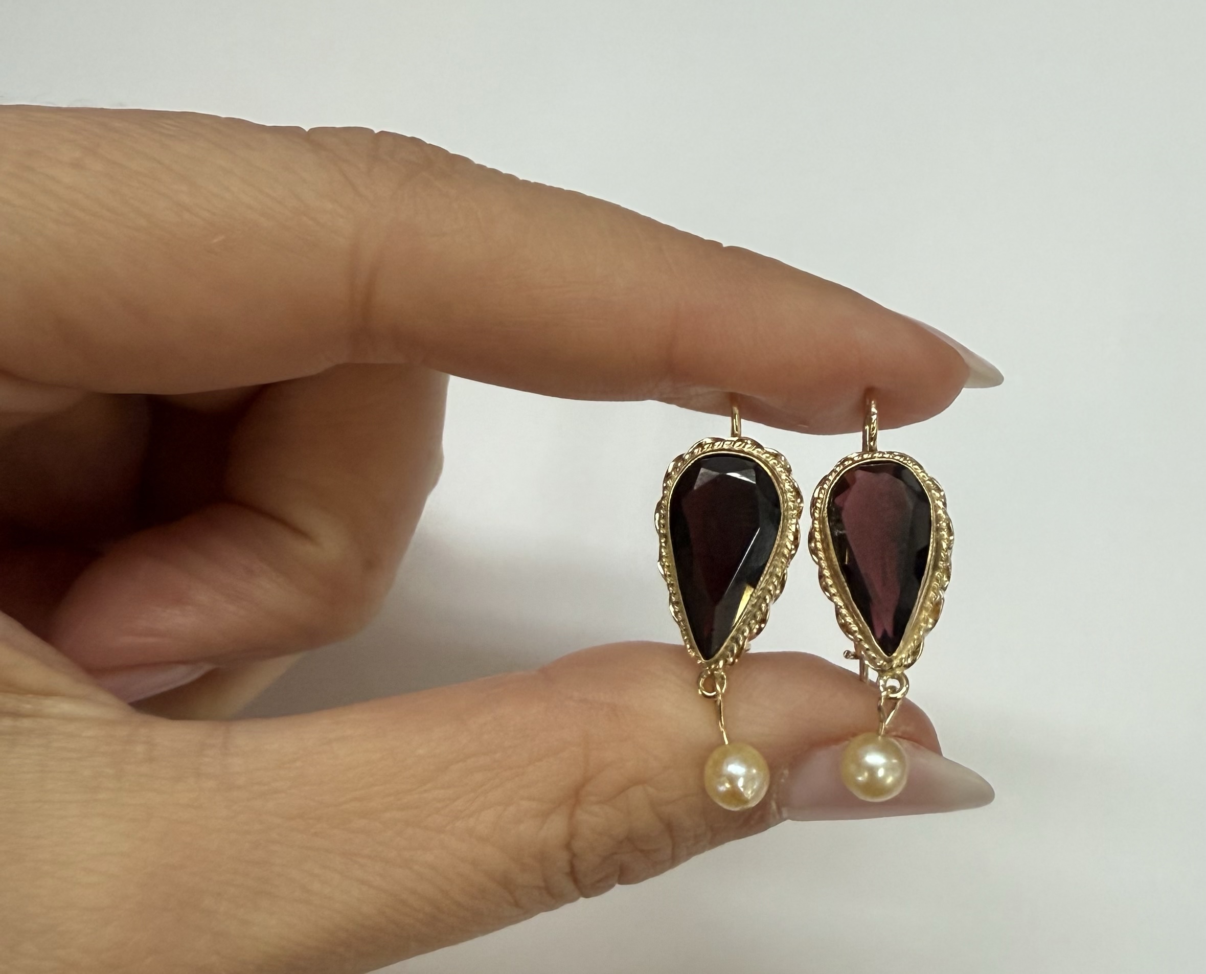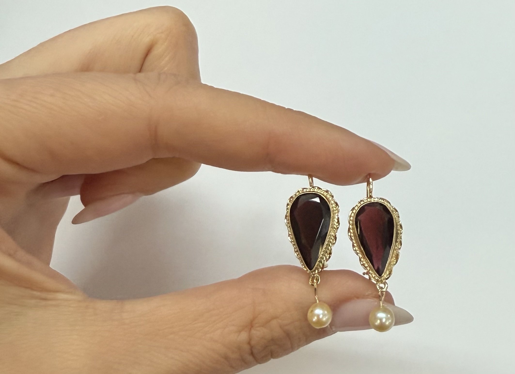 One-of-a-kind antique 14k yellow gold genuine pear shaped Garnet & 4.5 mm cultured pearl dangle earrings with engraved details and fish hook backs. These earrings have an entire weight of grams.