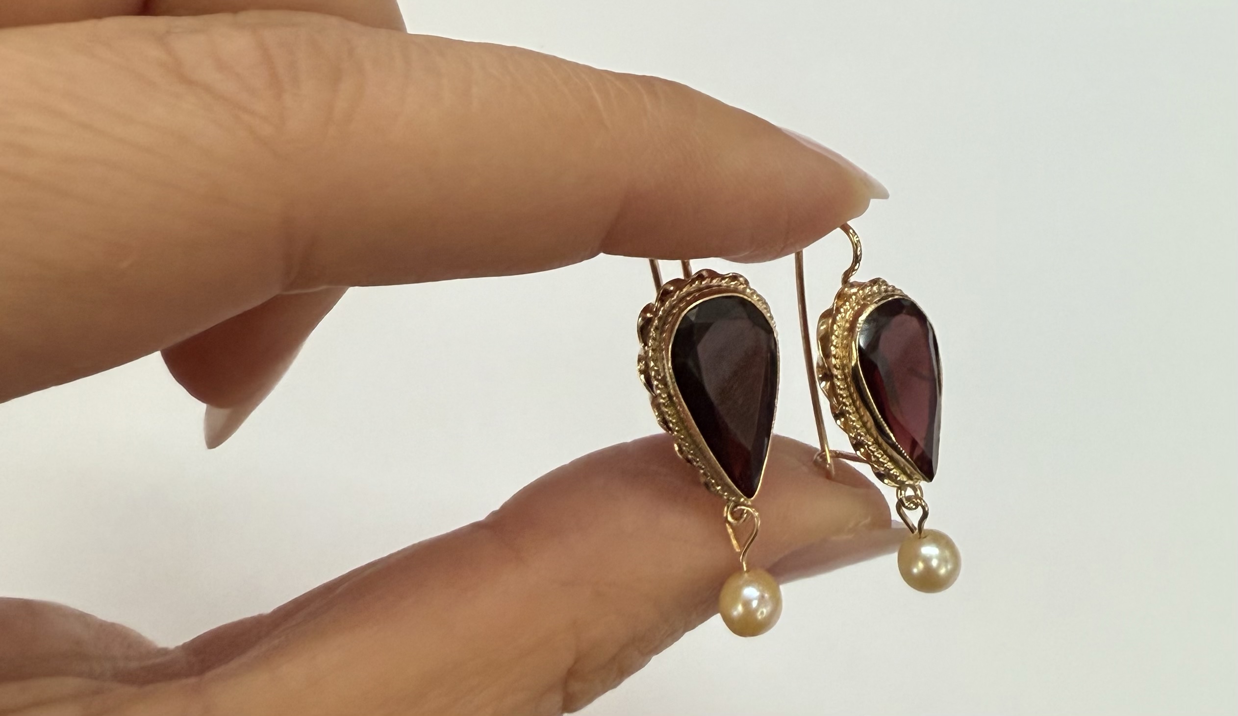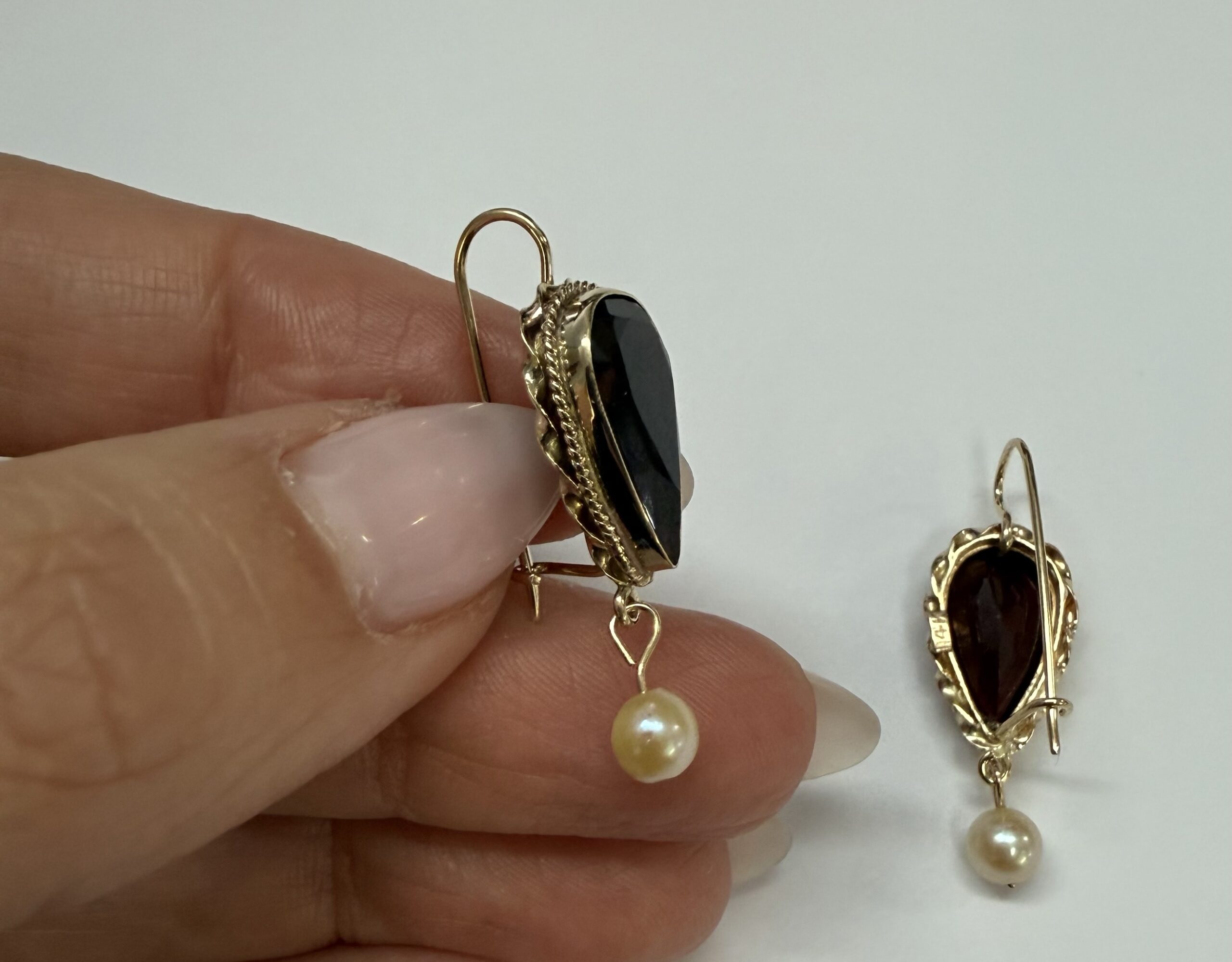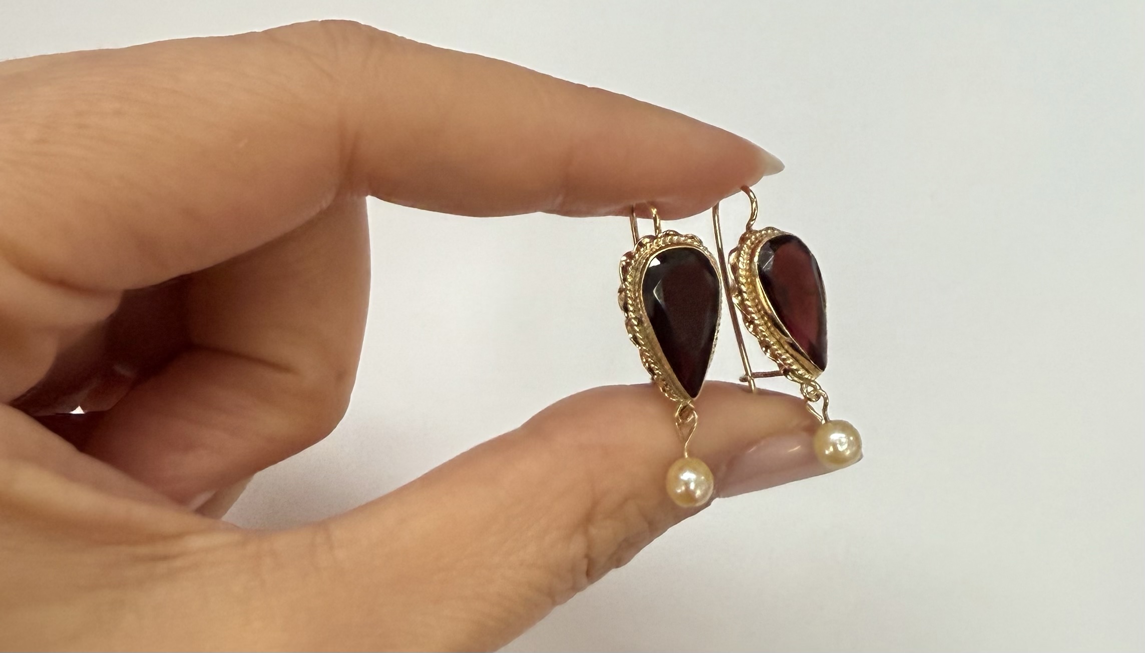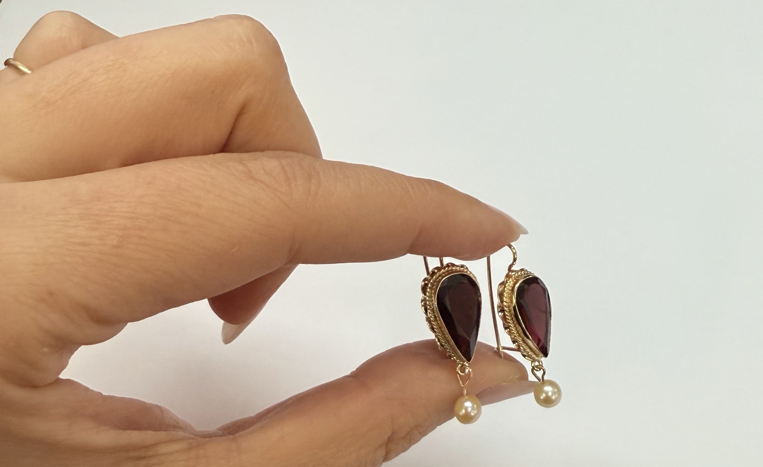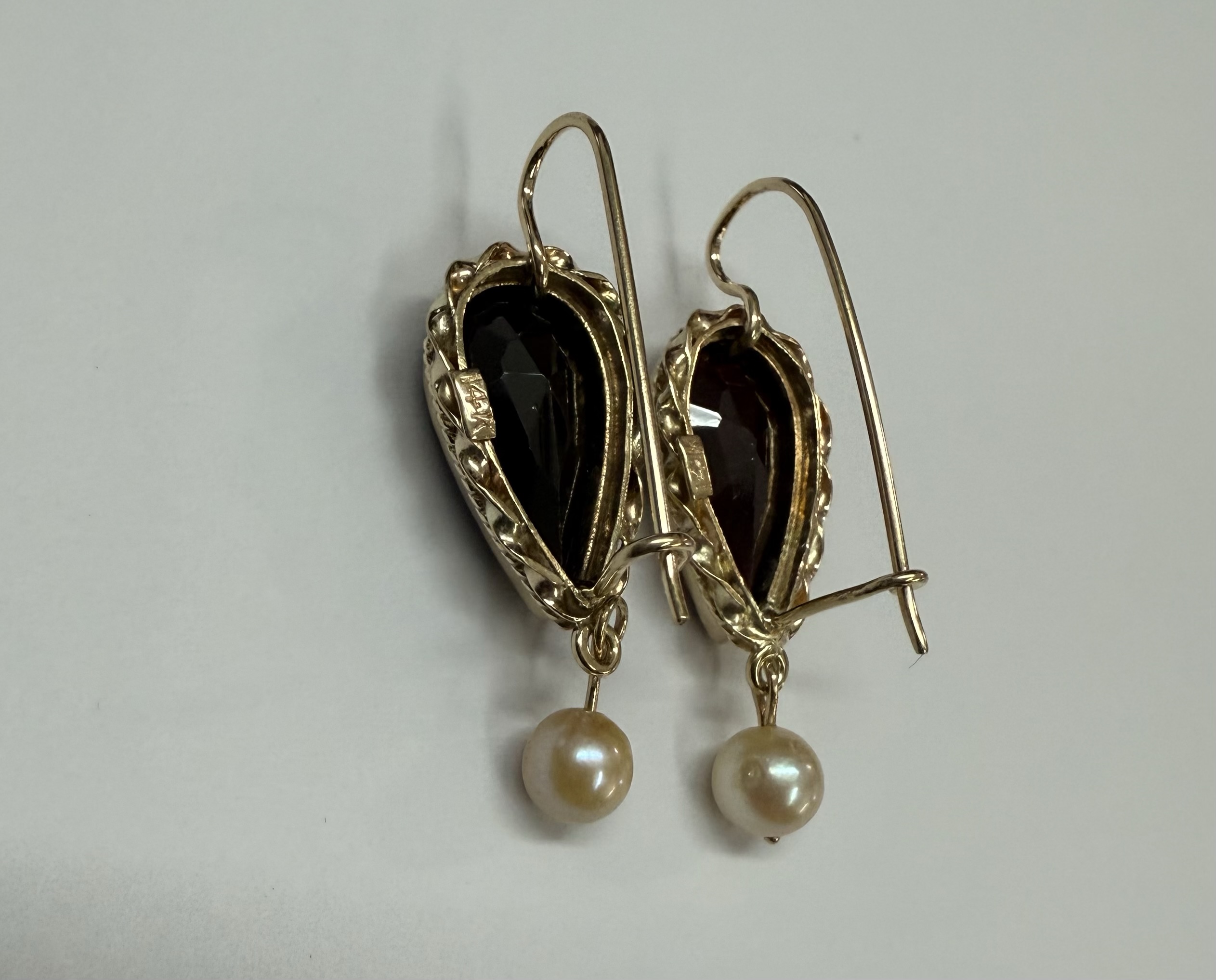 One-of-a-kind antique 14k yellow gold genuine pear shaped Garnet & 4.5 mm cultured pearl dangle earrings with engraved details and fish hook backs. These earrings have an entire weight of grams.
