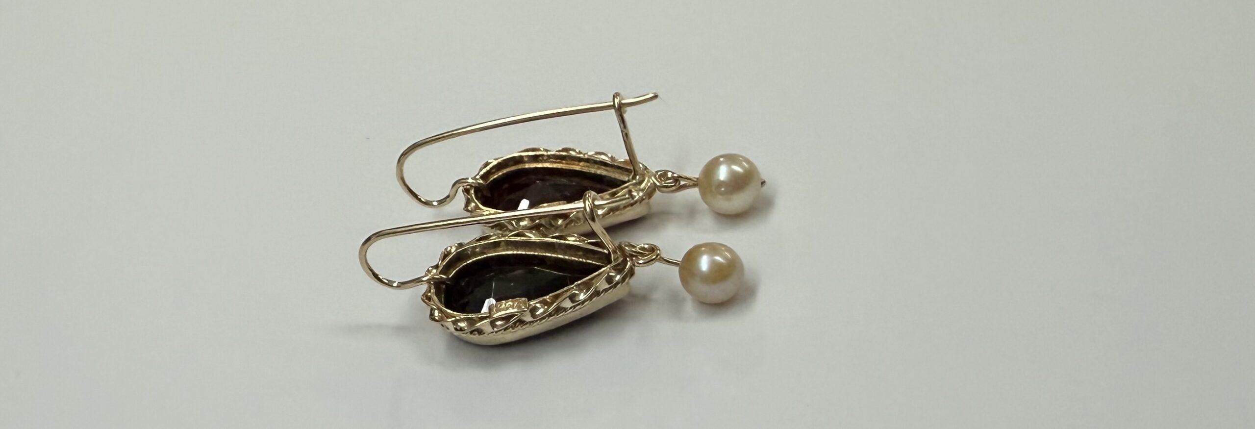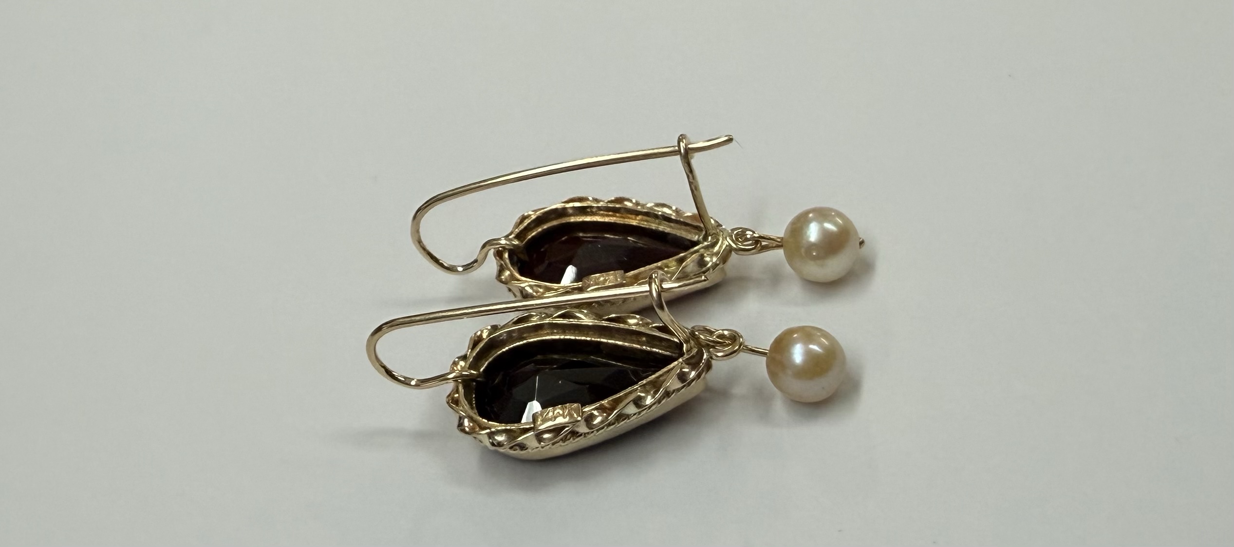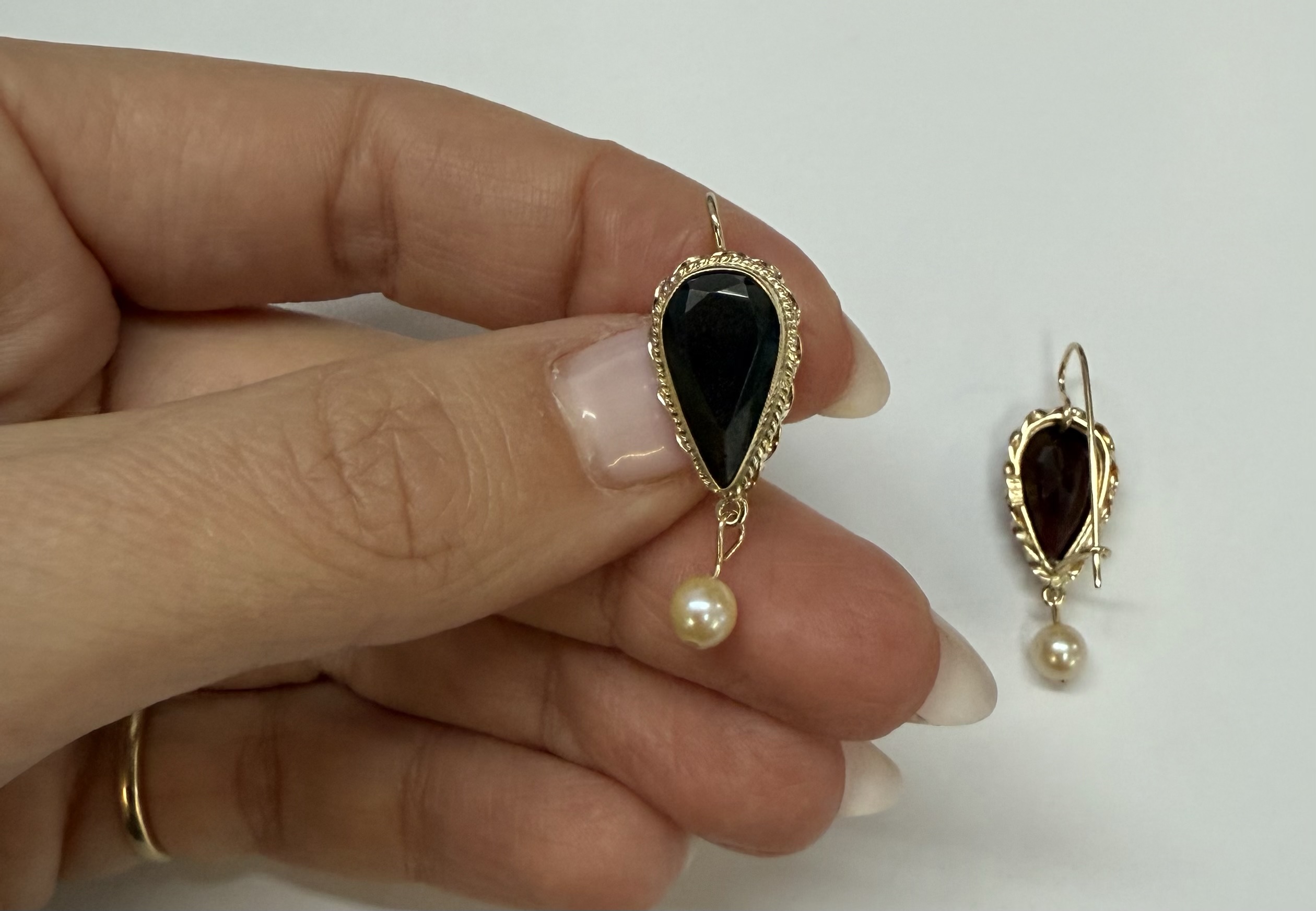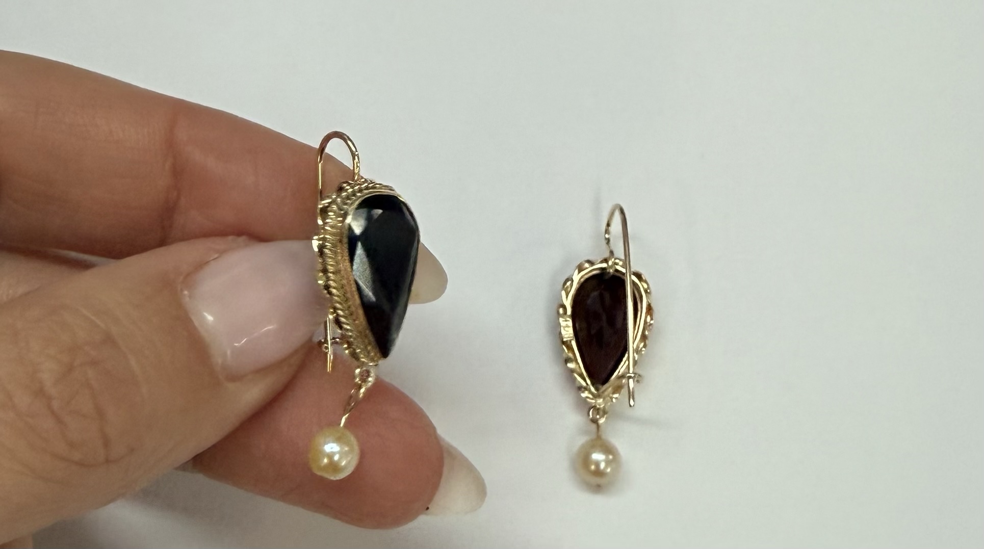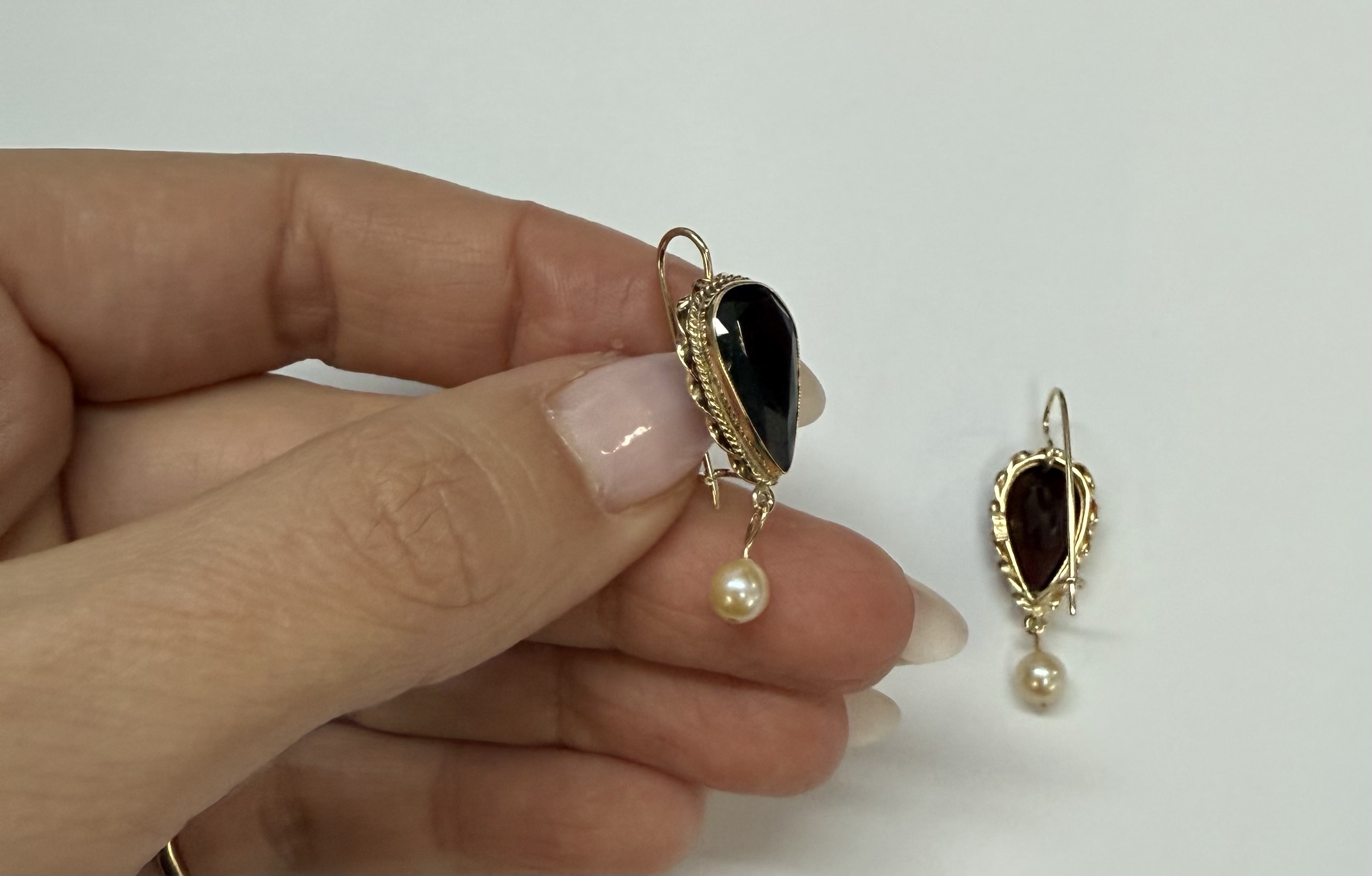 One-of-a-kind antique 14k yellow gold genuine pear shaped Garnet & 4.5 mm cultured pearl dangle earrings with engraved details and fish hook backs. These earrings have an entire weight of grams.