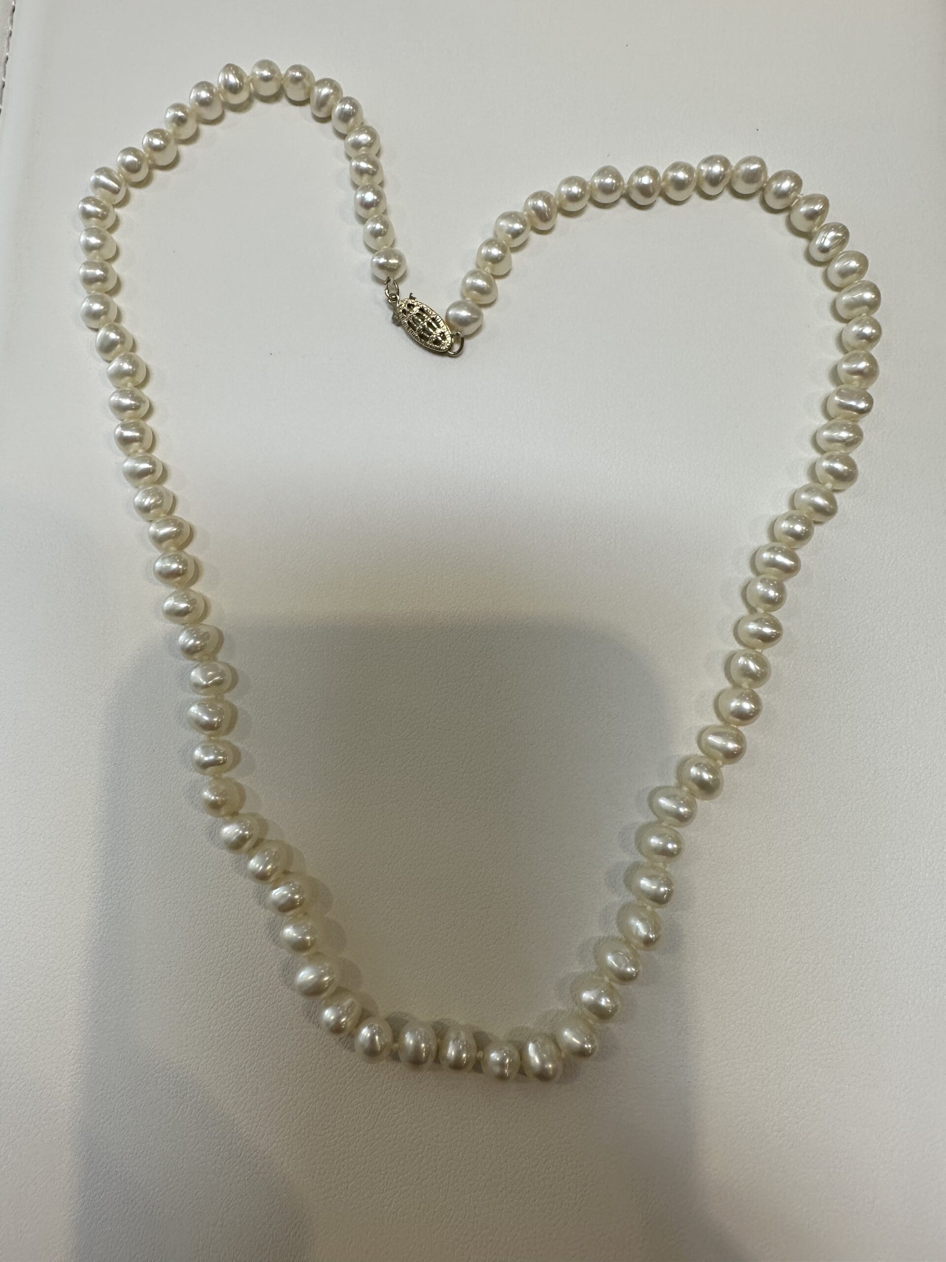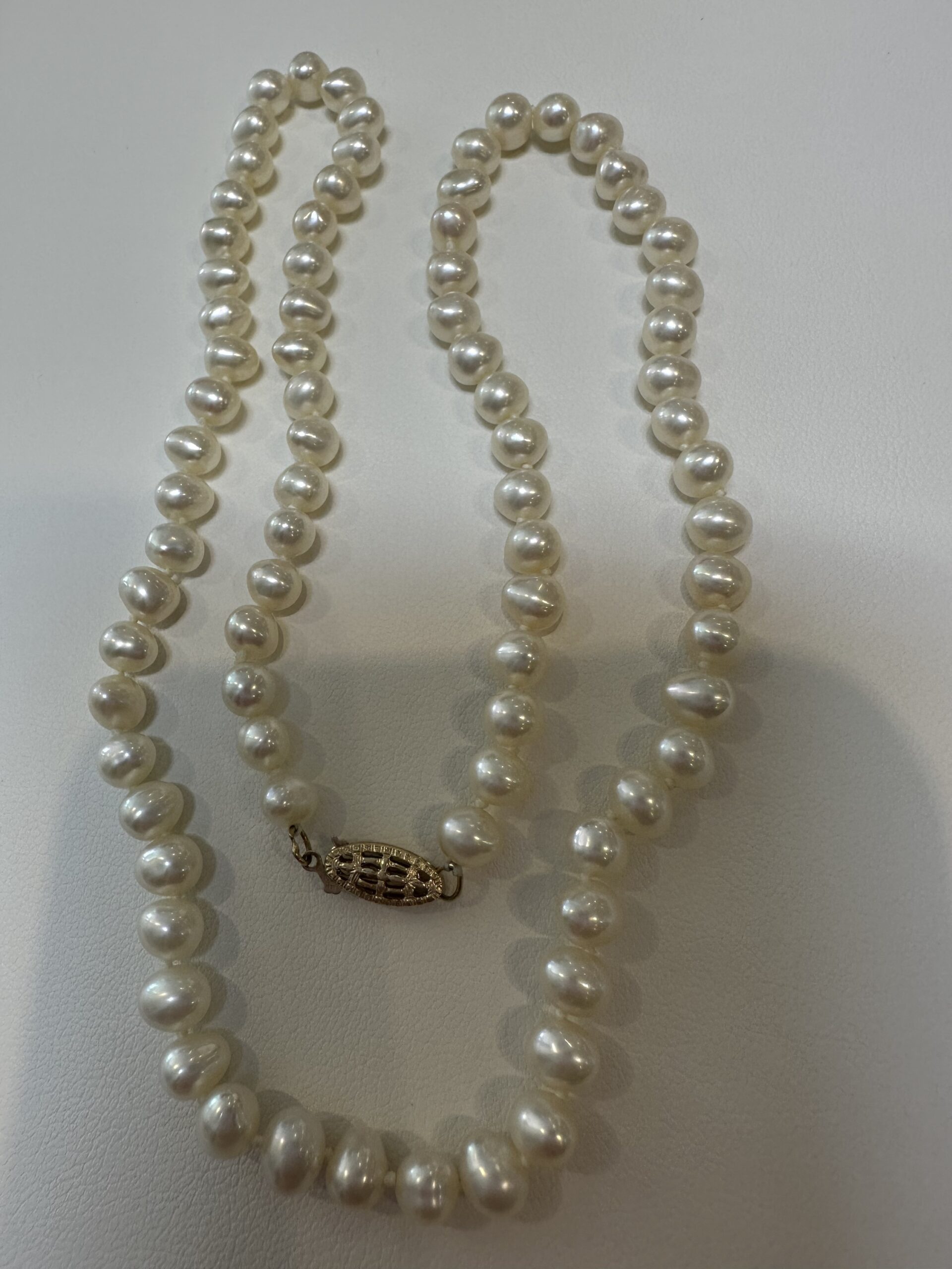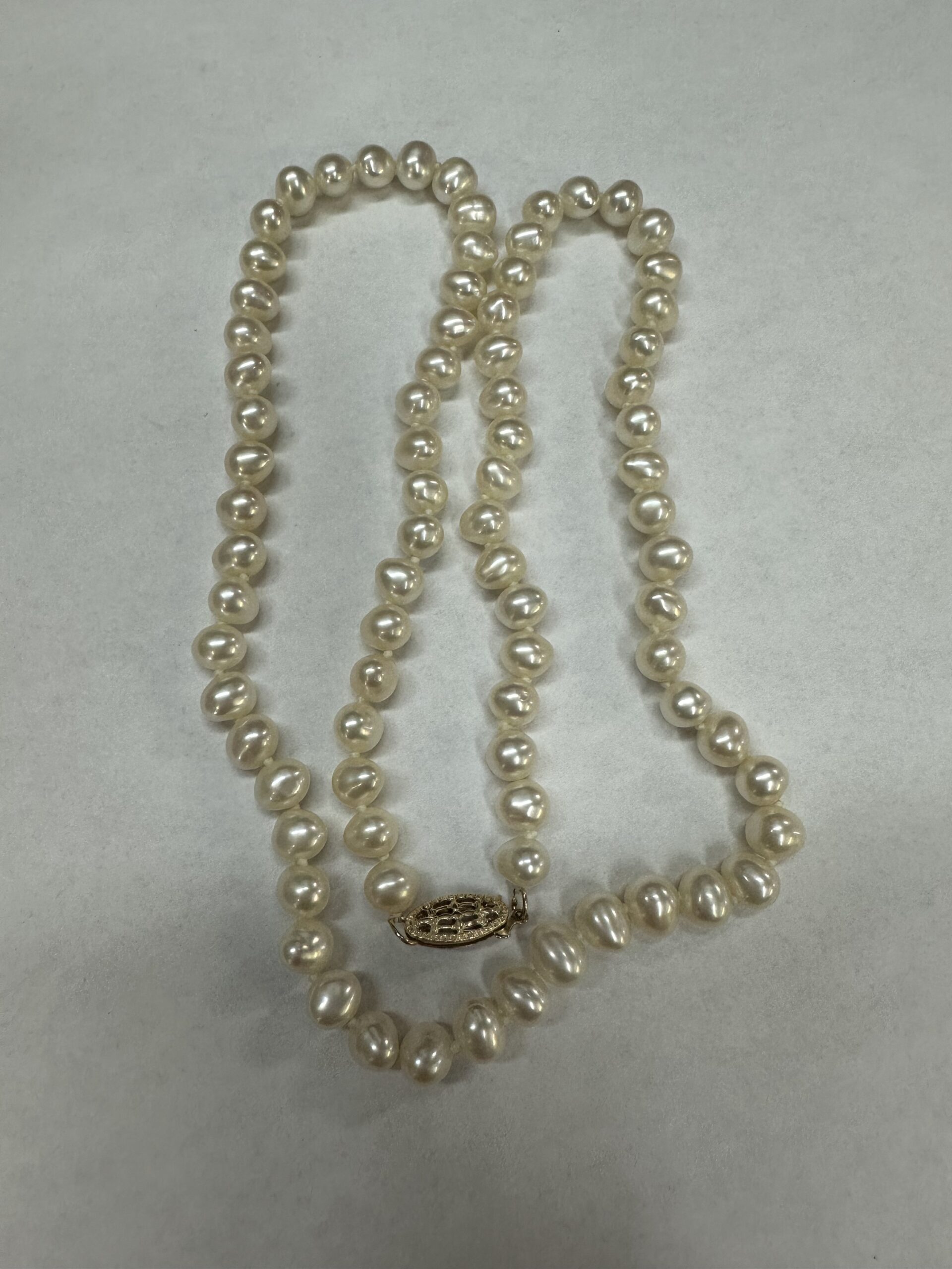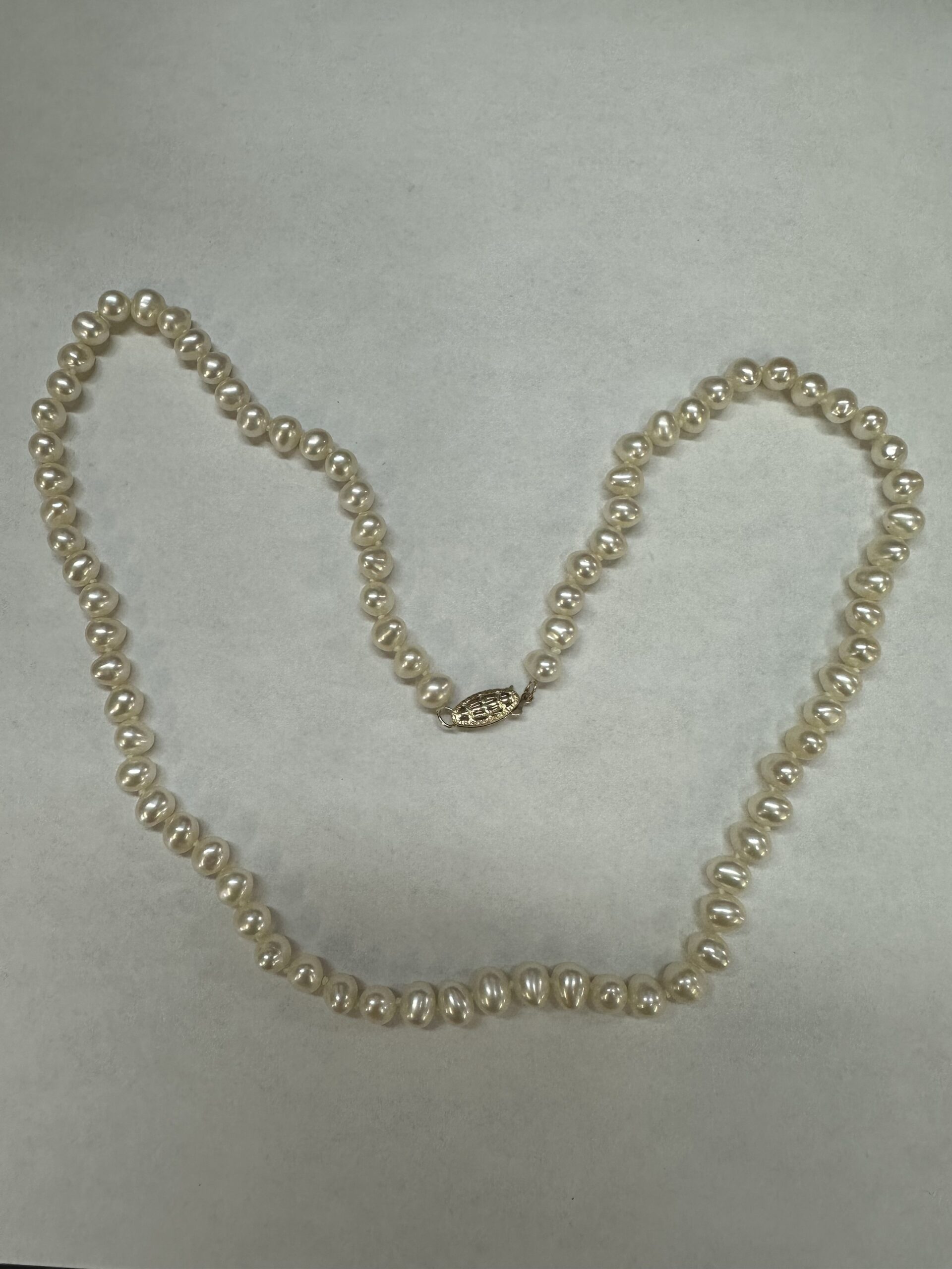 81 pearl 6 mm freshwater Pearl knotted strand with 14k yellow gold filigree pearl clasp, 17 3/4”, 17.1 grams.