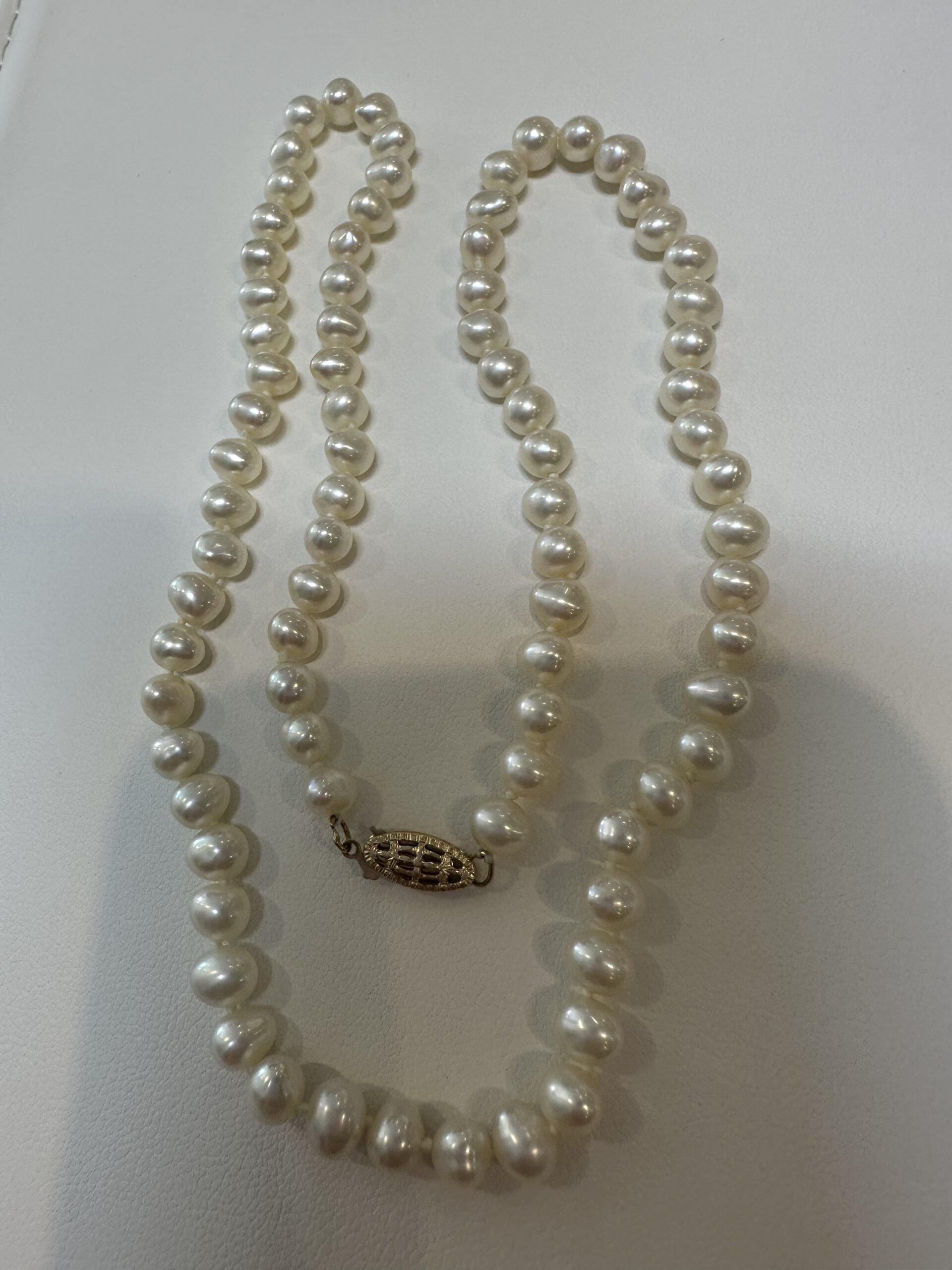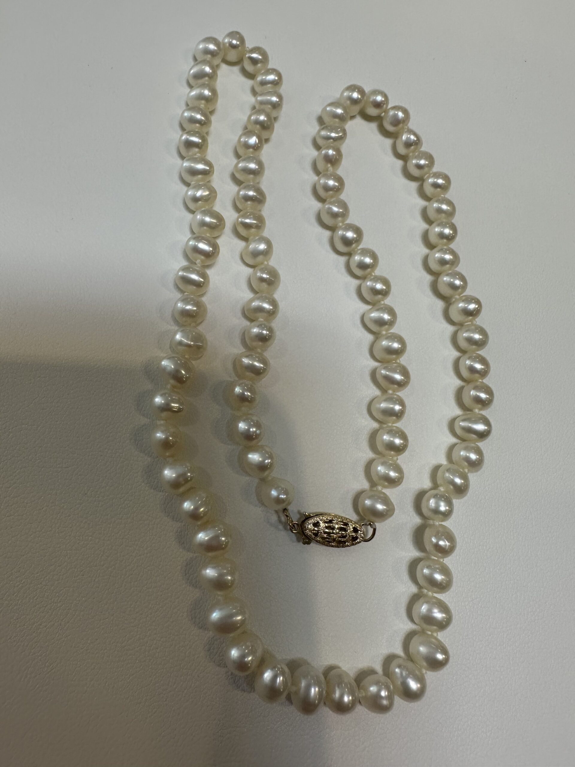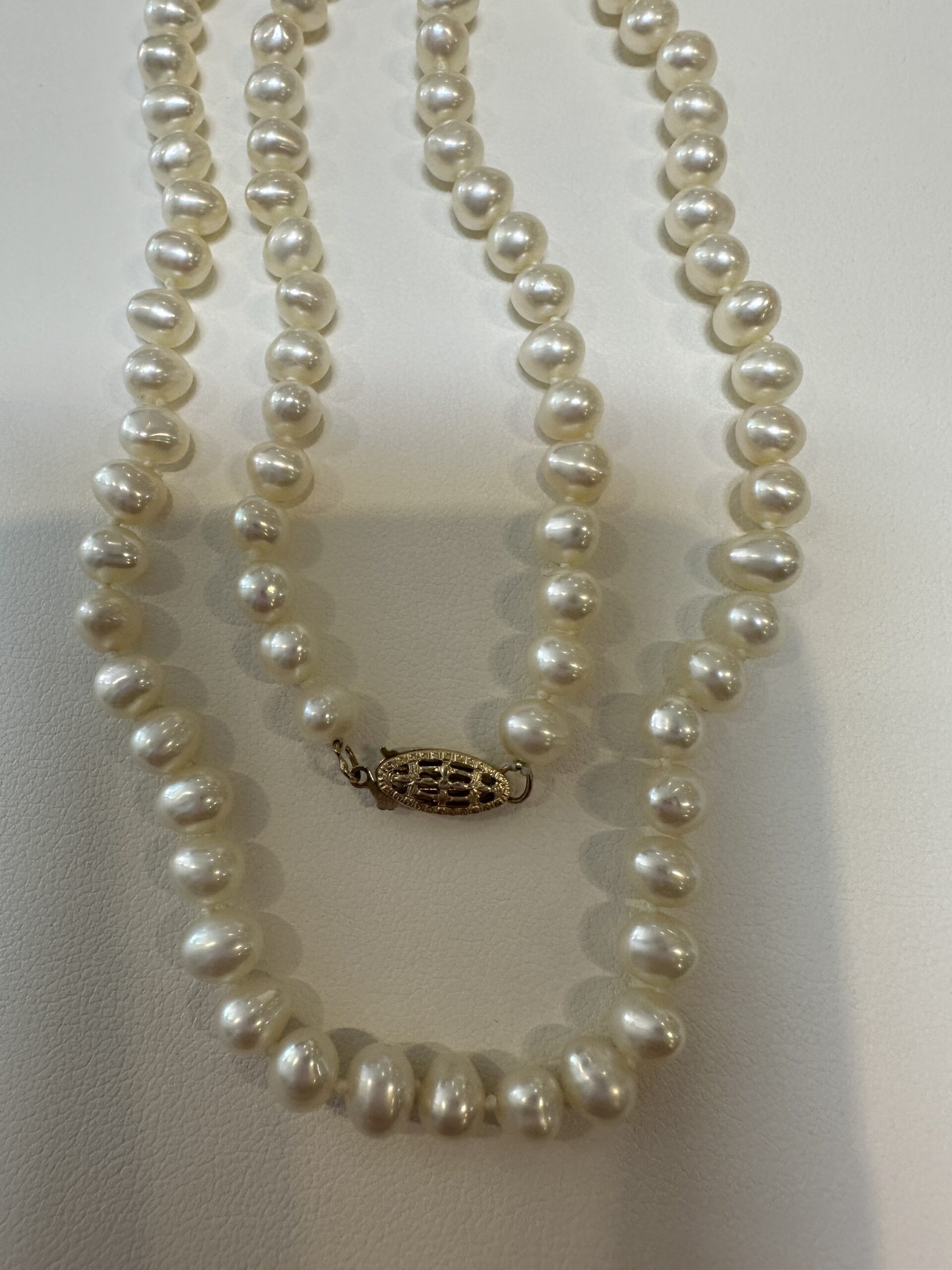 81 pearl 6 mm freshwater Pearl knotted strand with 14k yellow gold filigree pearl clasp, 17 3/4”, 17.1 grams.