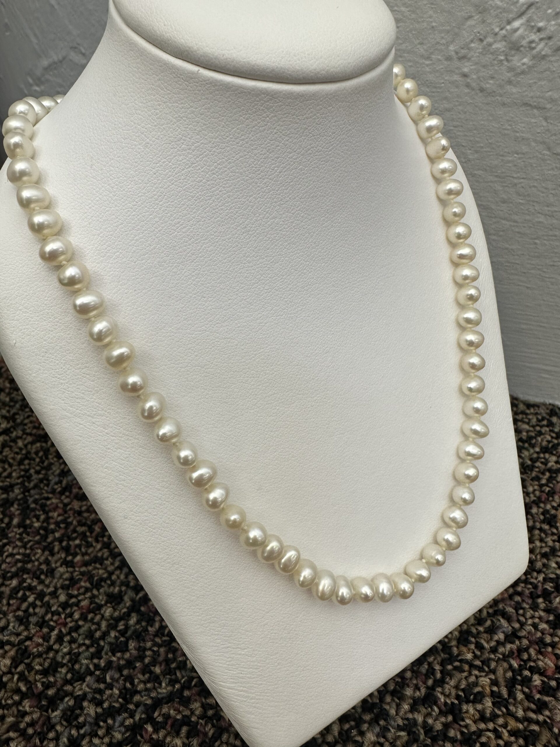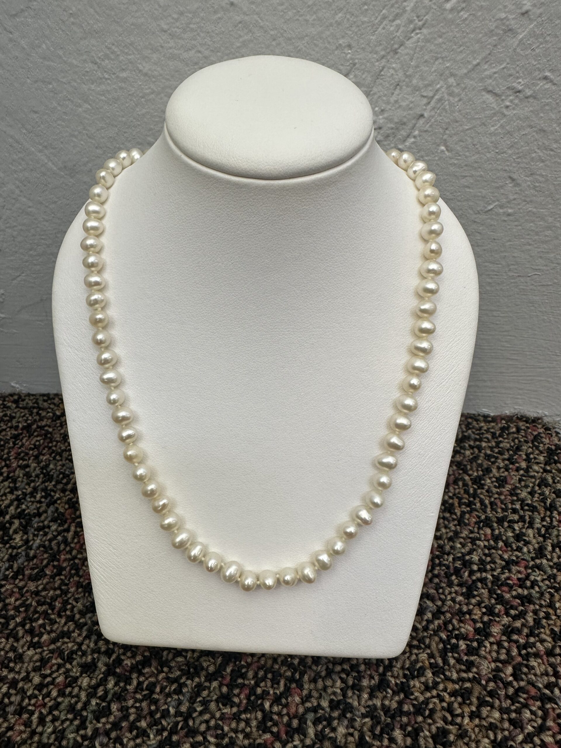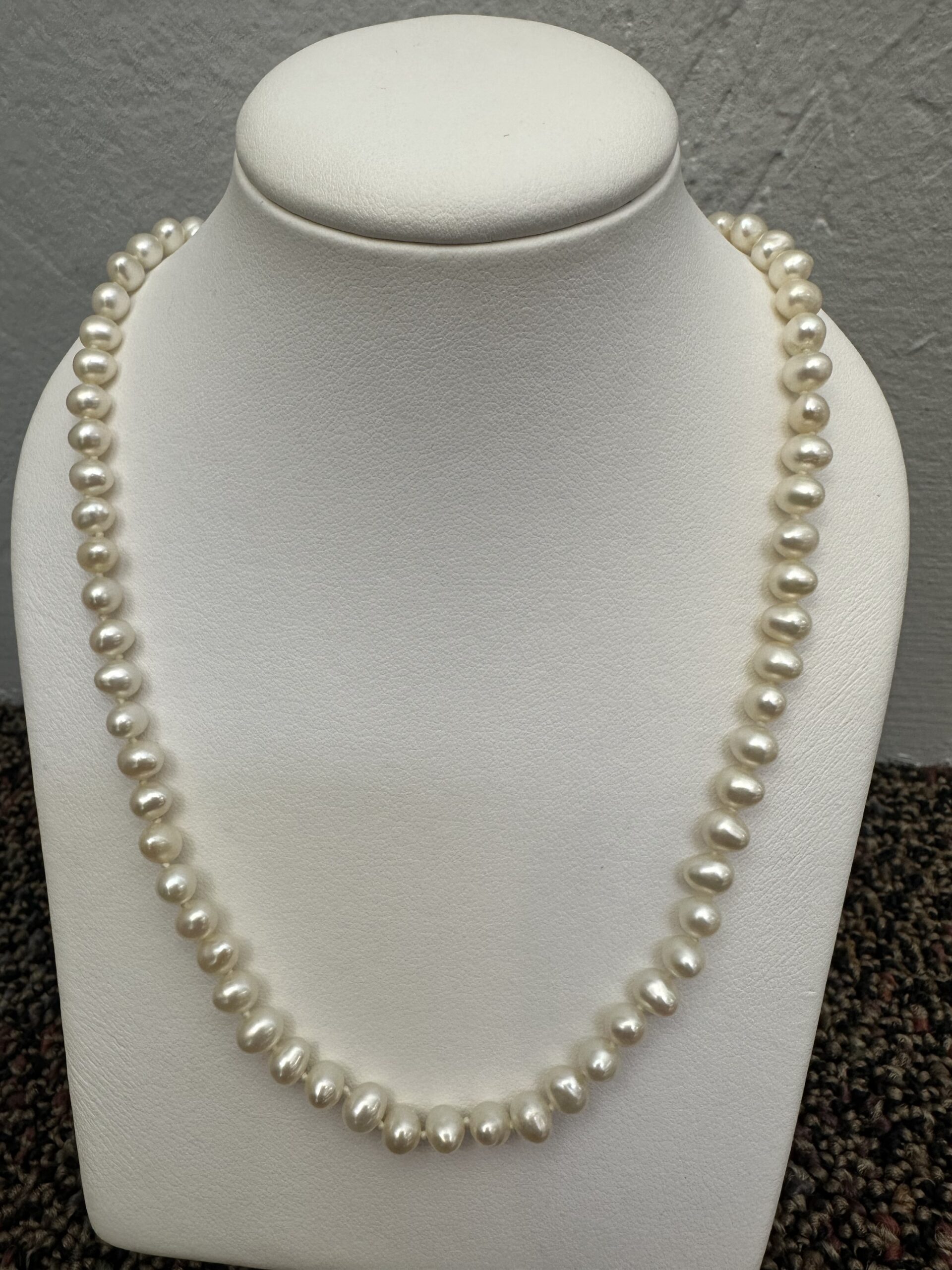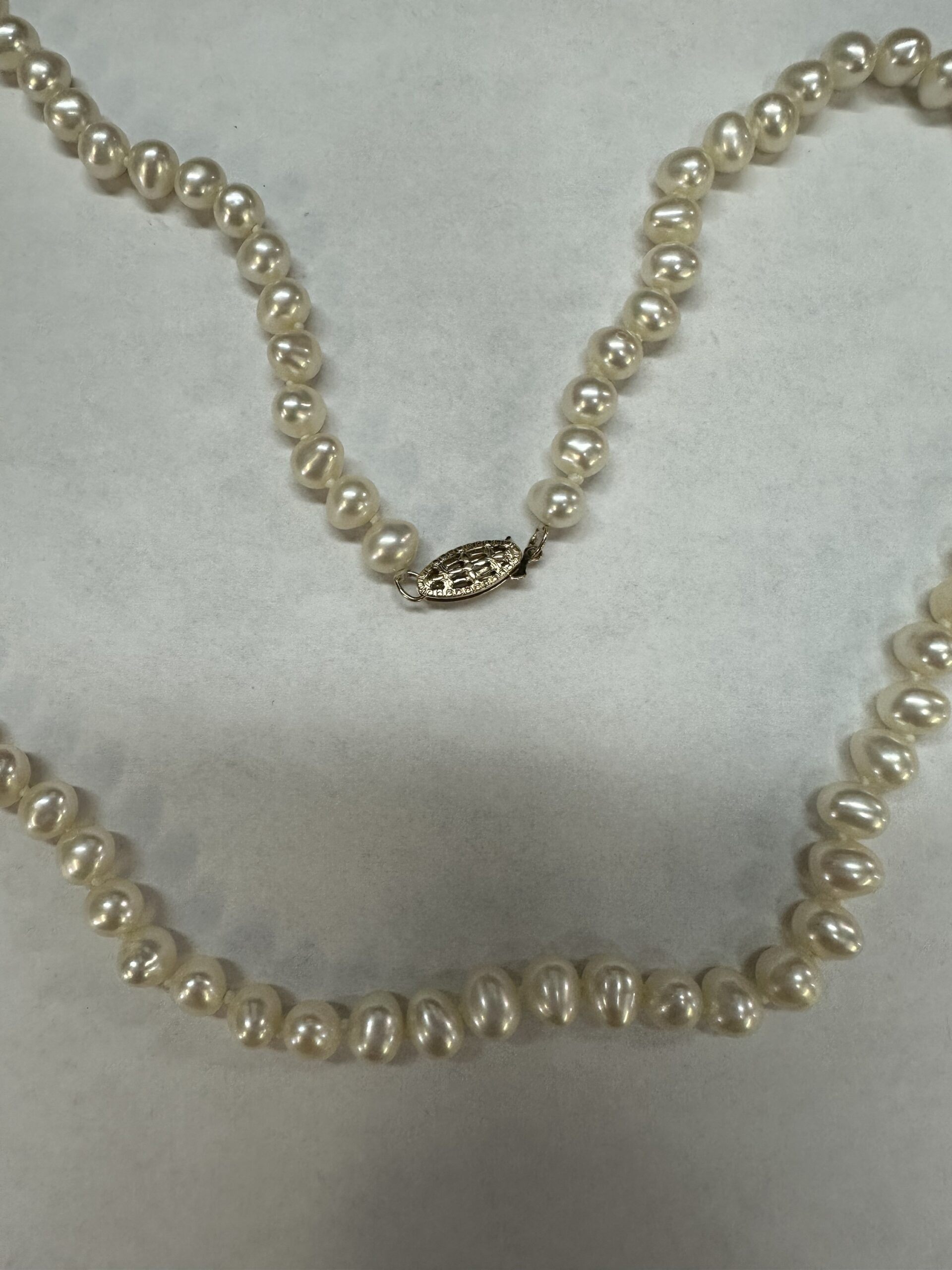 81 pearl 6 mm freshwater Pearl knotted strand with 14k yellow gold filigree pearl clasp, 17 3/4”, 17.1 grams.