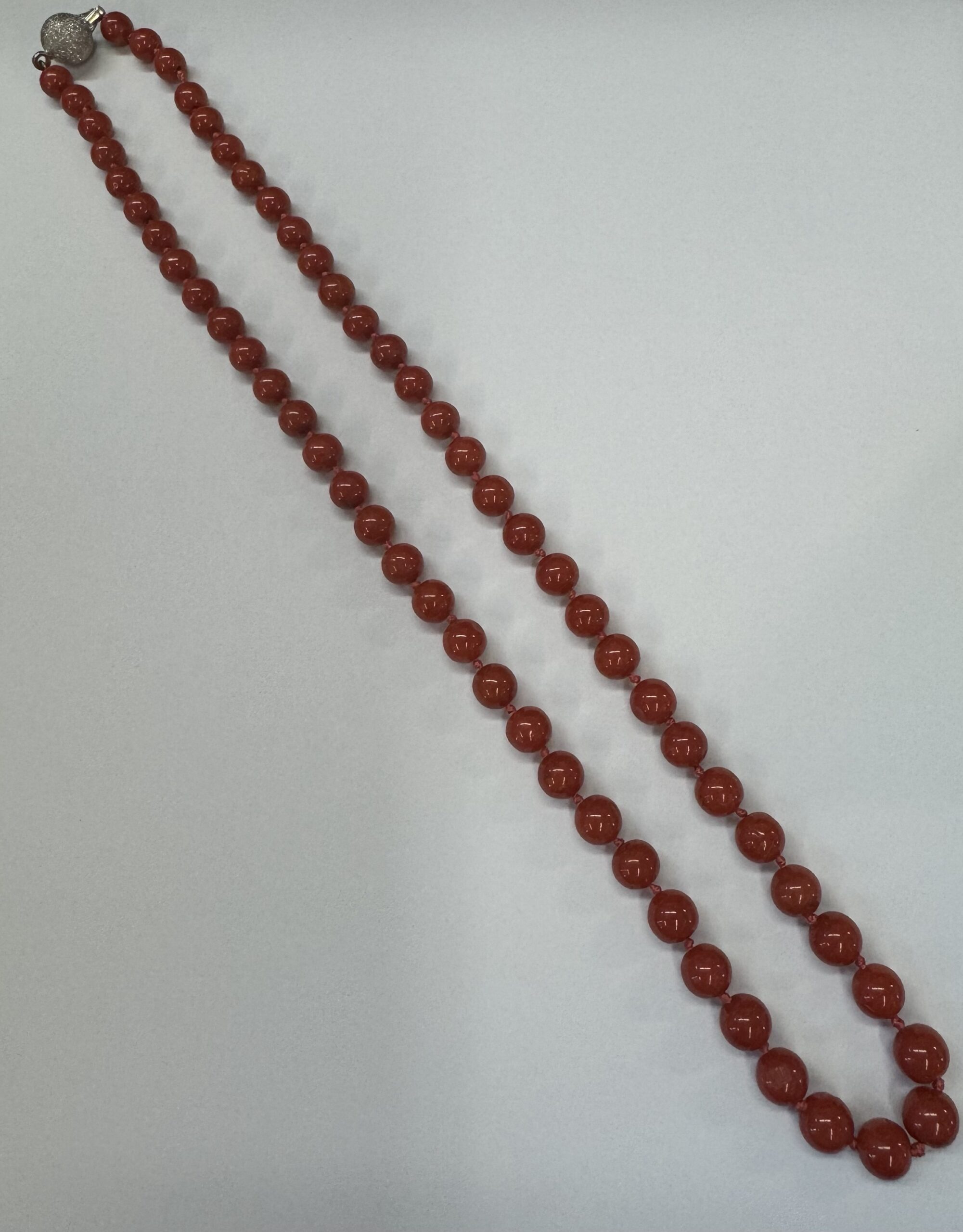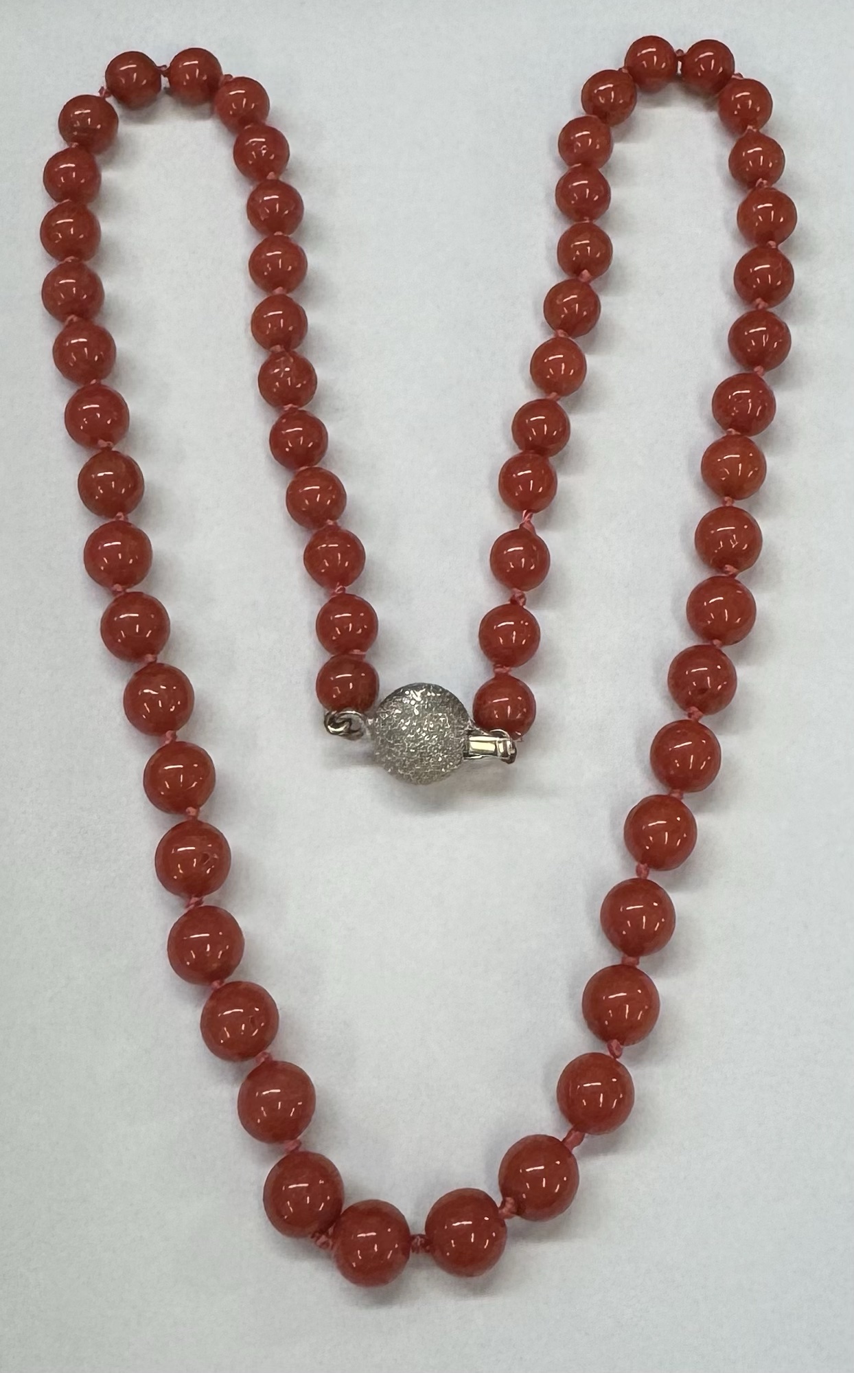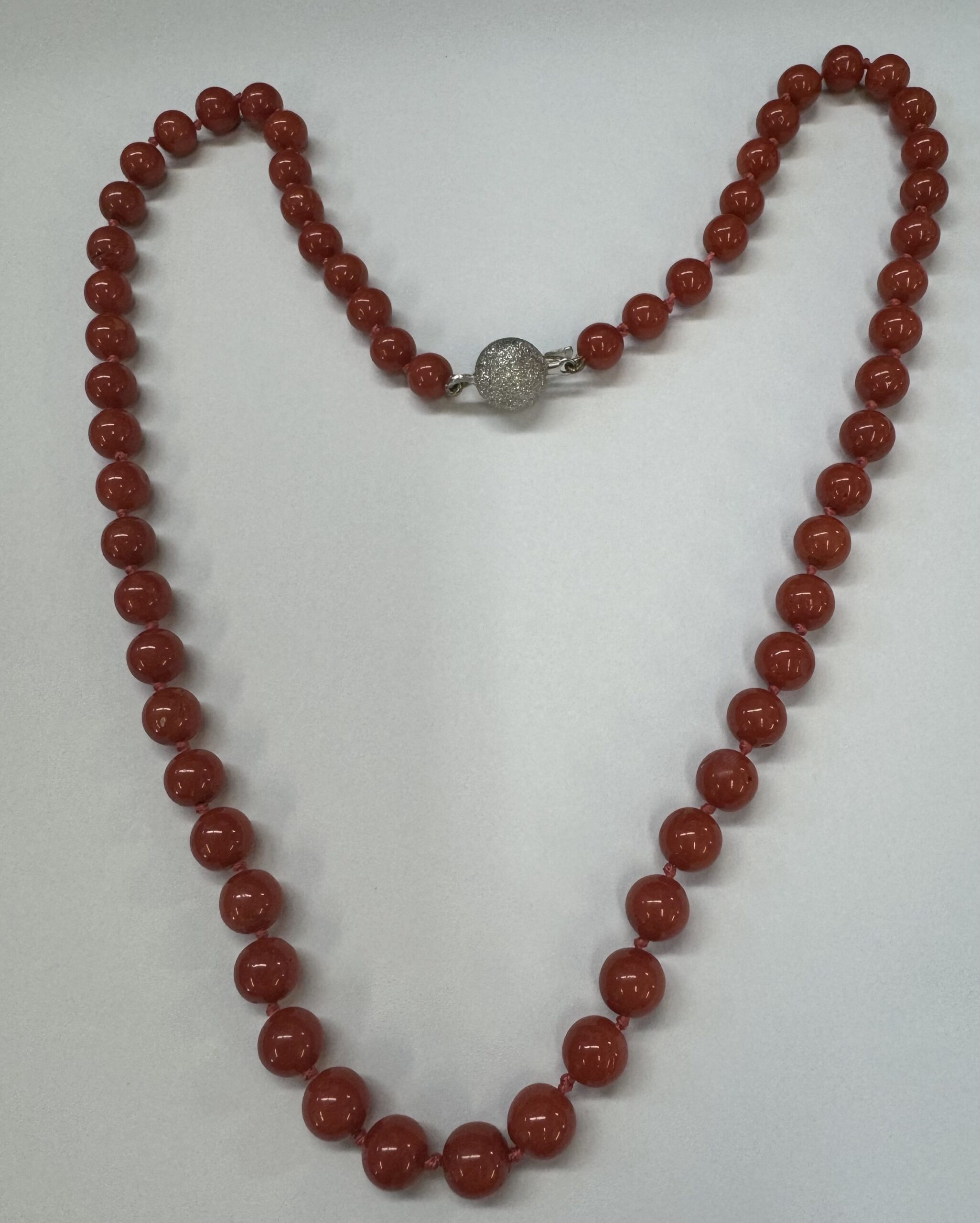 A knotted 20″ strand of 7 mm Coral beads, terminated by an 18k white gold 8 mm diamanté finish ball clasp. This piece was imported directly from Italy.