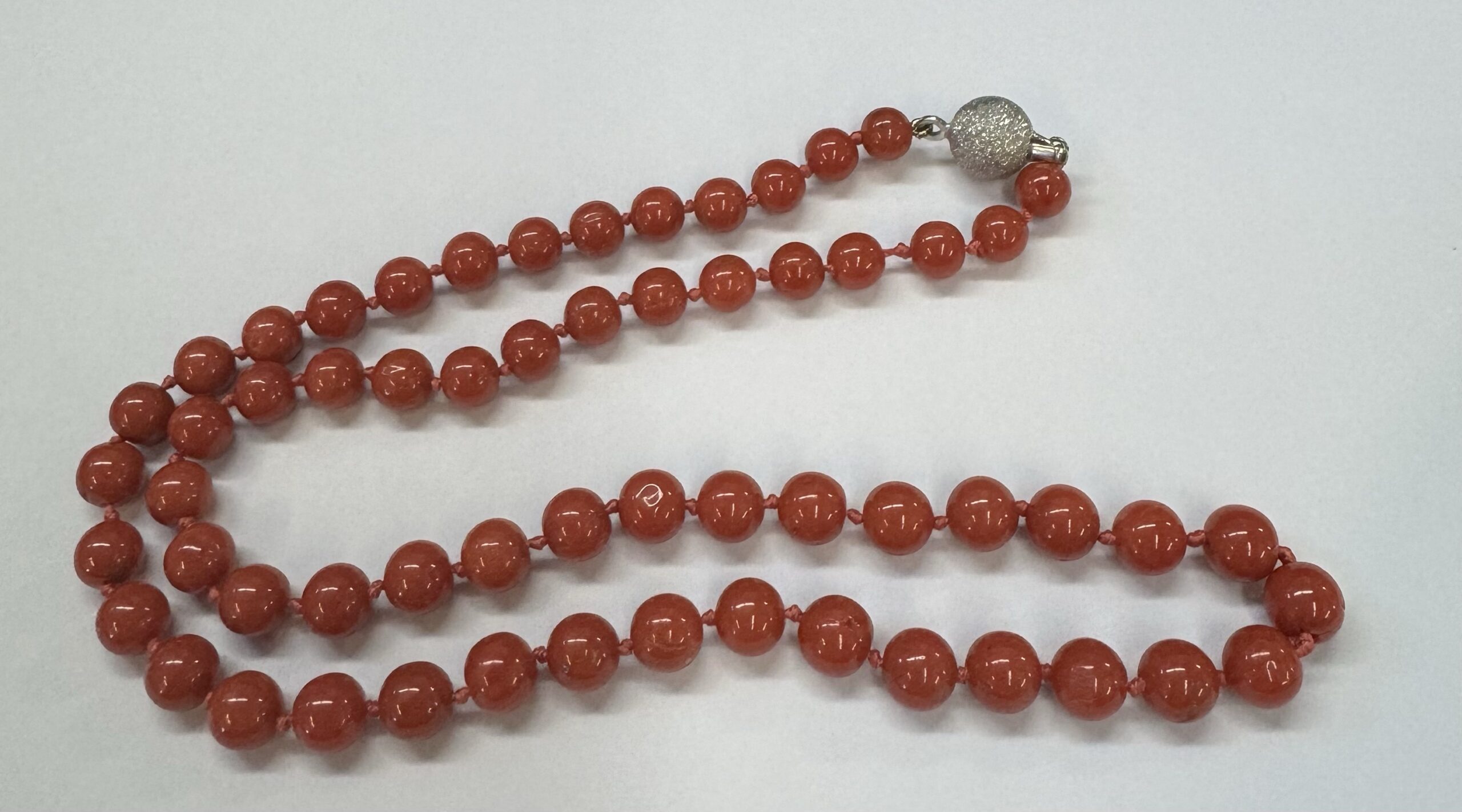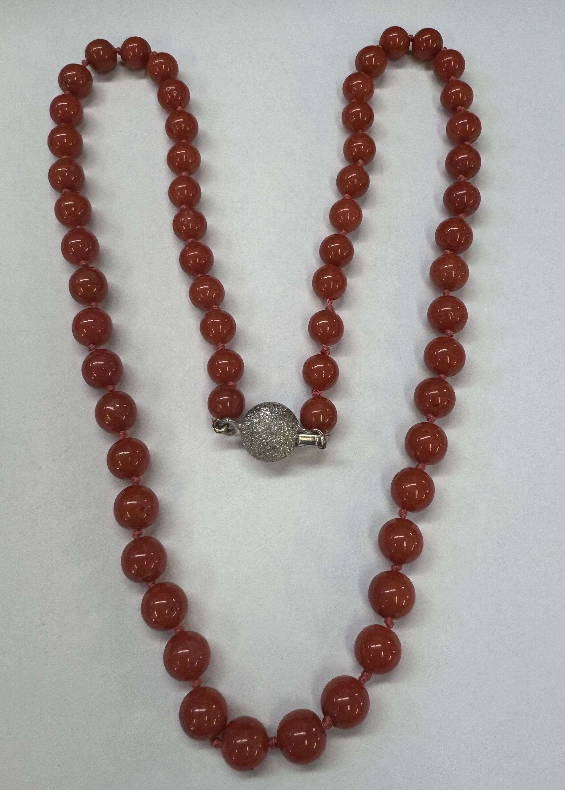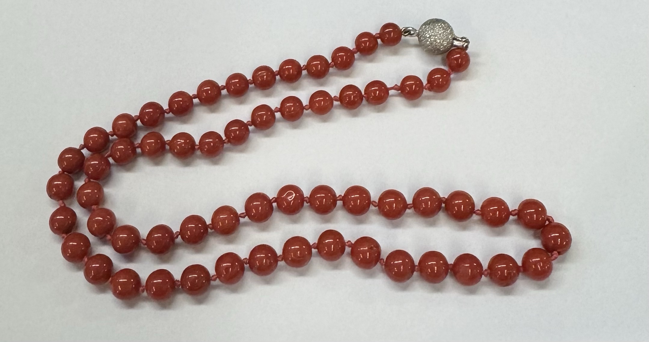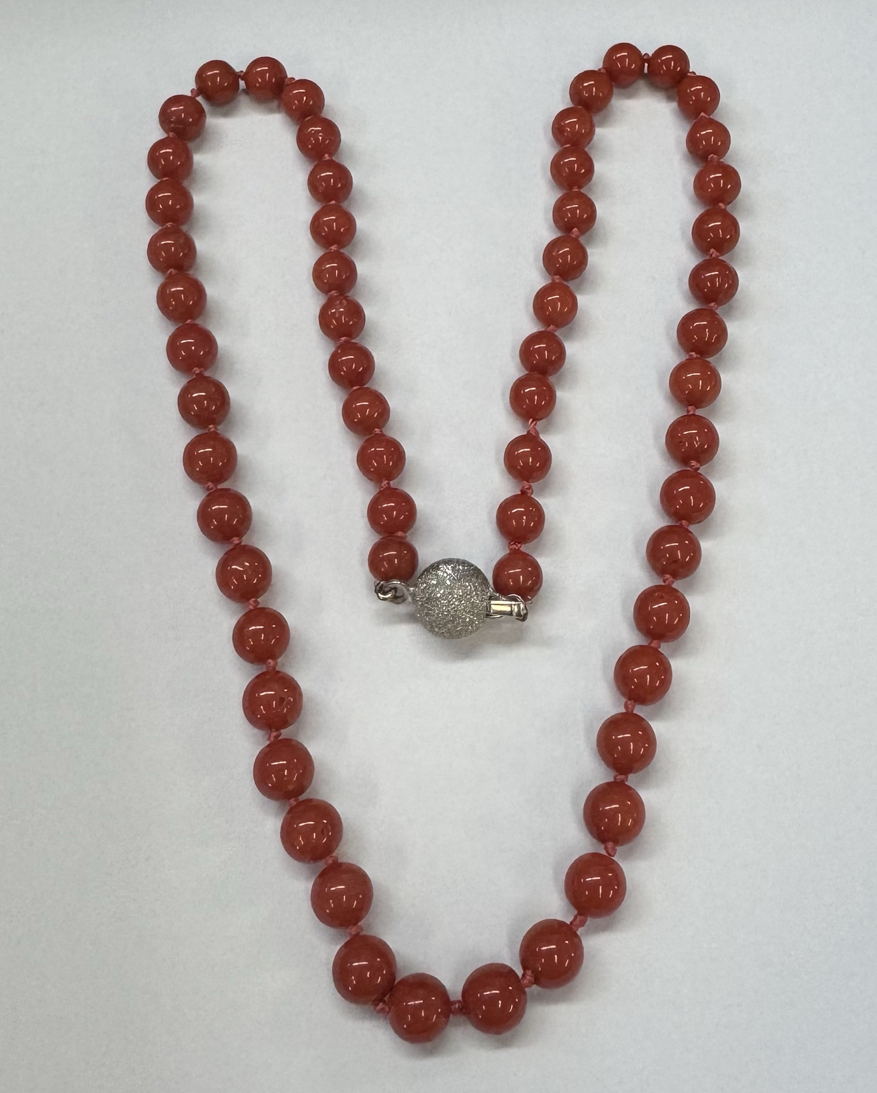 A knotted 20″ strand of 7 mm Coral beads, terminated by an 18k white gold 8 mm diamanté finish ball clasp. This piece was imported directly from Italy.