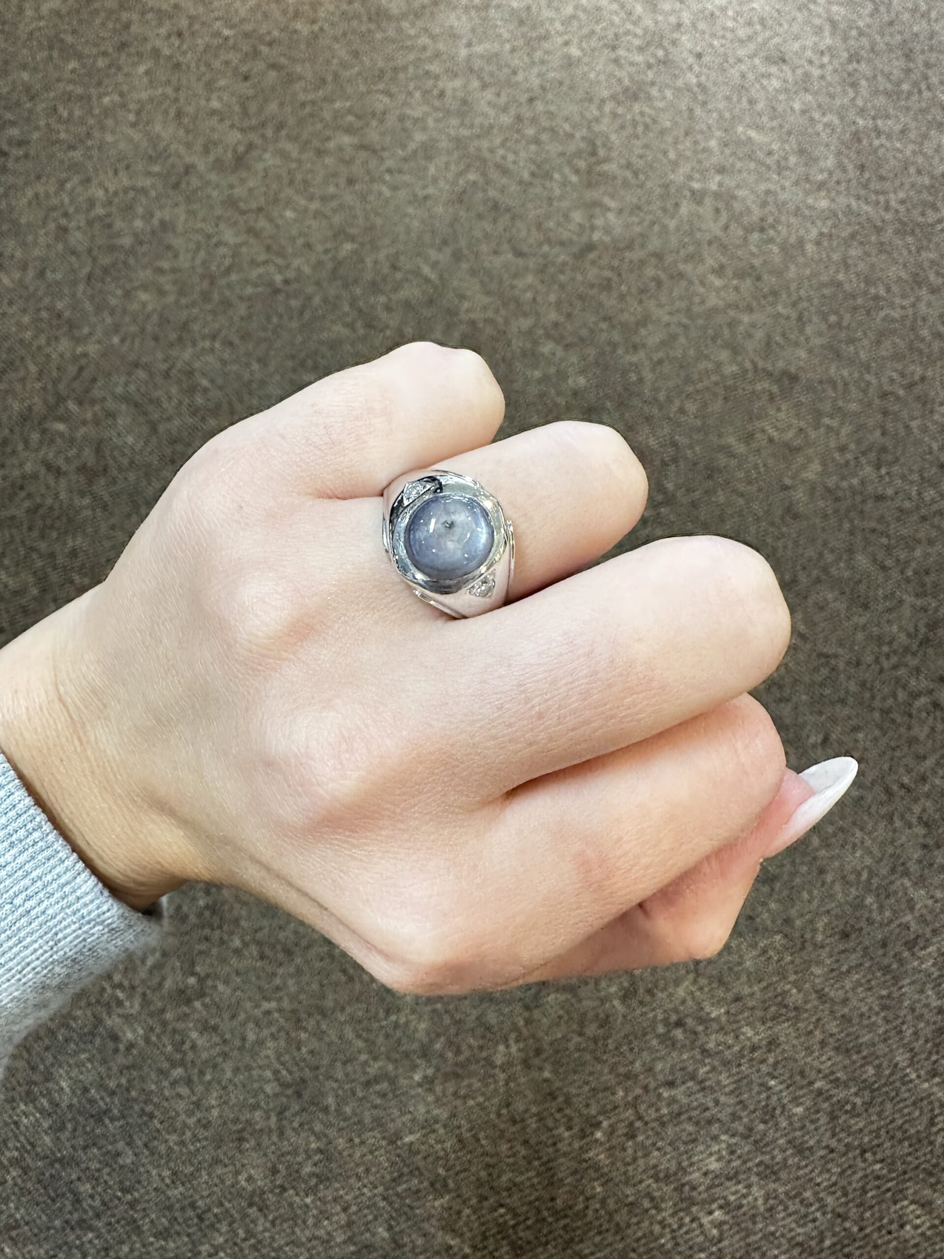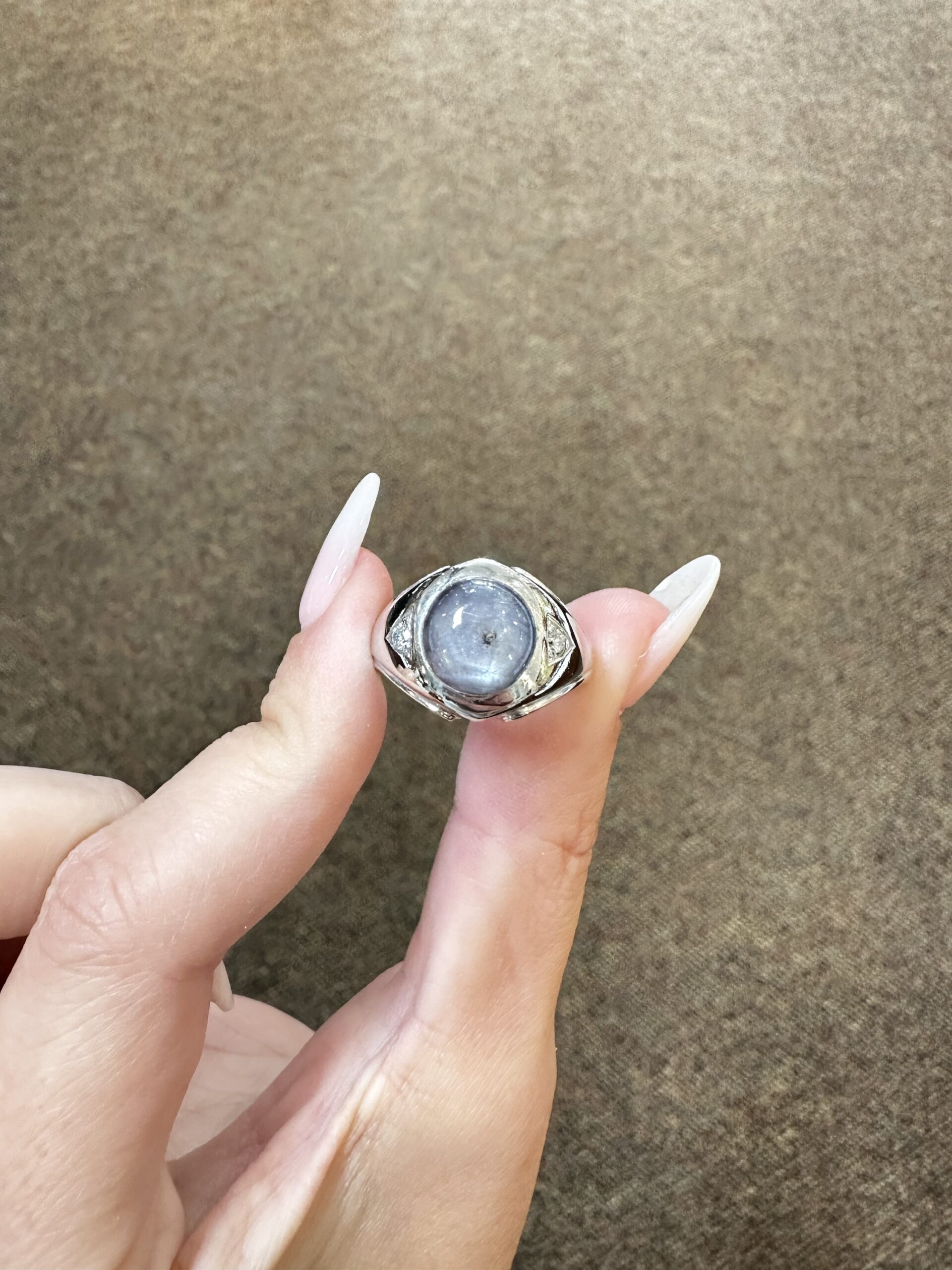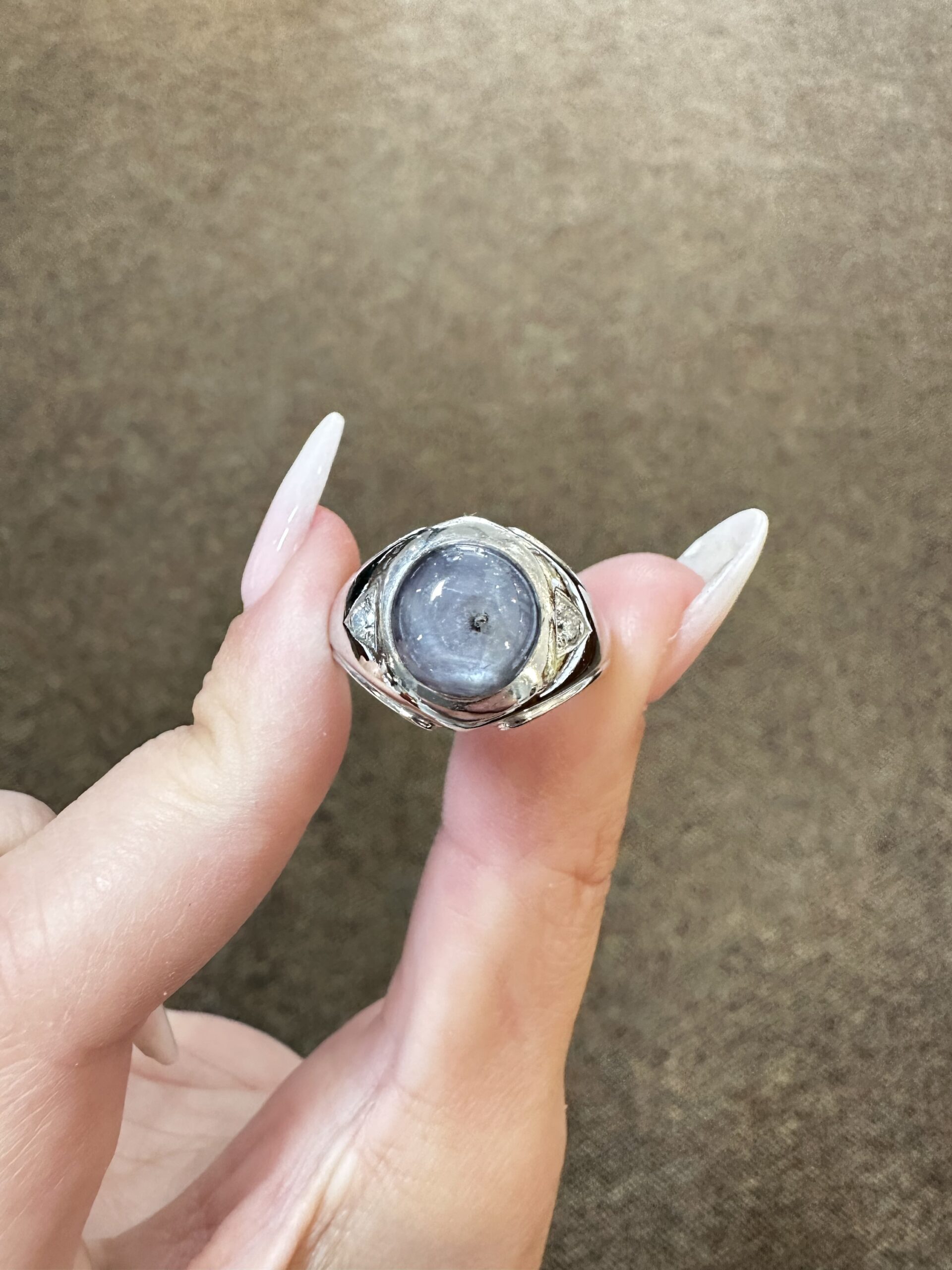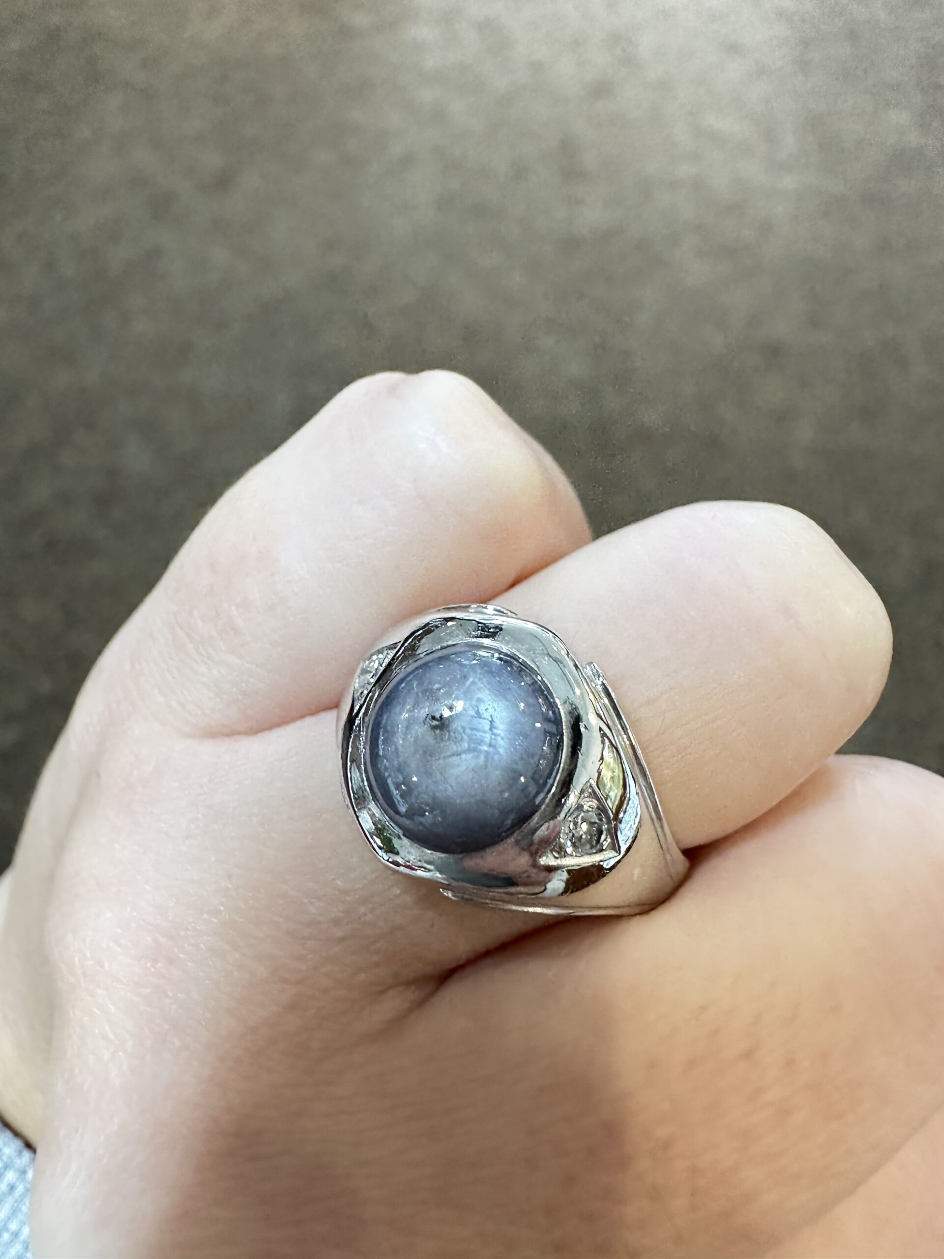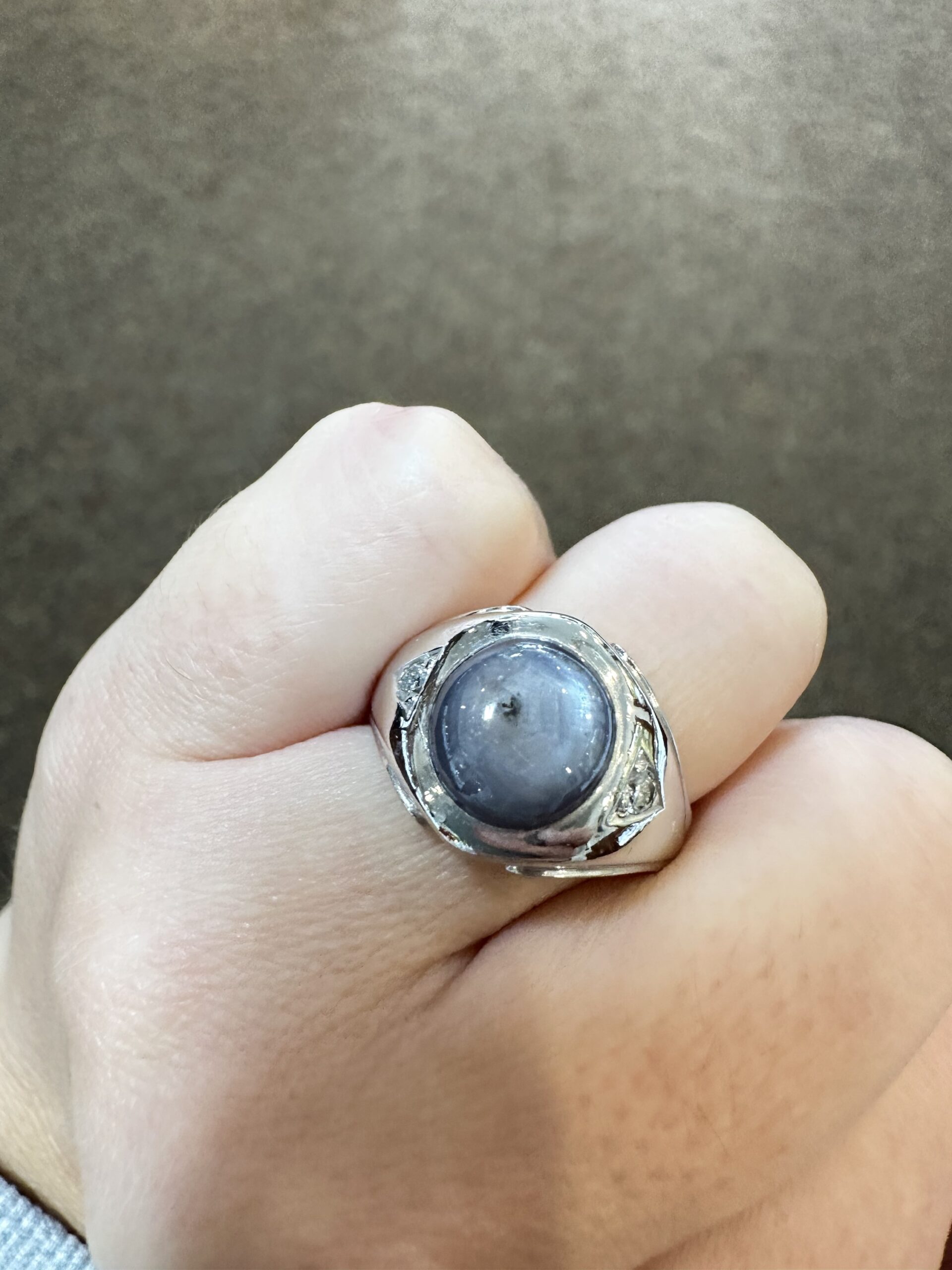 A gent’s vintage 14k white gold genuine Natural Grat Star Sapphire which is round, cabochon cut, and partial bezel set. This Sapphire measures 10 mm in size, and it is accented by 2 genuine Round Brilliant Cut diamonds which are burnished set to either side of the major gemstone, and which have a total combined weight of .10/100-ct. These diamonds average G-H in color and SI1 in clarity. This ring is a finger size 10, but it can be reasonably sized. Please make note of the finger size desired in the comments section at checkout. This ring has an entire weight of 10.69 grams. The top of this ring measures 14 mm in width, tapering to 3 mm at the base of the shank.