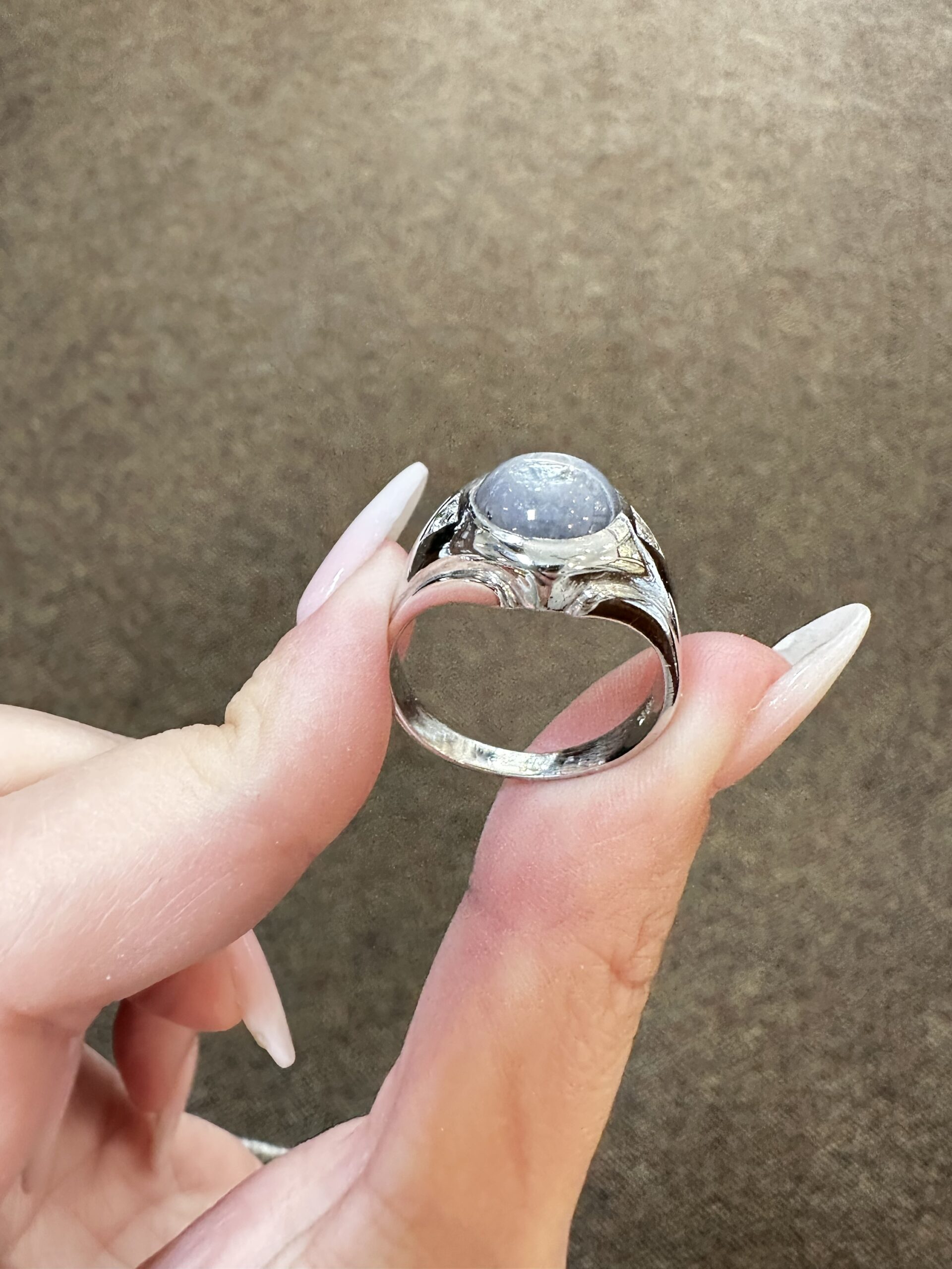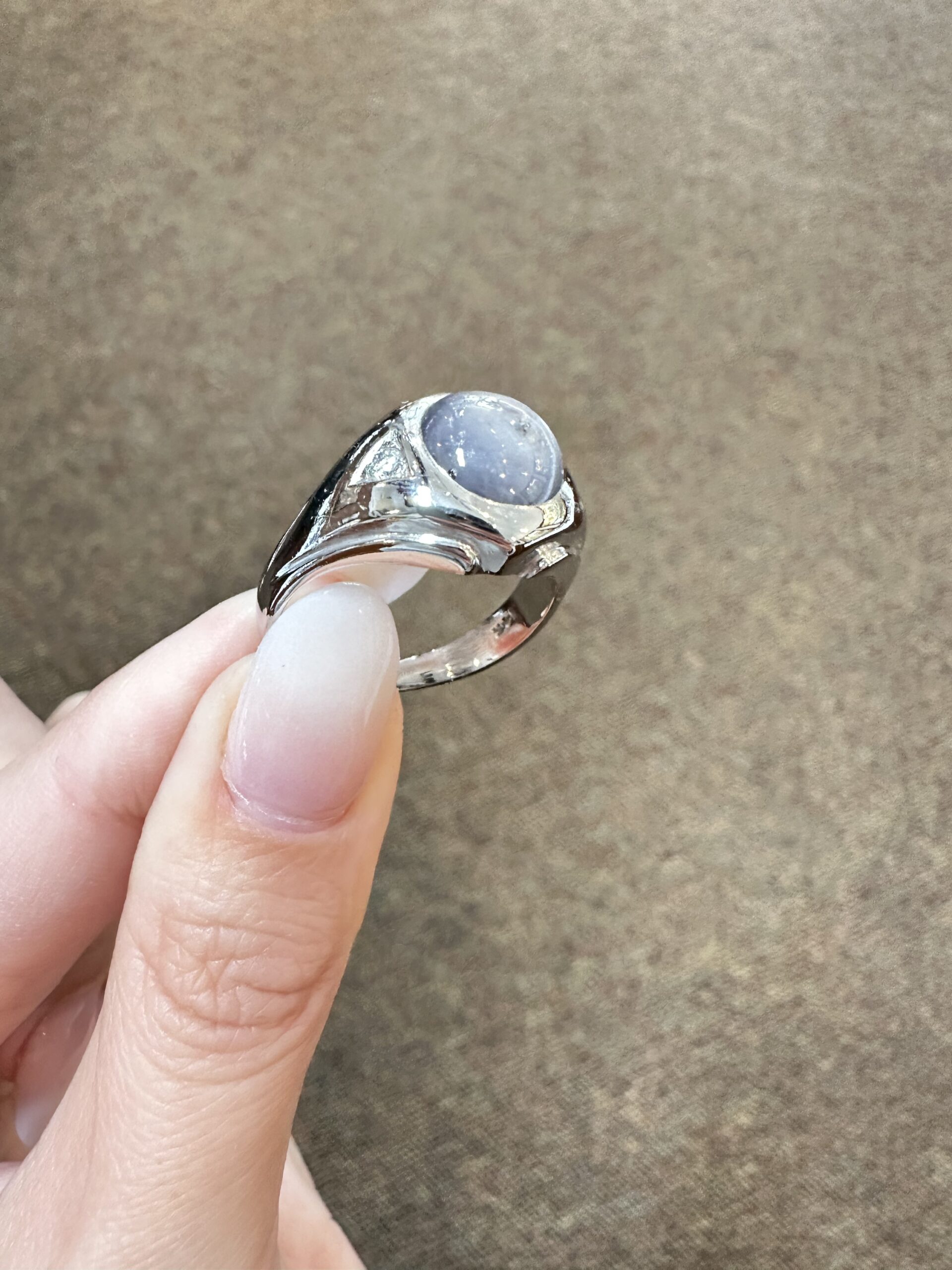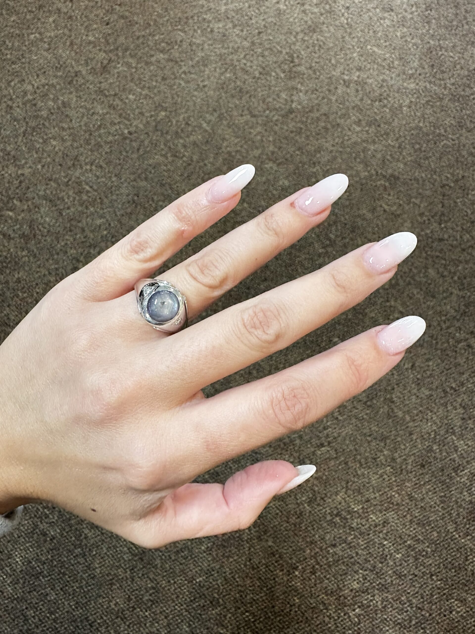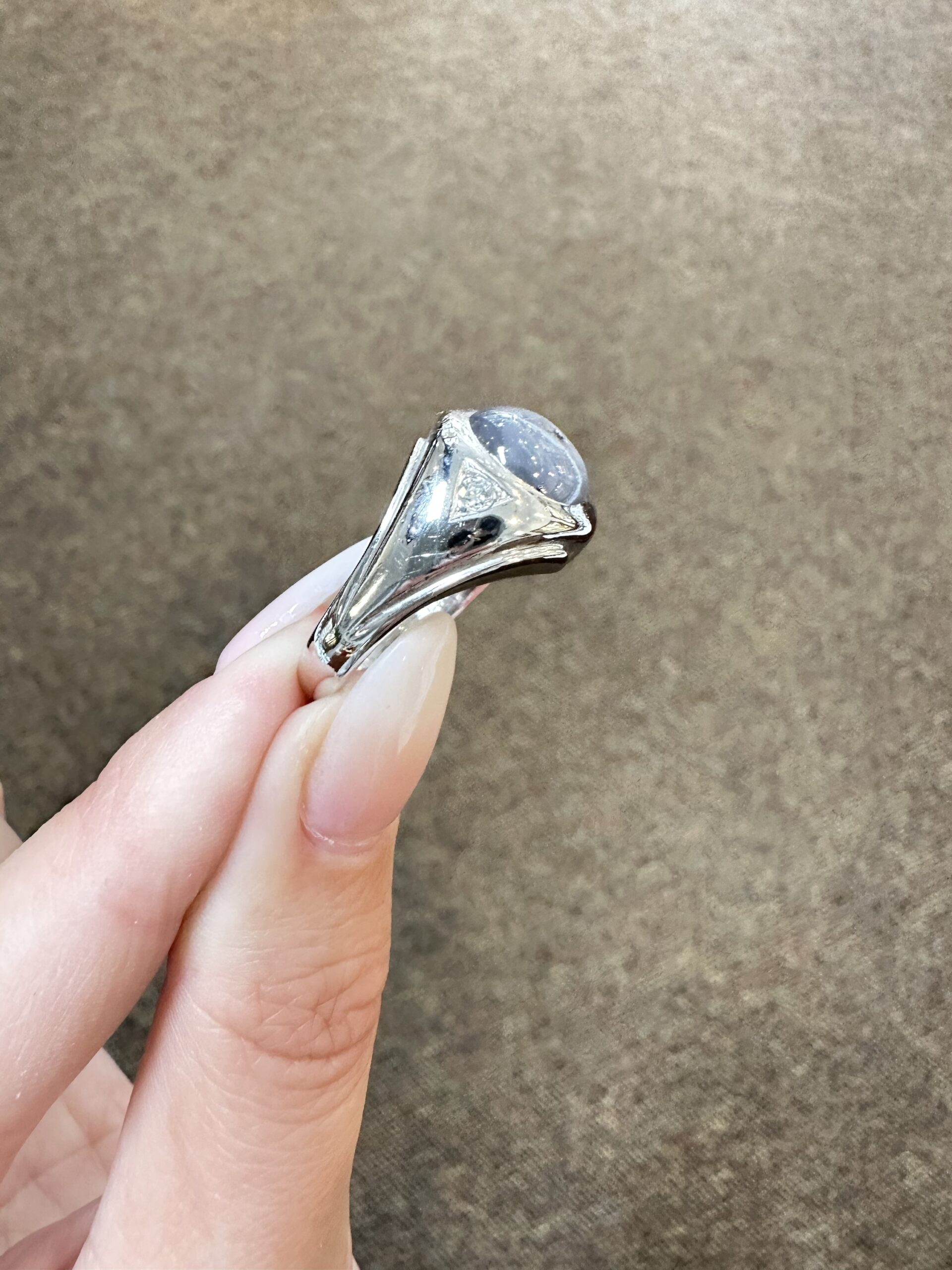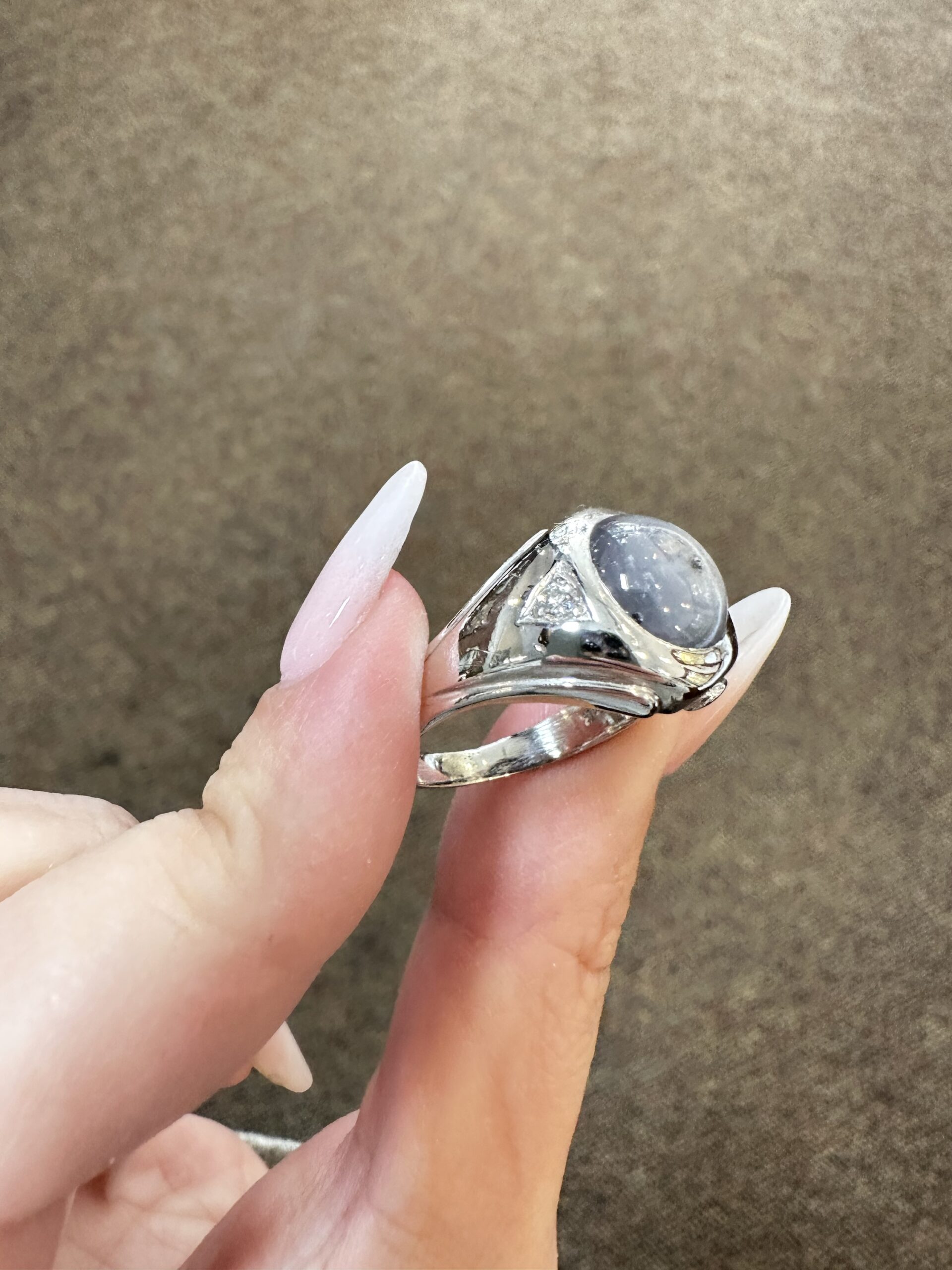 A gent’s vintage 14k white gold genuine Natural Grat Star Sapphire which is round, cabochon cut, and partial bezel set. This Sapphire measures 10 mm in size, and it is accented by 2 genuine Round Brilliant Cut diamonds which are burnished set to either side of the major gemstone, and which have a total combined weight of .10/100-ct. These diamonds average G-H in color and SI1 in clarity. This ring is a finger size 10, but it can be reasonably sized. Please make note of the finger size desired in the comments section at checkout. This ring has an entire weight of 10.69 grams. The top of this ring measures 14 mm in width, tapering to 3 mm at the base of the shank.
