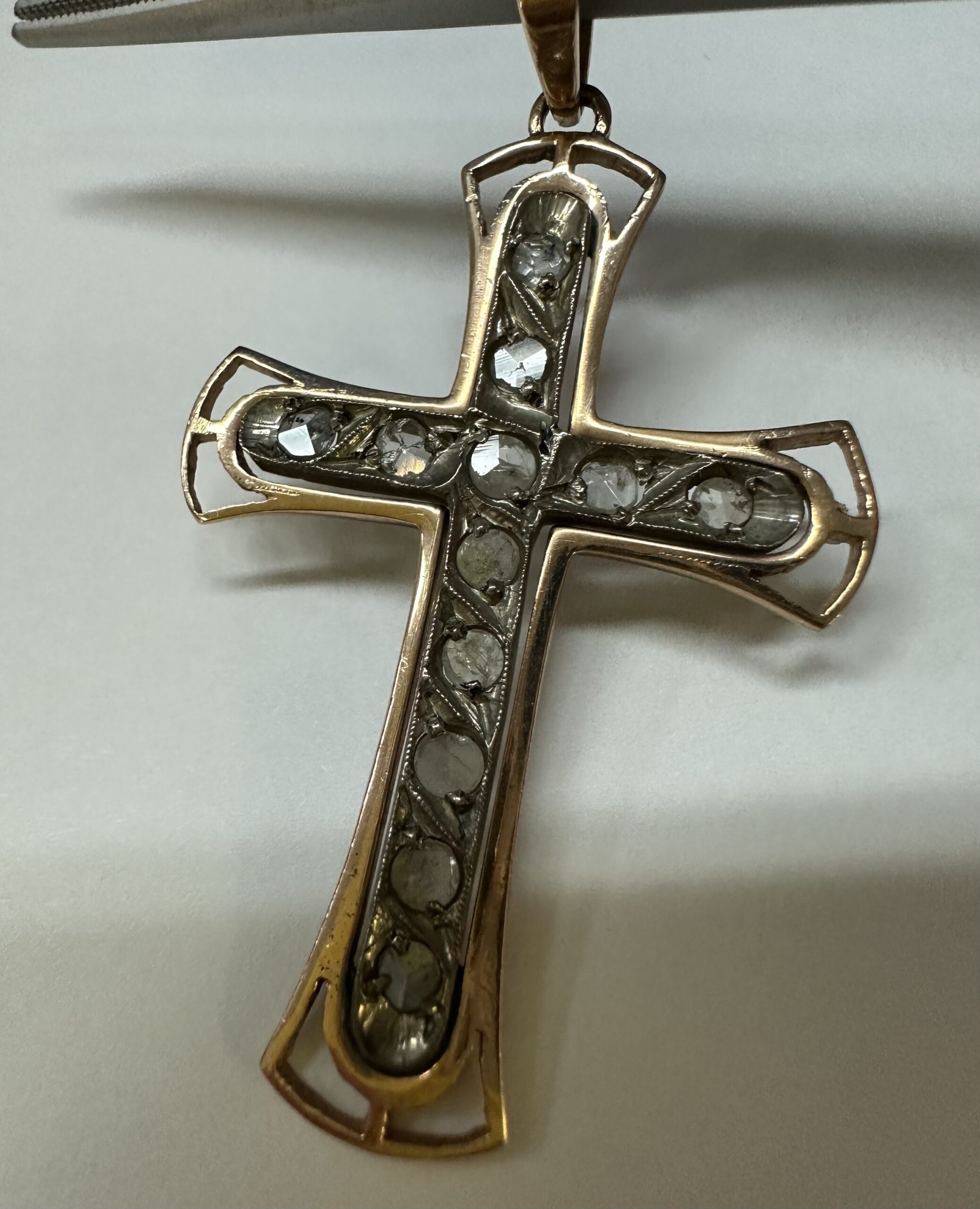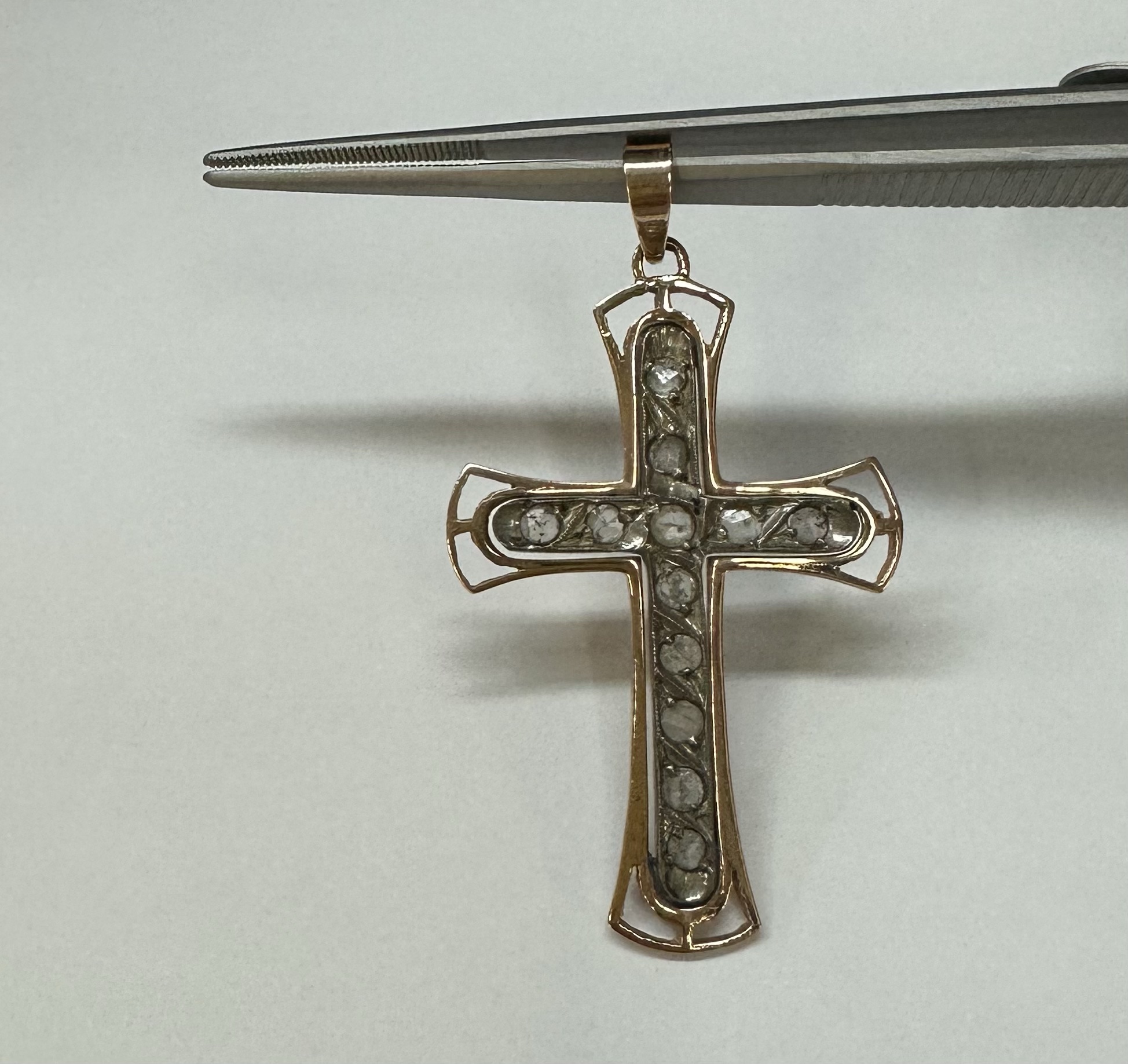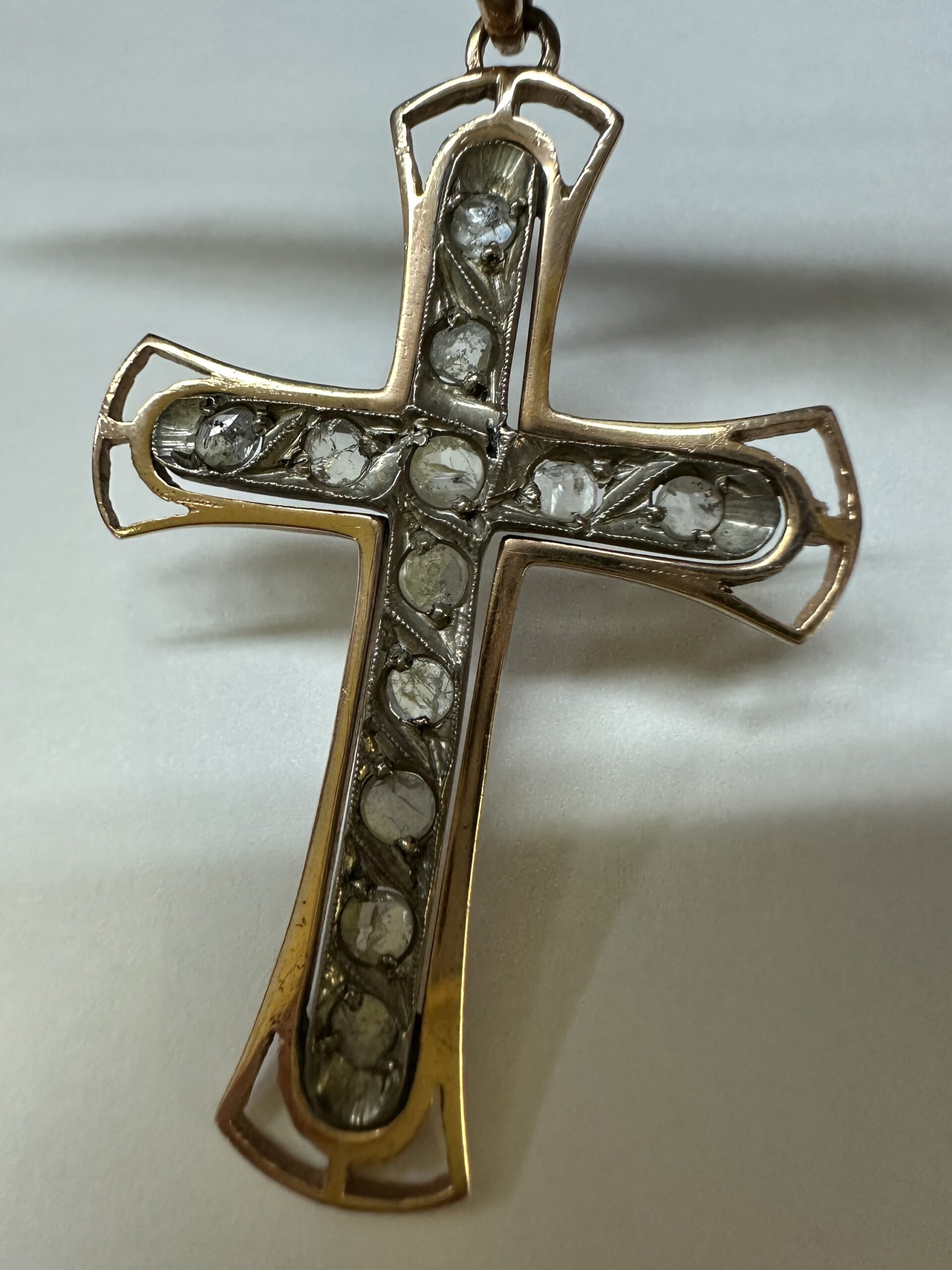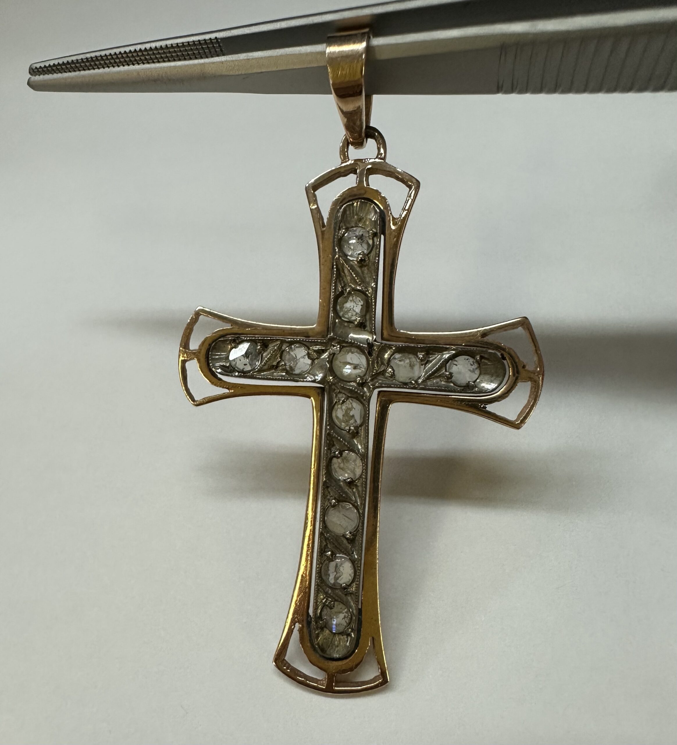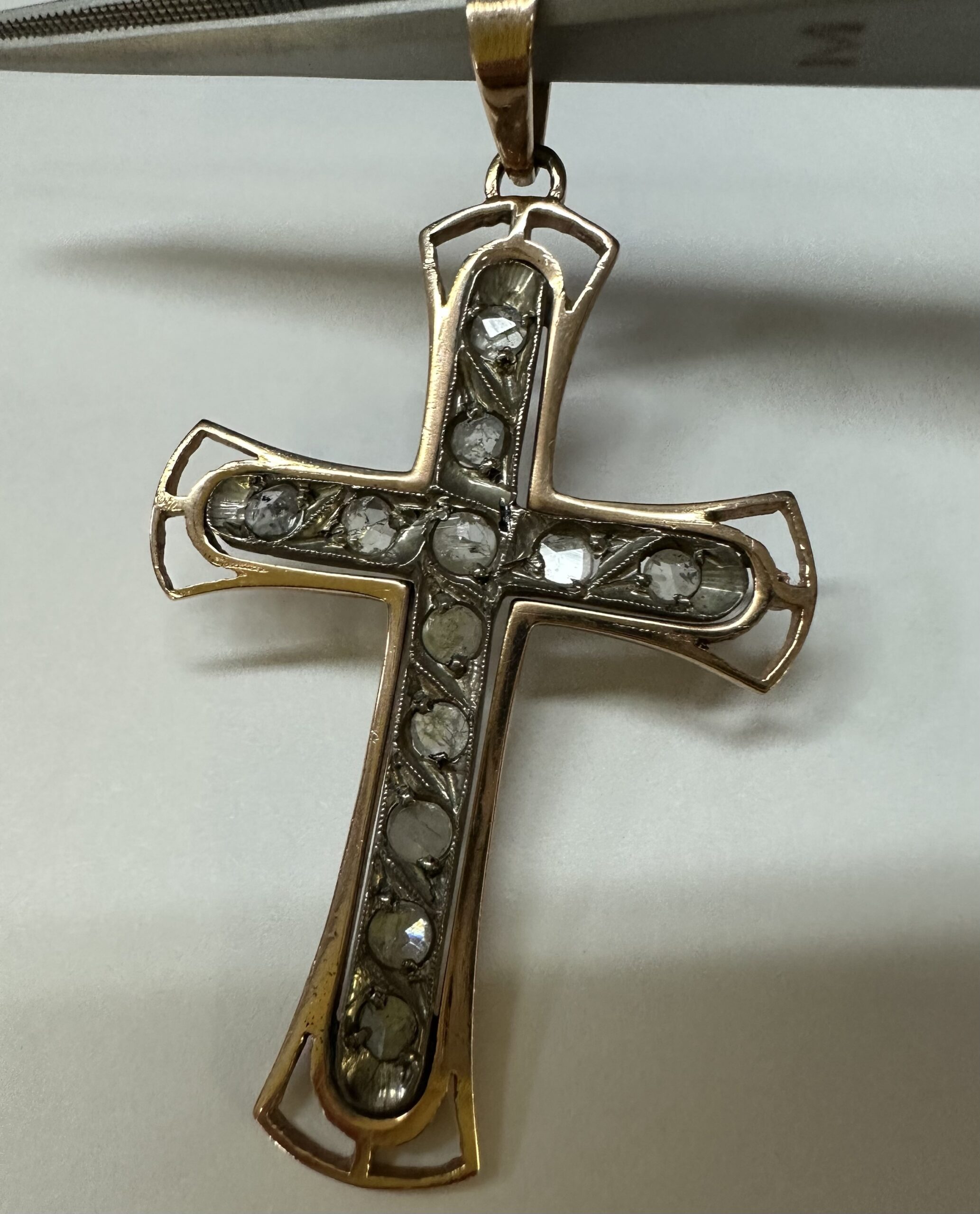 Antique one-of-a-kind 14k rose gold 12 stone genuine .40 cttw Rose Cut Diamond cross. This cross has an entire weight of 4.7 grams. This cross measures