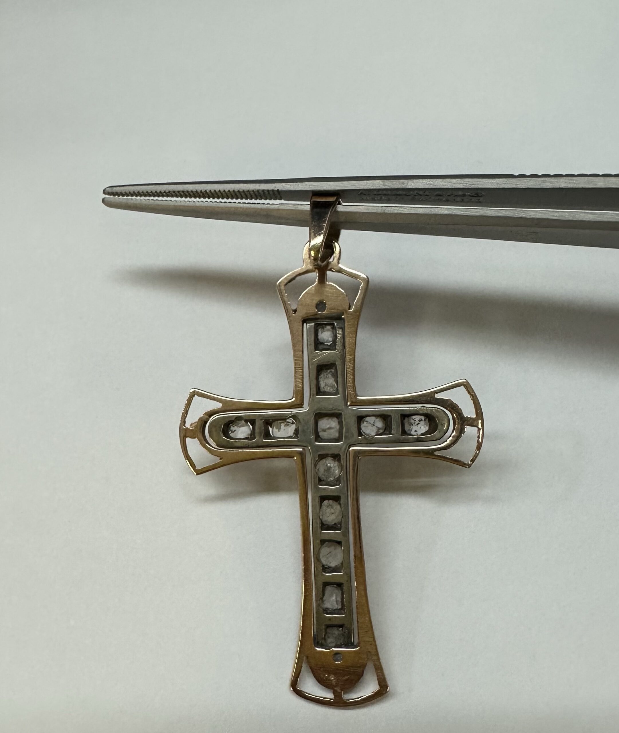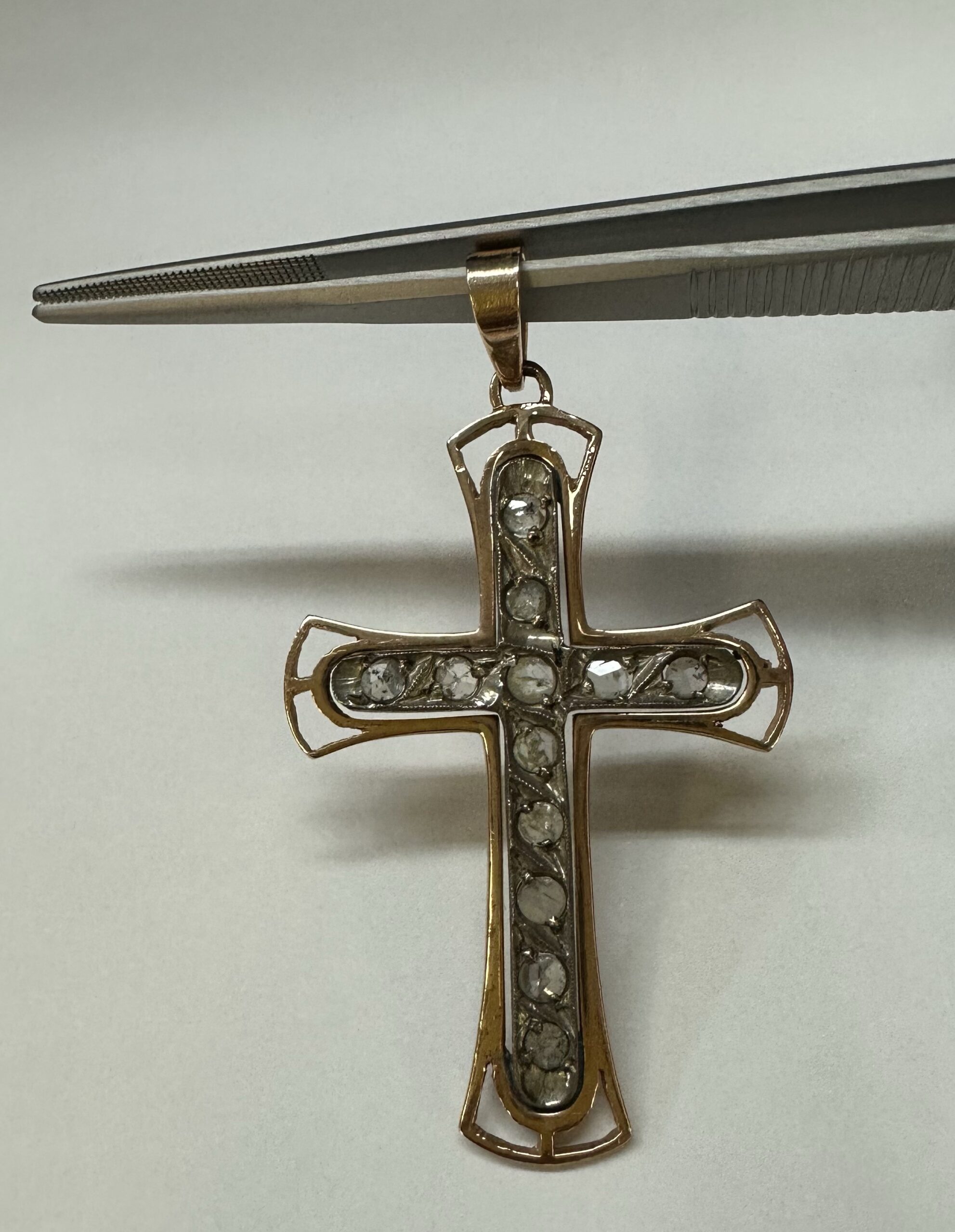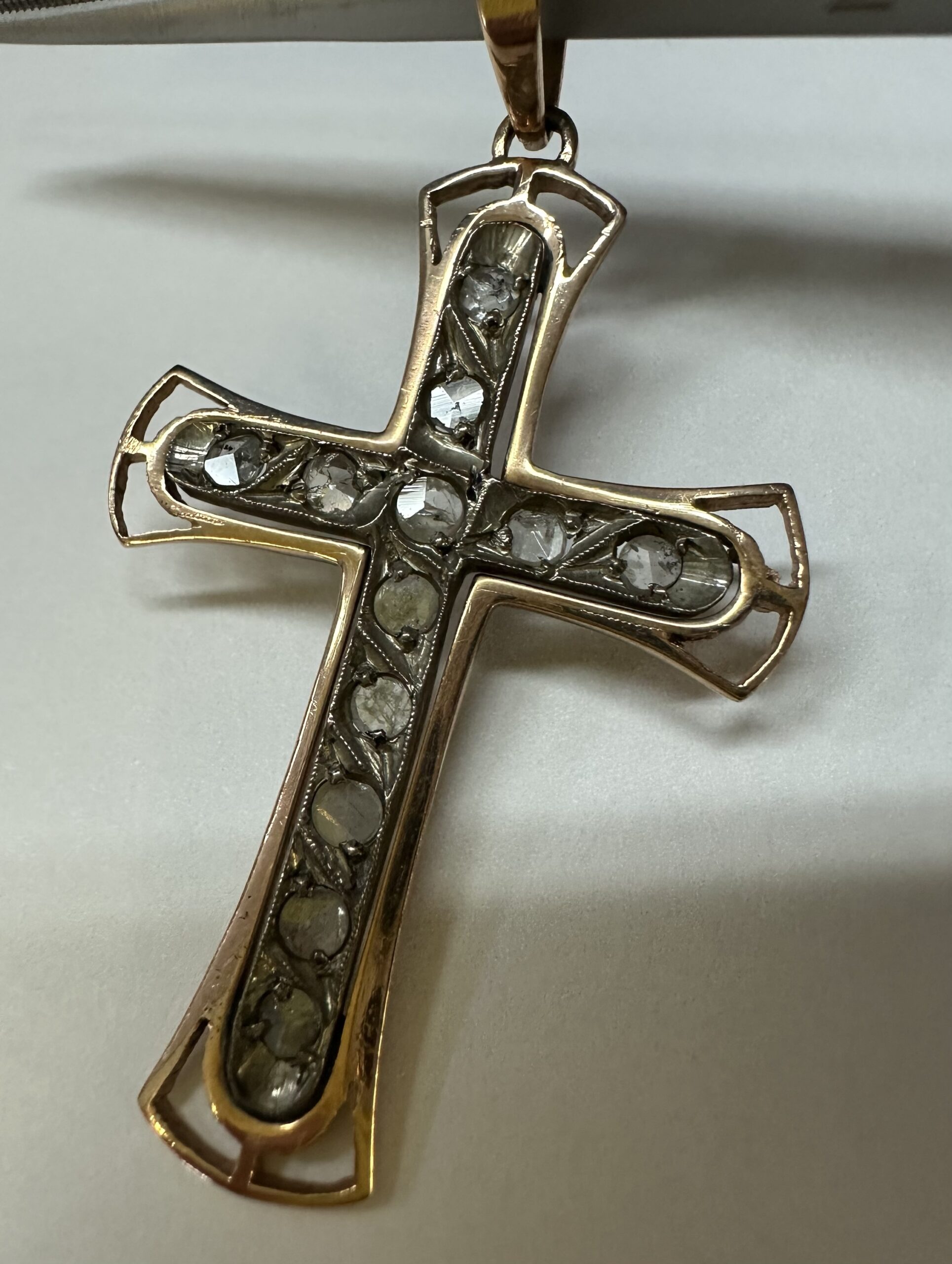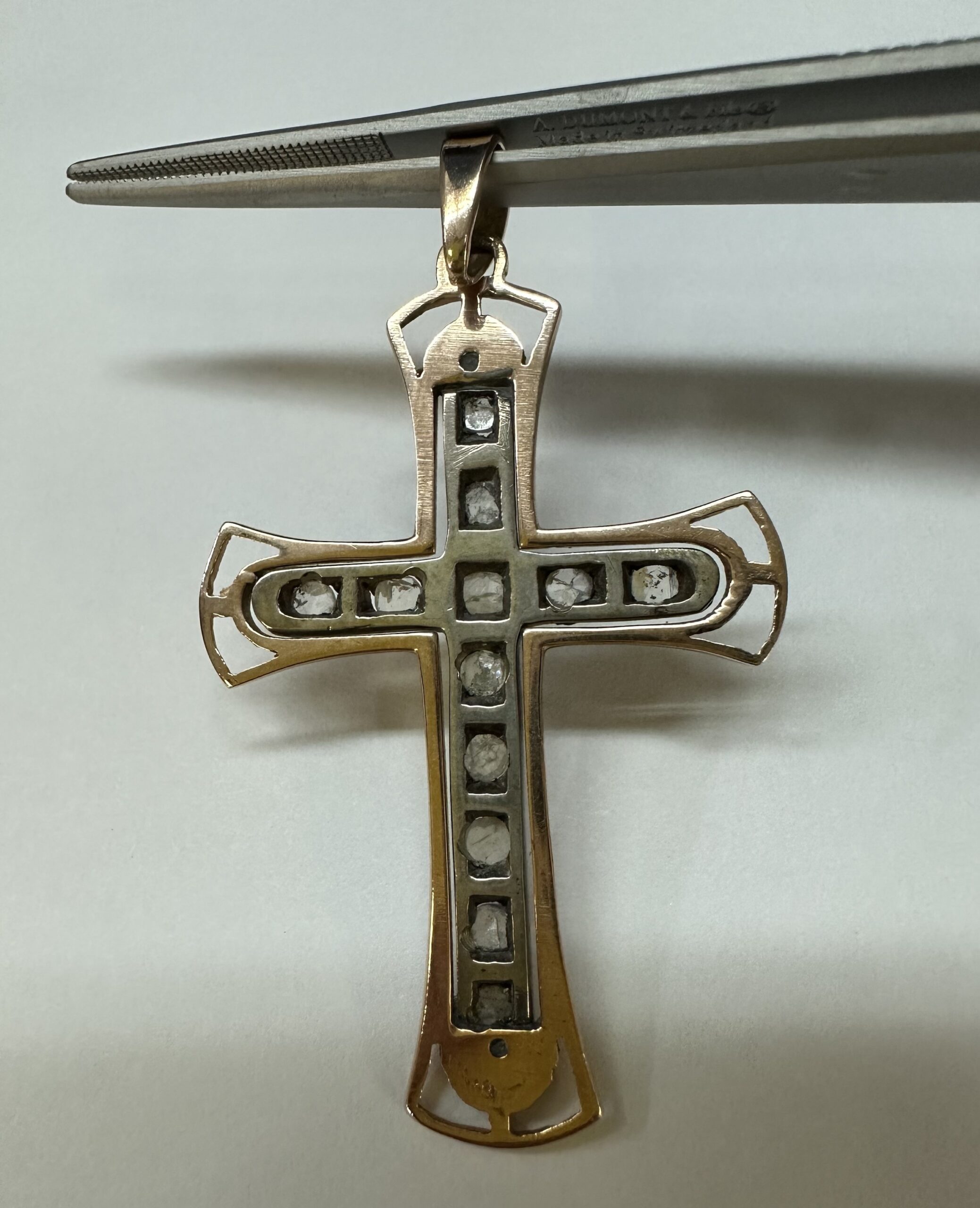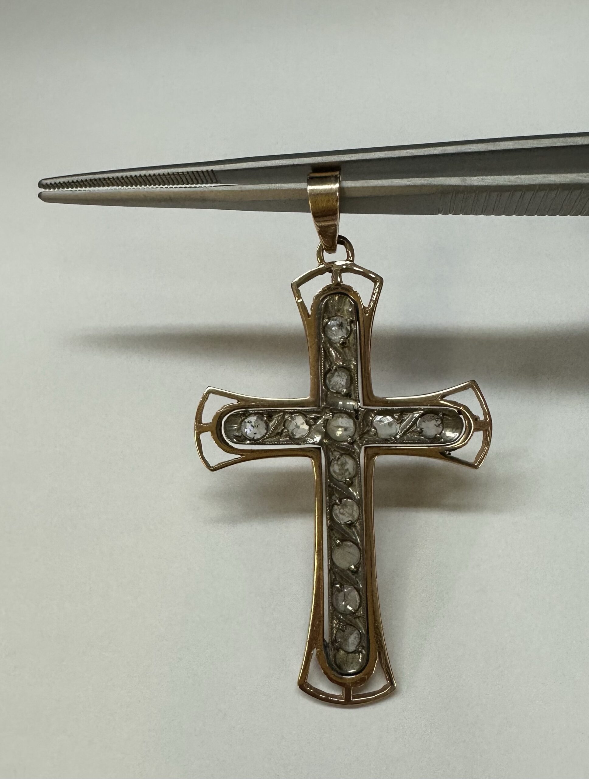 Antique one-of-a-kind 14k rose gold 12 stone genuine .40 cttw Rose Cut Diamond cross. This cross has an entire weight of 4.7 grams. This cross measures