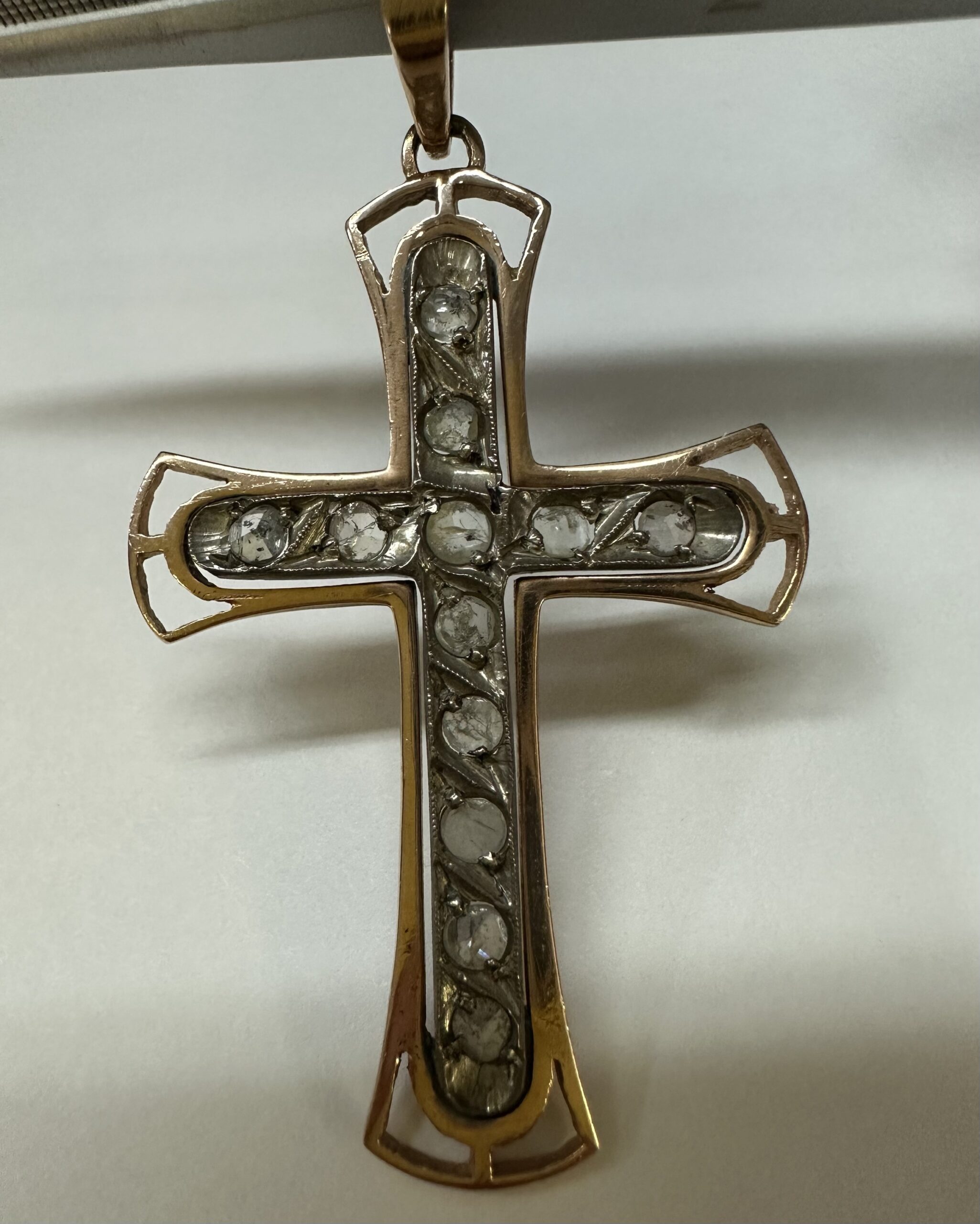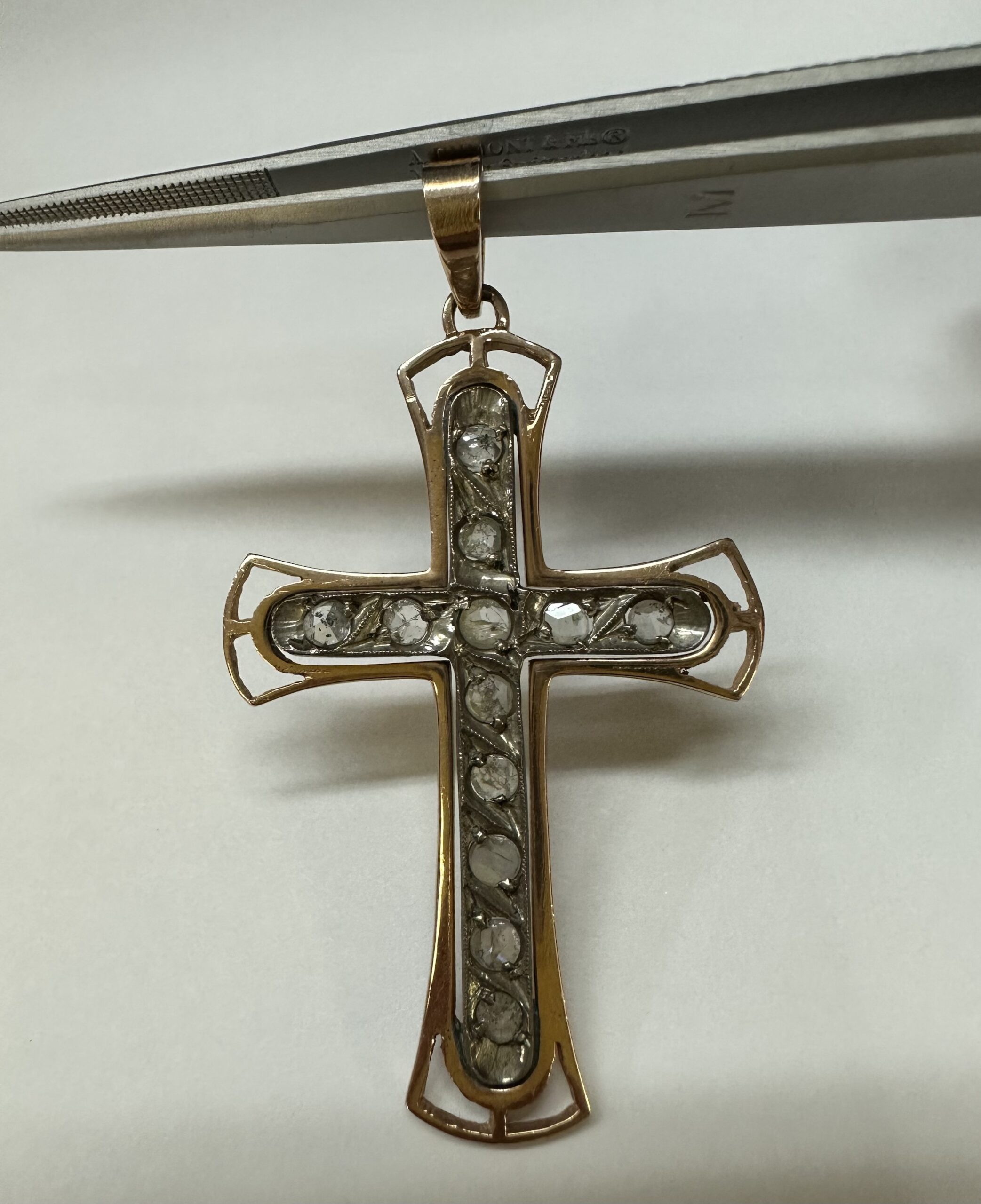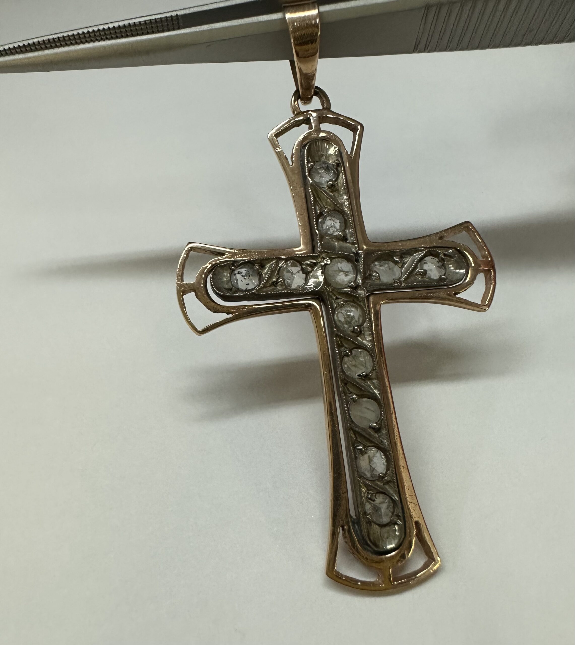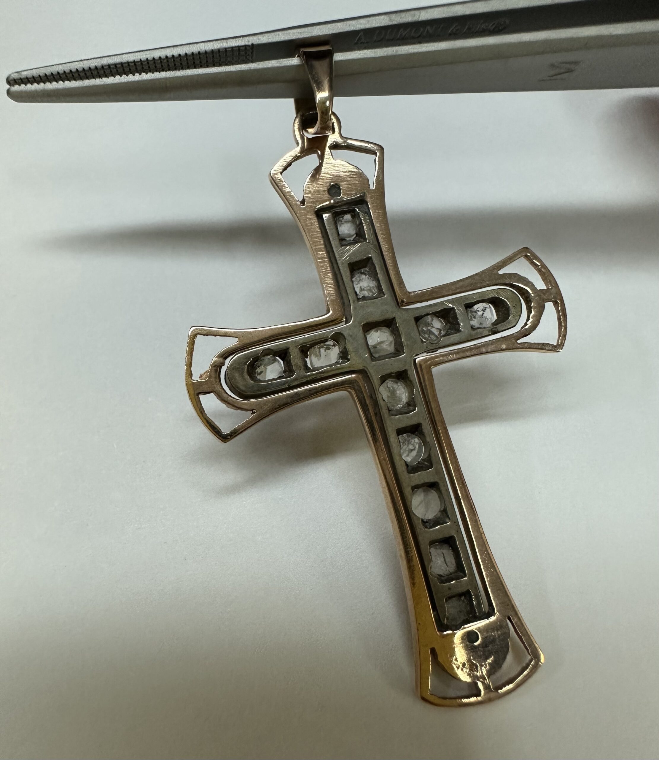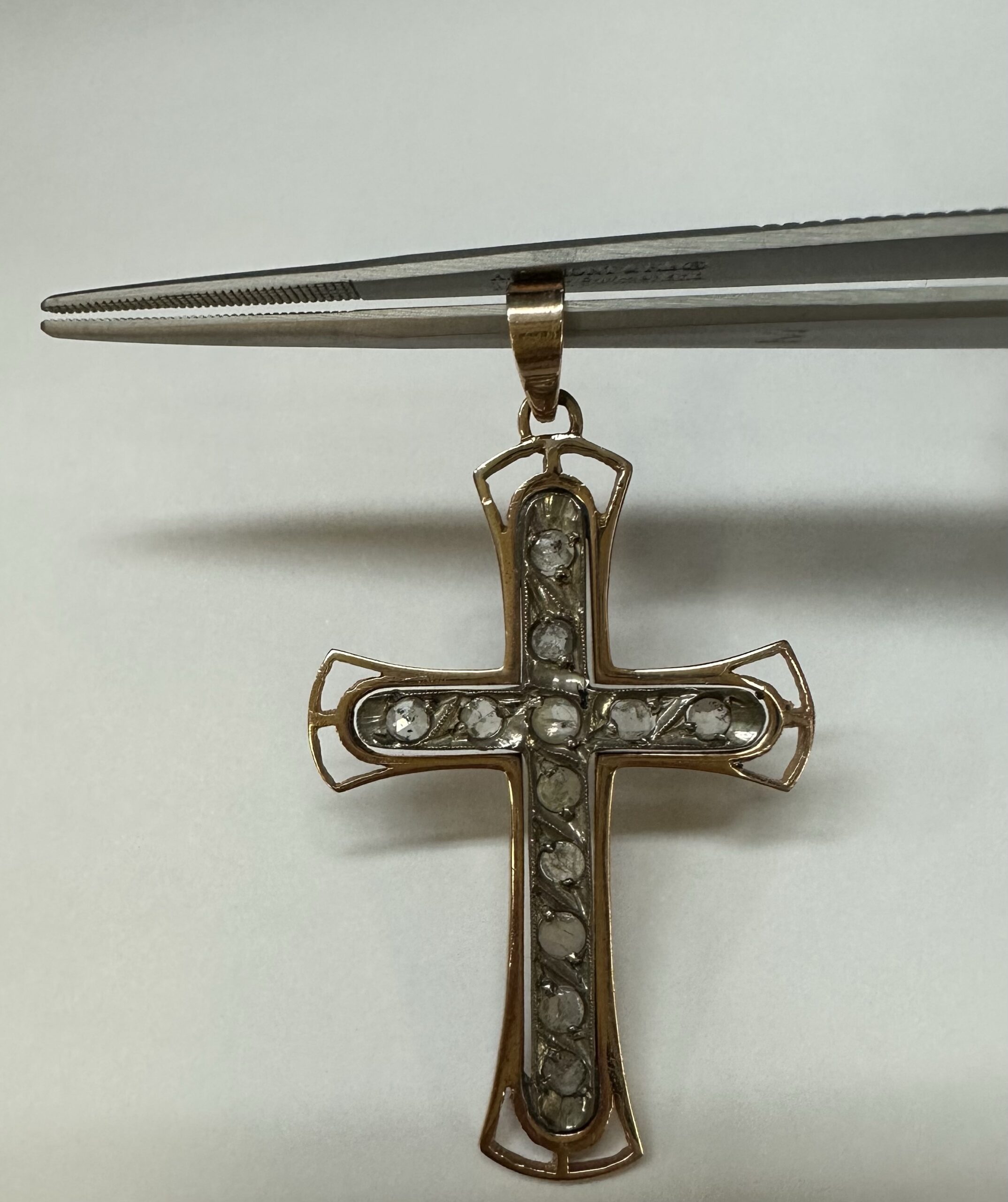 Antique one-of-a-kind 14k rose gold 12 stone genuine .40 cttw Rose Cut Diamond cross. This cross has an entire weight of 4.7 grams. This cross measures