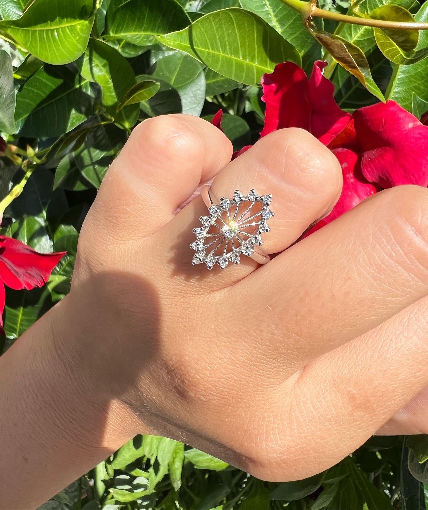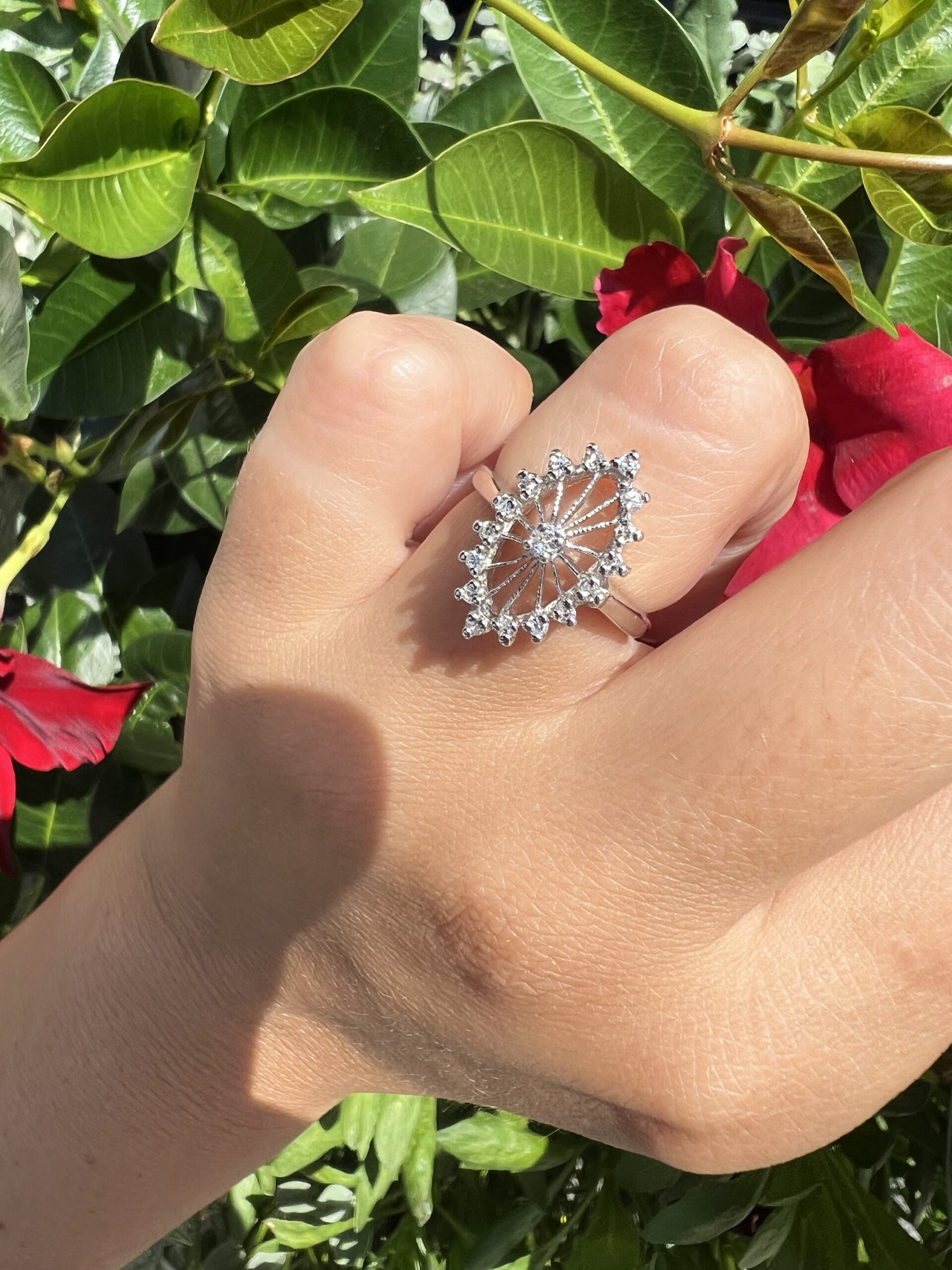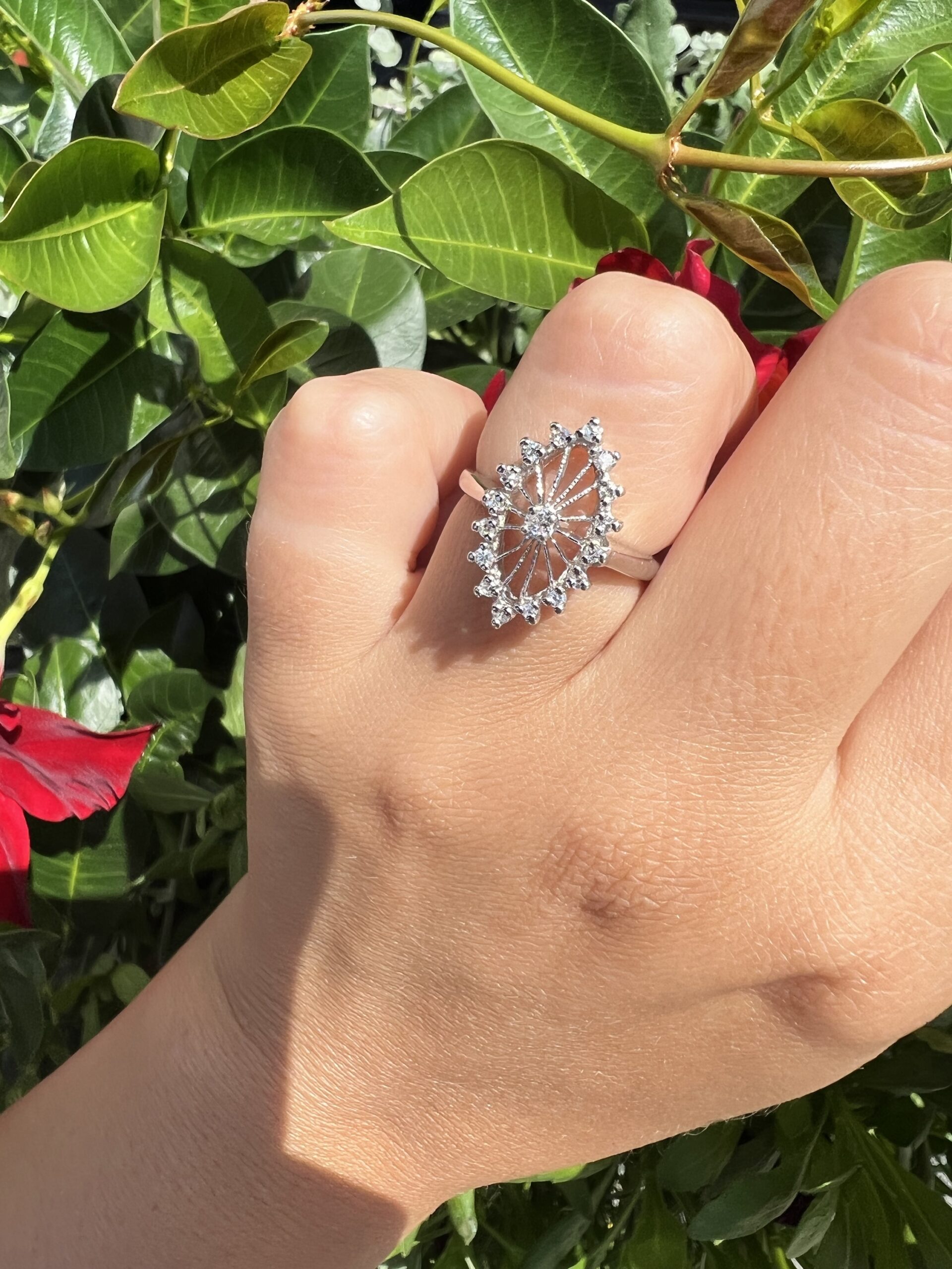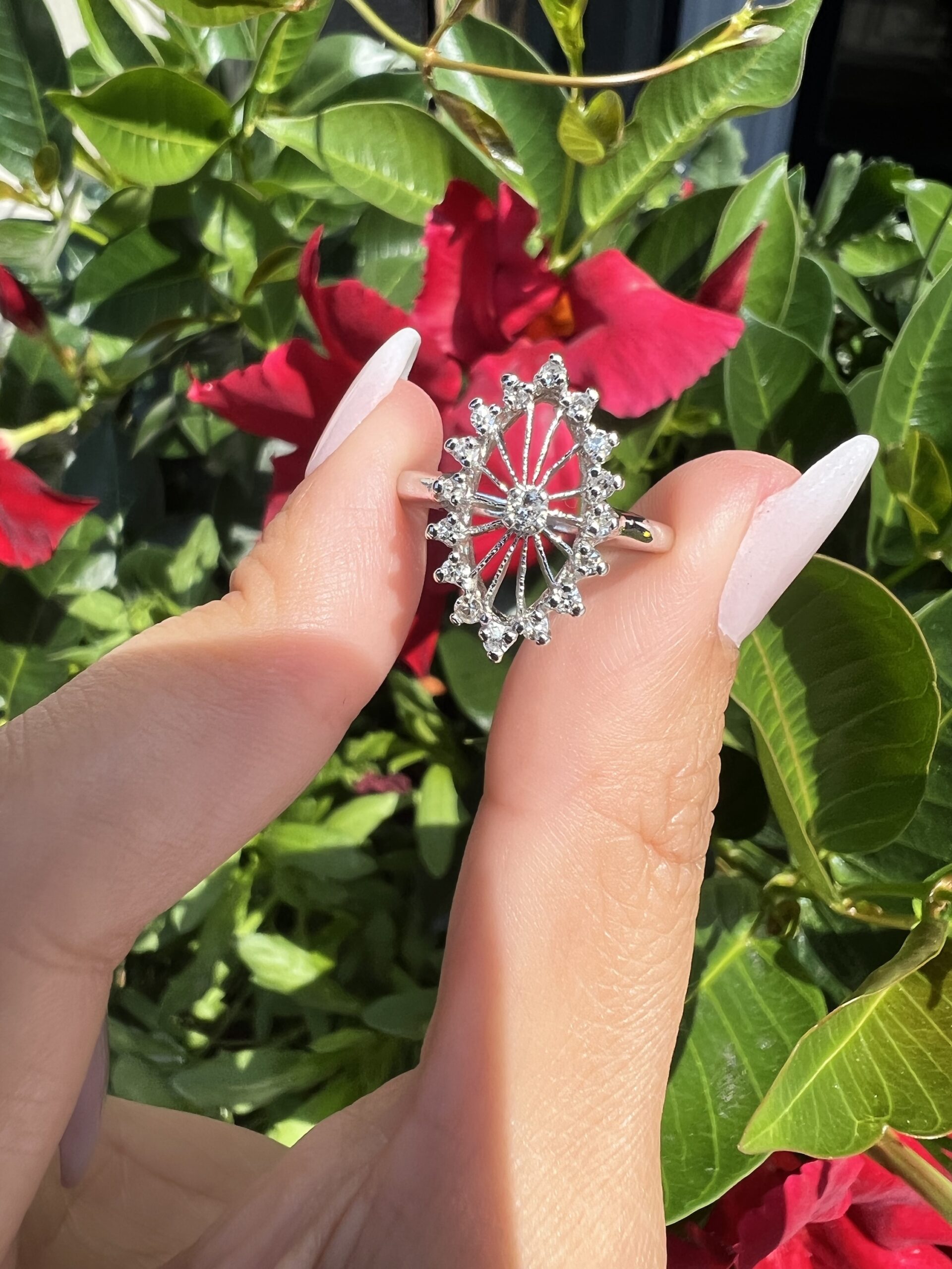 Antique one-of-a-kind 14k white gold genuine diamond cluster ring. This ring contains one genuine Full Cut diamond set in the center into 4 prongs. This diamond is surrounded in a cluster fashion by 16 genuine Single Cut diamonds. These diamonds average H in color and I1 in clarity. This ring has an entire weight of 3.5 grams. This ring is a finger size 6, but it can be reasonably sized. Please make note of the finger size needed in the comments section at checkout.