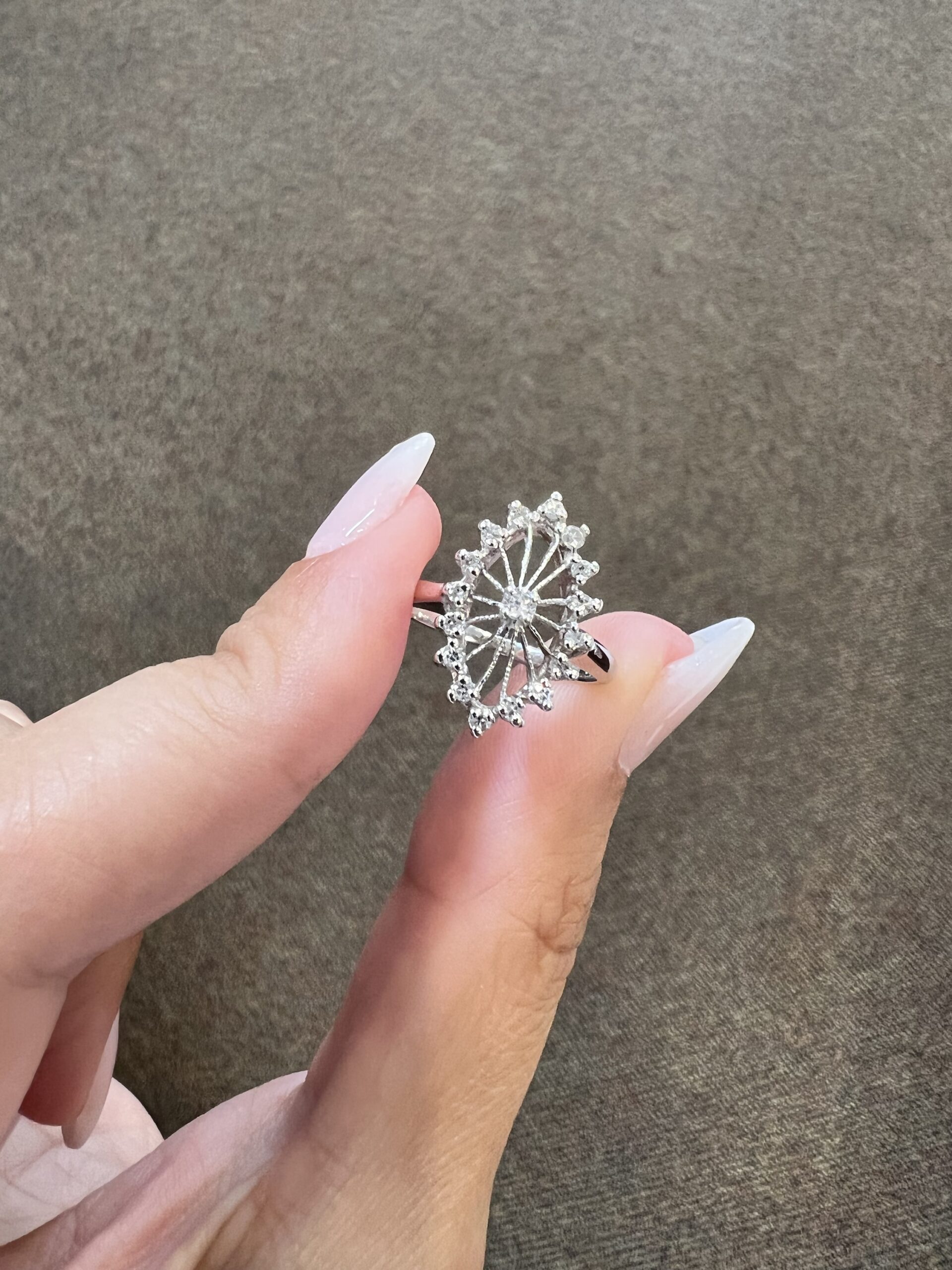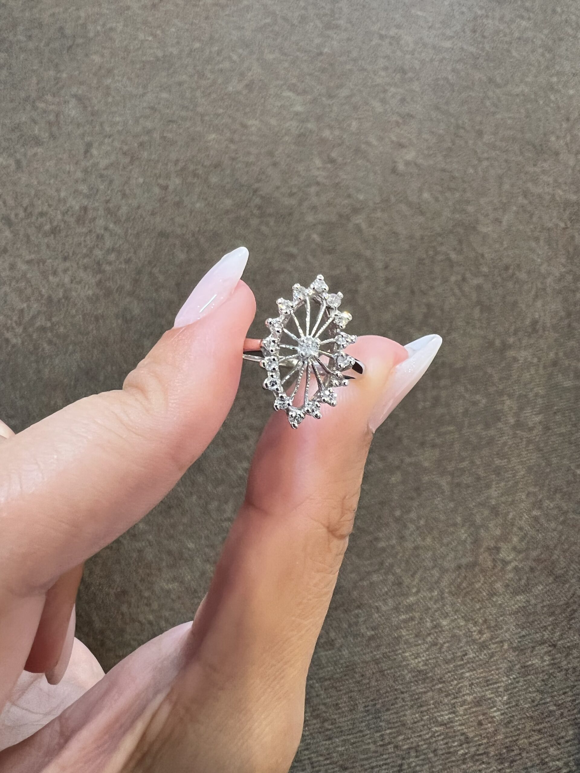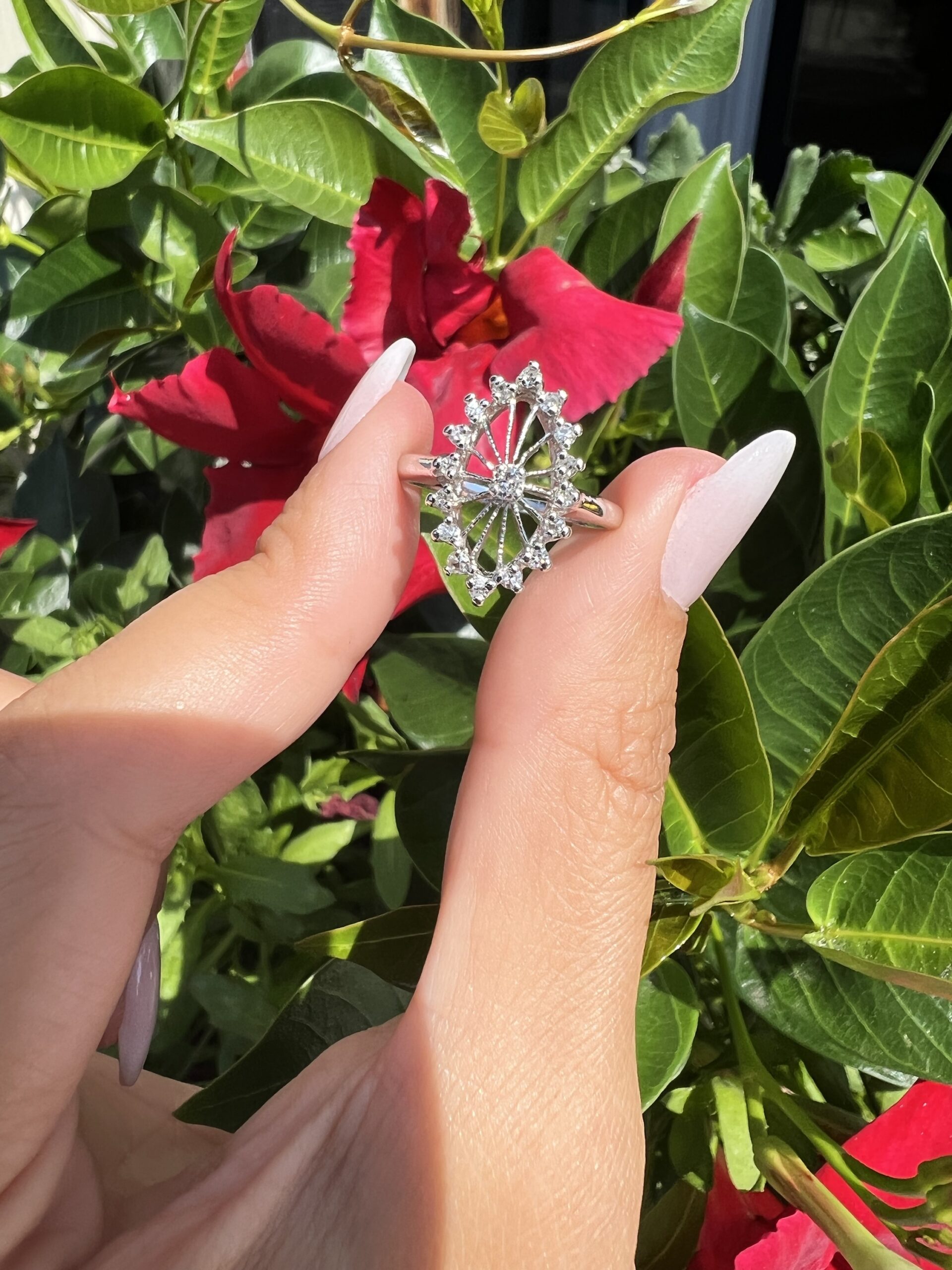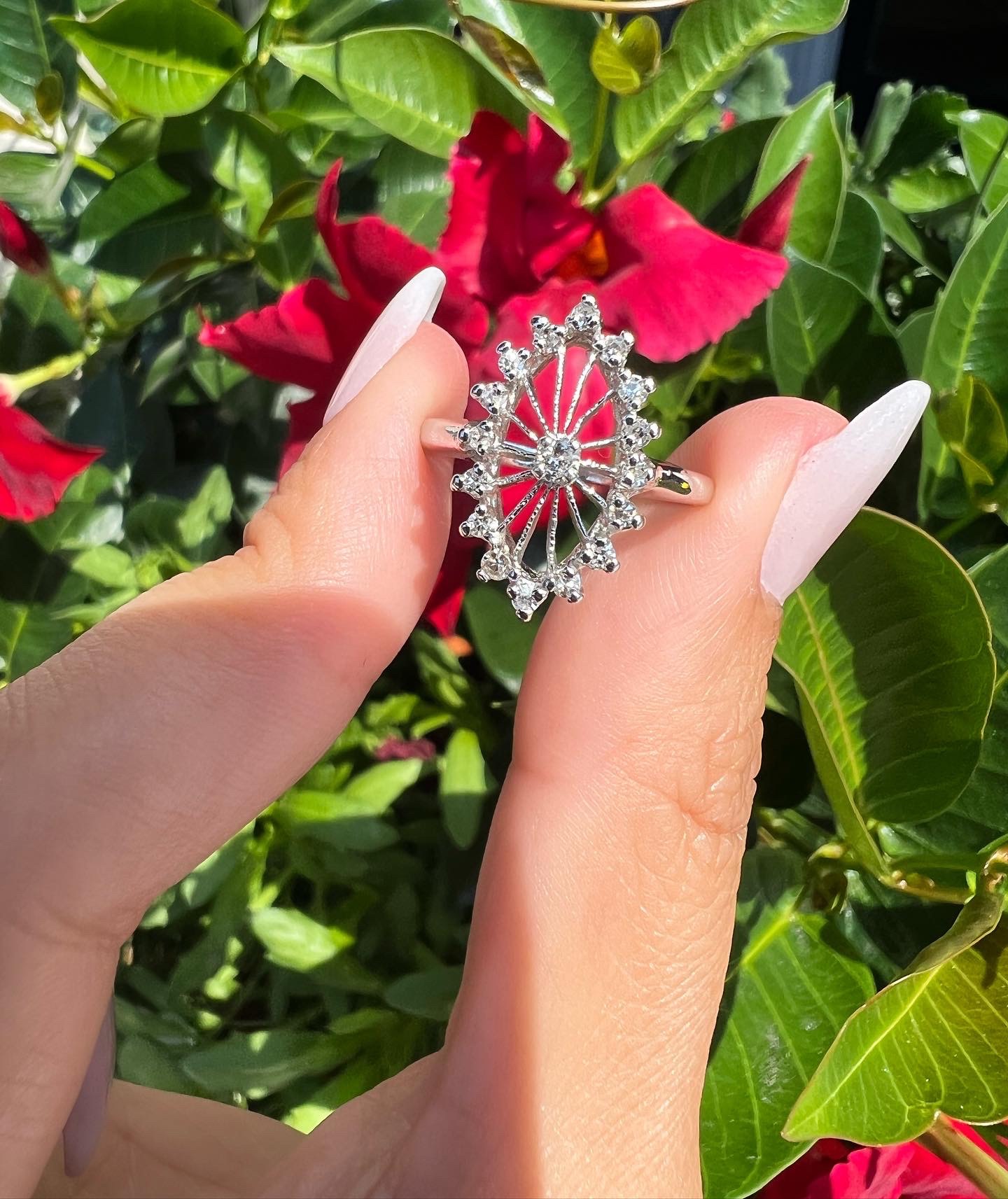 Antique one-of-a-kind 14k white gold genuine diamond cluster ring. This ring contains one genuine Full Cut diamond set in the center into 4 prongs. This diamond is surrounded in a cluster fashion by 16 genuine Single Cut diamonds. These diamonds average H in color and I1 in clarity. This ring has an entire weight of 3.5 grams. This ring is a finger size 6, but it can be reasonably sized. Please make note of the finger size needed in the comments section at checkout.