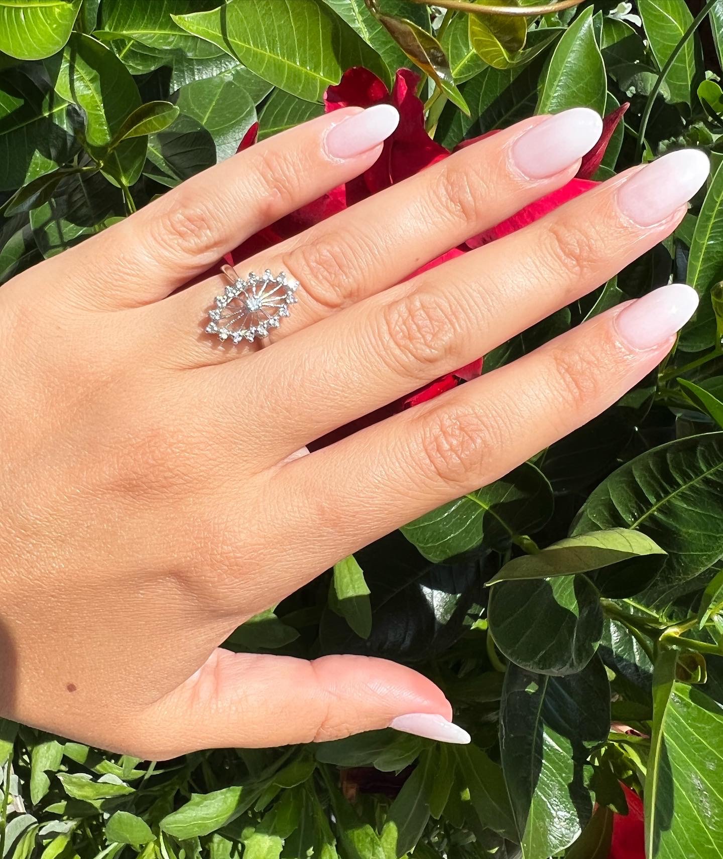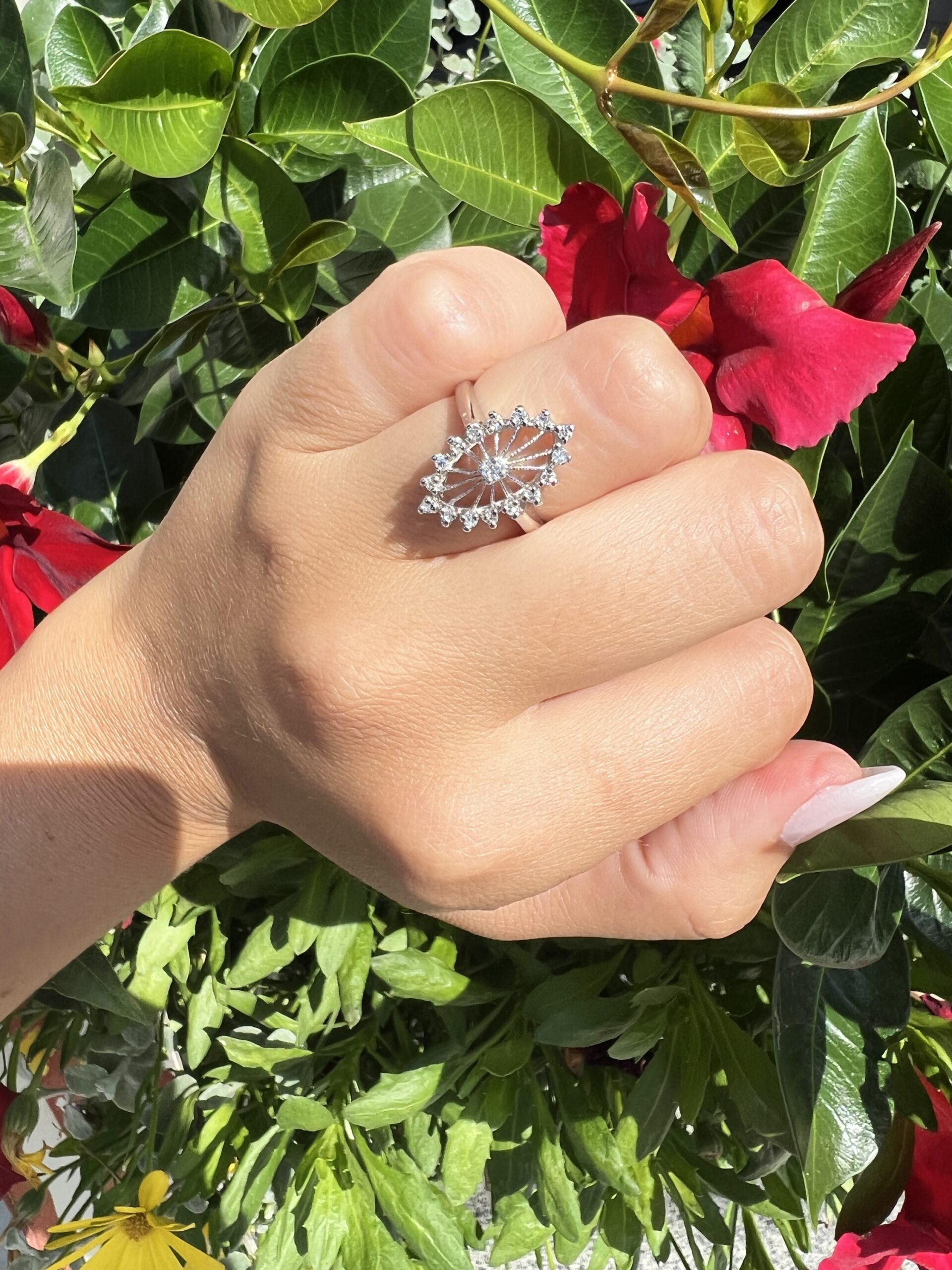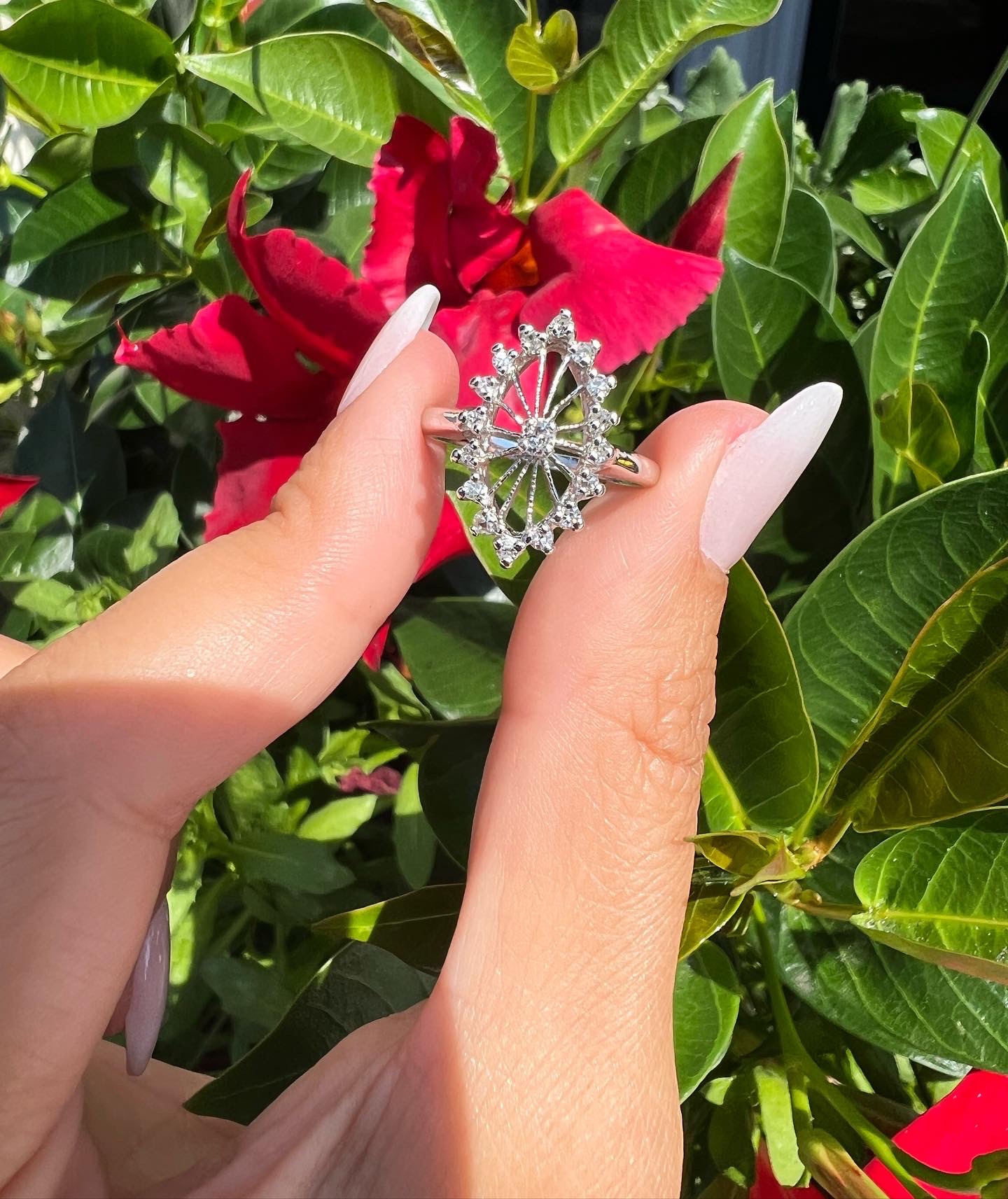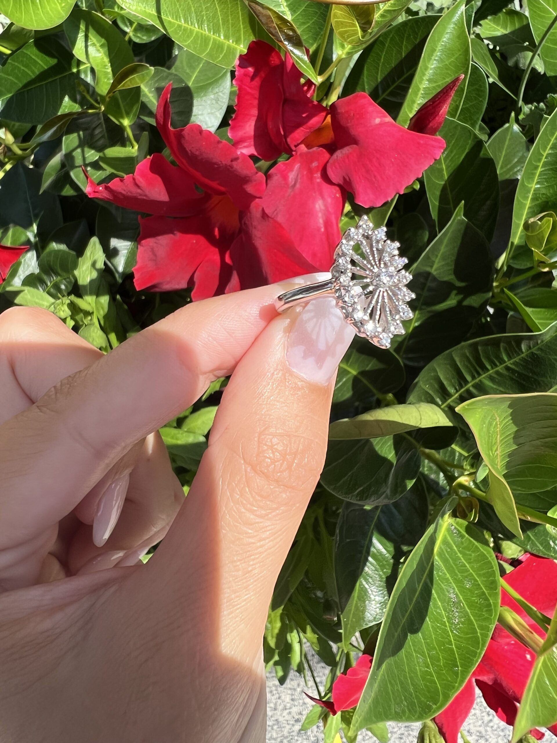 Antique one-of-a-kind 14k white gold genuine diamond cluster ring. This ring contains one genuine Full Cut diamond set in the center into 4 prongs. This diamond is surrounded in a cluster fashion by 16 genuine Single Cut diamonds. These diamonds average H in color and I1 in clarity. This ring has an entire weight of 3.5 grams. This ring is a finger size 6, but it can be reasonably sized. Please make note of the finger size needed in the comments section at checkout.