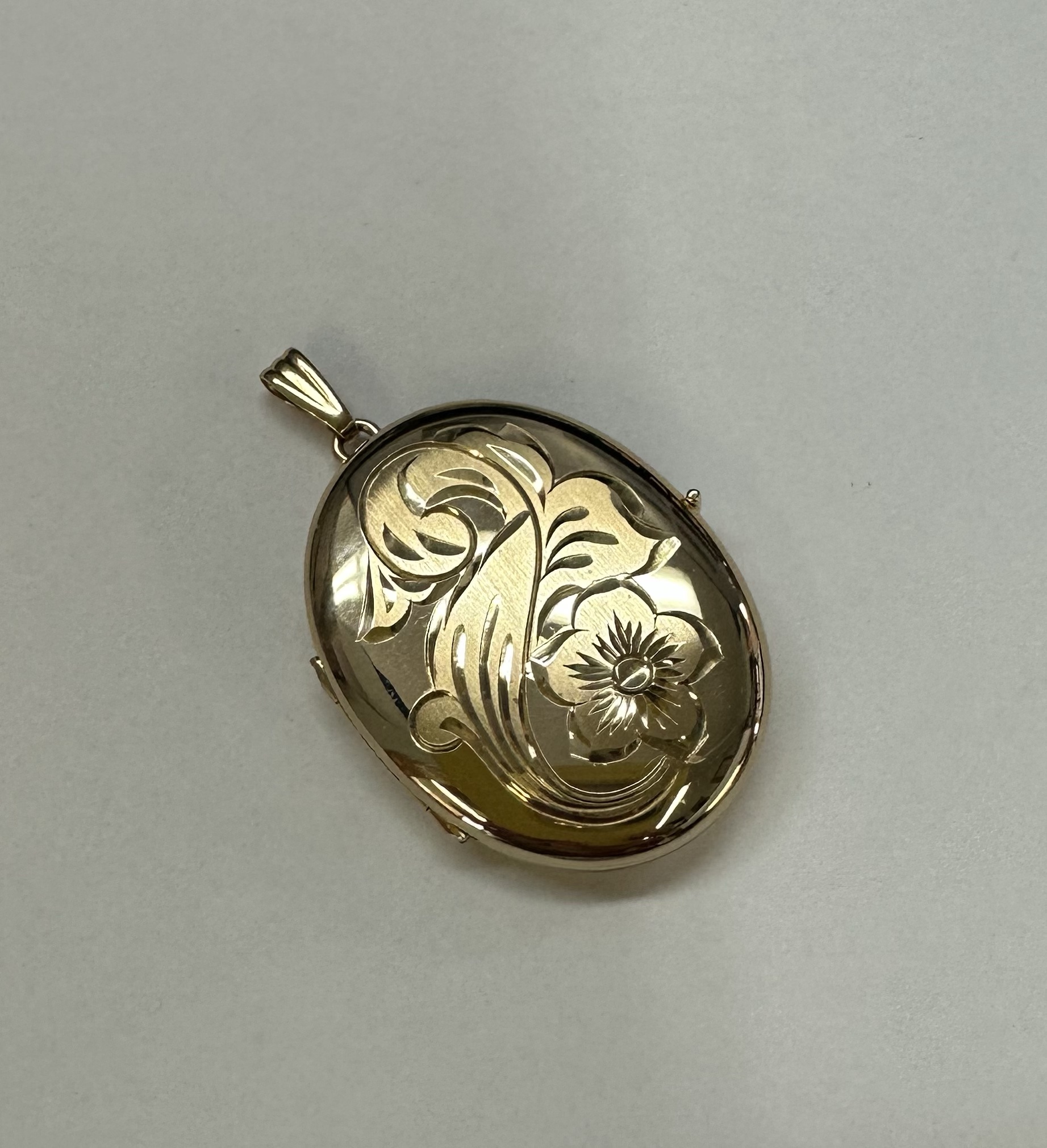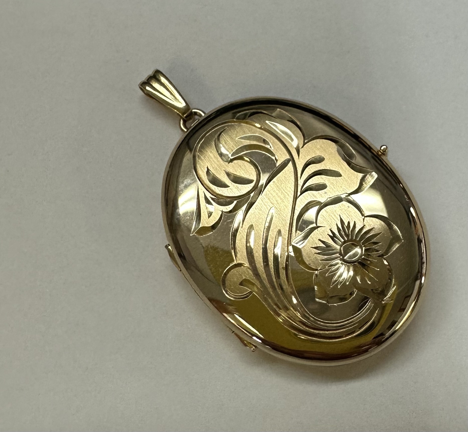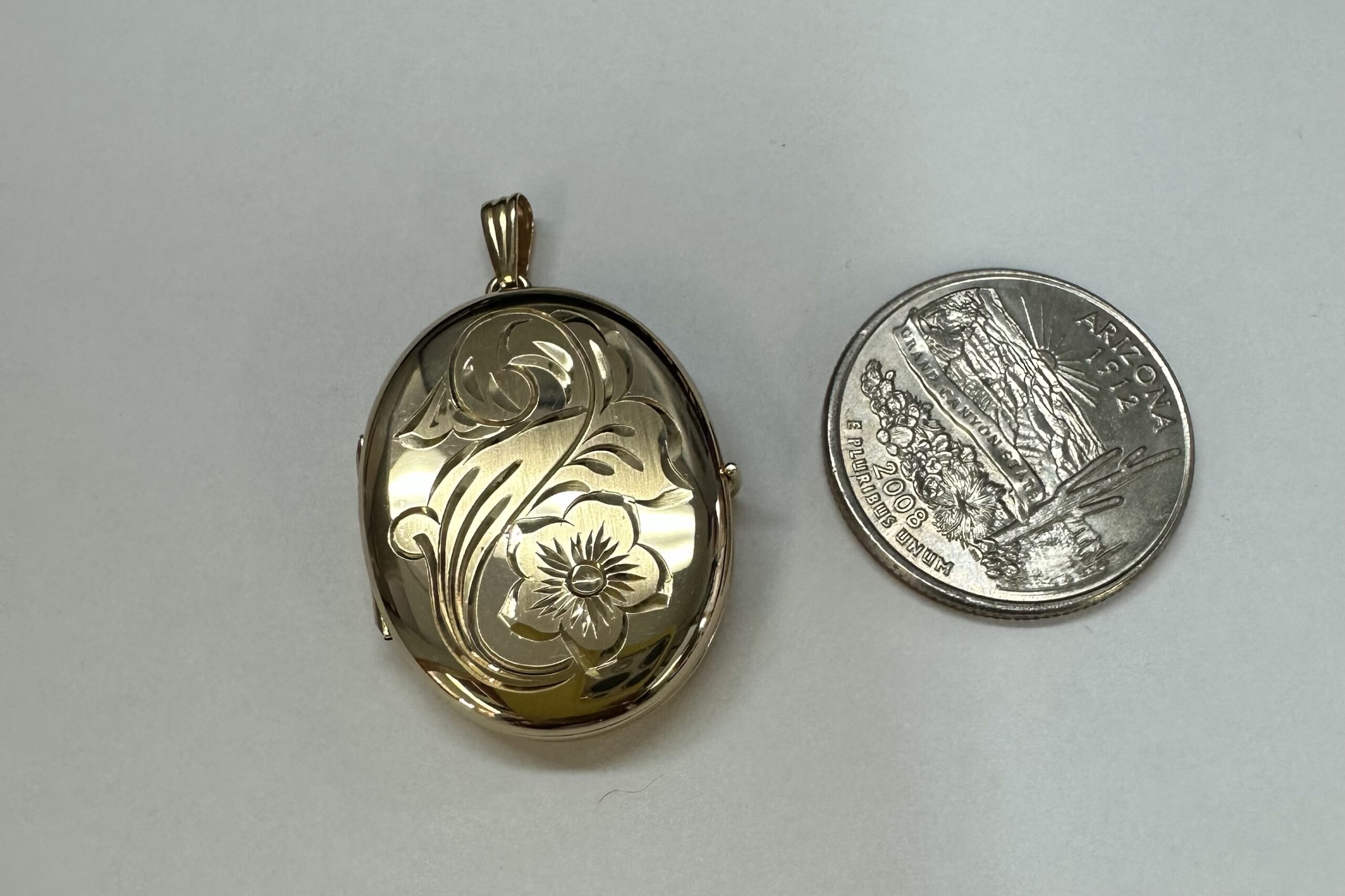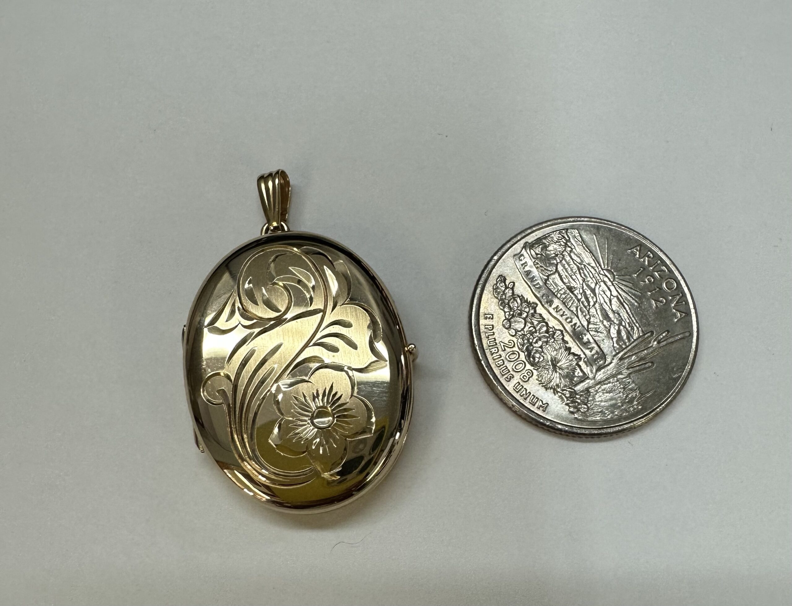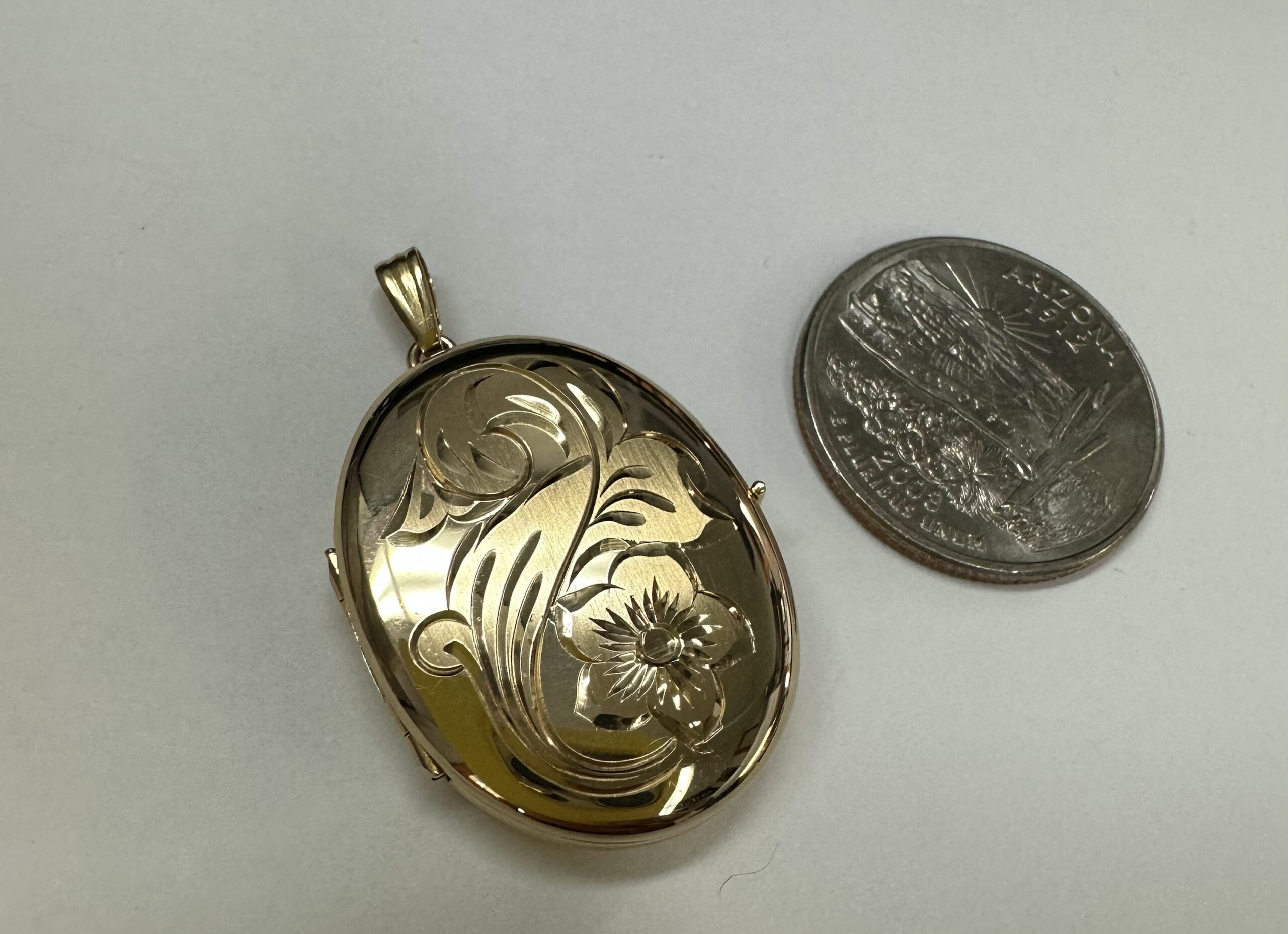 Antique one-of-a-kind 14k yellow gold oval shaped 9 picture locket, with floral motif engraving on the front. This locket has an entire weight of 8.3 grams. This locket measures 1 1/2” in length and just under 2” in width.